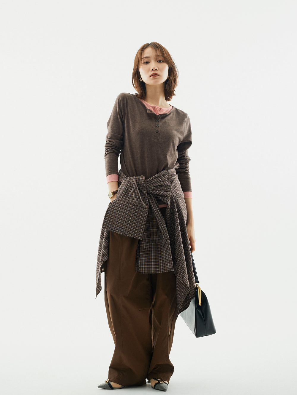 【Allure】[SET]配色レイヤードヘンリーネックトップス+タフタワイドカーブパンツ+チェックBIGカフスオーバーシャツ(3set)