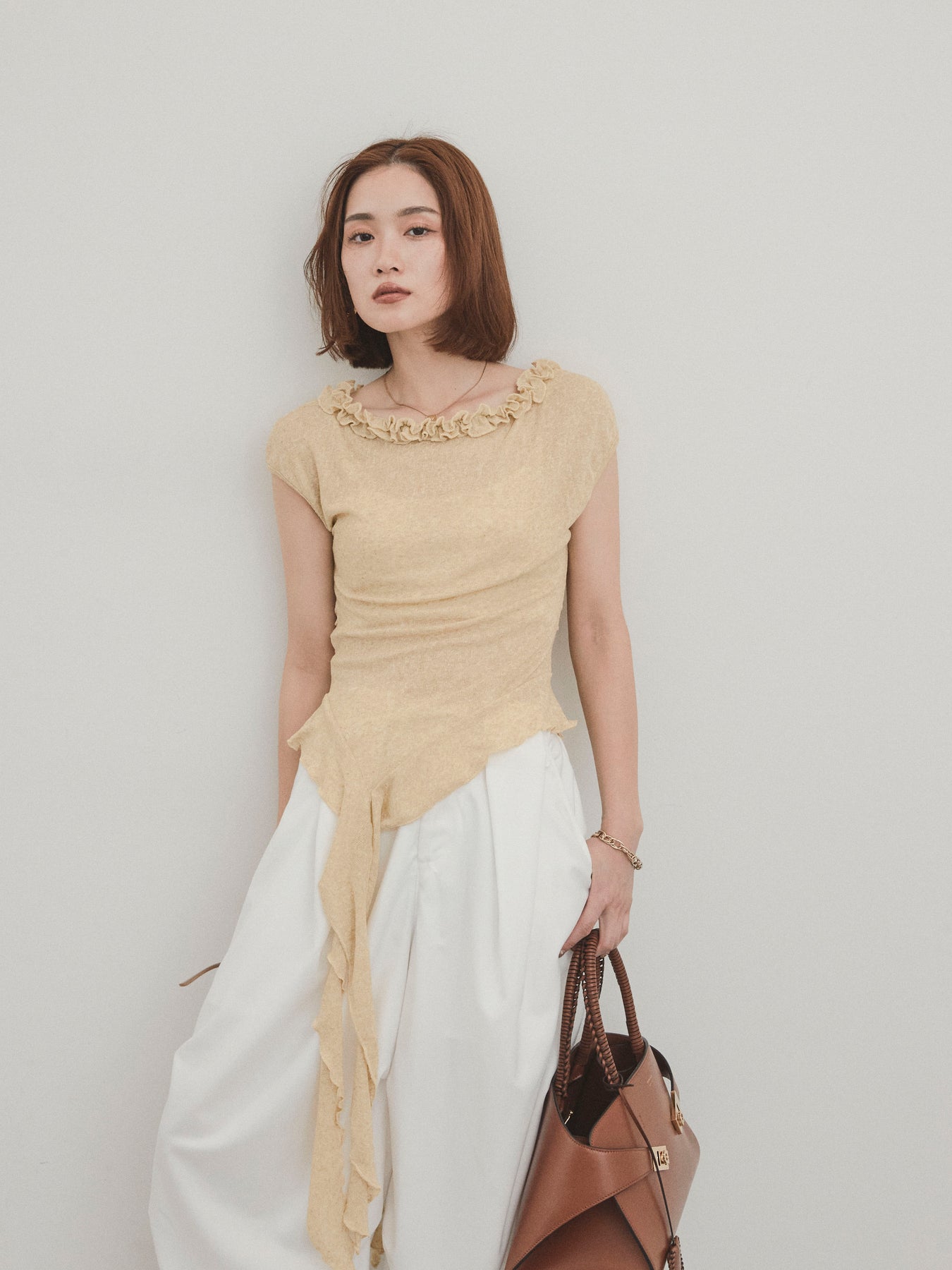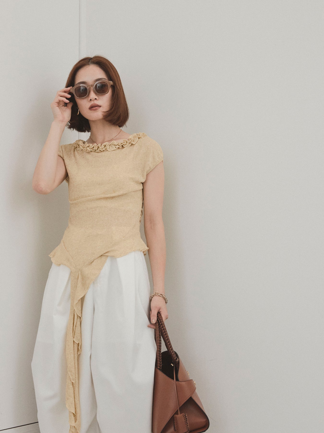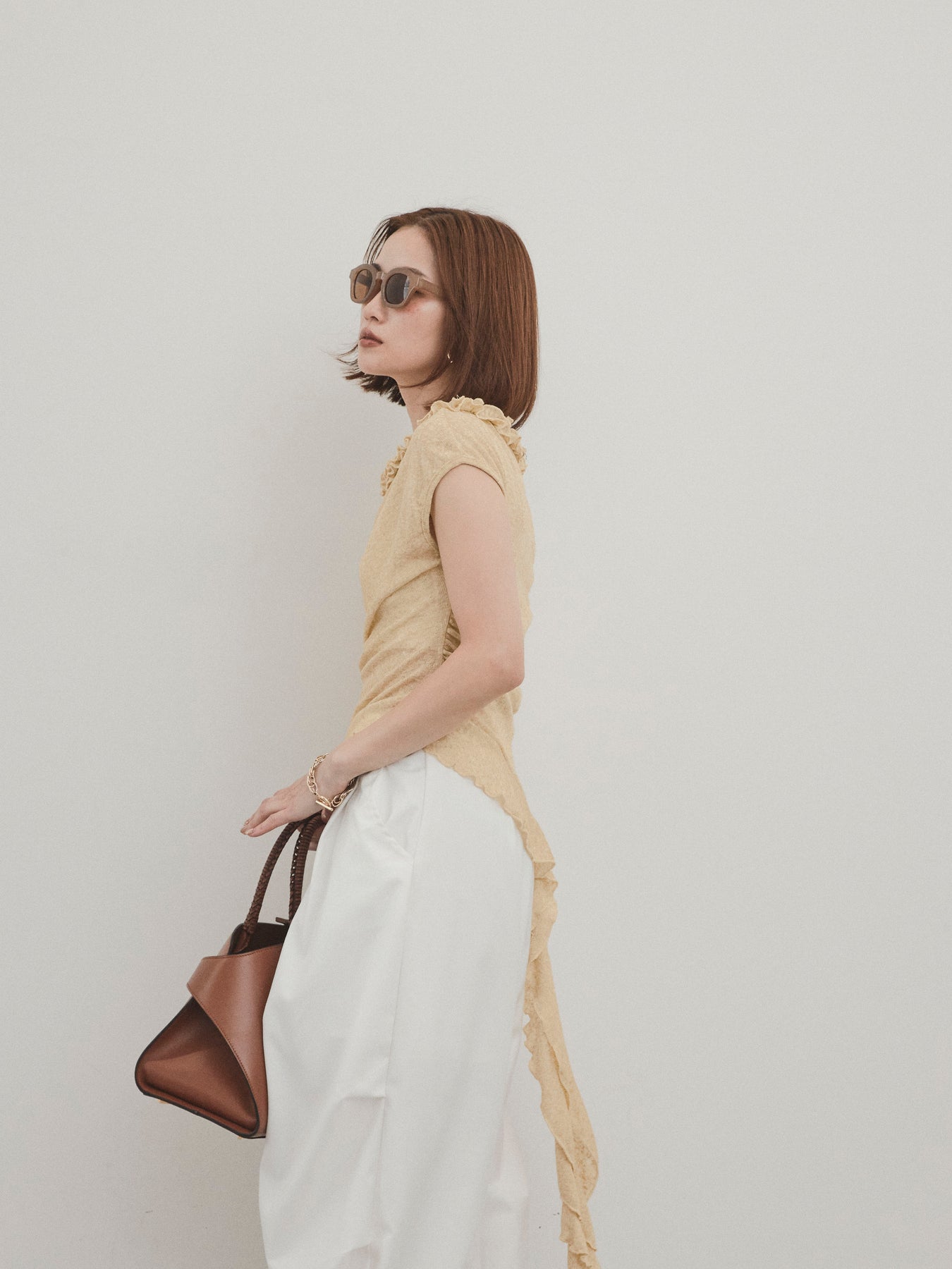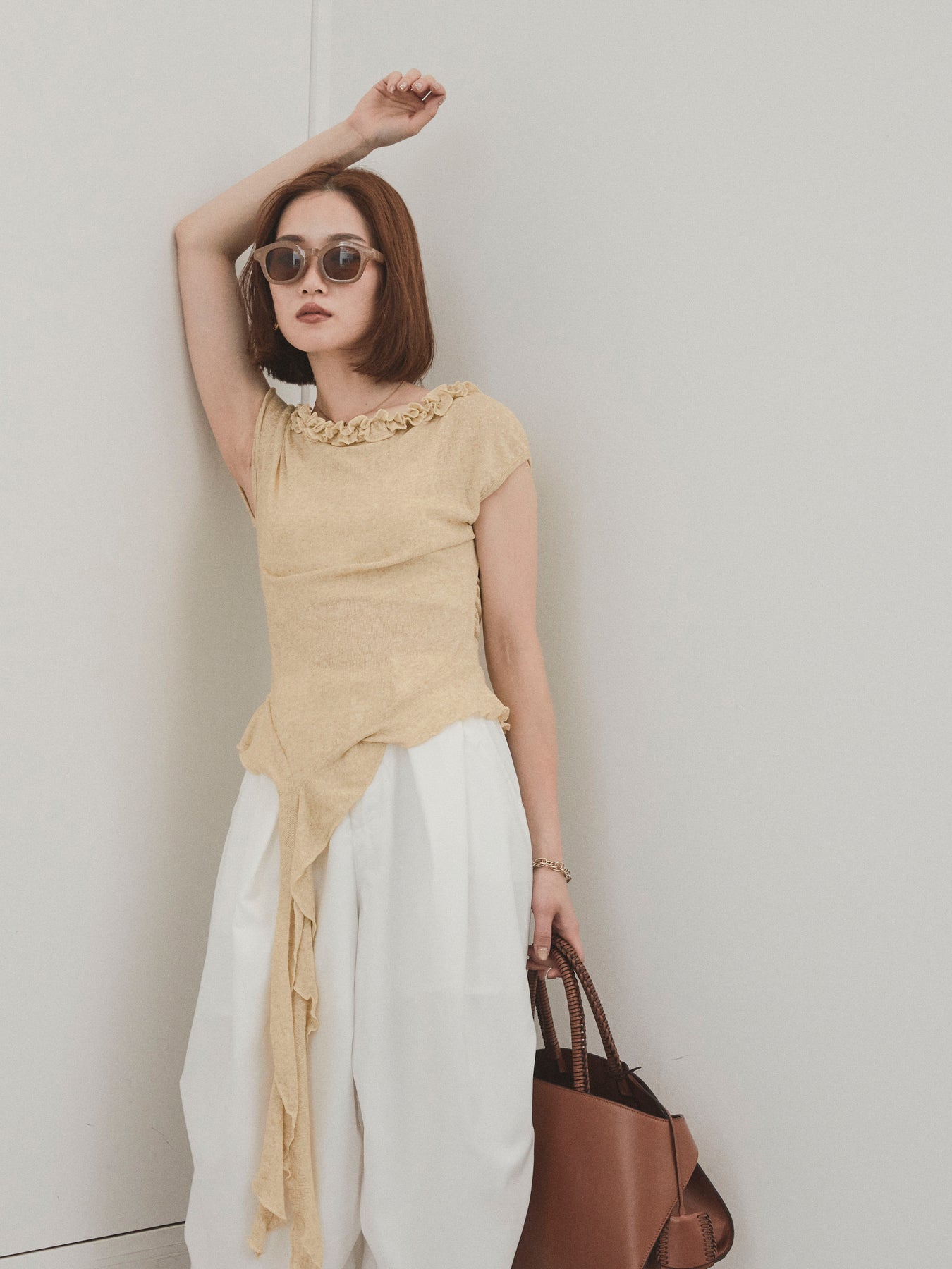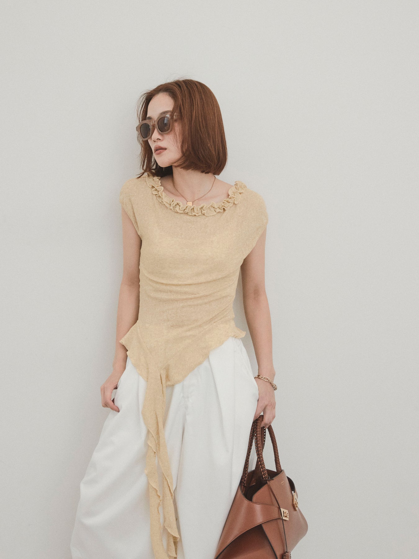 透明針織背心,有褶邊細節,凸顯女性氣質,透明度恰到好處。 從衣領斜向流出的褶邊線條簡潔而又引人注目。 柔軟、貼身的剪裁和涼爽的透明材質使其成為夏季造型的完美選擇。 它可以作為內層與吊帶背心搭配穿著,也可以作為夾克的內層。 它不僅與休閒下裝搭配起來看起來非常輕鬆,而且與裙子和寬褲搭配起來也非常好看。 這件上衣單獨穿得很好看,是夏季的必備單品。