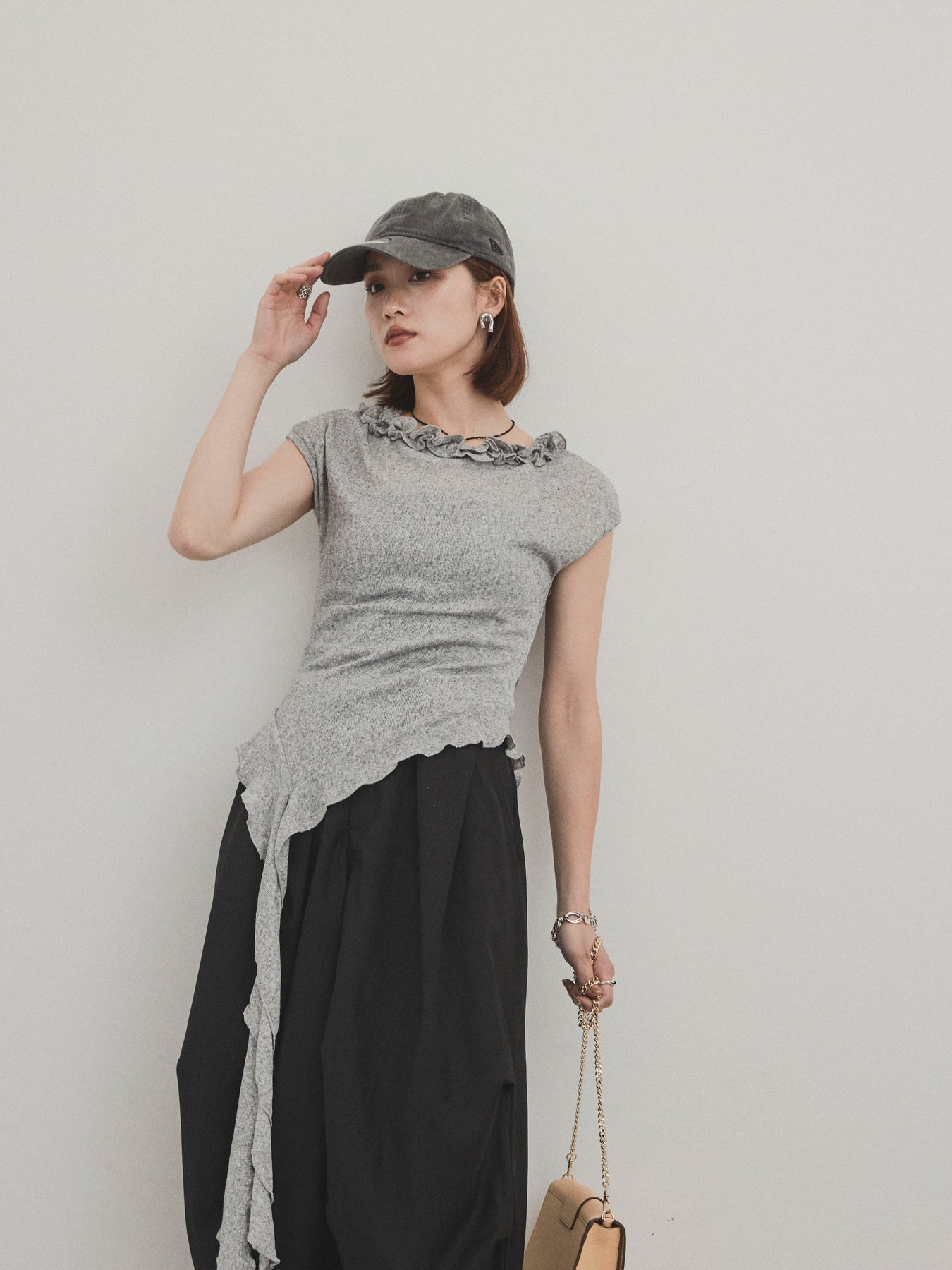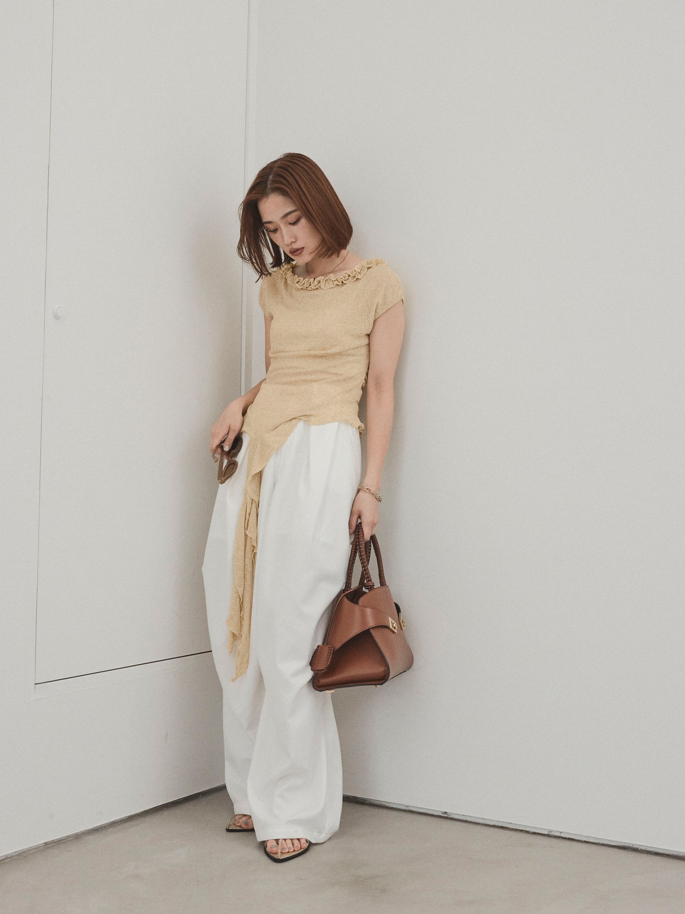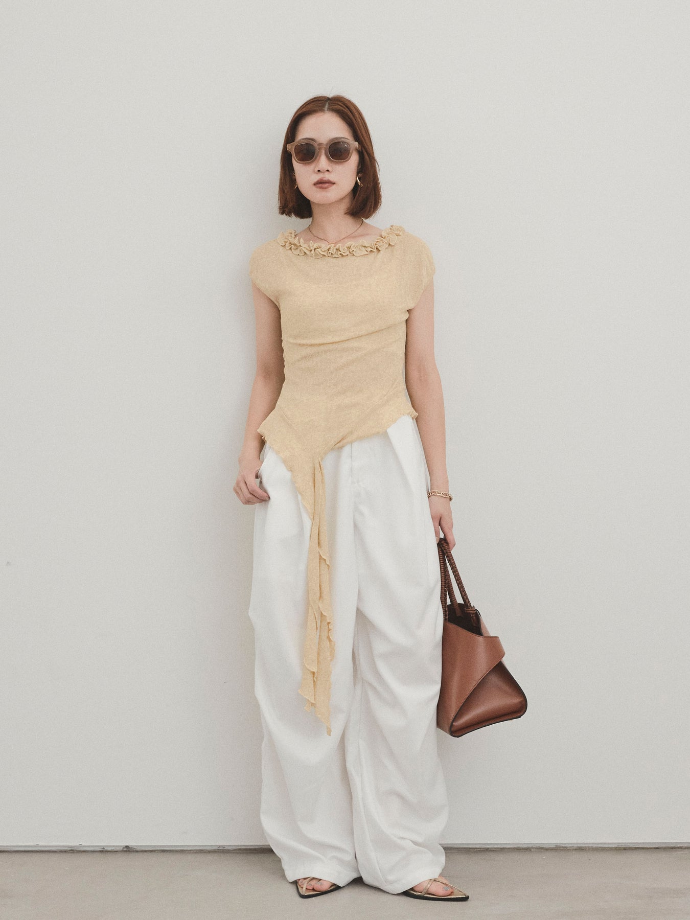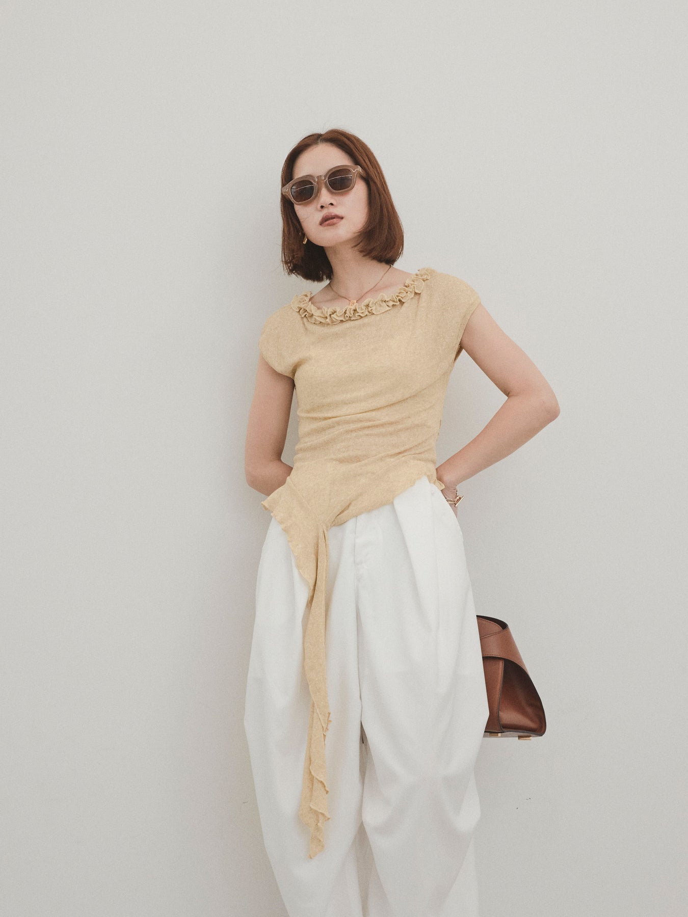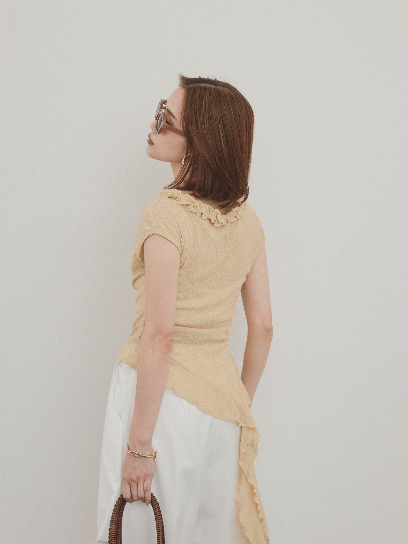 透明針織背心,有褶邊細節,凸顯女性氣質,透明度恰到好處。 從衣領斜向流出的褶邊線條簡潔而又引人注目。 柔軟、貼身的剪裁和涼爽的透明材質使其成為夏季造型的完美選擇。 它可以作為內層與吊帶背心搭配穿著,也可以作為夾克的內層。 它不僅與休閒下裝搭配起來看起來非常輕鬆,而且與裙子和寬褲搭配起來也非常好看。 這件上衣單獨穿得很好看,是夏季的必備單品。
