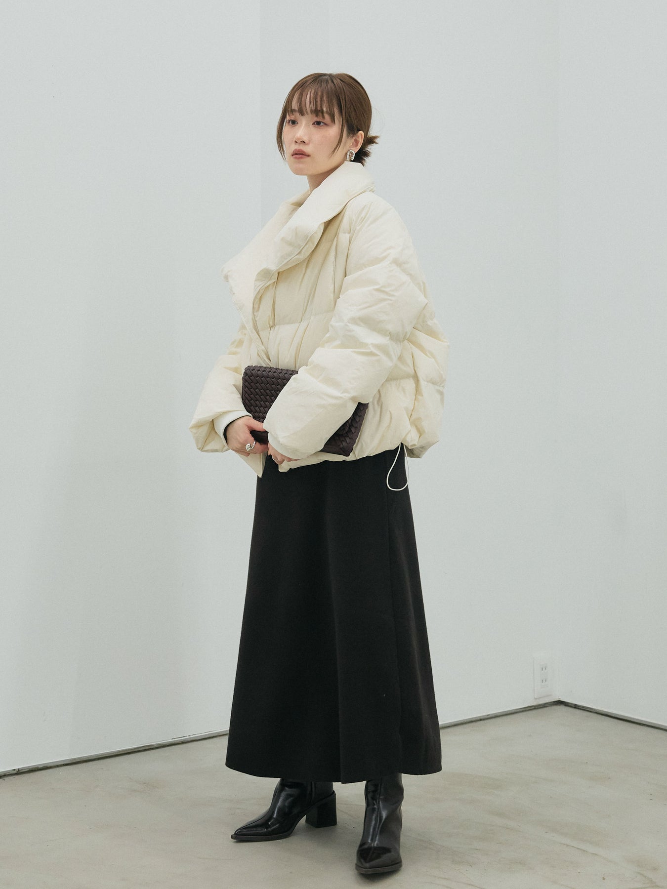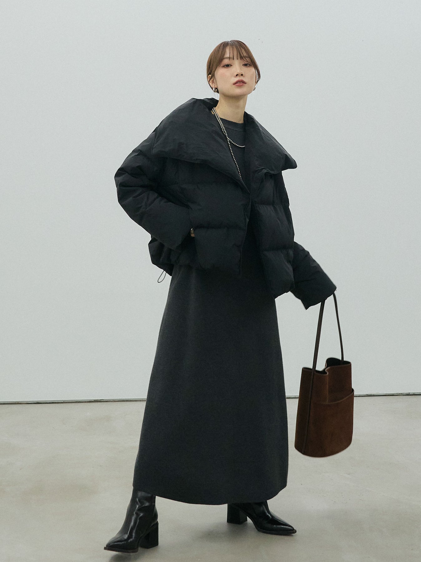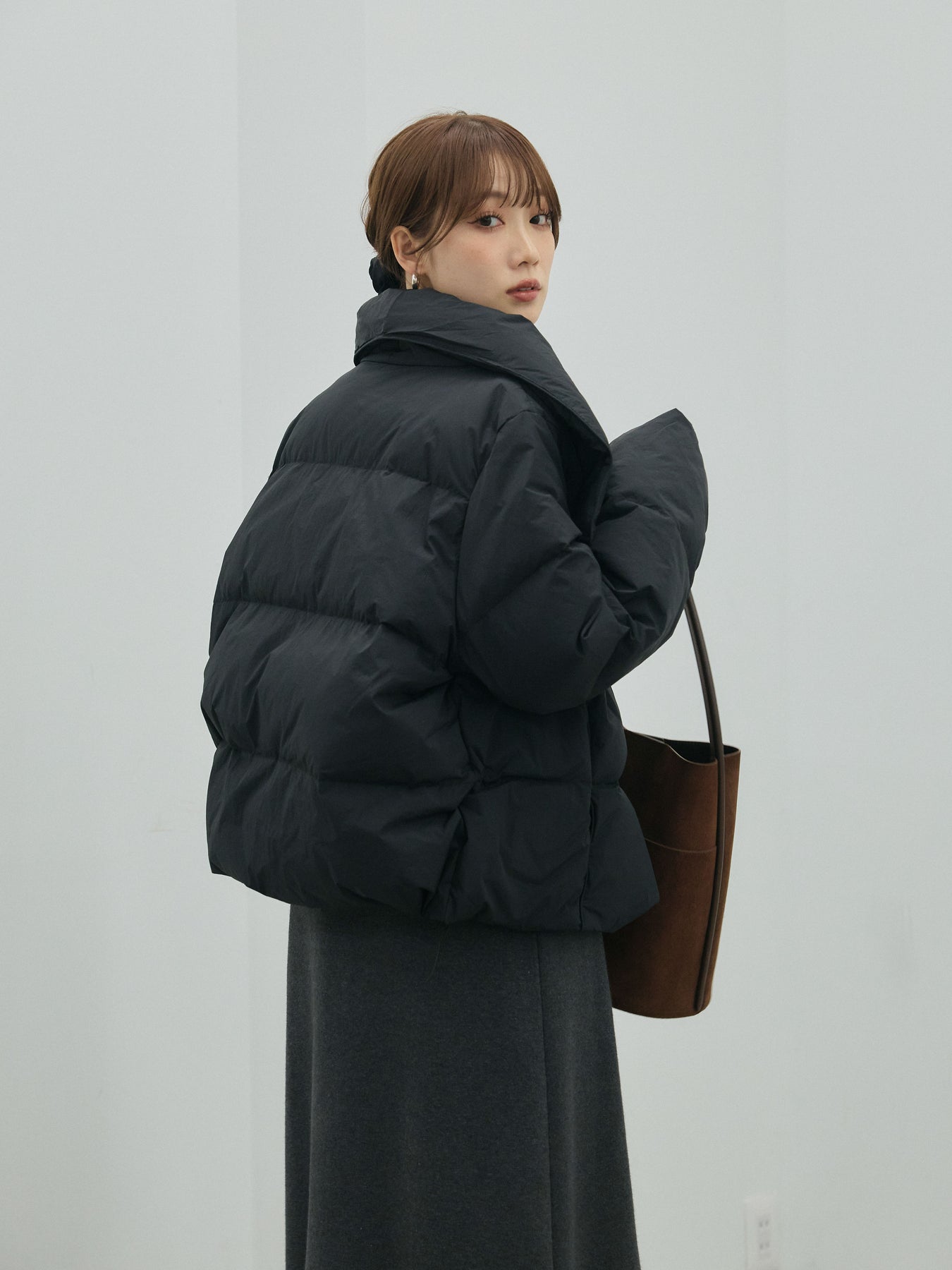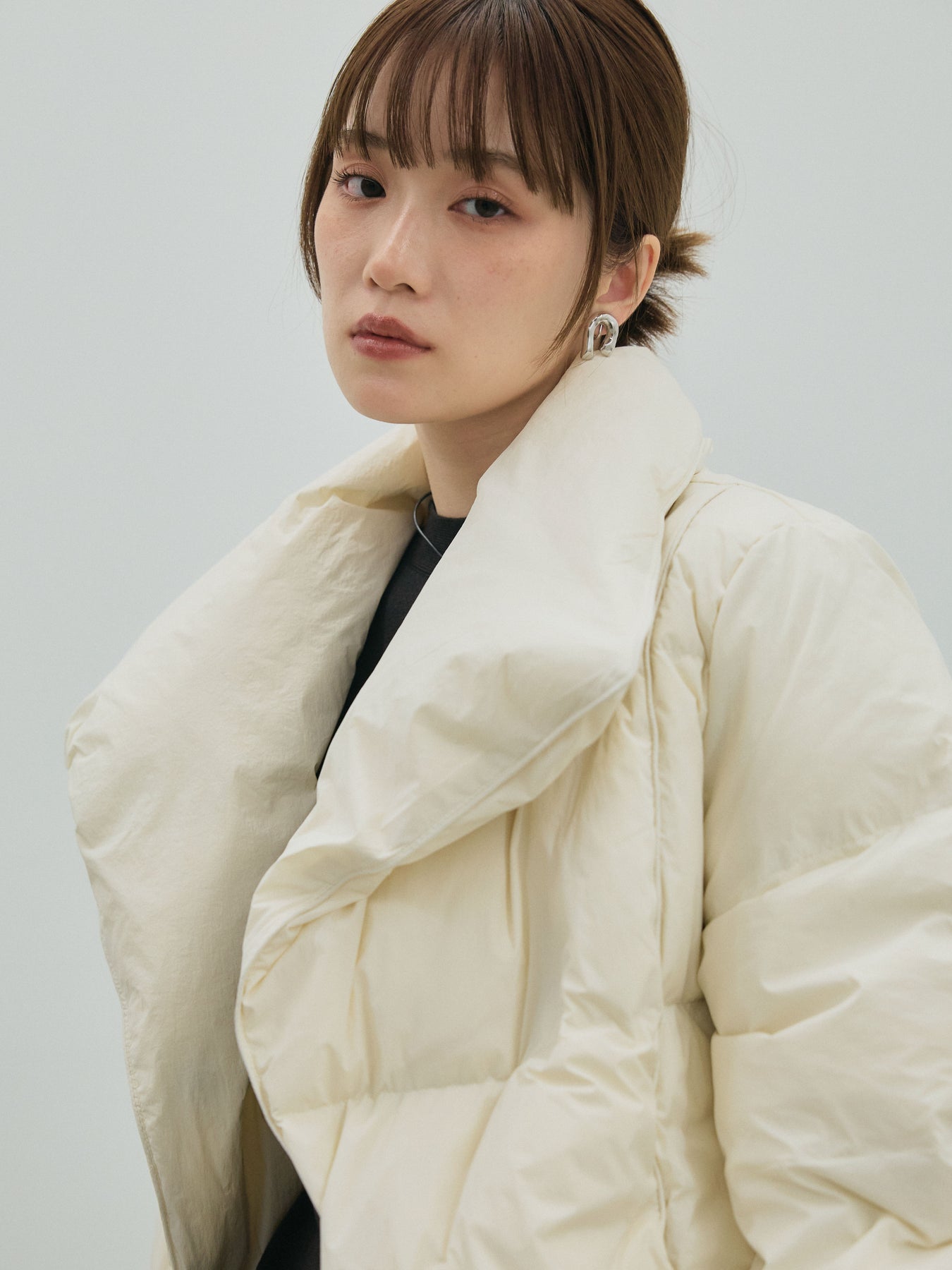 ボリュームのある立体シルエットが魅力のスタンドカラーダウンジャケット。 顔まわりを包み込む大きめのスタンドカラーが、マフラーいらずで暖かく、モードな印象もプラスします。 たっぷりとした袖や身幅のルーズさが今っぽく、厚手のニットやワンピースの上からもバランスよく着用可能。 ショート丈のバランス感でボトムスを選ばず、スカートともパンツとも好相性です。 季節の変わり目から真冬まで長く着回せる、機能性とデザイン性を兼ね備えた一枚です。