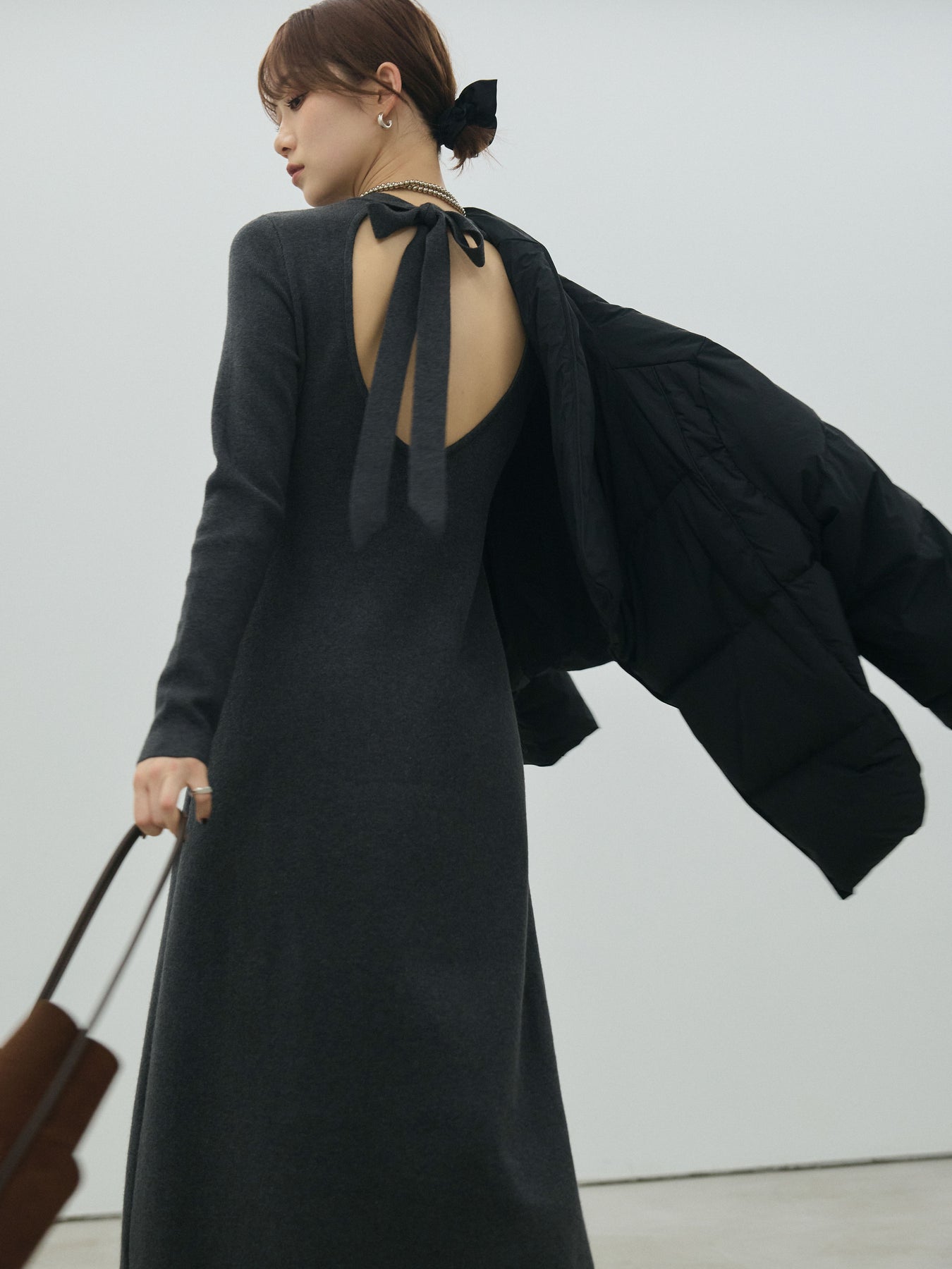 背中に大胆なカッティングを施したバックオープンデザインが印象的なニットワンピース。 柔らかく身体に馴染むリブニット素材で、シンプルながらも女性らしい美しいシルエットを演出します。 首元には長めのリボンをあしらい、後ろ姿にもさりげないアクセントをプラス。 一枚で主役になるデザインは、デートやお呼ばれシーンにもおすすめです。 ロングブーツやアクセサリーとの合わせ次第で、シーズンムードを高める着こなしに。