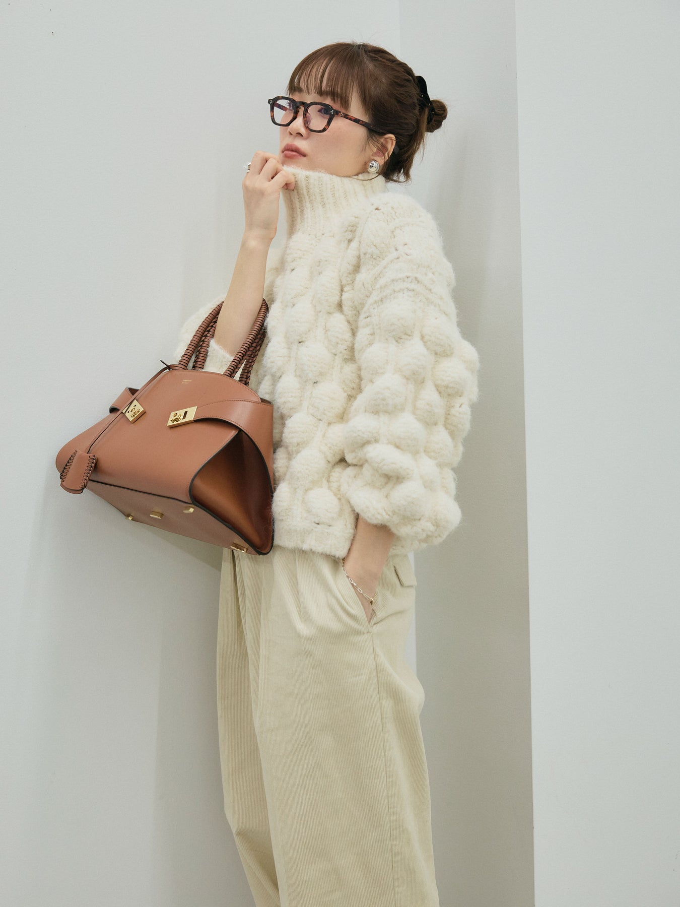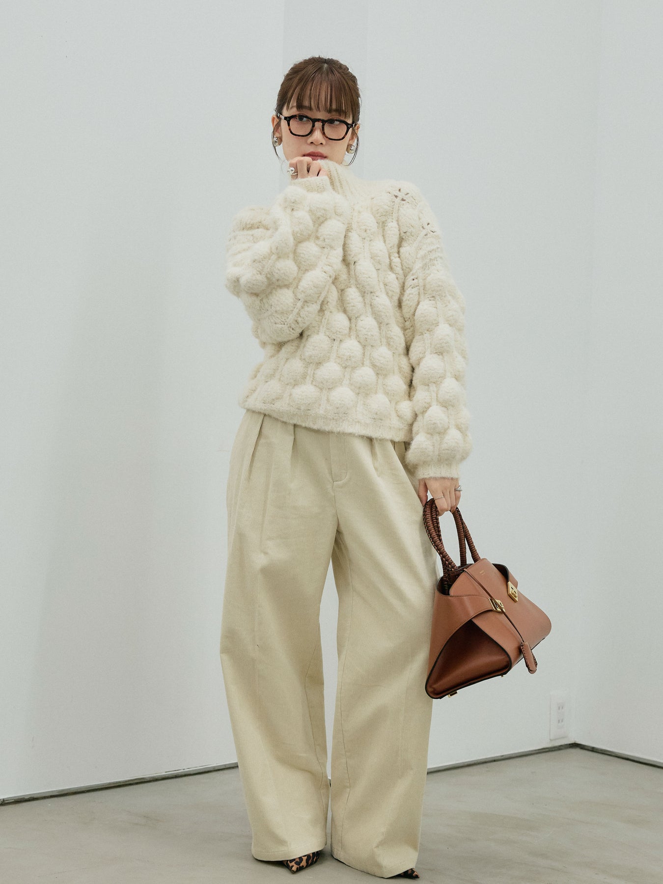 立体感のあるポコポコとした編地が目を惹く、存在感抜群のニットプルオーバー。 ふんわりとしたモヘアライクな風合いで、柔らかさと軽さを両立。 ボリュームのあるスリーブとハイネックデザインが、シンプルながらも印象的なバランスを演出します。 ワイドパンツやマーメイドスカートなど、メリハリのあるボトムと好相性で、着るだけで主役級のスタイルが完成します。