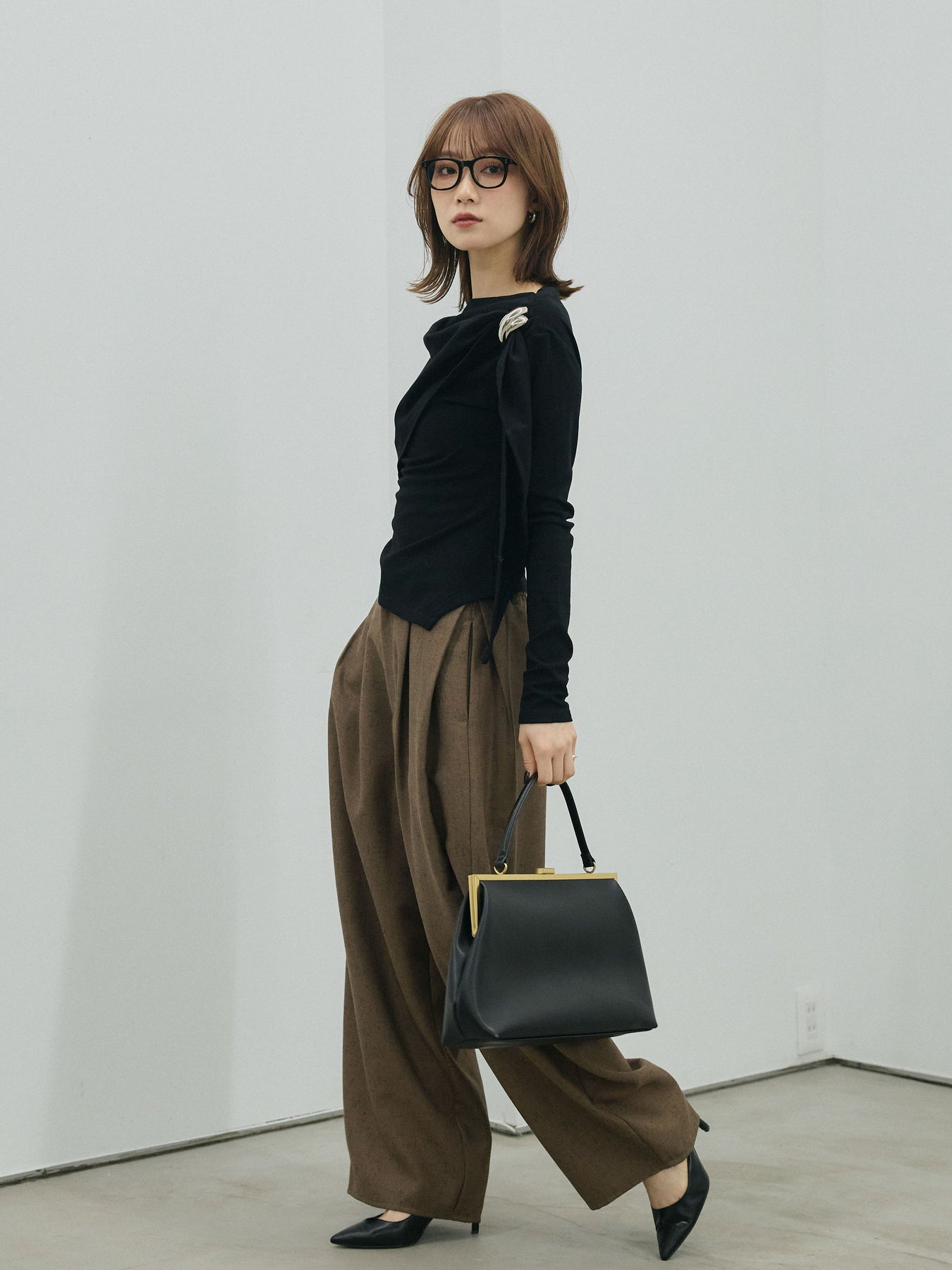 [予約]ブローチ付ドレープ裏起毛トップス/black