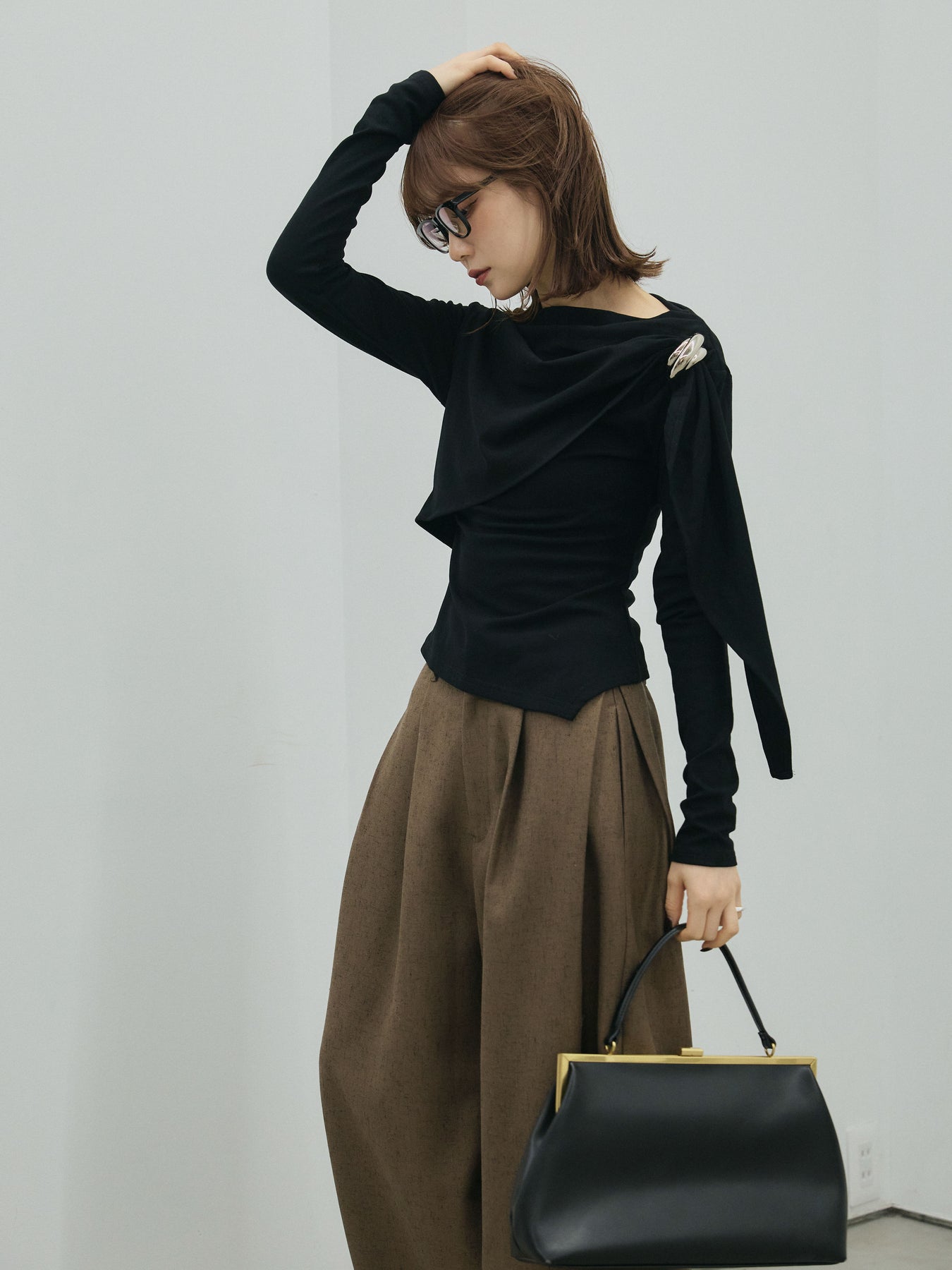 立体感のあるドレープデザインが目を惹く、モード感漂う長袖トップス。 片肩にあしらった取り外し可能なブローチが、さりげなくアクセントを添えてくれます。 柔らかな肌触りの裏起毛素材で、着心地も暖かさも兼ね備えた一枚。 一枚で着映えしながらも、ボトムスを選ばず幅広いスタイリングに活躍します。