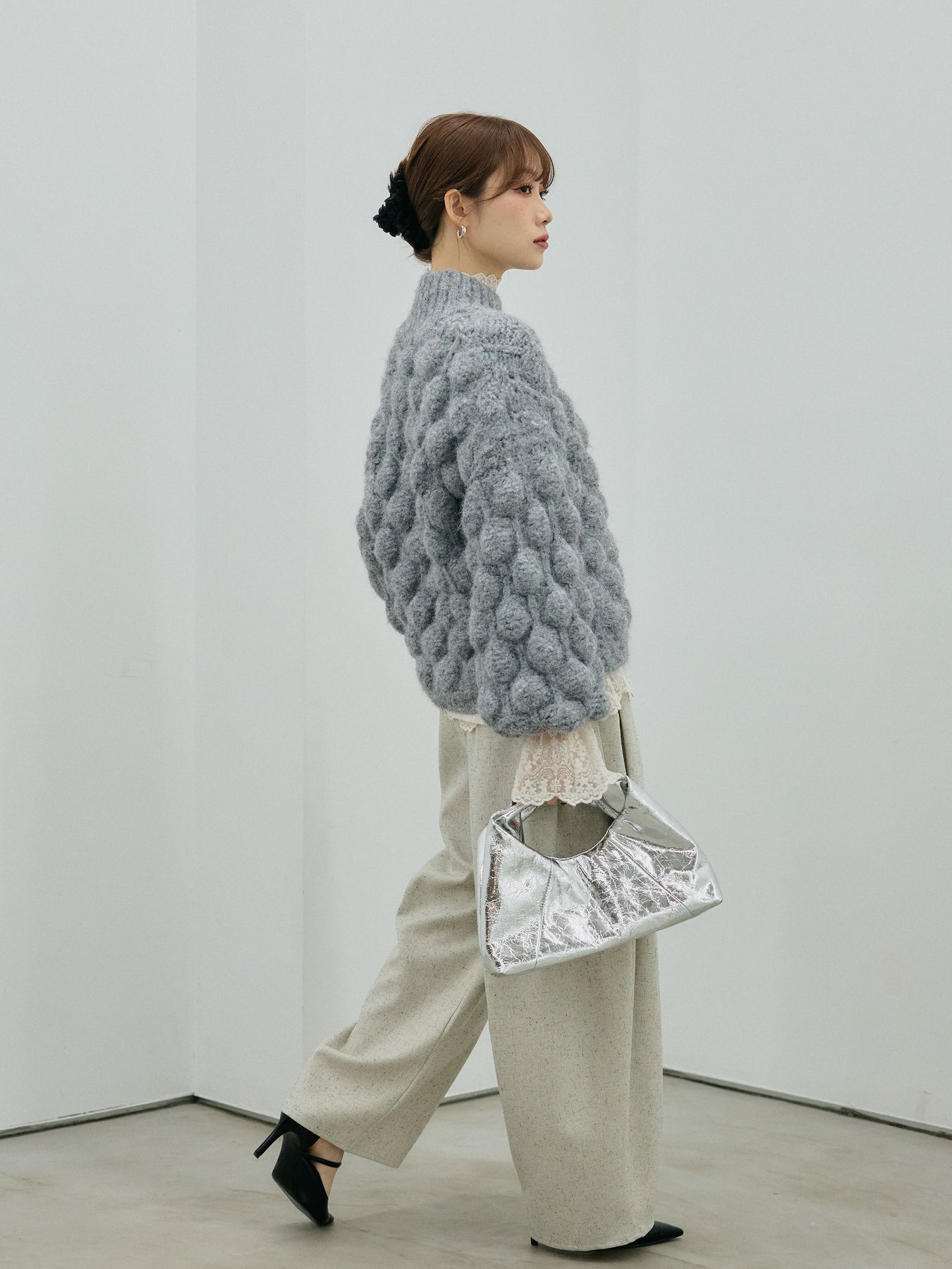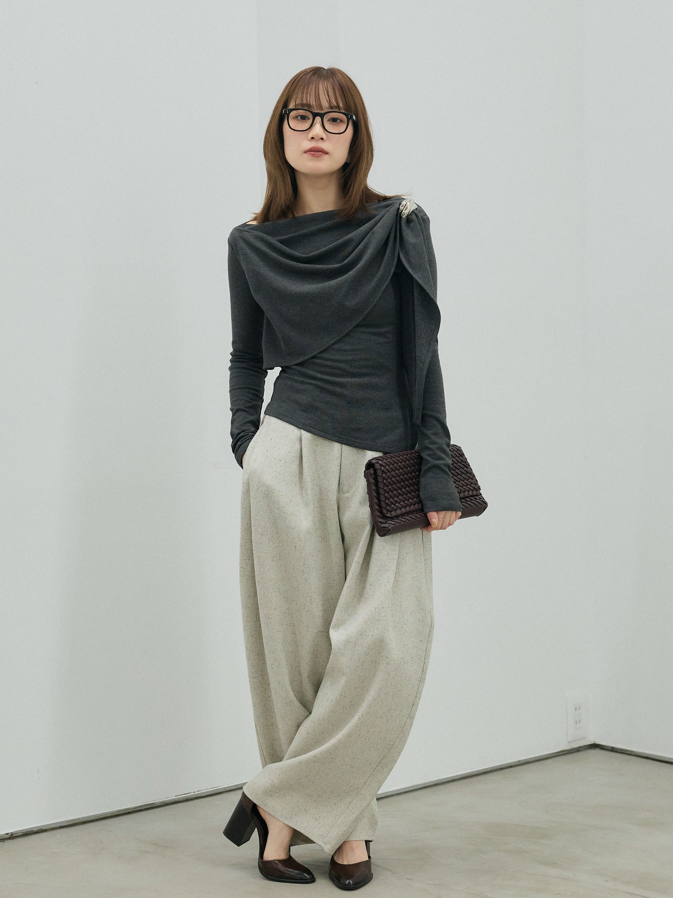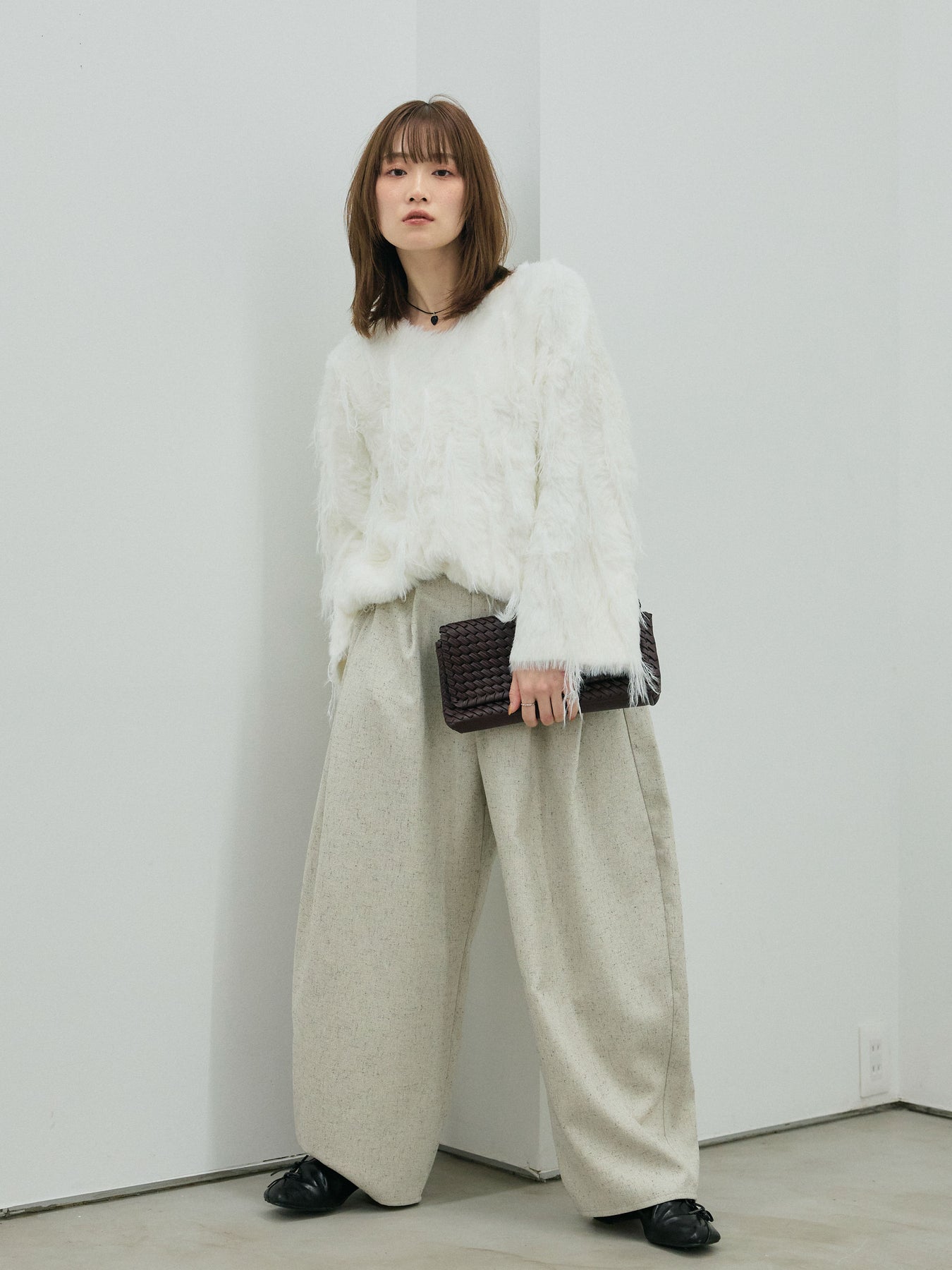 程よいハリ感のあるモックスカルゼ素材を使用した、立体感のあるコクーンシルエットパンツ。 サイドに施された深めのタックが動きを生み、モードな印象を引き立てます。 ウエストはバックゴム仕様で、見た目のすっきりさと快適な穿き心地を両立。 ヒール合わせはもちろん、フラットシューズやブーツとの相性も良く、幅広いスタイリングが楽しめる一本です。