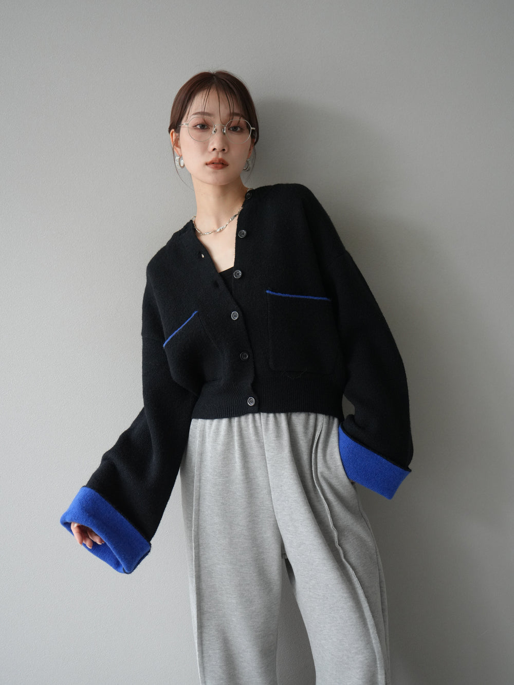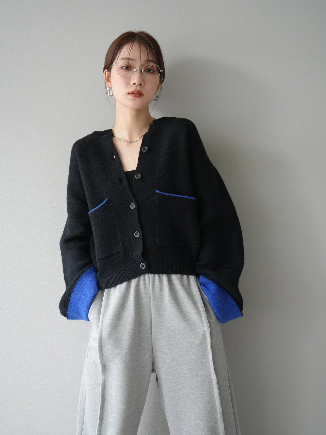 【預購】雙色針織開襟衫/黑色