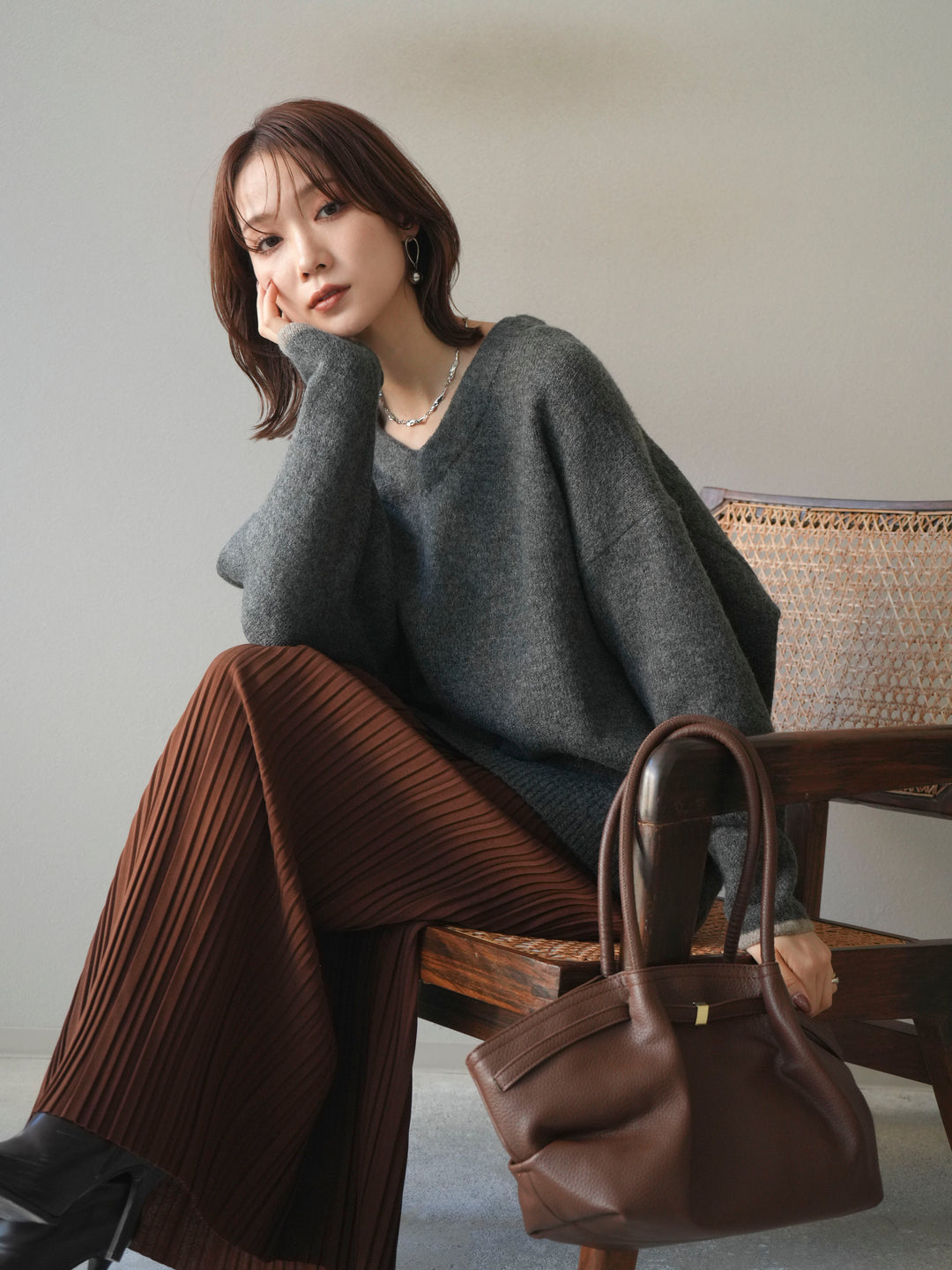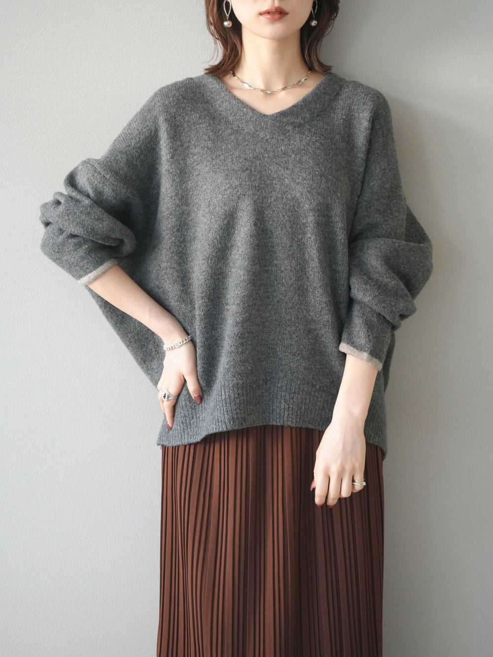 【預訂】V領撞色袖針織套頭衫/炭灰
