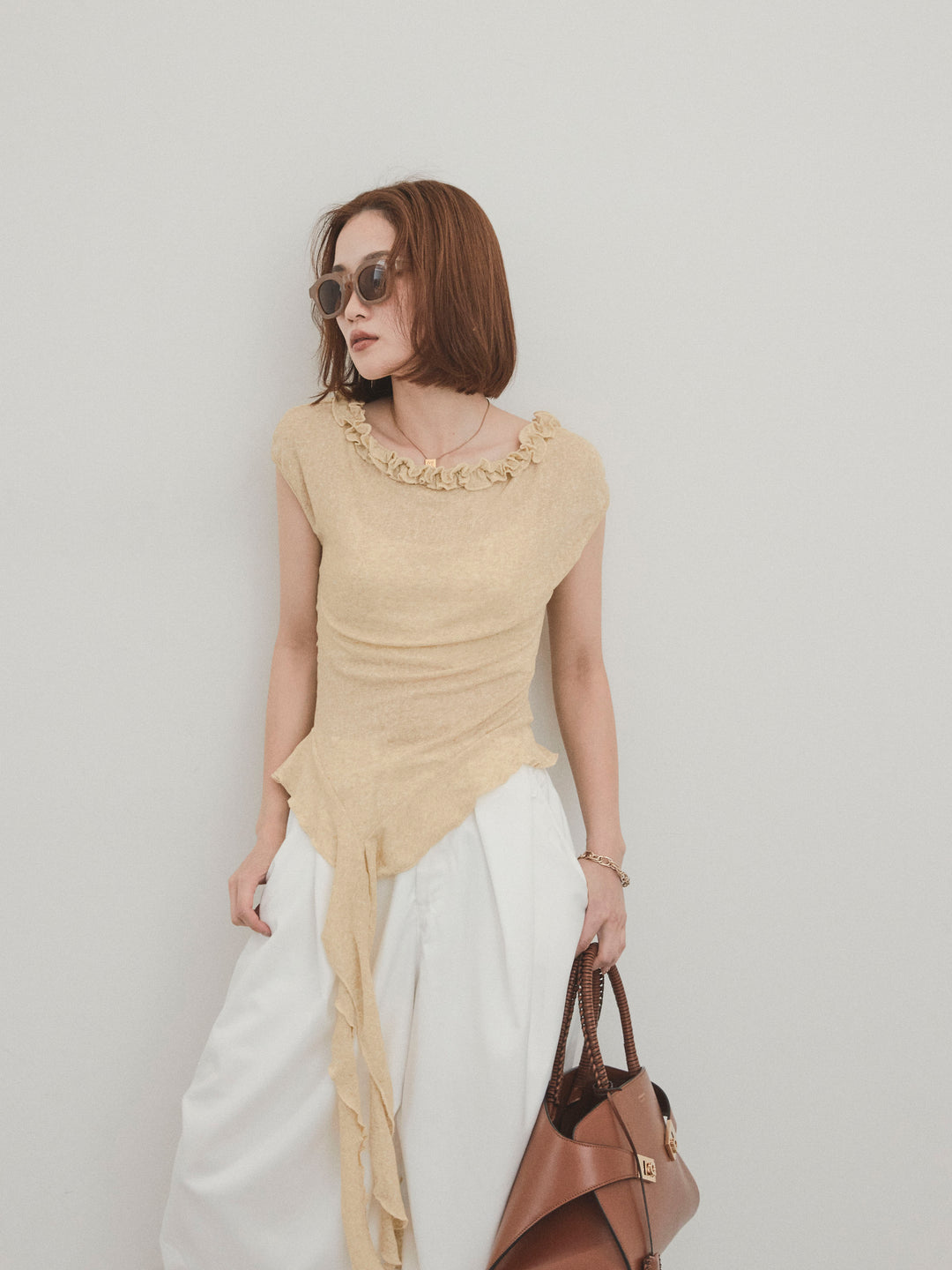 [套裝] 荷葉邊透視針織背心 + 設計環側褶褲 (2 套)