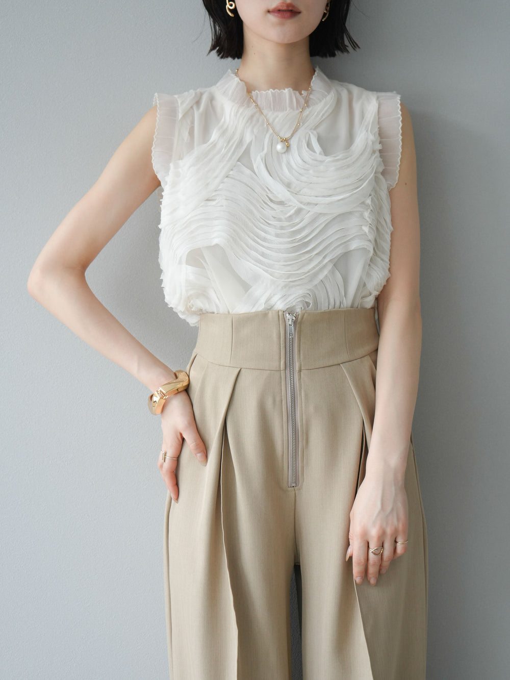 [SET] 薄紗提花無袖上衣 + 拉鍊褶襉寬褲 (2set)