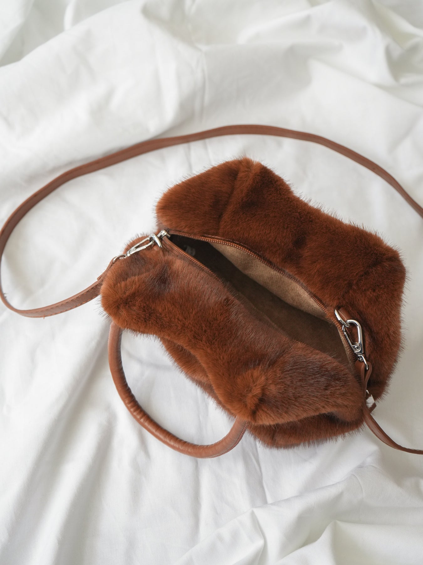 ふわふわのエコファー素材がシーズンムードたっぷりのミニハンドルバッグ。 手のひらサイズのコンパクトなフォルムながら、内側にはマチがあり、ミニ財布やリップなど必要最低限の小物がしっかり収まります。 短めのハンドルデザインがスタイリングのアクセントに。カジュアルにもフェミニンにもマッチするデザインで、秋冬のコーディネートにぴったりなアイテムです。