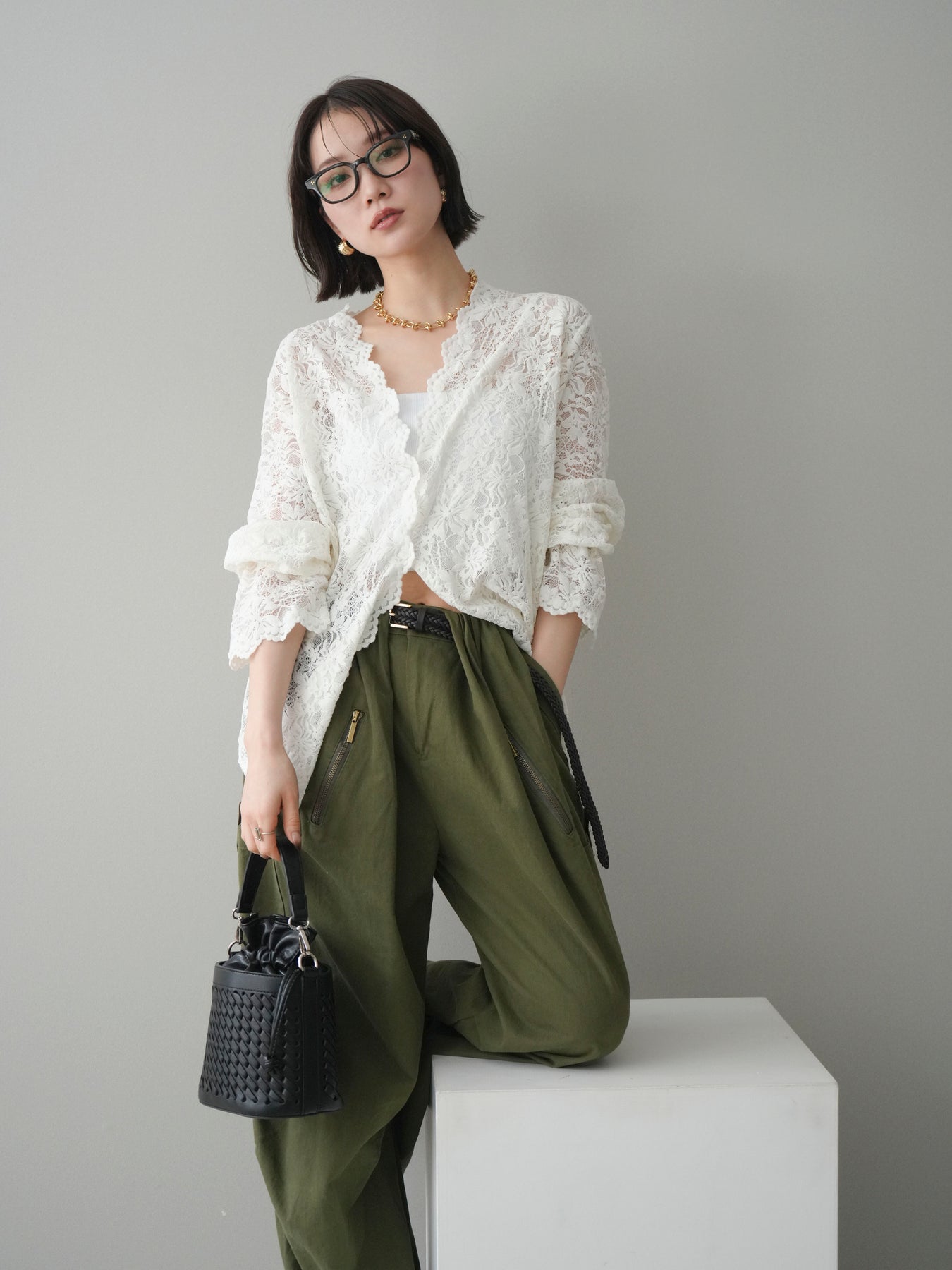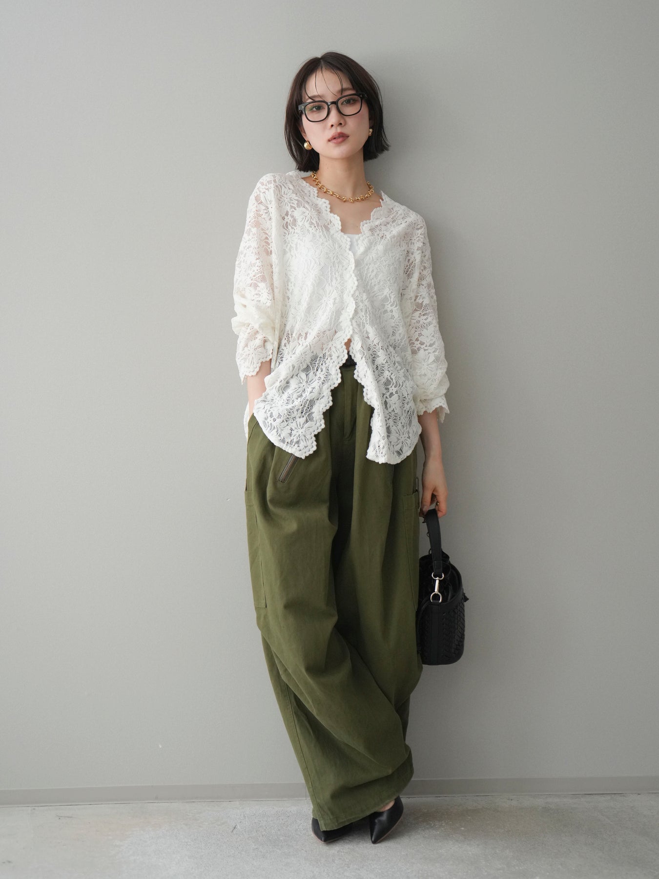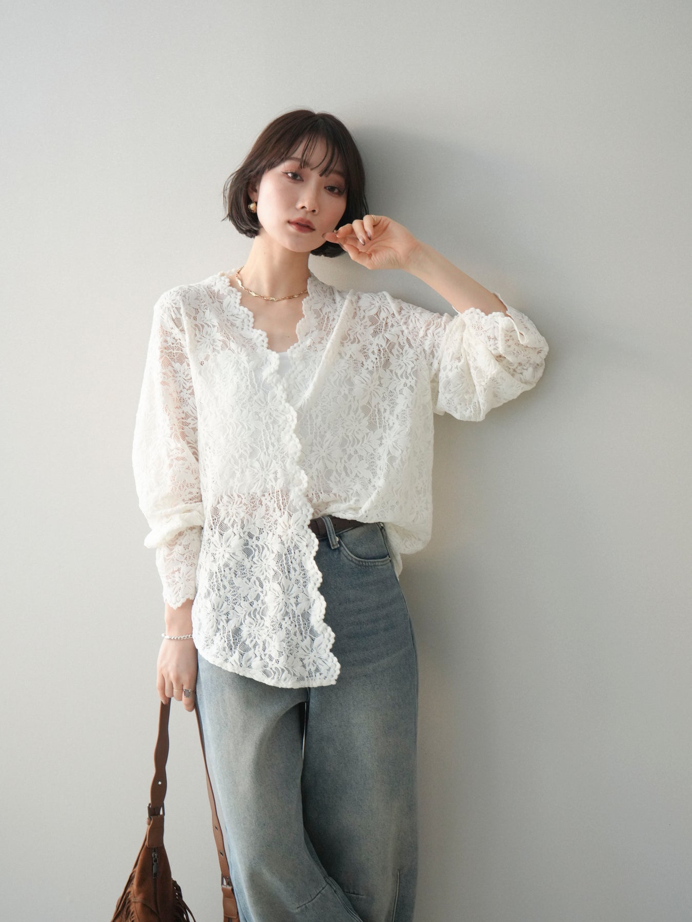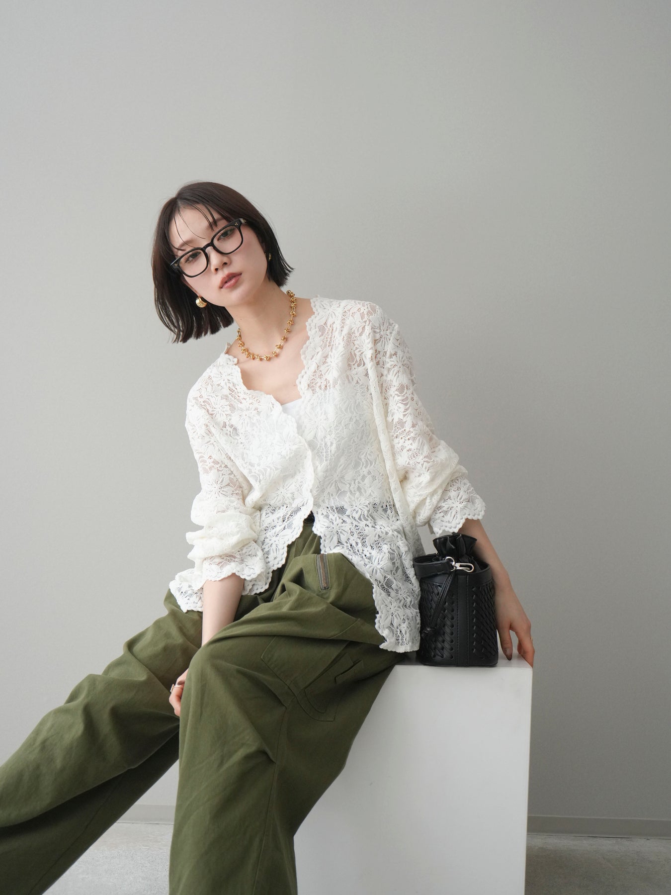 繊細な総レース素材が印象的なVネックカーディガン。程よく透け感のあるレースが、軽やかで女性らしい雰囲気を演出し、スタイリングに奥行きをプラスします。Vネックデザインが顔まわりをすっきりと見せ、前を閉じてトップスとしても、羽織りとしてもバランス良く着用可能。シンプルなインナーに重ねるだけで華やかさが引き立ち、デイリーからきれいめシーンまで幅広く活躍する一着です。 ※ボトムス、キャミソール(インナー)以外の商品は一律でインナーは付属していません。