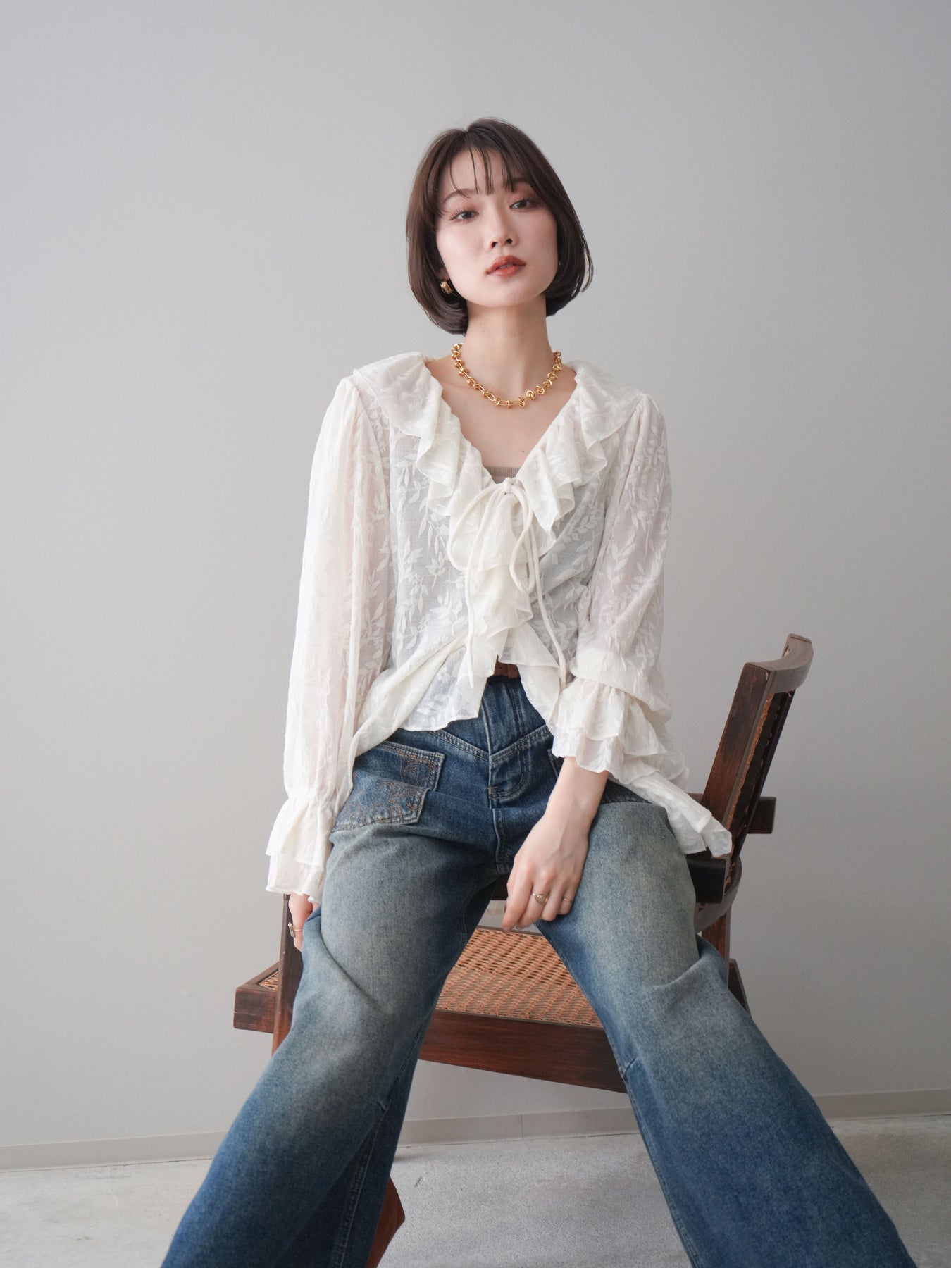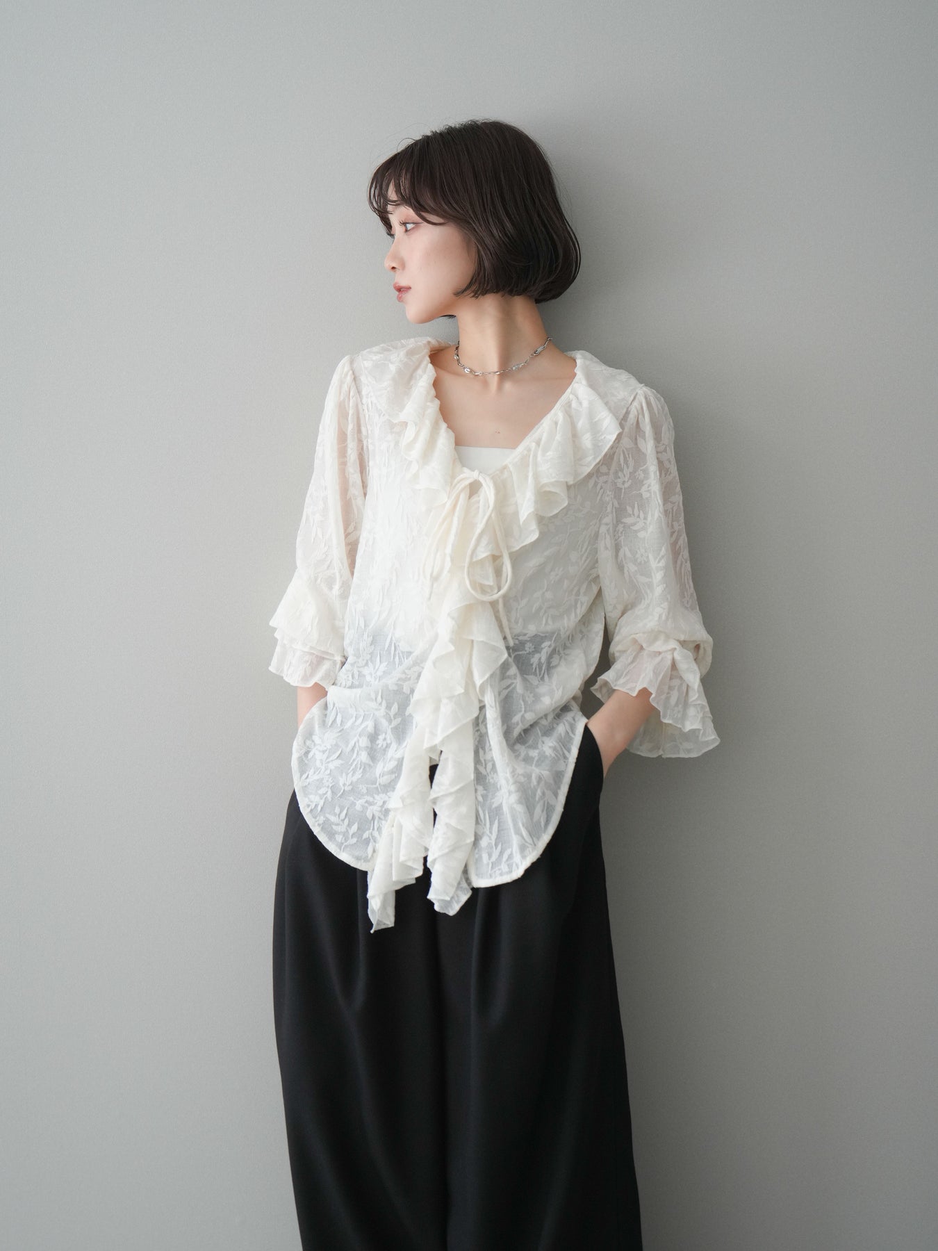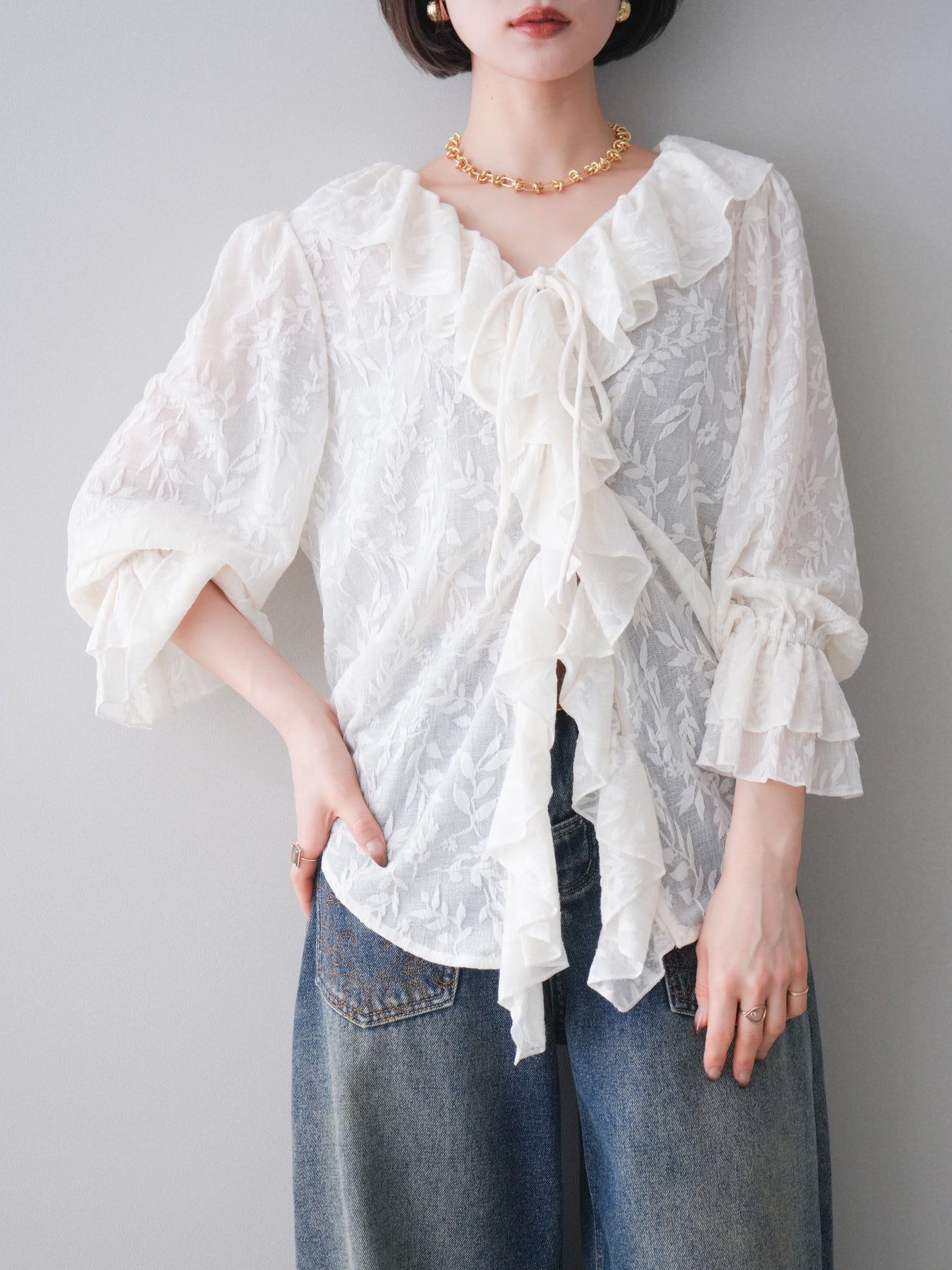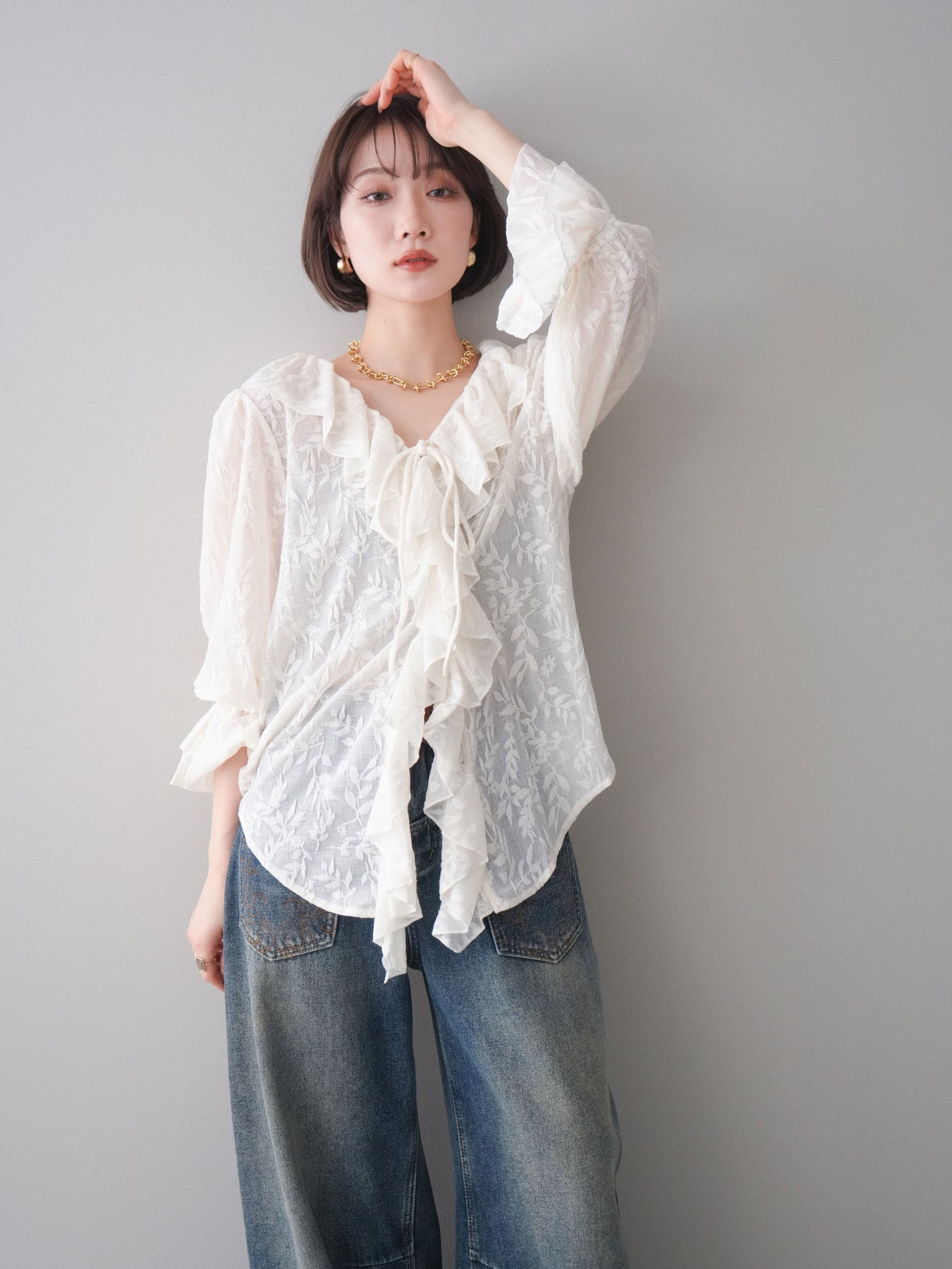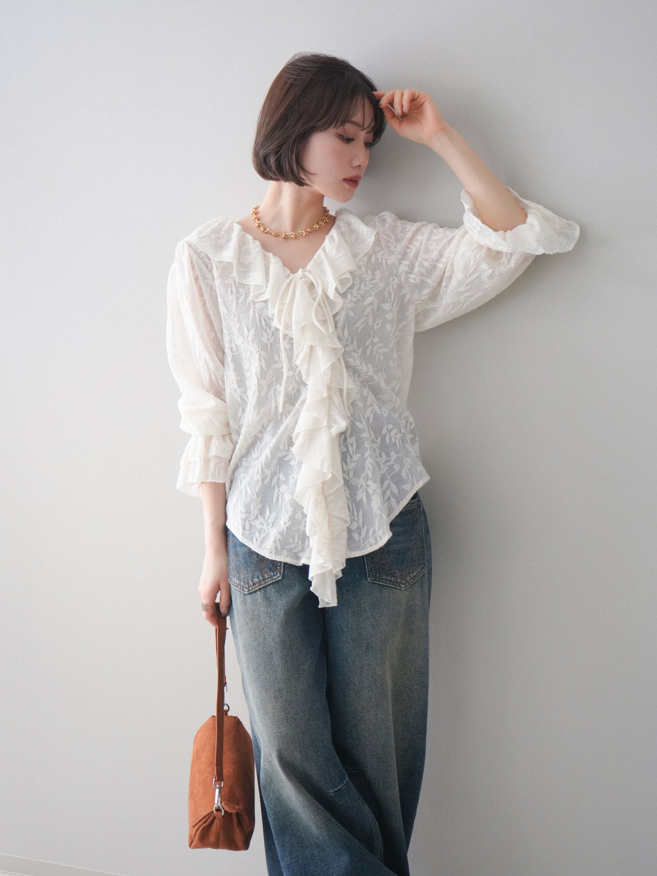 繊細なレース素材にラッフルデザインを施した、華やかさのあるブラウス。フロントのラッフルとスリットディテールが縦のラインを強調し、軽やかで抜け感のある印象に仕上げます。程よい透け感が女性らしさを引き立て、1枚で着映えするデザイン。袖口にもフリルをあしらい、細部までこだわった仕上がりです。デニムなどのカジュアルアイテムから、きれいめボトムスまで幅広く合わせやすく、デイリーからお出かけまで活躍する一着です。 ※ボトムス、キャミソール(インナー)以外の商品は一律でインナーは付属していません。