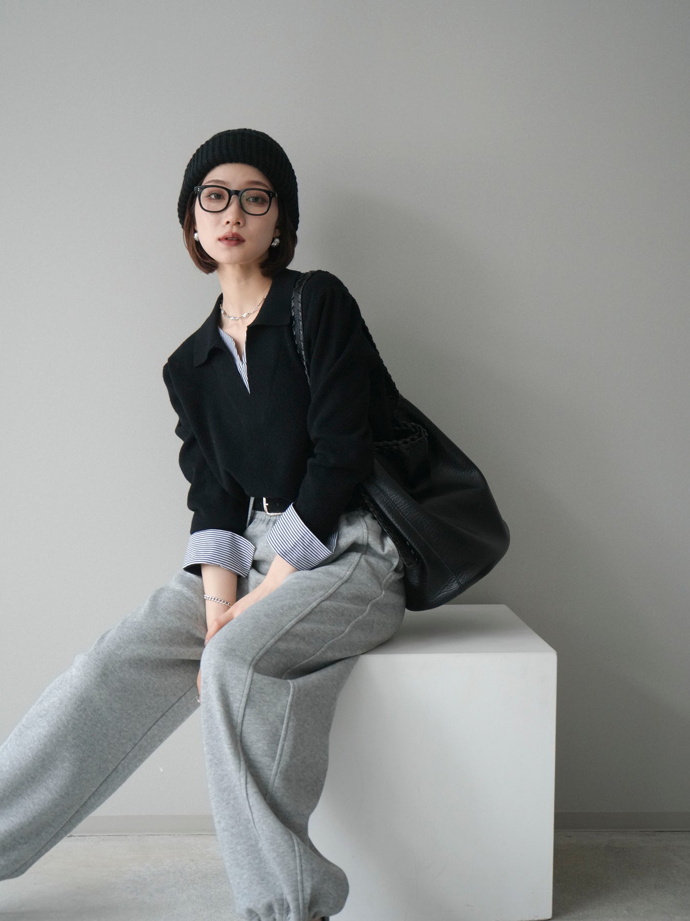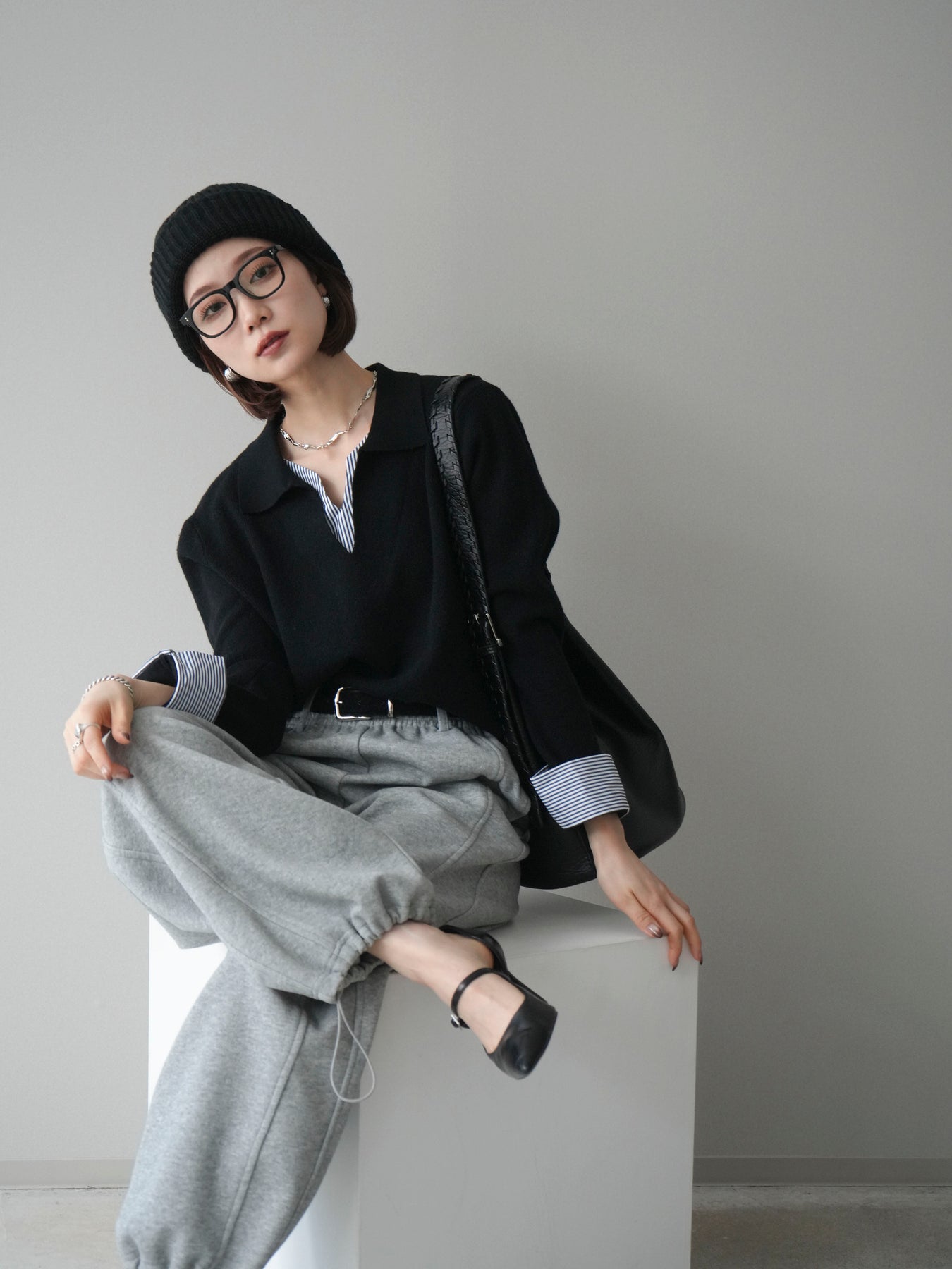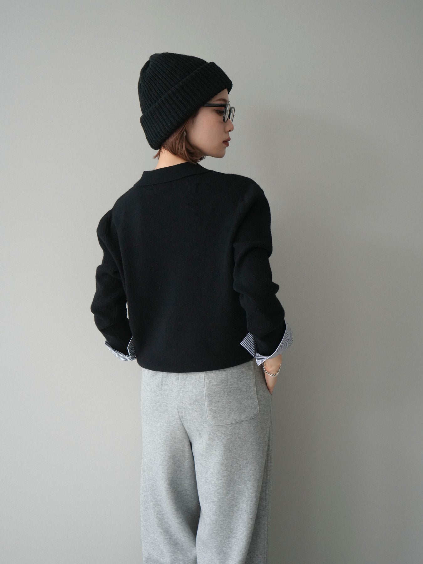 [予約]シャツレイヤードスキッパーニットプルオーバー/black