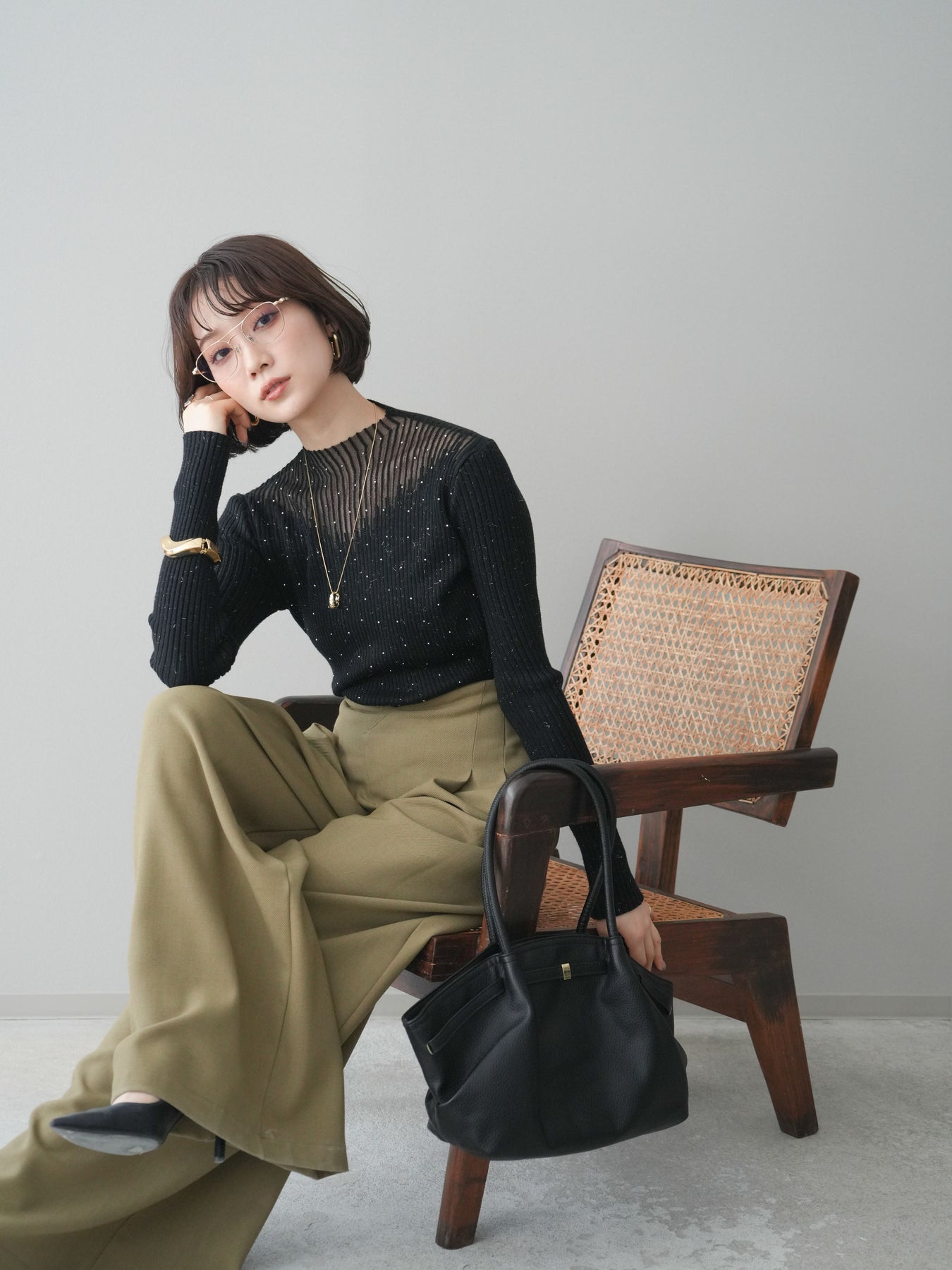 さりげく煌めくスパンコールと、シアー切替デザインが印象的なリブニットトップス。繊細な透け感がデコルテや肩まわりを軽やかに演出し、シンプルな中にも女性らしい華やかさをプラスします。程よくフィットするリブ素材がすっきりとしたシルエットを叶え、1枚ではもちろん、ジャケットやカーディガンのインナーとしても着映えする一着。デイリーからきれいめシーンまで、幅広いスタイリングに取り入れやすいアイテムです。 ※ボトムス、キャミソール(インナー)以外の商品は一律でインナーは付属していません。