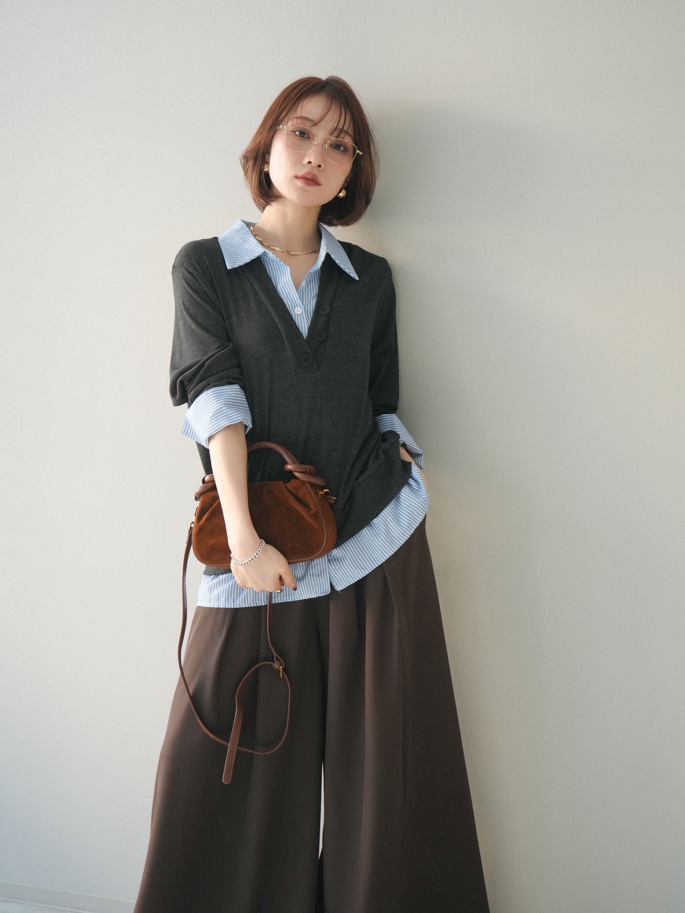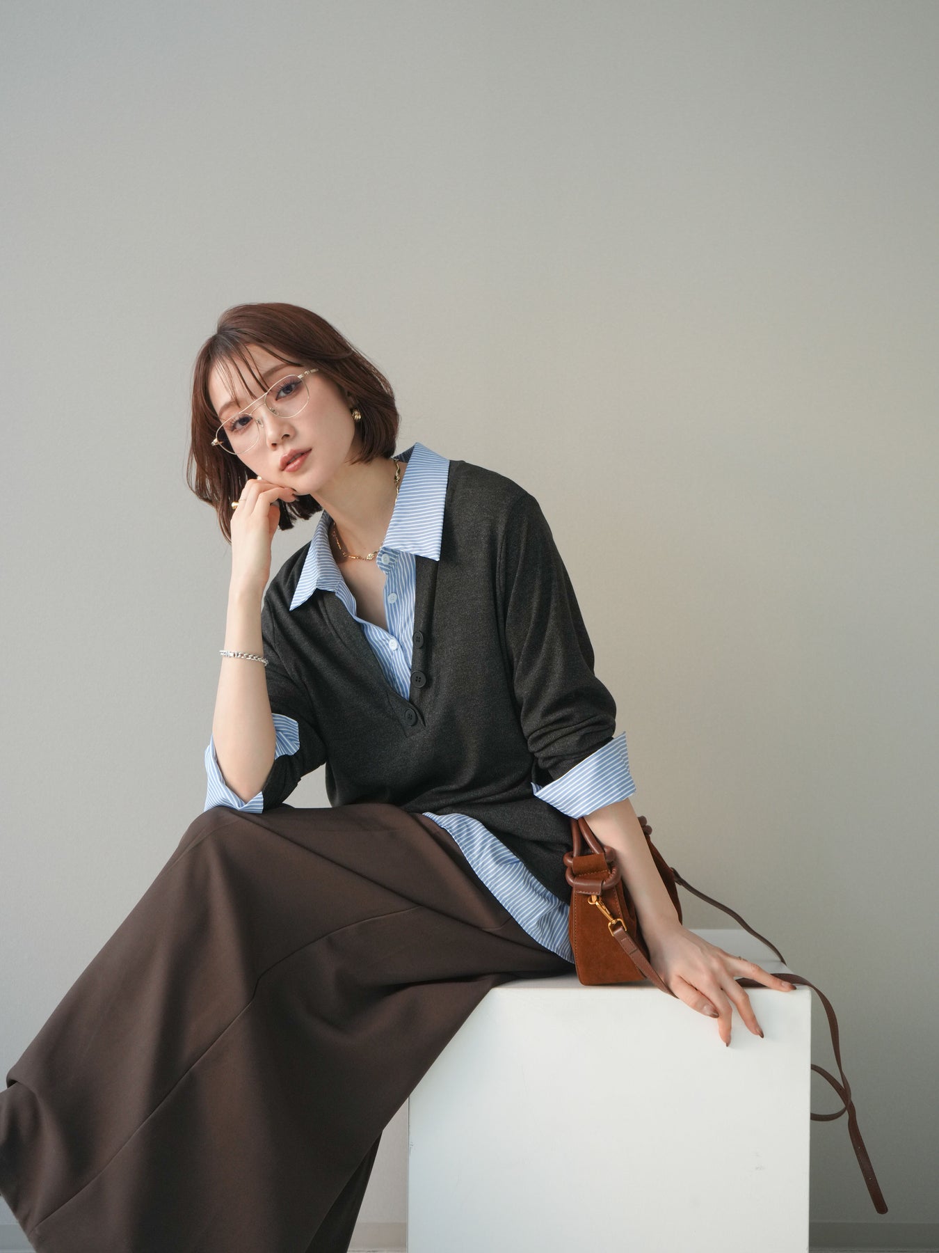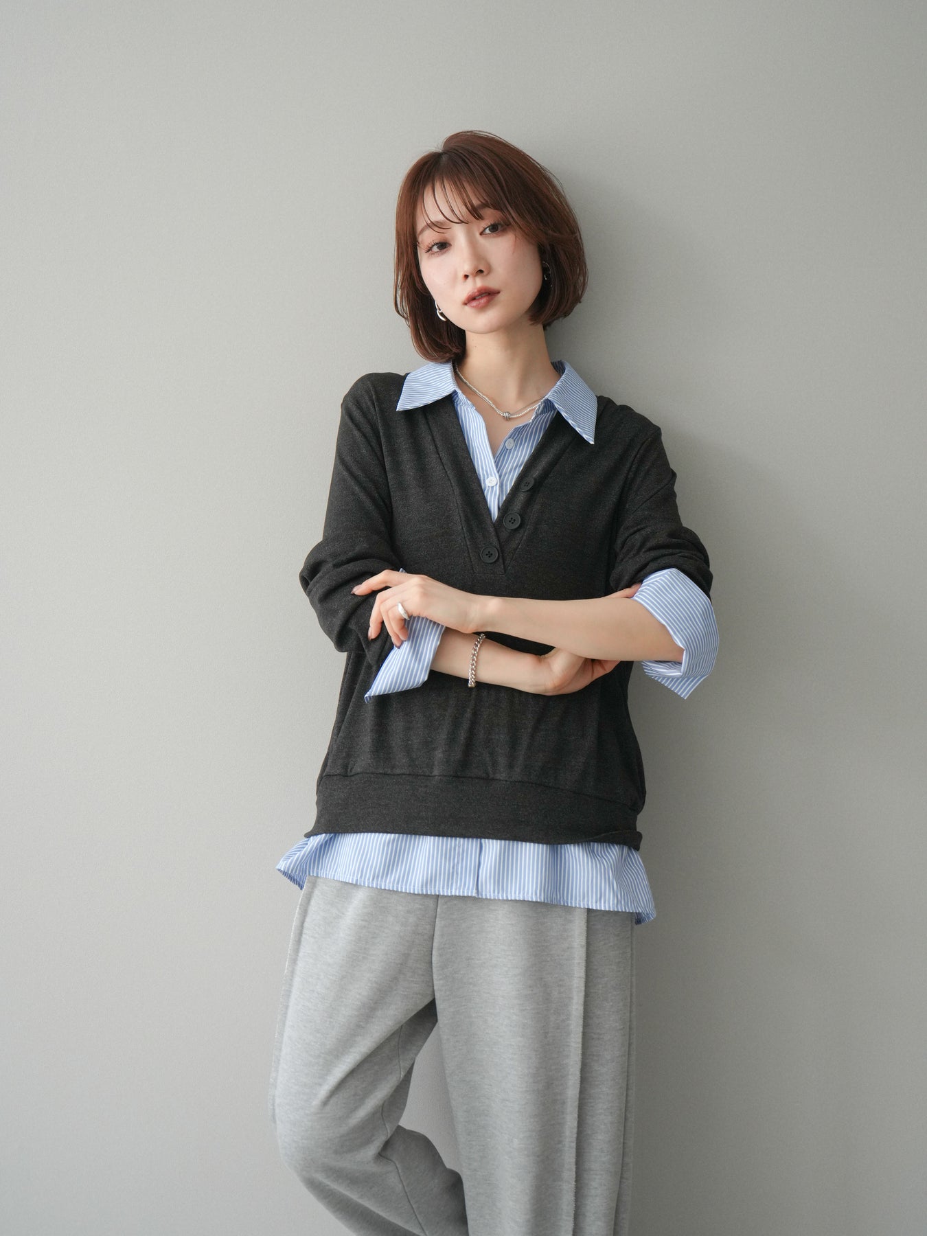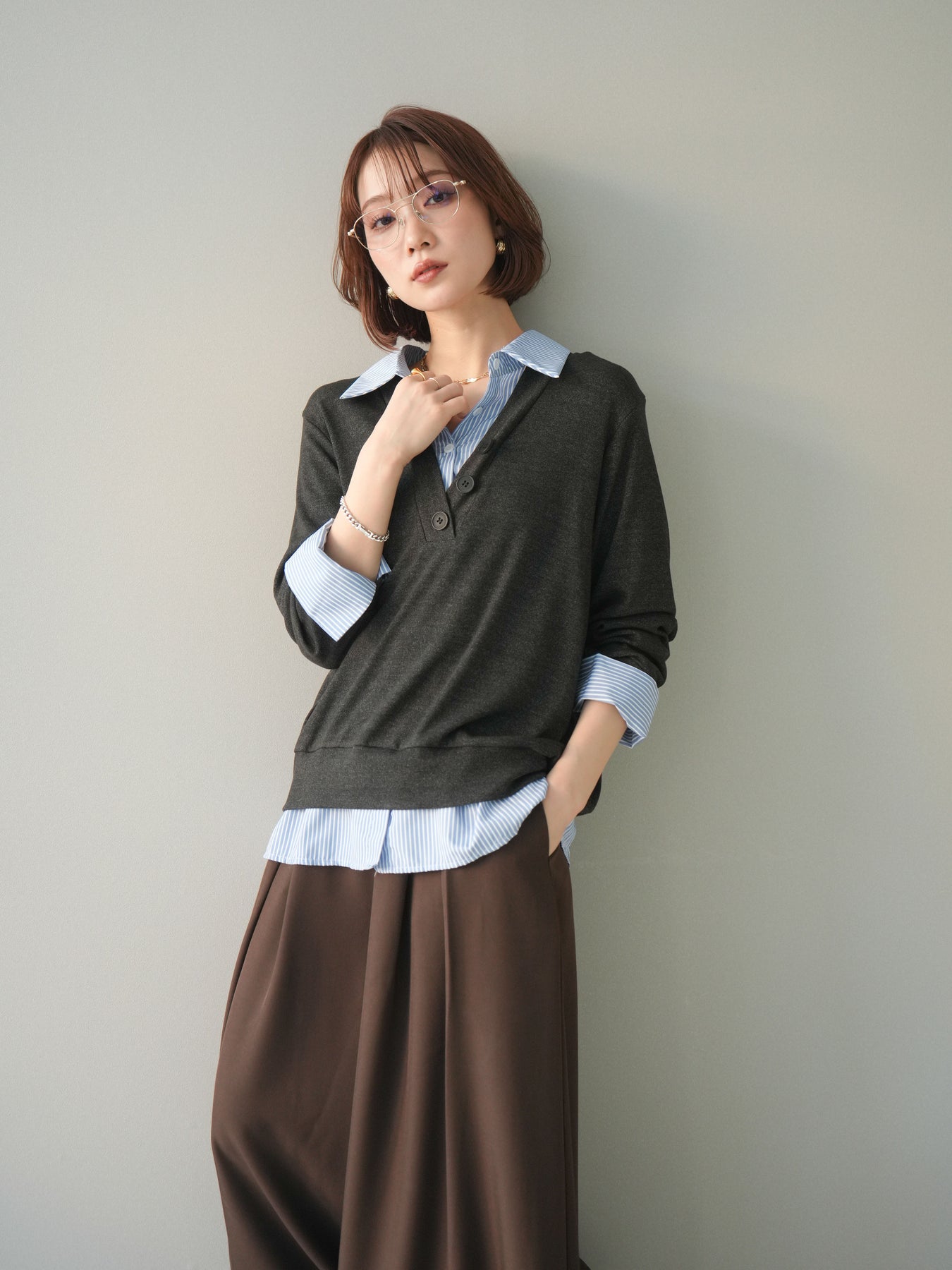 シャツをレイヤードしているように見えるデザインが魅力のカットプルオーバー。襟元や袖口、裾から覗くストライプシャツがほどよいアクセントとなり、1枚でこなれ感のあるスタイリングが完成します。柔らかなカットソー素材で快適な着心地ながら、シャツ部分がカジュアルすぎず上品なムードをプラス。デニムにもスカートにも合わせやすく、デイリーに活躍する万能トップスです。シンプルなコーデにひとクセ加えたいときにぴったりの一枚。 ※ボトムス、キャミソール(インナー)以外の商品は一律でインナーは付属していません。