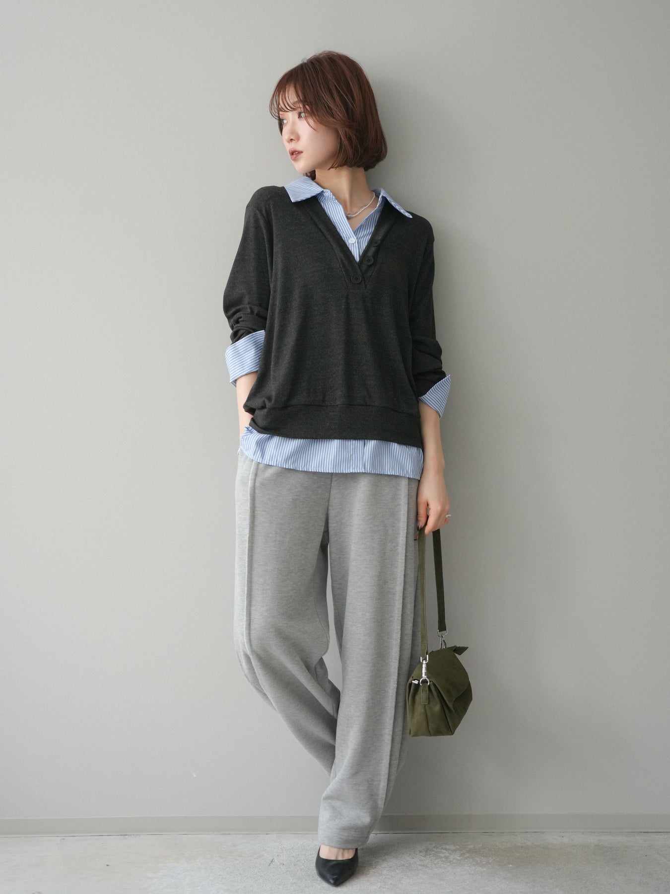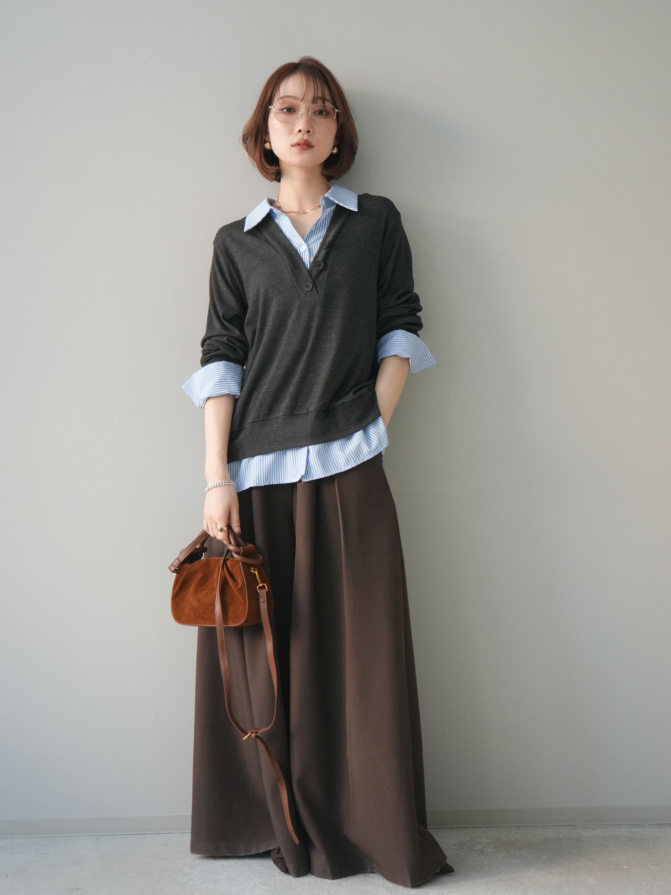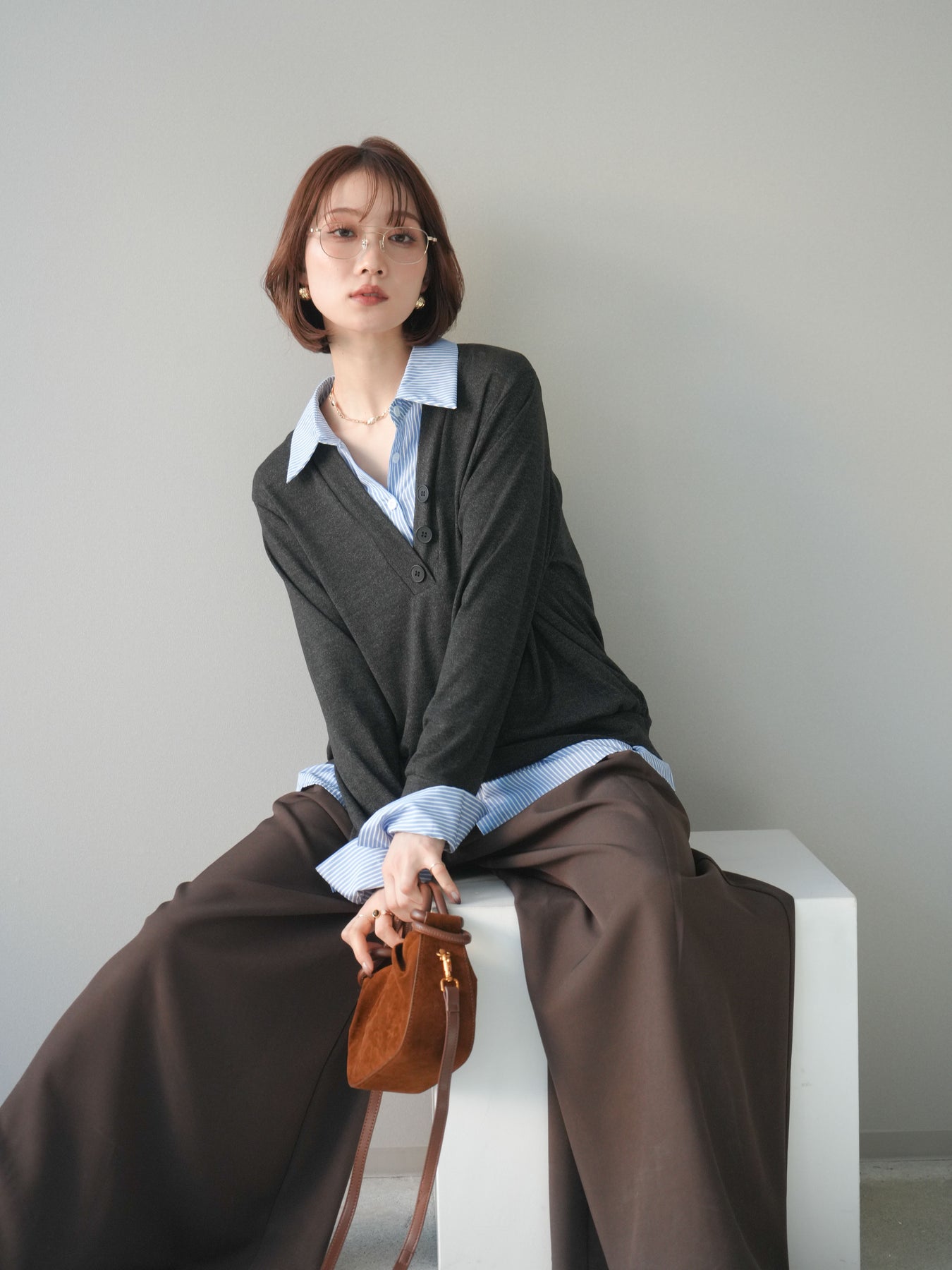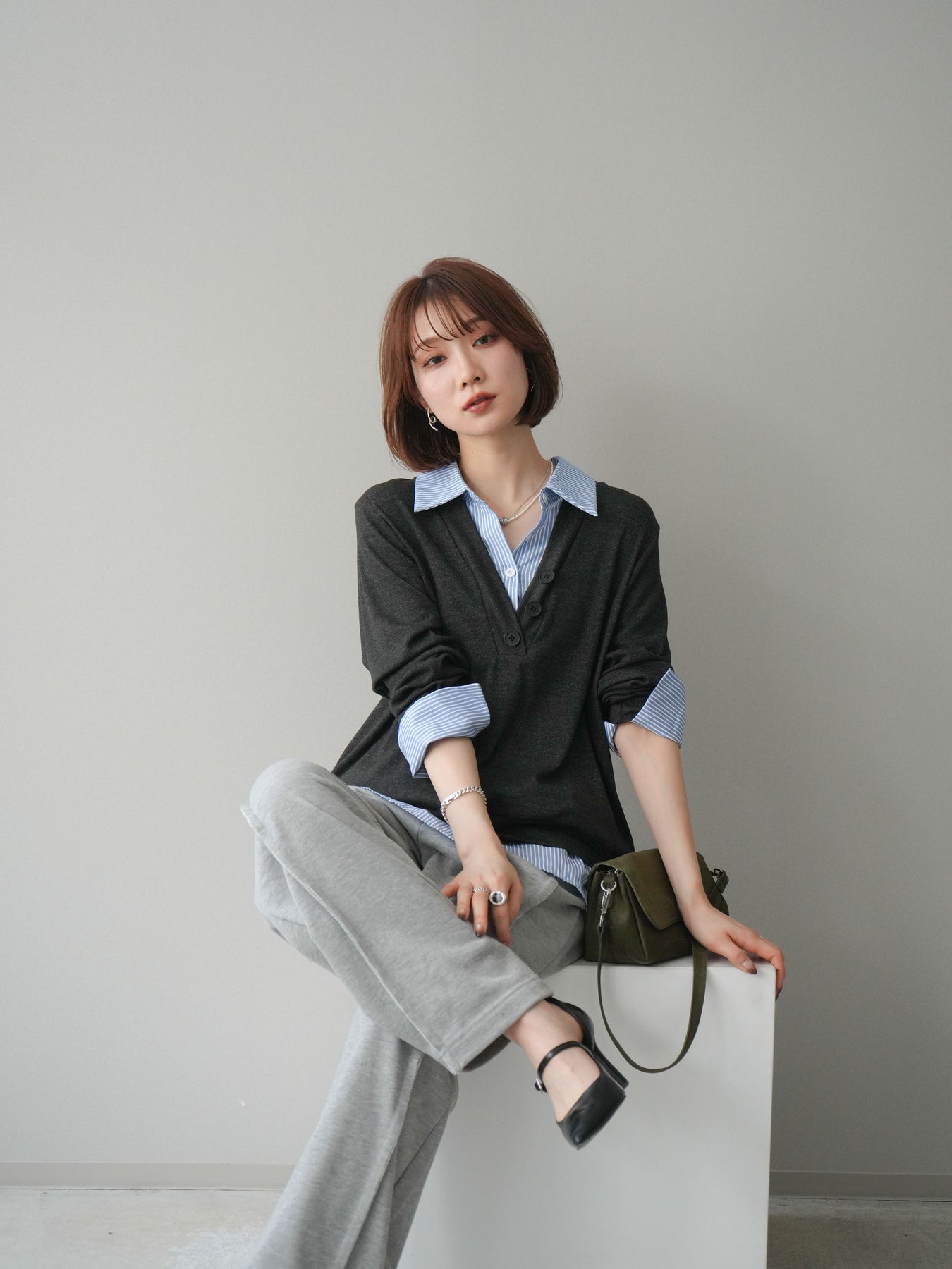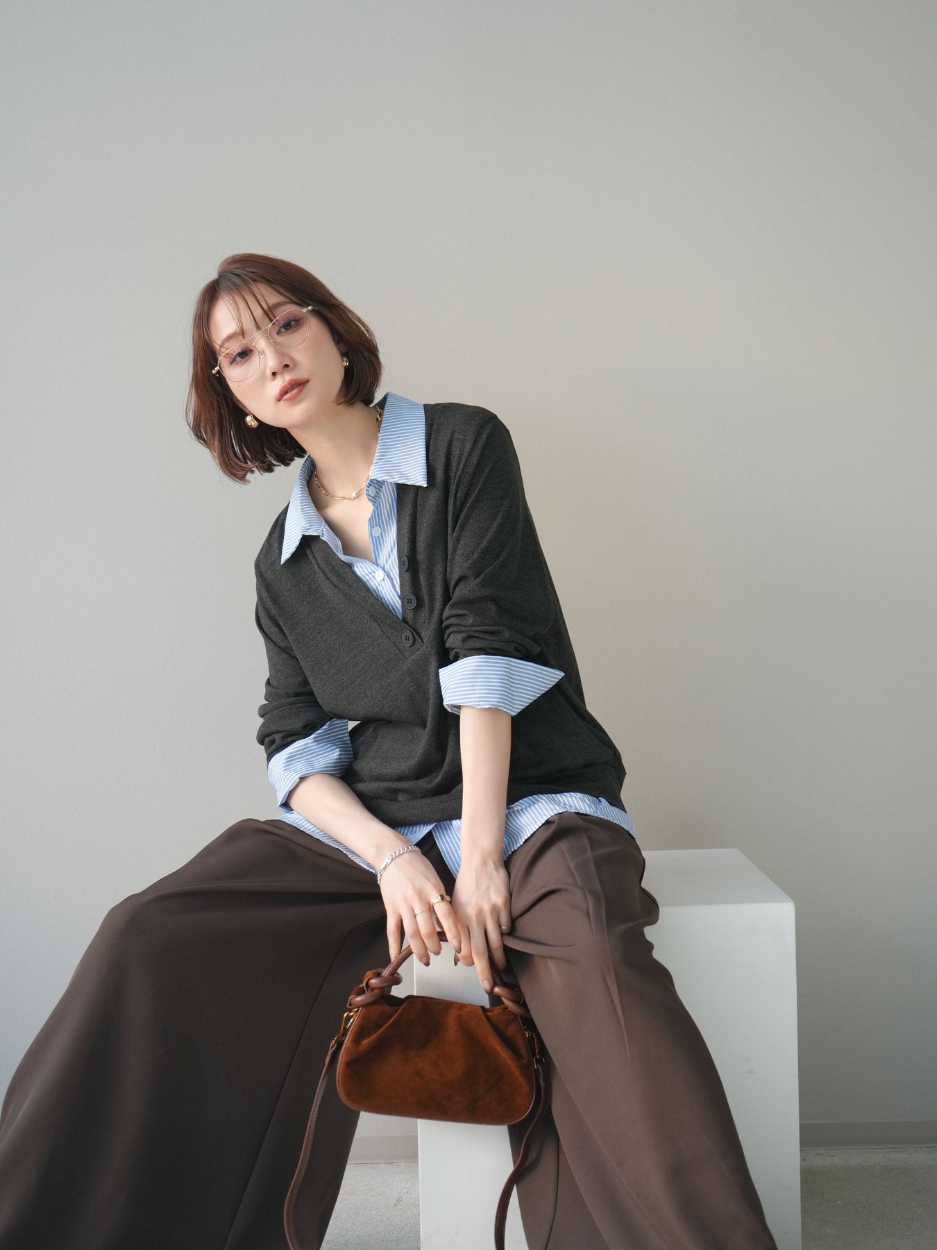 シャツをレイヤードしているように見えるデザインが魅力のカットプルオーバー。襟元や袖口、裾から覗くストライプシャツがほどよいアクセントとなり、1枚でこなれ感のあるスタイリングが完成します。柔らかなカットソー素材で快適な着心地ながら、シャツ部分がカジュアルすぎず上品なムードをプラス。デニムにもスカートにも合わせやすく、デイリーに活躍する万能トップスです。シンプルなコーデにひとクセ加えたいときにぴったりの一枚。 ※ボトムス、キャミソール(インナー)以外の商品は一律でインナーは付属していません。
