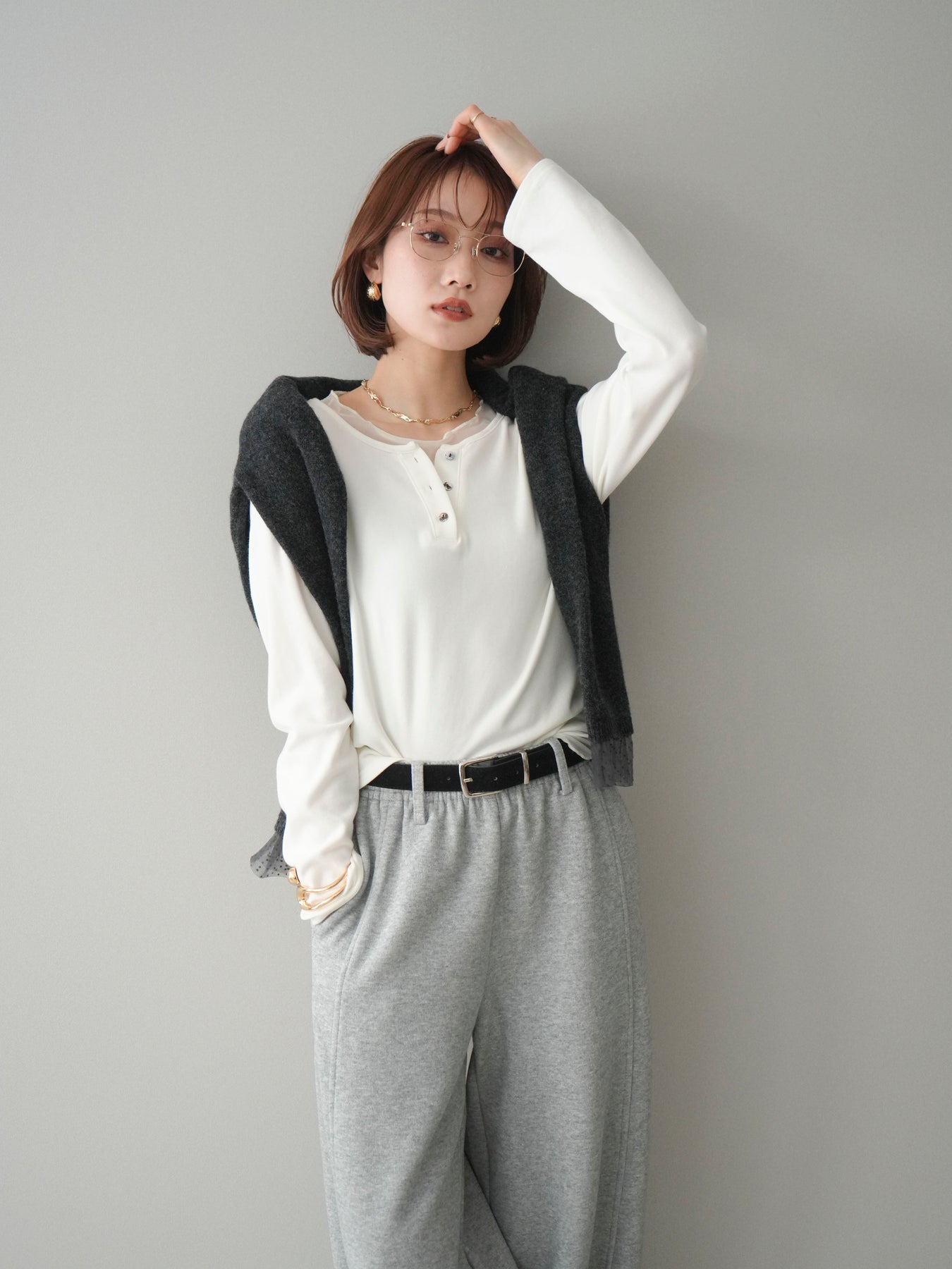チュールを重ねたレイヤードデザインがさりげない華やかさをプラスするヘンリーネックカットソー。首元のボタンディテールがヌケ感を演出し、シンプルながらも表情豊かなアイテムに仕上げています。柔らかく伸縮性のある素材で着心地が良く、インでもアウトでも使いやすいバランスの取れたシルエット。1枚でスタイリングが決まる存在感があり、カジュアルからきれいめまで幅広く活躍します。日常コーデにさりげないアクセントを添えたい方におすすめの一枚です。 ※ボトムス、キャミソール(インナー)以外の商品は一律でインナーは付属していません。
