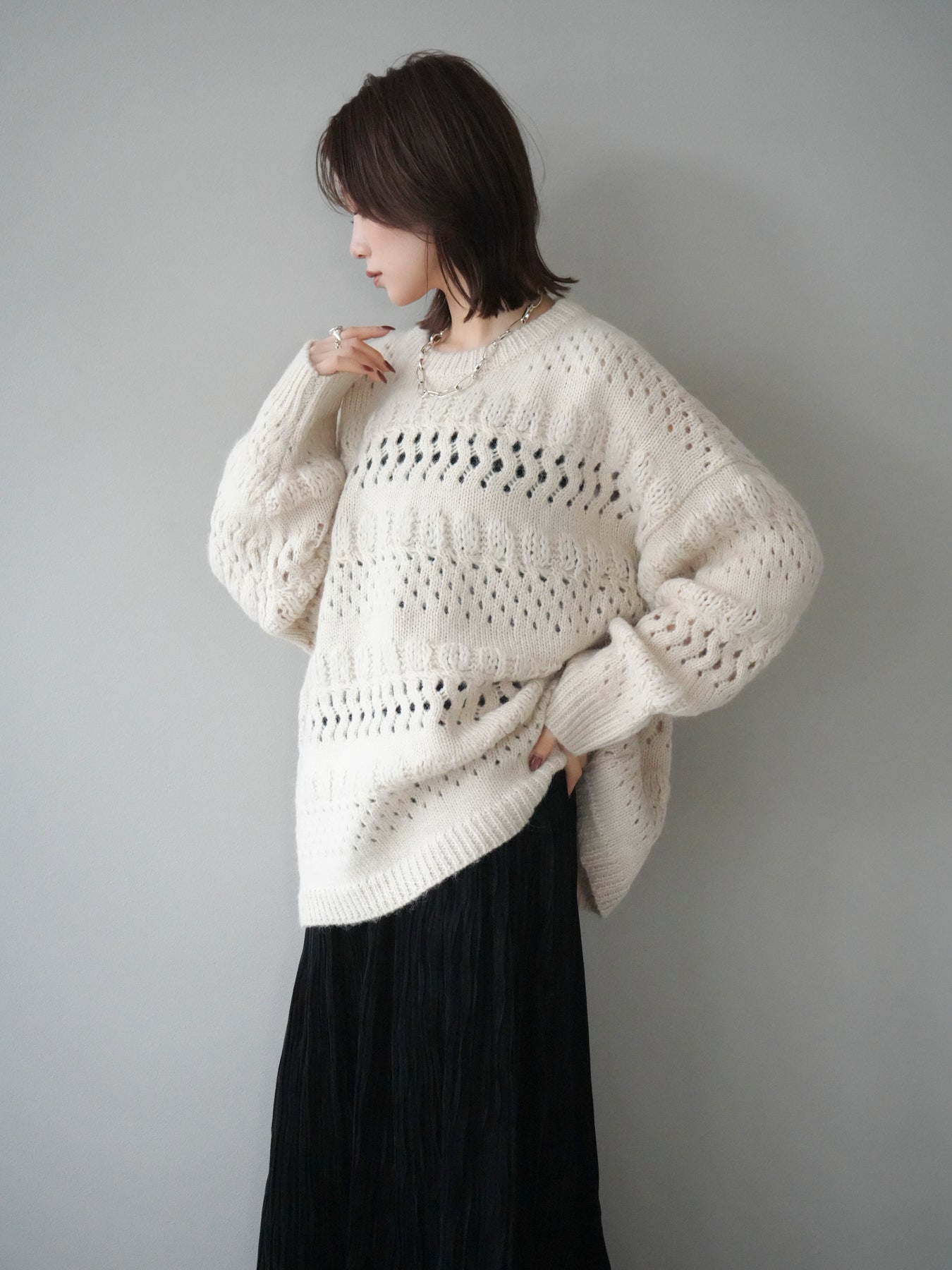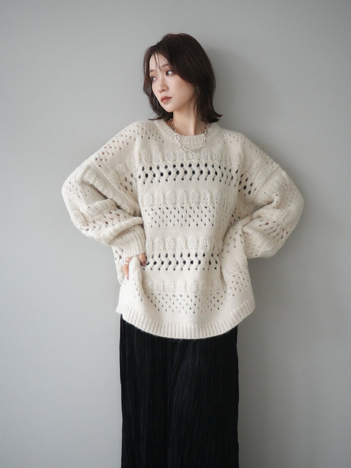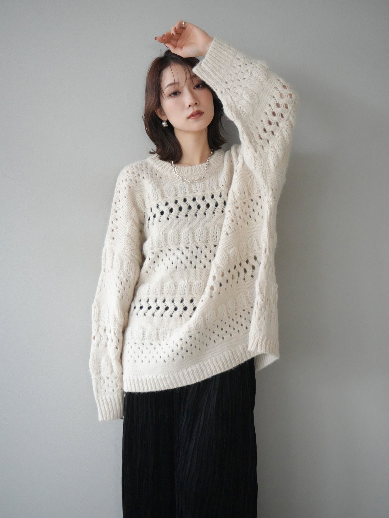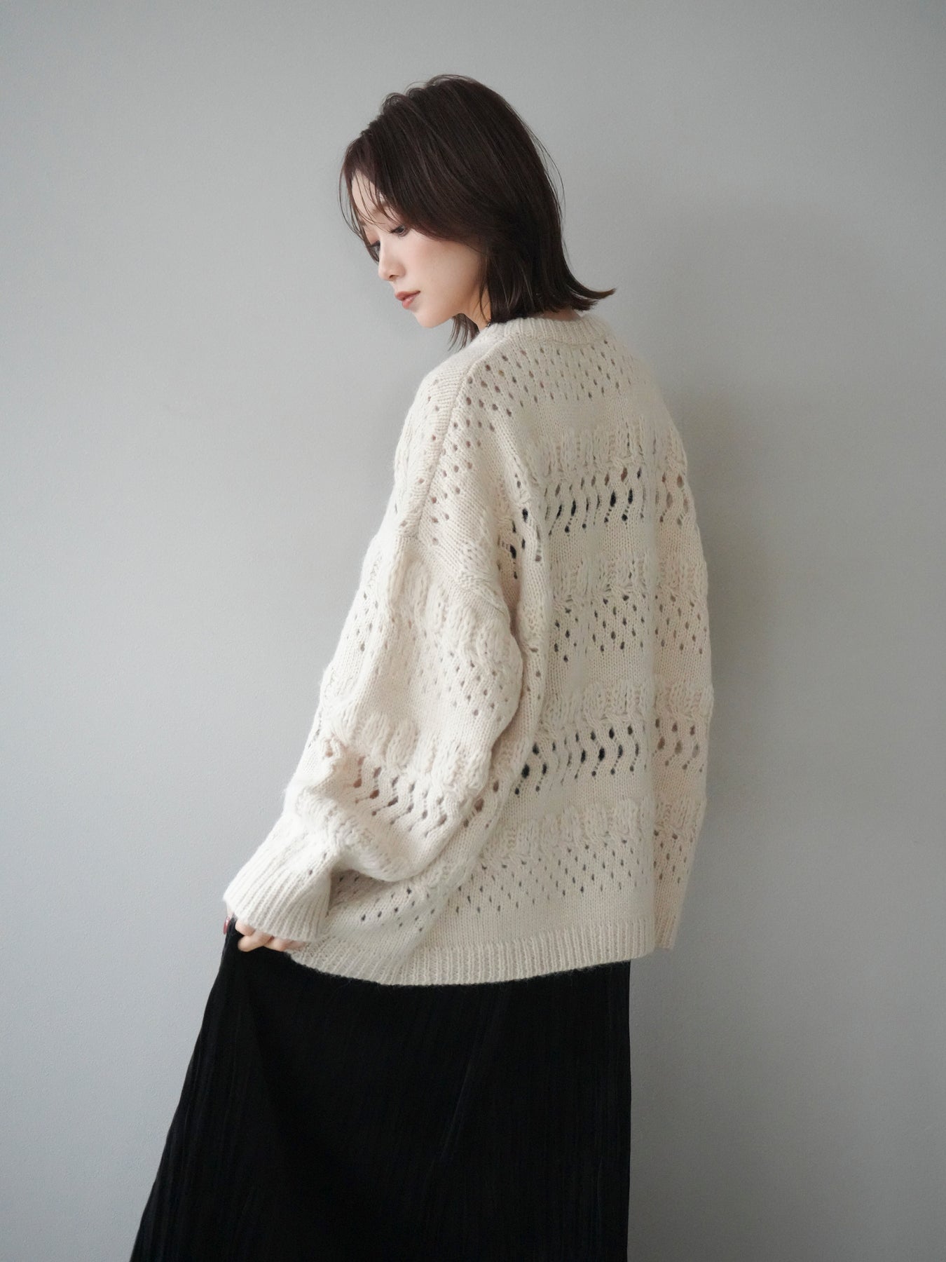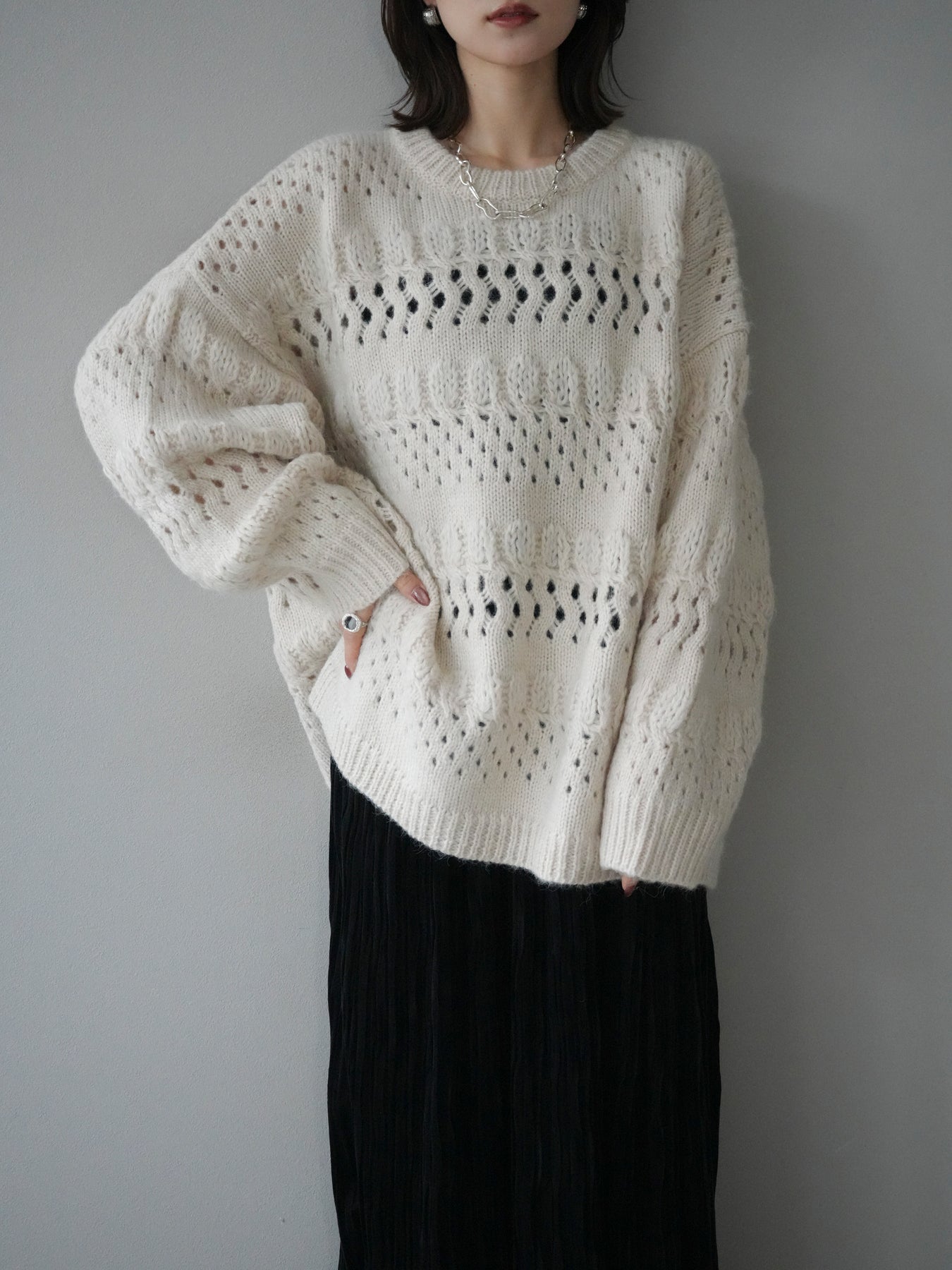 [予約]透かし編みクルーネックニットプルオーバー/ivory