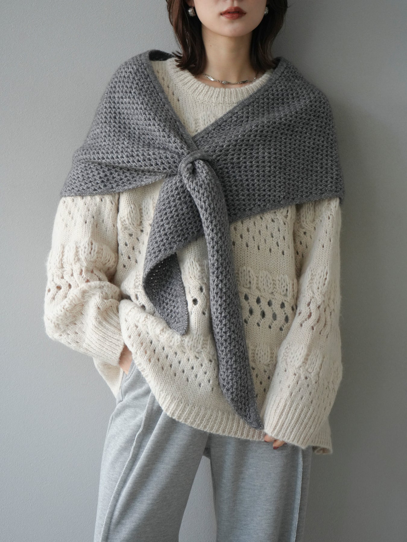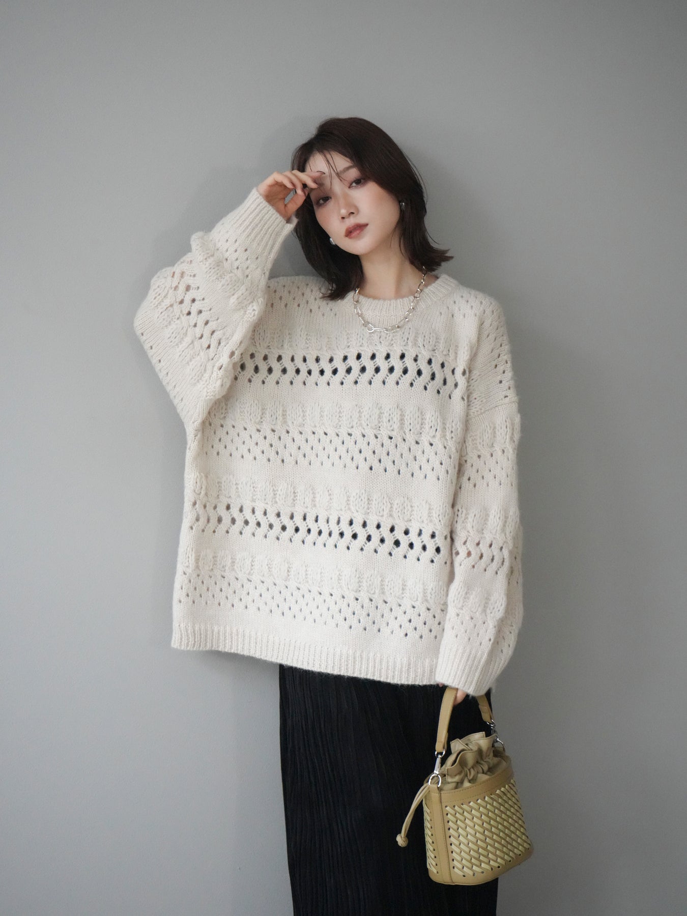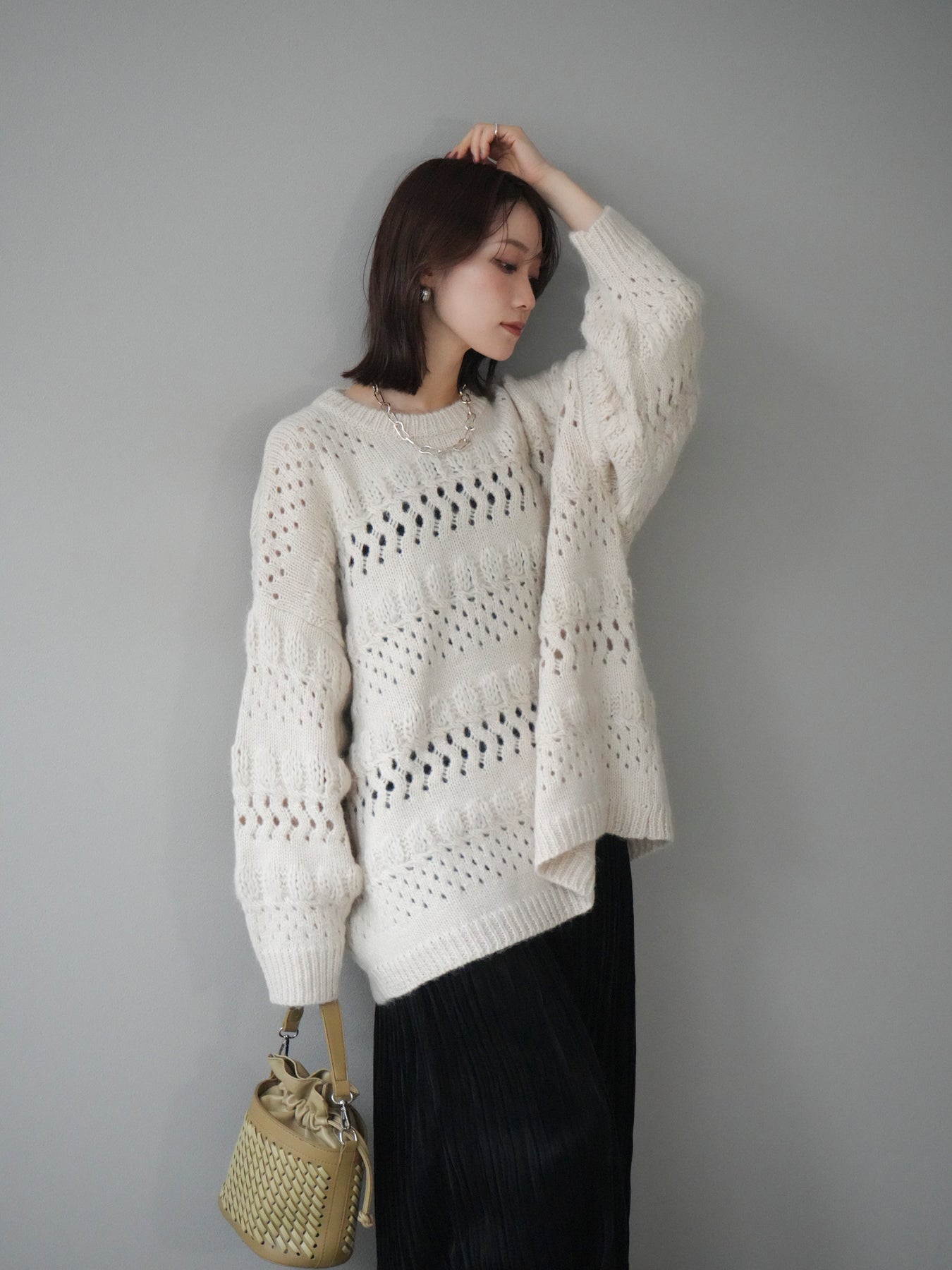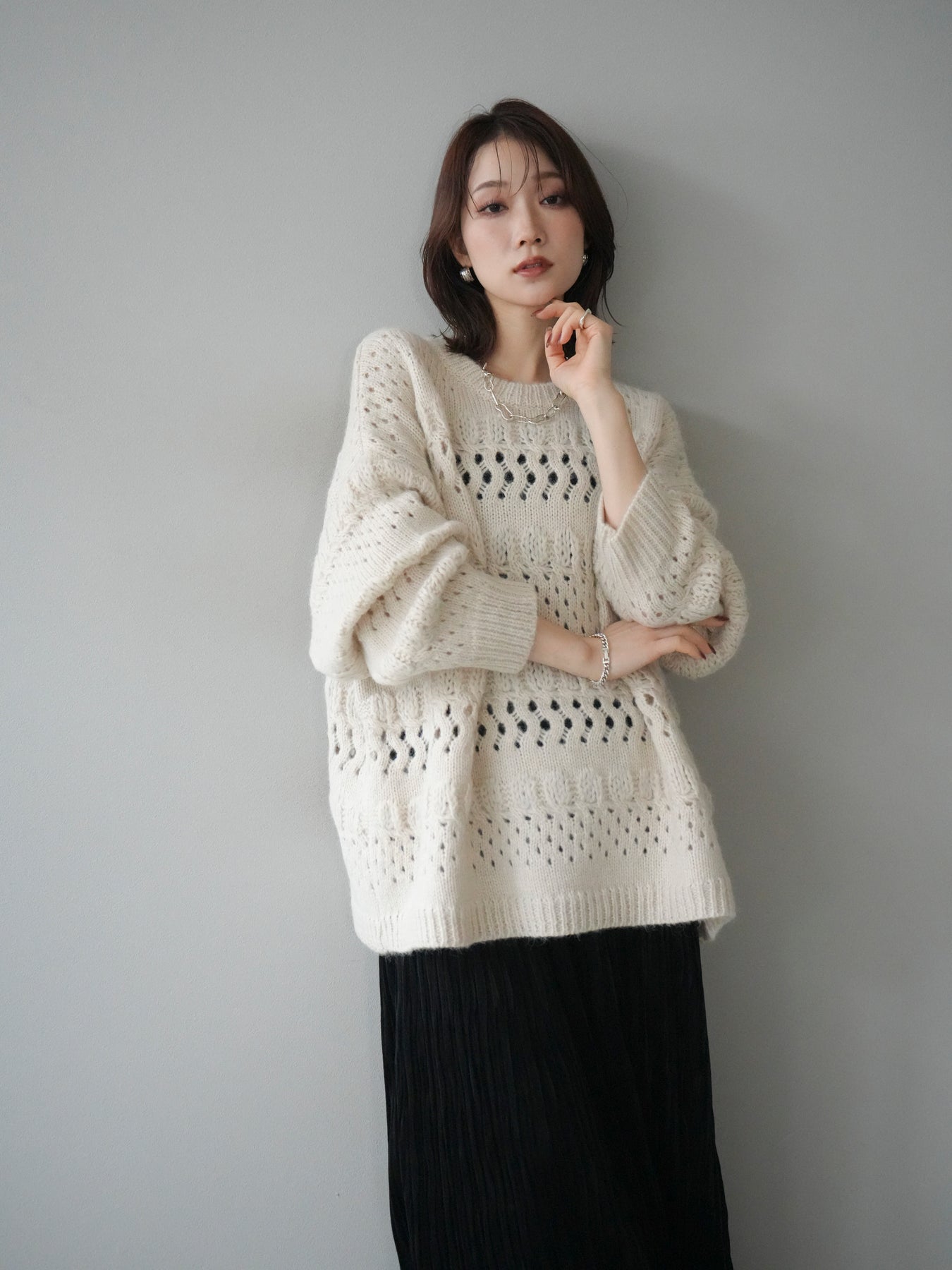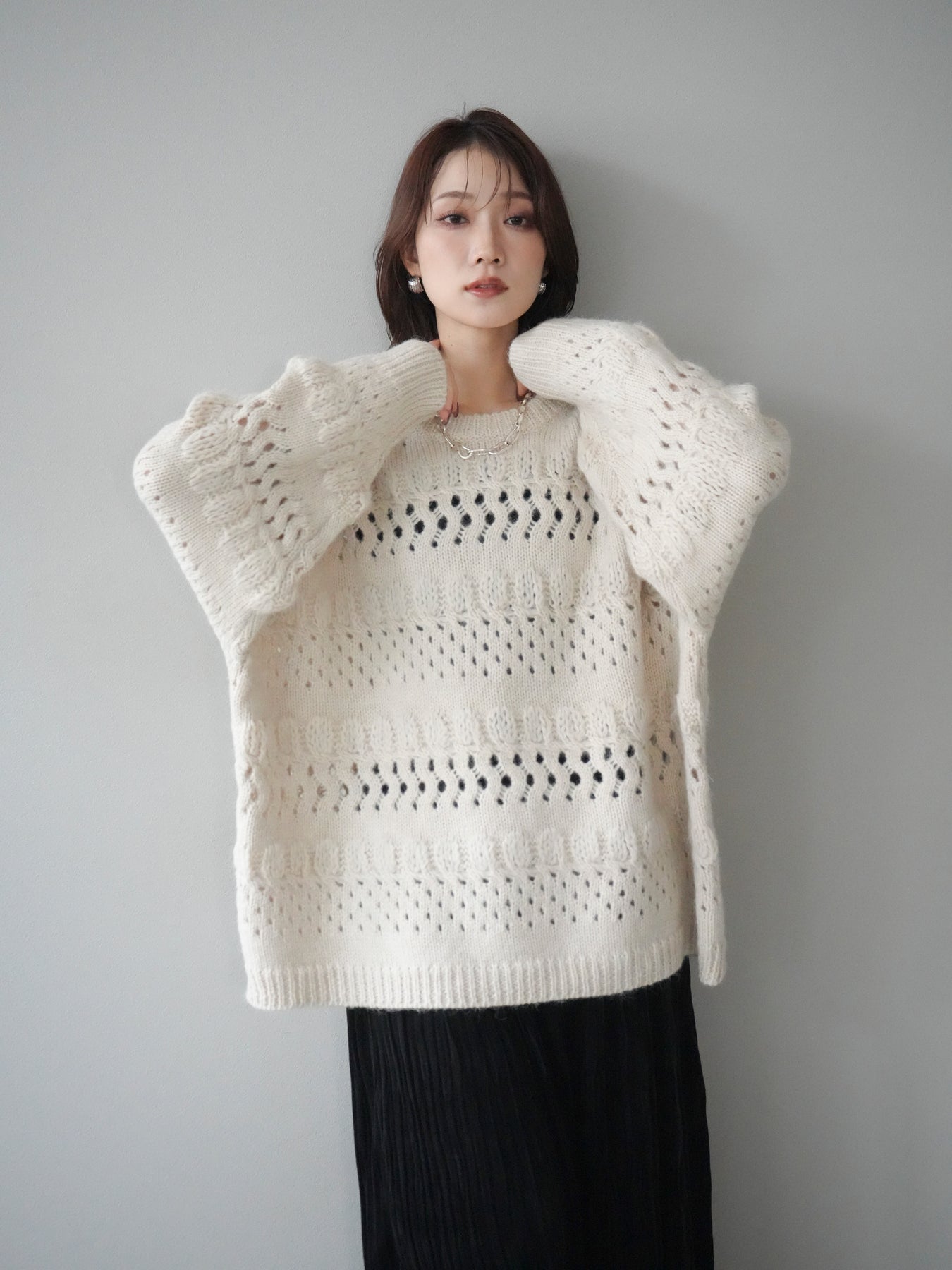 [予約]透かし編みクルーネックニットプルオーバー/ivory