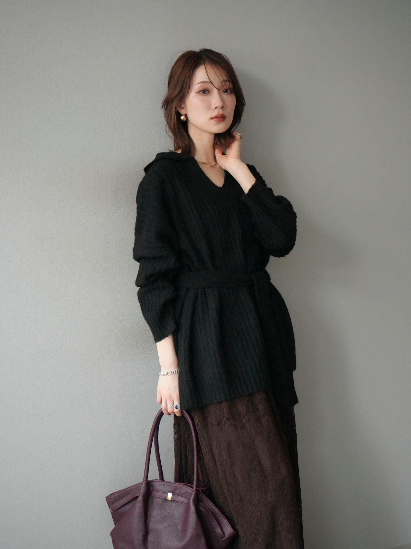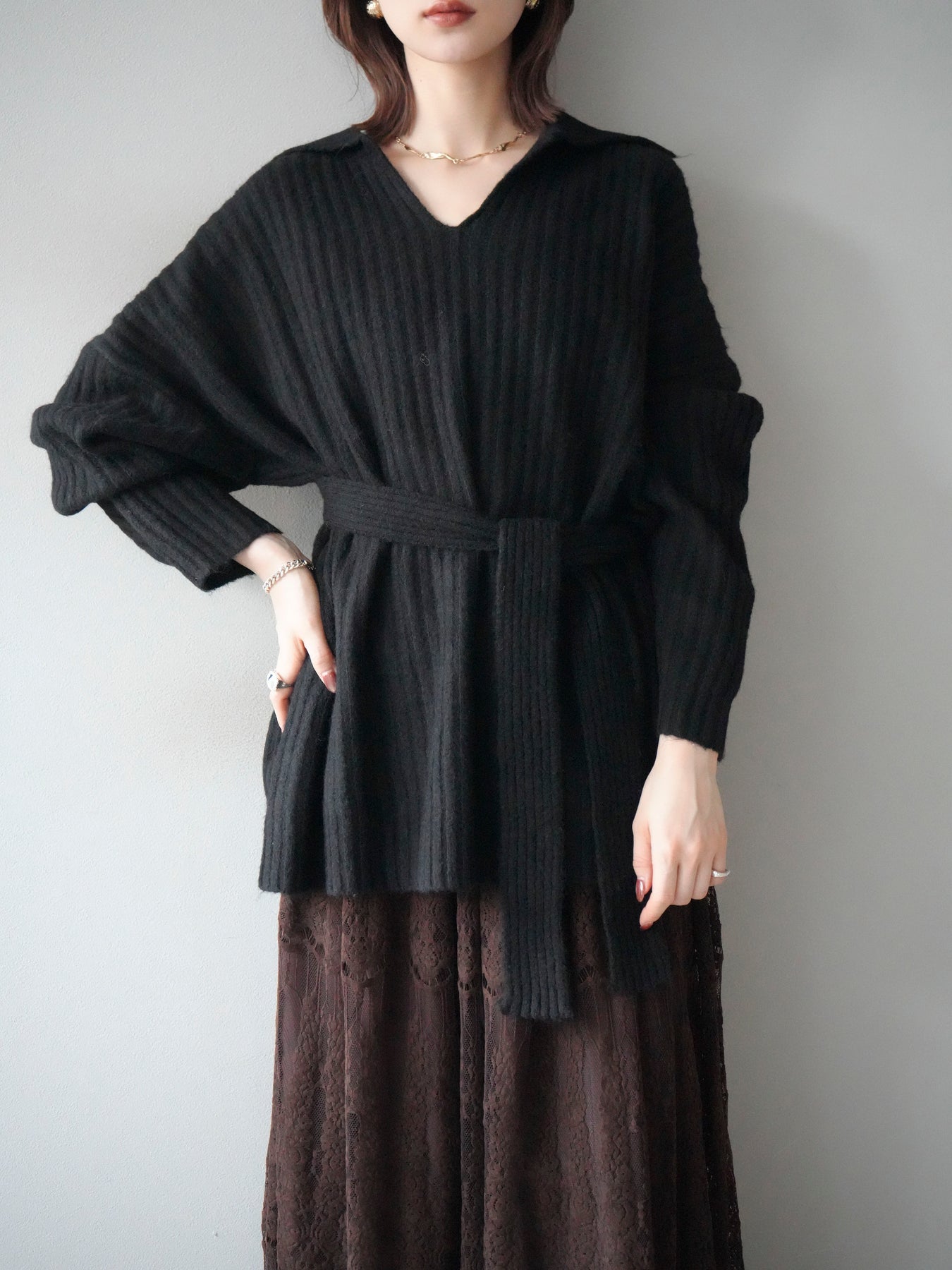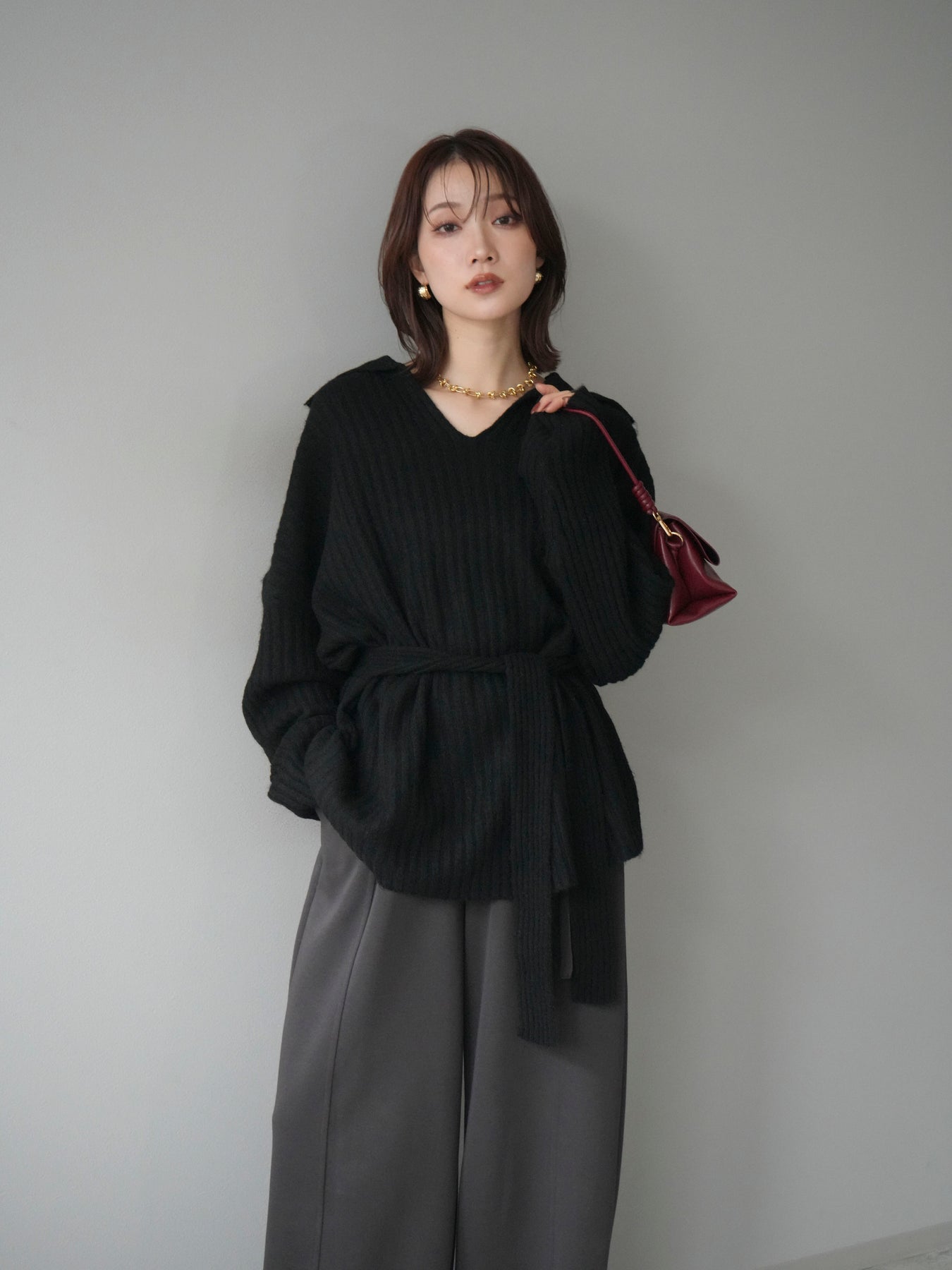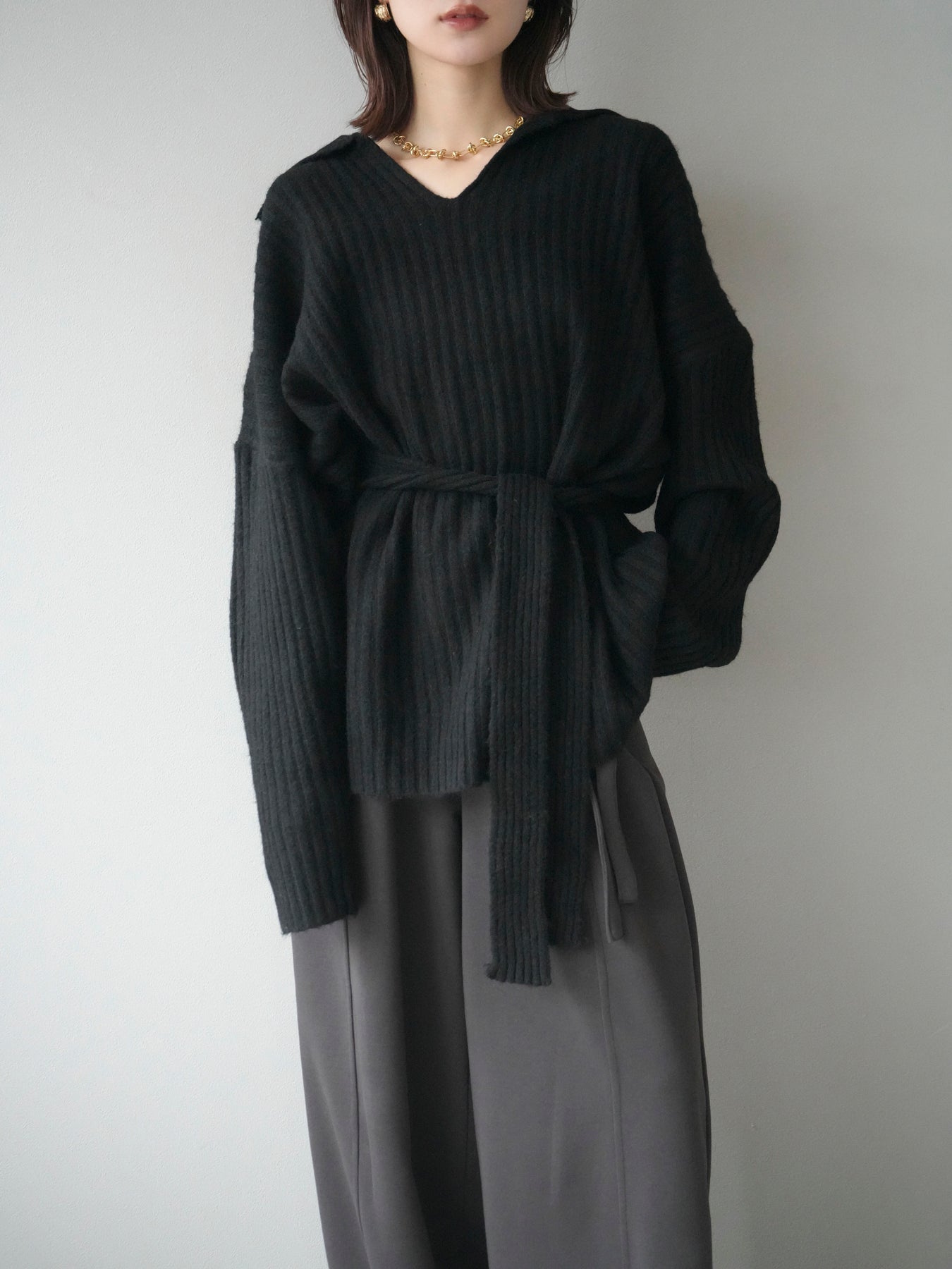 表情豊かなワイドリブ編みが特徴のポロニットプルオーバー。 柔らかな風合いと軽やかな着心地で、シーズンムードを高めてくれる一枚です。 深めのVネックラインがデコルテをきれいに見せ、抜け感のある大人な印象を演出。 付属のウエストベルトでシルエットにメリハリをつければ、スタイルアップ効果も抜群です。 デニムやスカートなど、幅広いボトムと好相性で、オンオフ問わず活躍するアイテムです。 ※ボトムス、キャミソール(インナー)以外の商品は一律でインナーは付属していません。