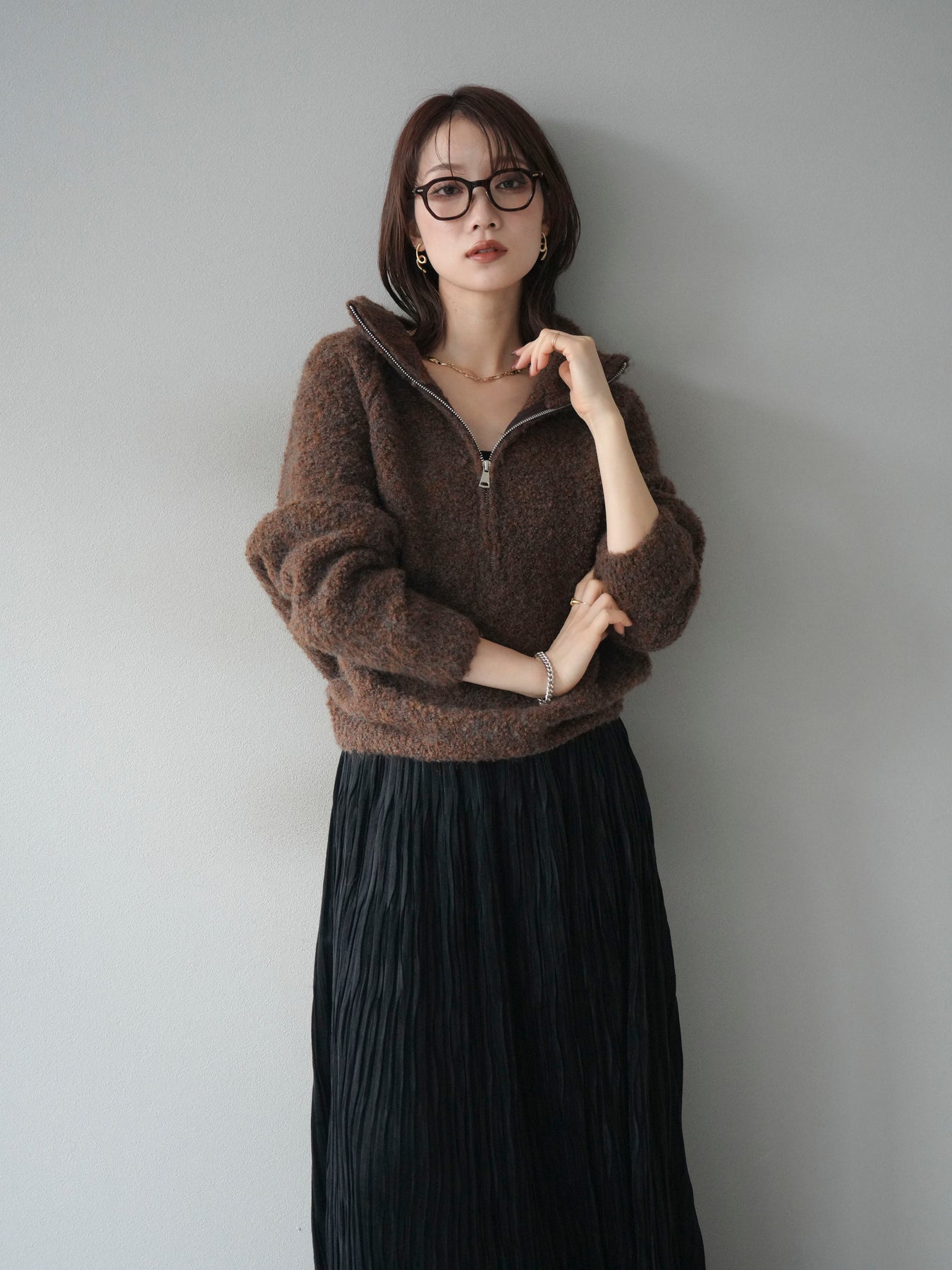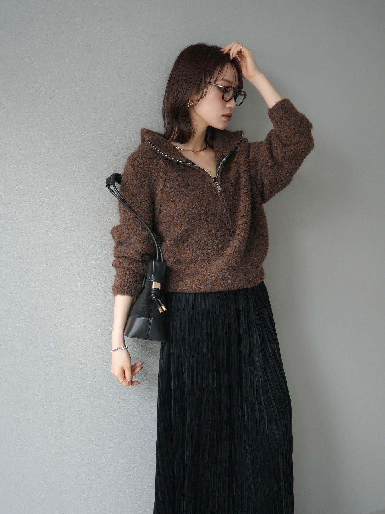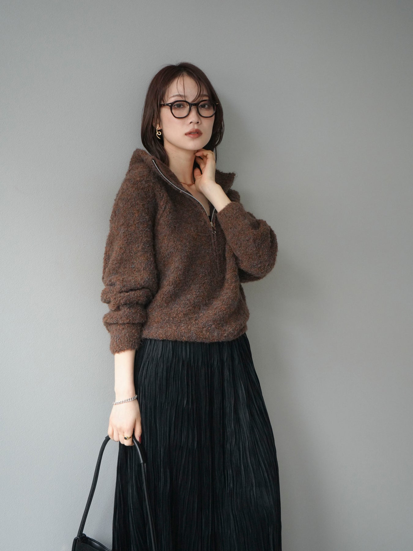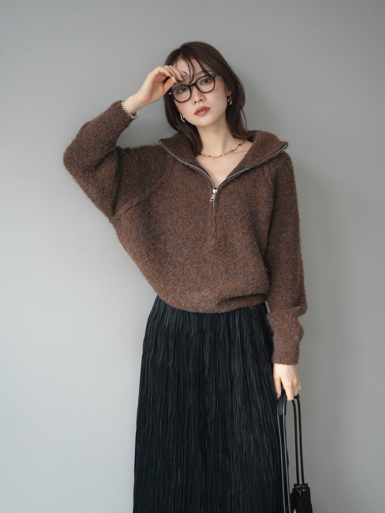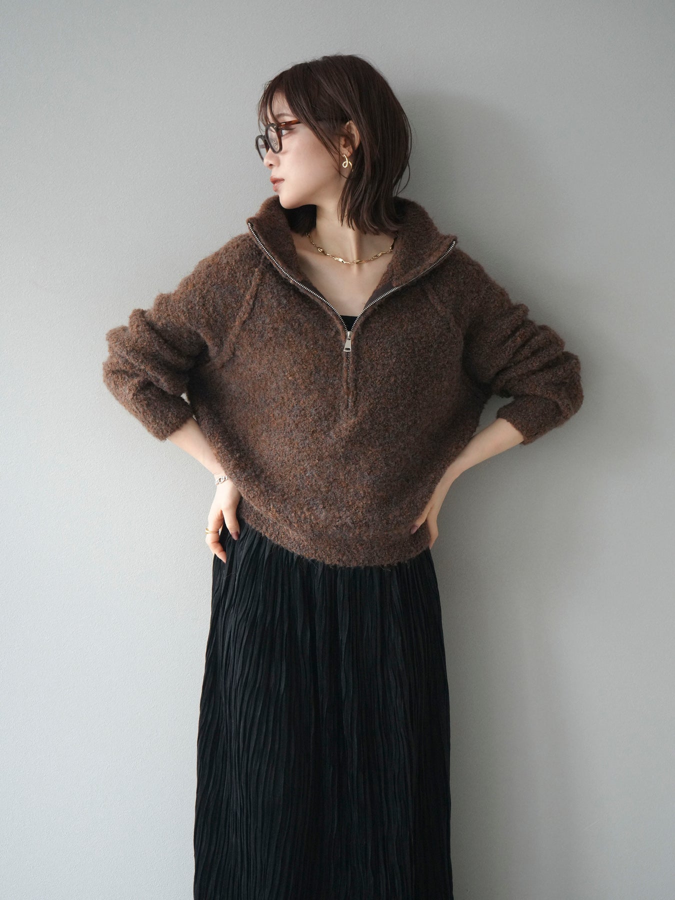 表情豊かなMIXブークレ素材を使用したスタンドジップニットプルオーバー。 柔らかくも立体感のある質感が魅力で、1枚でこなれた印象を演出します。 スタンドカラーとジップデザインが程よくスポーティーな雰囲気を加え、カジュアルながらも上品な印象に。 ゆったりとしたシルエットで、インナーを重ねてももたつかず快適な着心地です。 デニムやスラックス、スカートなどどんなボトムとも好相性で、デイリーコーデに幅広く活躍するアイテムです。 ※ボトムス、キャミソール(インナー)以外の商品は一律でインナーは付属していません。