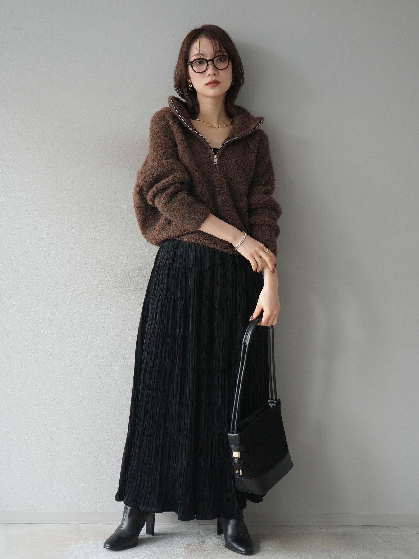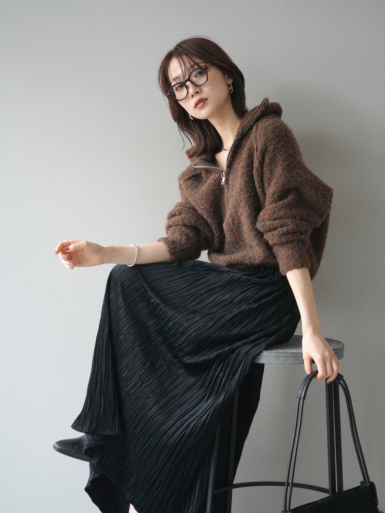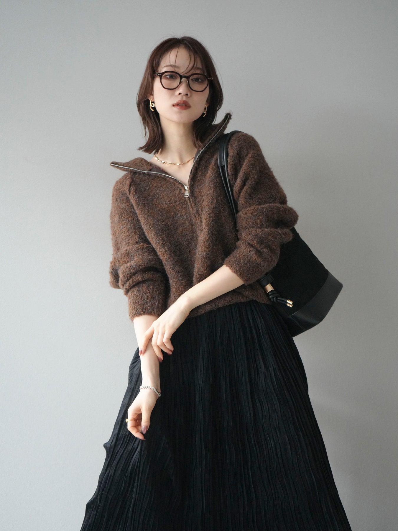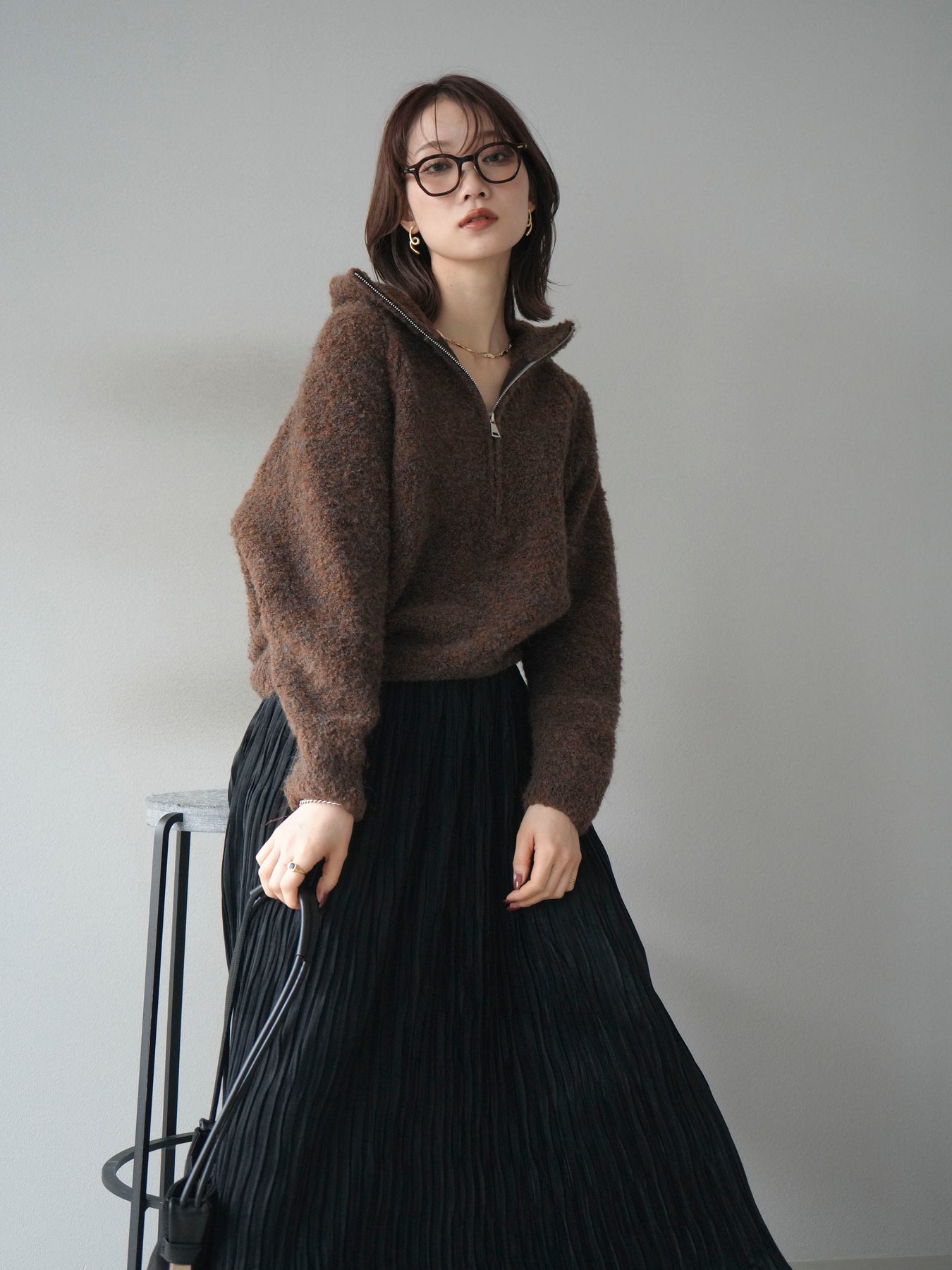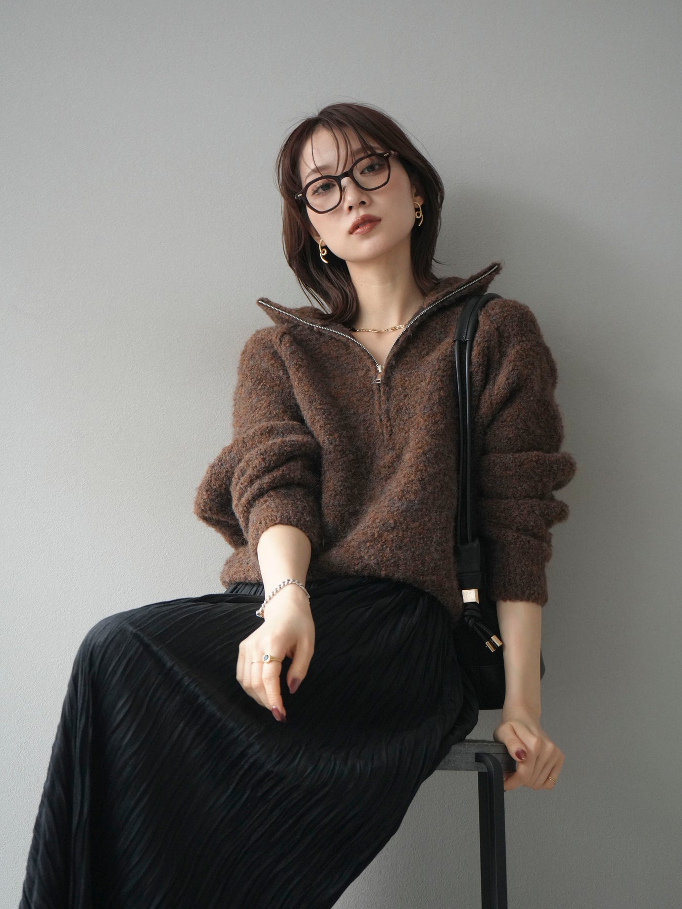 表情豊かなMIXブークレ素材を使用したスタンドジップニットプルオーバー。 柔らかくも立体感のある質感が魅力で、1枚でこなれた印象を演出します。 スタンドカラーとジップデザインが程よくスポーティーな雰囲気を加え、カジュアルながらも上品な印象に。 ゆったりとしたシルエットで、インナーを重ねてももたつかず快適な着心地です。 デニムやスラックス、スカートなどどんなボトムとも好相性で、デイリーコーデに幅広く活躍するアイテムです。 ※ボトムス、キャミソール(インナー)以外の商品は一律でインナーは付属していません。