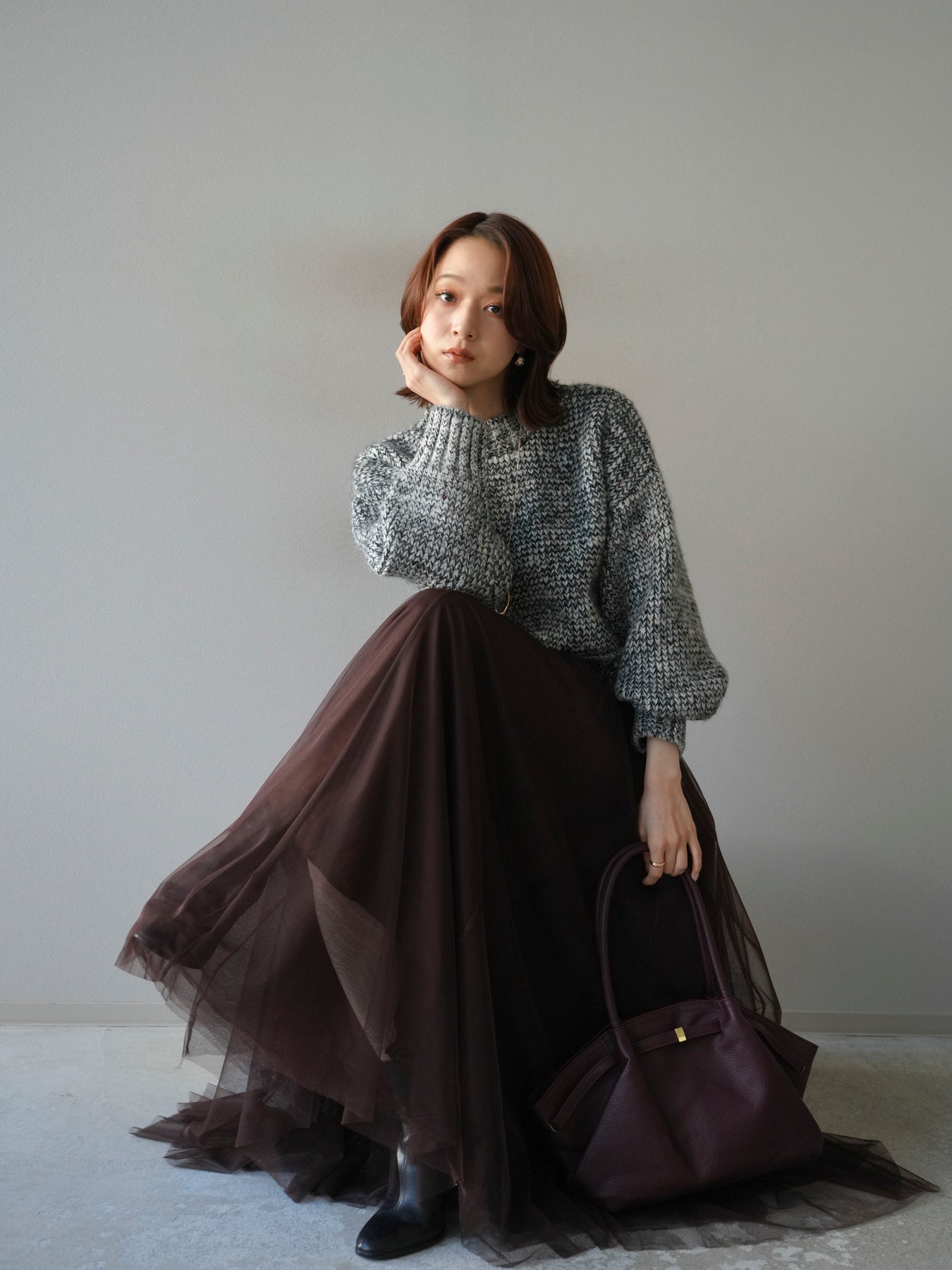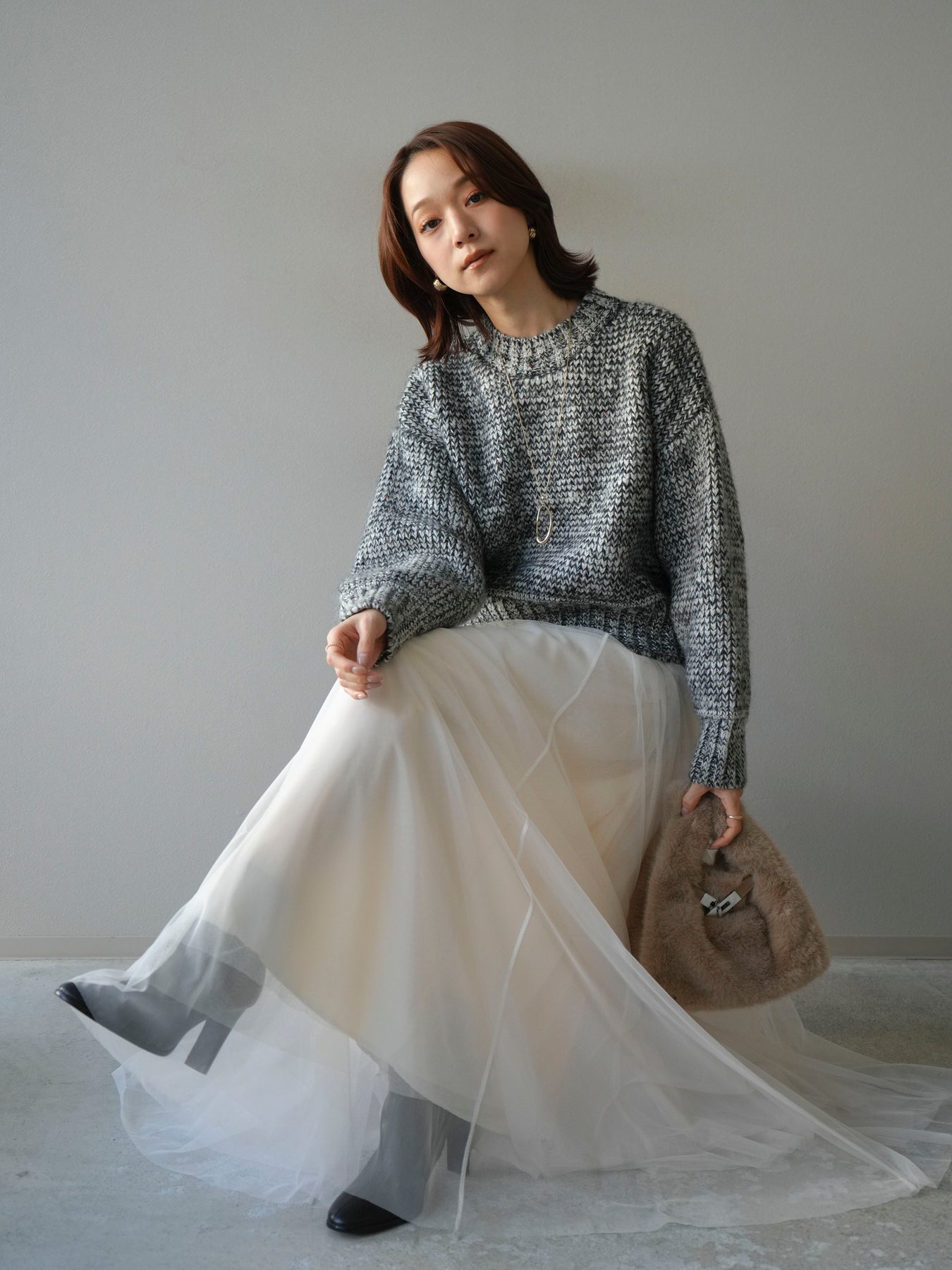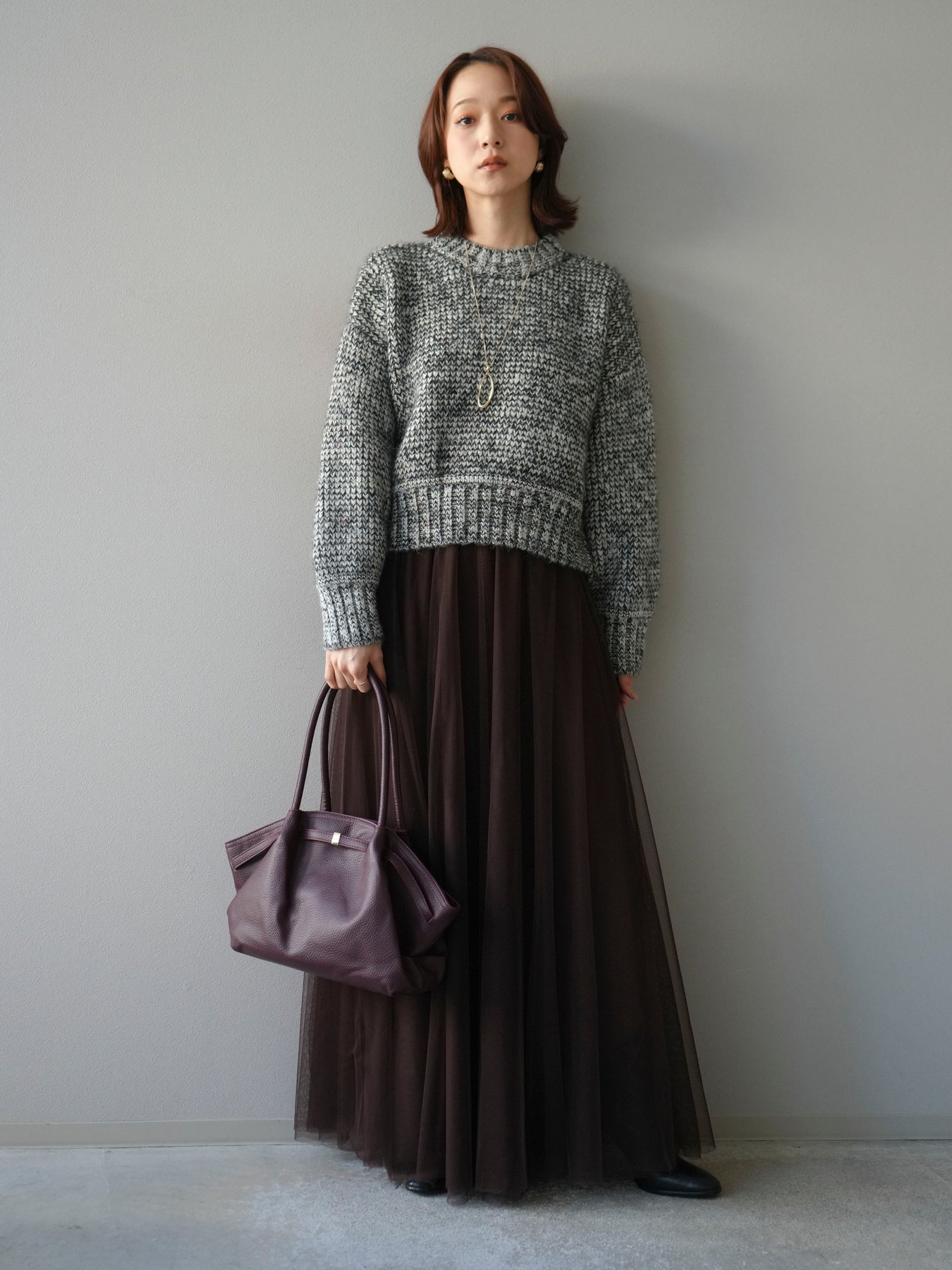 ミックス糸の風合いが魅力のネップニットプルオーバー。 表情豊かな編地と程よい厚みのある素材が、シーズンムードを引き立てます。 ボリューム感のあるスリーブが女性らしい柔らかさを演出し、リラックス感のあるシルエットながらも上品な印象に。 シンプルなデザインで合わせるボトムを選ばず、デイリーに着回しやすい一枚です。 1枚で着るのはもちろん、シャツやワンピースとのレイヤードスタイルもおすすめ。 ※ボトムス、キャミソール(インナー)以外の商品は一律でインナーは付属していません。