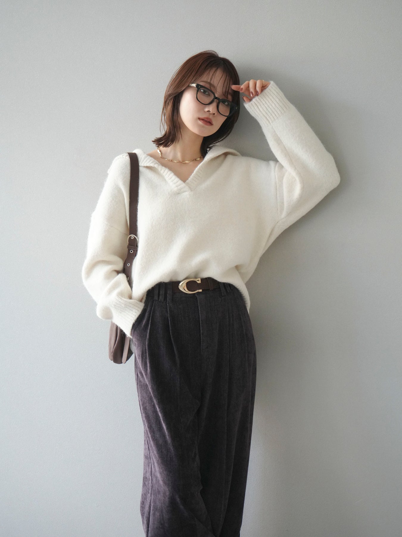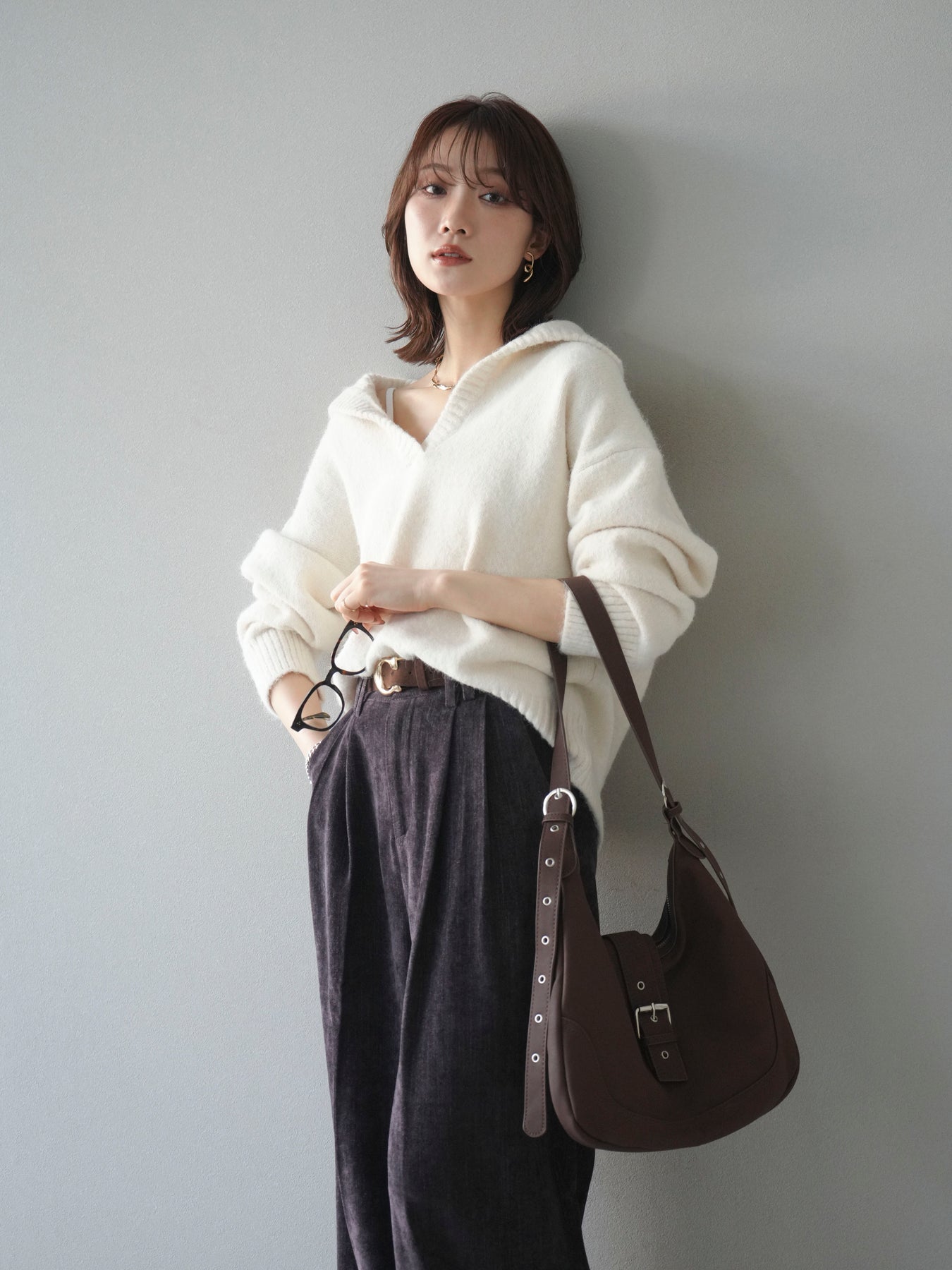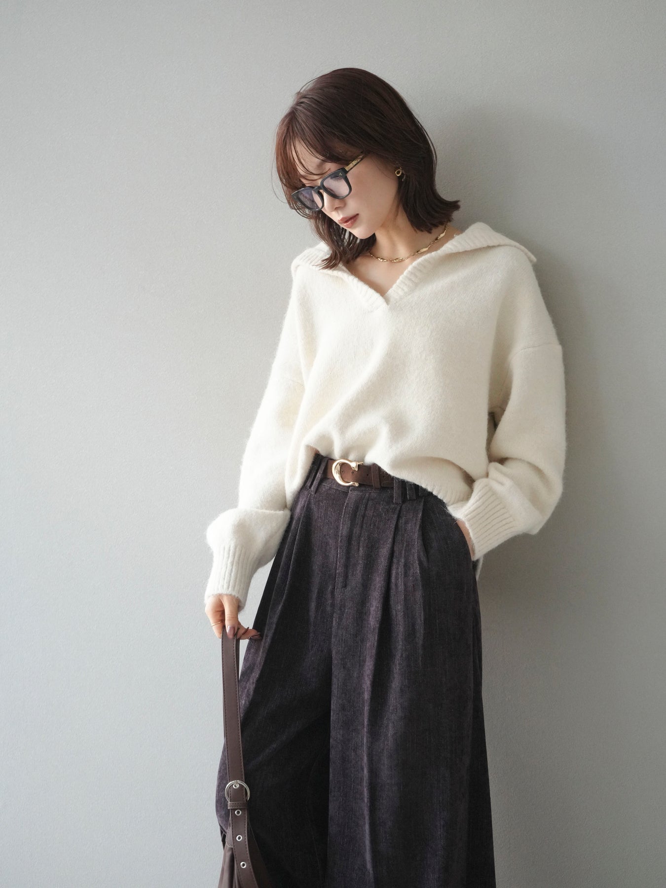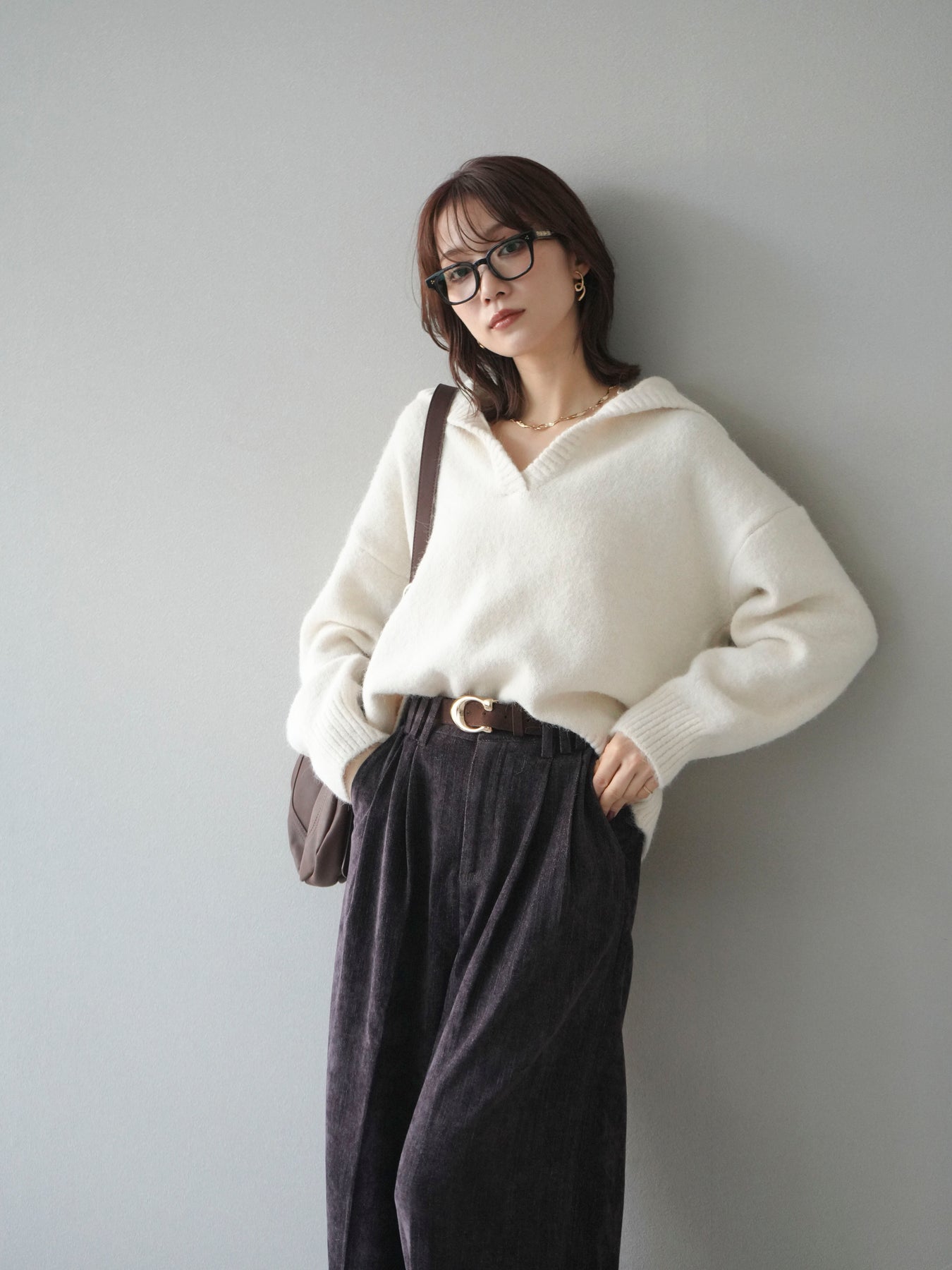 ふんわりとした柔らかな風合いが魅力のスキッパーニットプルオーバー。 深めのVネックラインが顔まわりをすっきりと見せ、抜け感のある大人の雰囲気を演出します。 襟付きのデザインでカジュアルになりすぎず、上品な印象に仕上げました。 ゆったりとしたシルエットでリラクシーな着心地ながら、着るだけでこなれたスタイルが完成します。 デニムやスラックス、スカートなど幅広いアイテムと相性が良く、シーズンの定番として長く活躍してくれる一着です。 ※ボトムス、キャミソール(インナー)以外の商品は一律でインナーは付属していません。