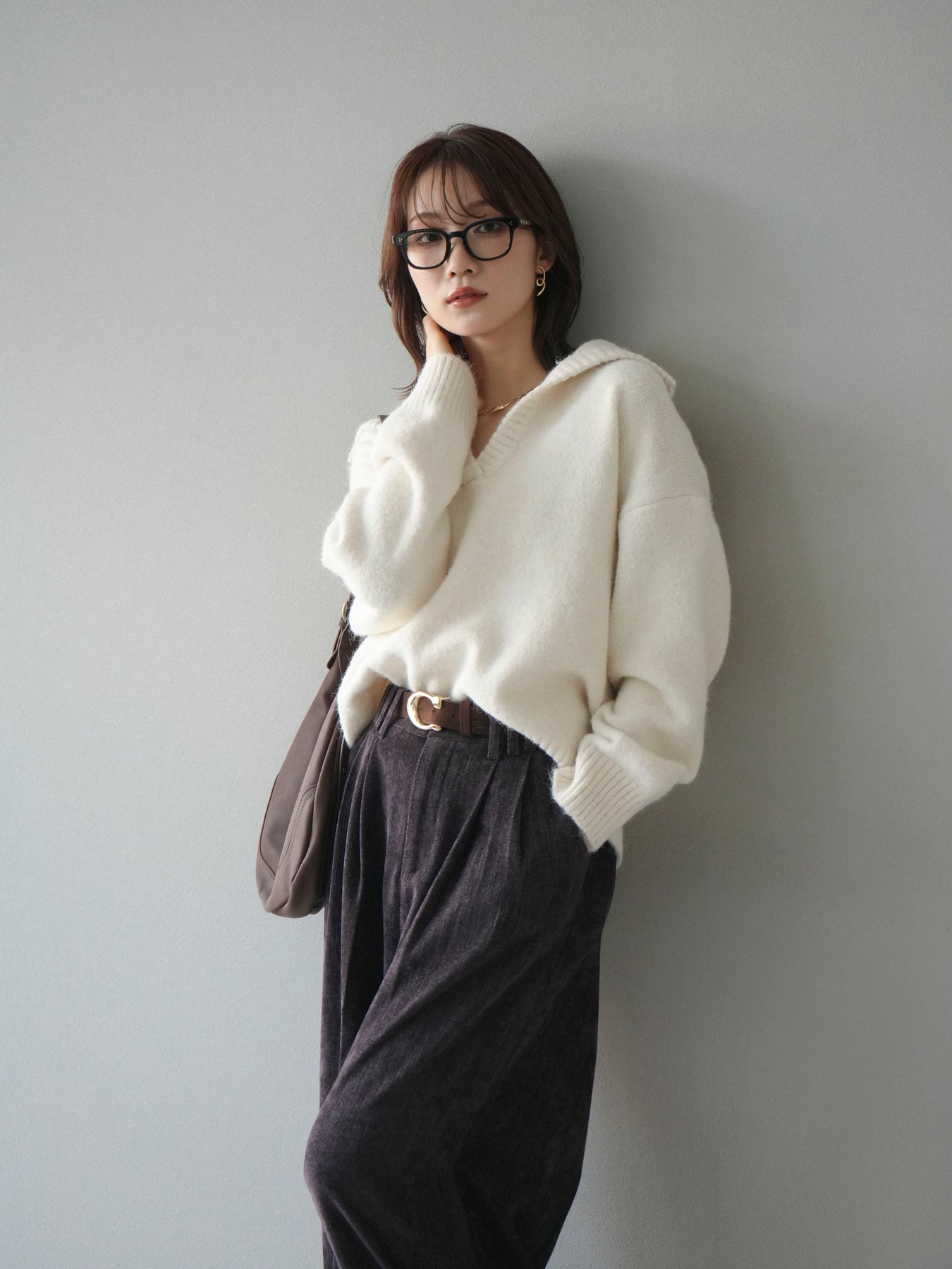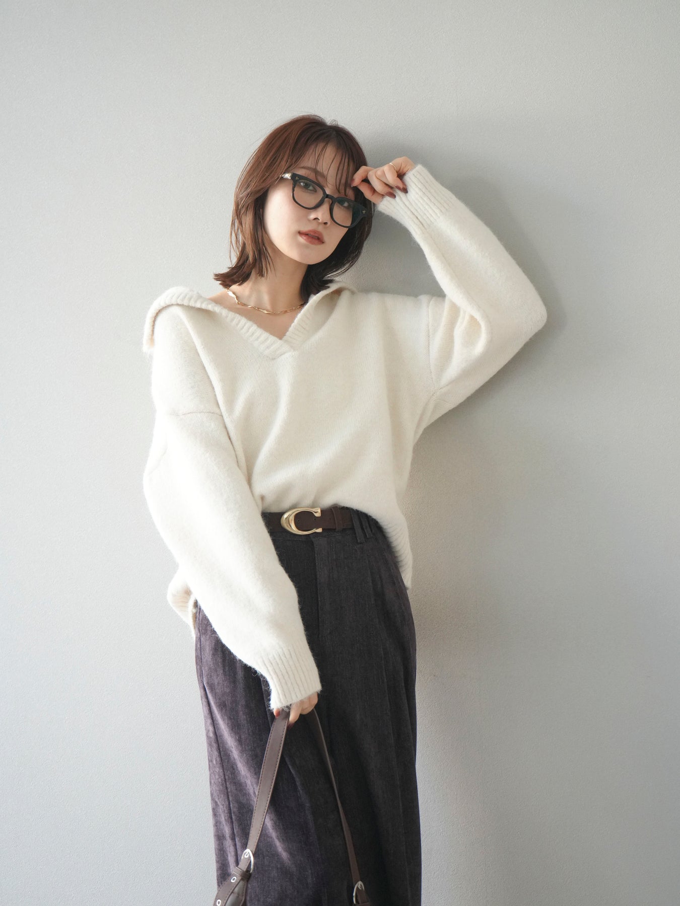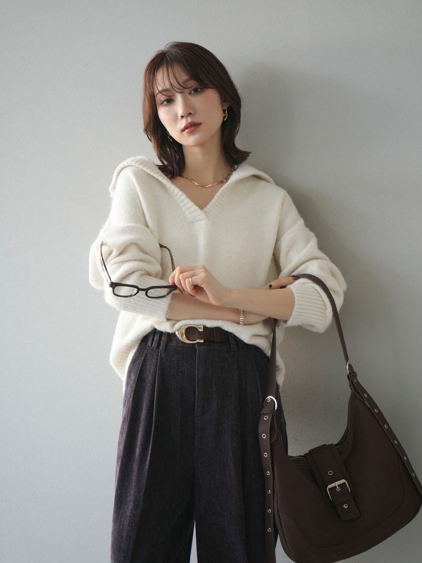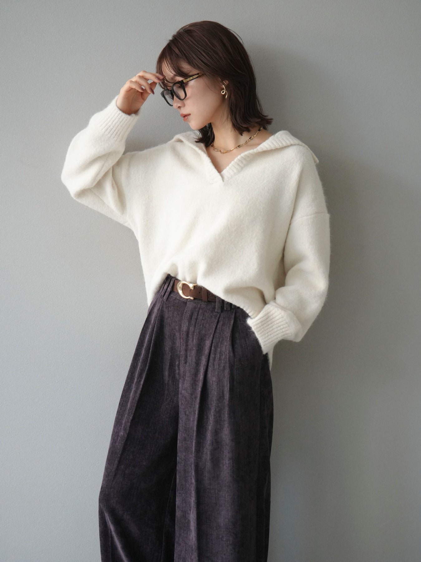 ふんわりとした柔らかな風合いが魅力のスキッパーニットプルオーバー。 深めのVネックラインが顔まわりをすっきりと見せ、抜け感のある大人の雰囲気を演出します。 襟付きのデザインでカジュアルになりすぎず、上品な印象に仕上げました。 ゆったりとしたシルエットでリラクシーな着心地ながら、着るだけでこなれたスタイルが完成します。 デニムやスラックス、スカートなど幅広いアイテムと相性が良く、シーズンの定番として長く活躍してくれる一着です。 ※ボトムス、キャミソール(インナー)以外の商品は一律でインナーは付属していません。