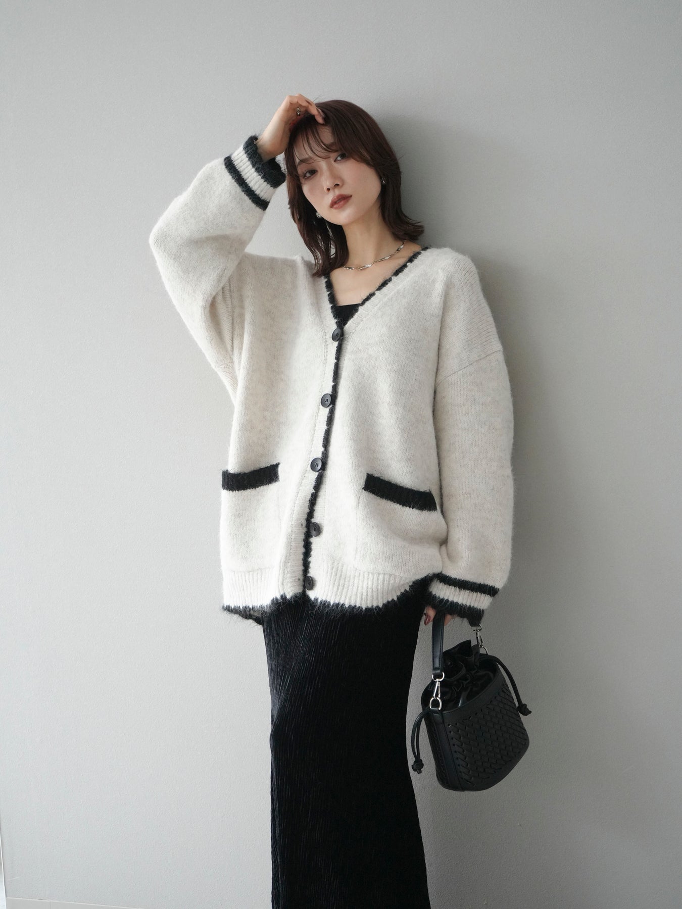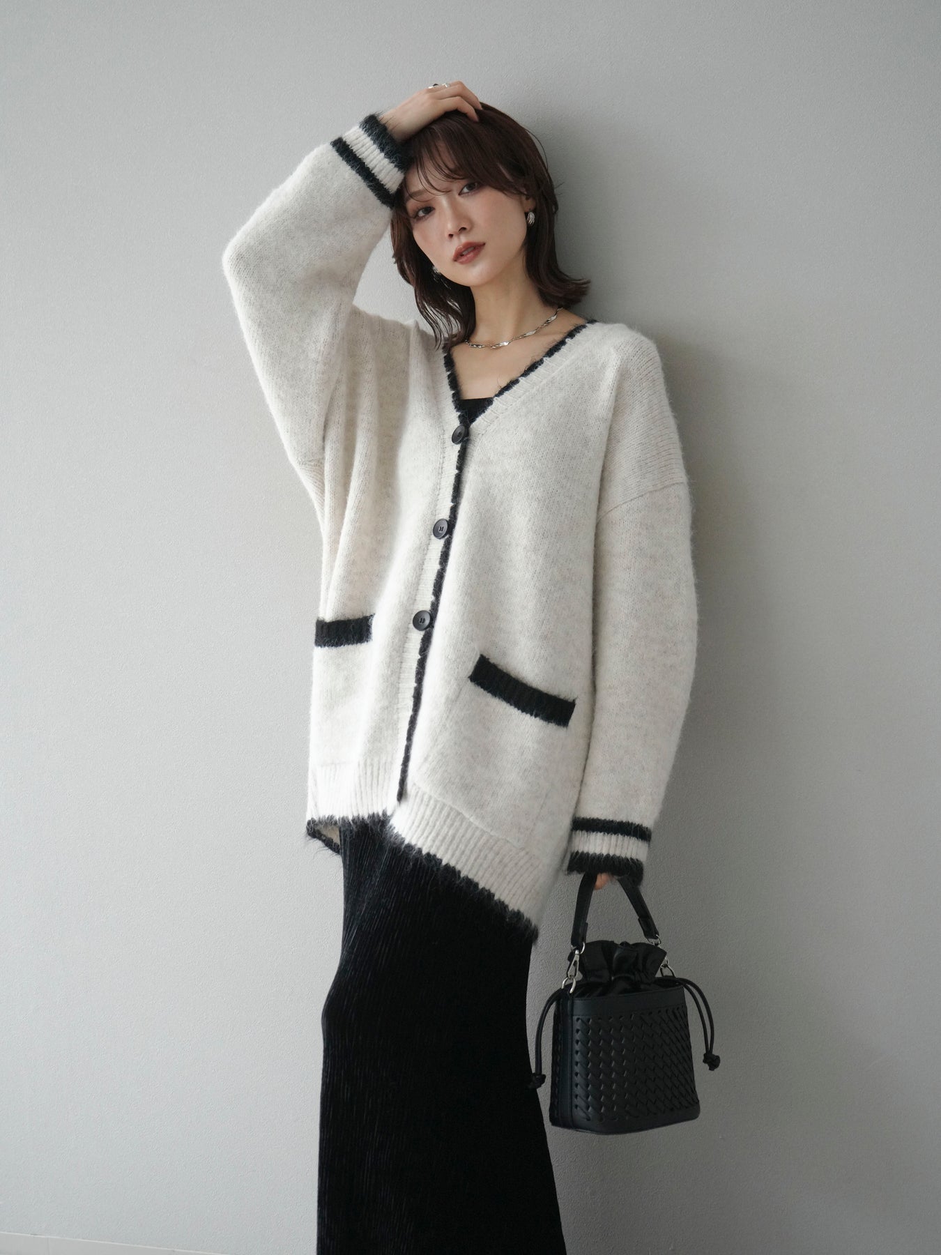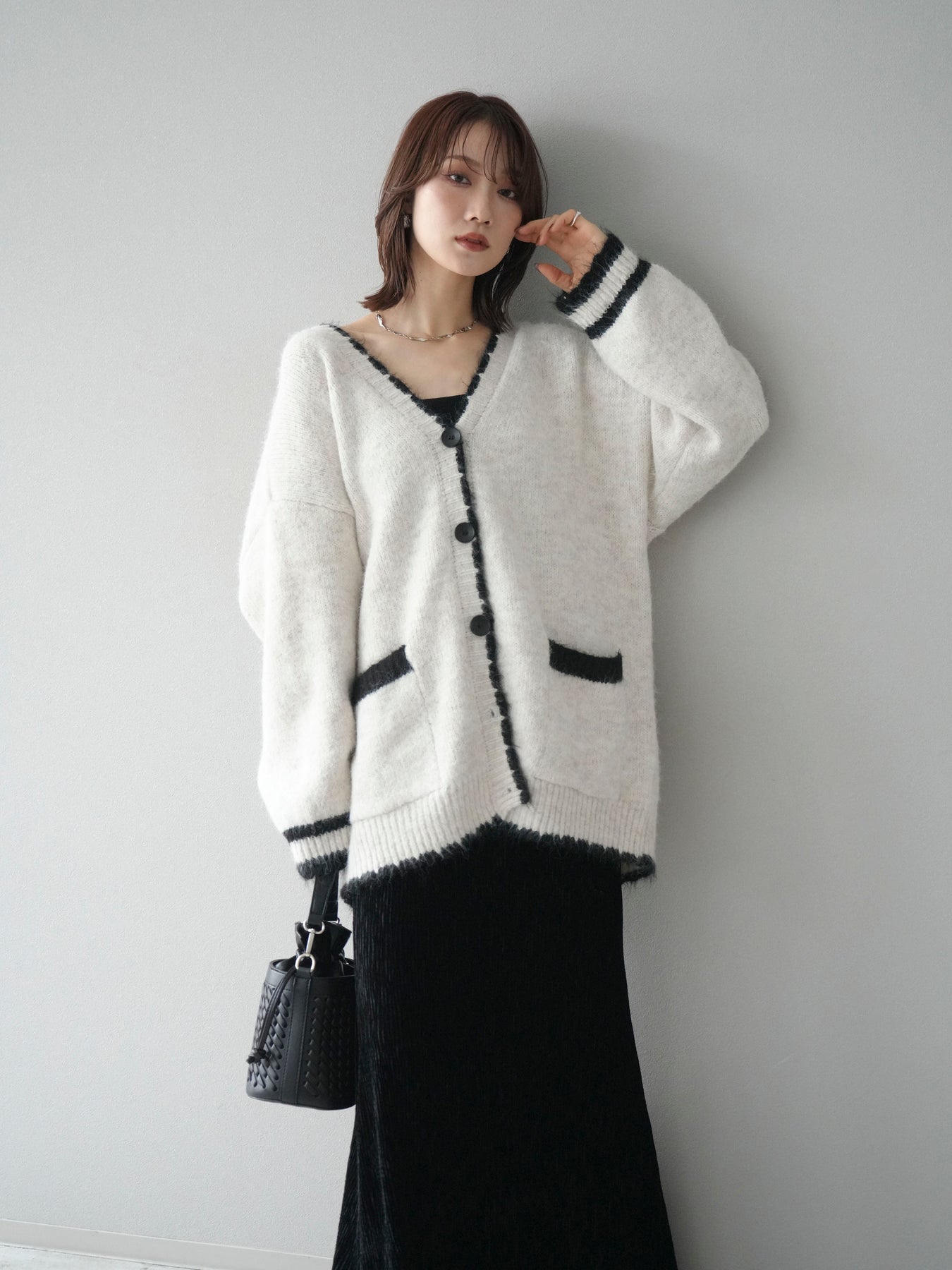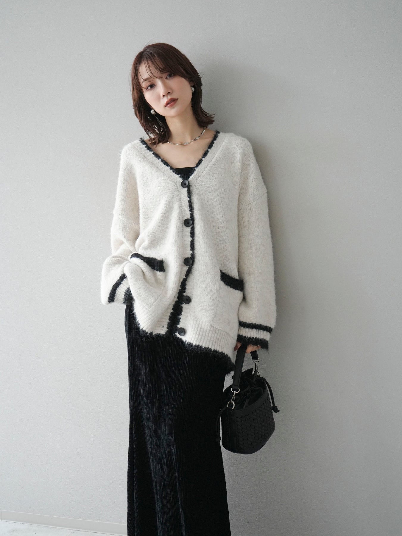 ふんわりとした柔らかなニットに、さりげないラメ糸が華やかさを添えるバイカラーカーディガン。 ゆるめのシルエットが抜け感を演出し、リラクシーな雰囲気ながらも上品に仕上がります。 配色のトリミングデザインが全体を引き締め、シンプルなコーディネートにアクセントをプラス。 軽く羽織るだけでスタイルがまとまり、デイリーからお出かけシーンまで幅広く活躍するアイテムです。 ※ボトムス、キャミソール(インナー)以外の商品は一律でインナーは付属していません。