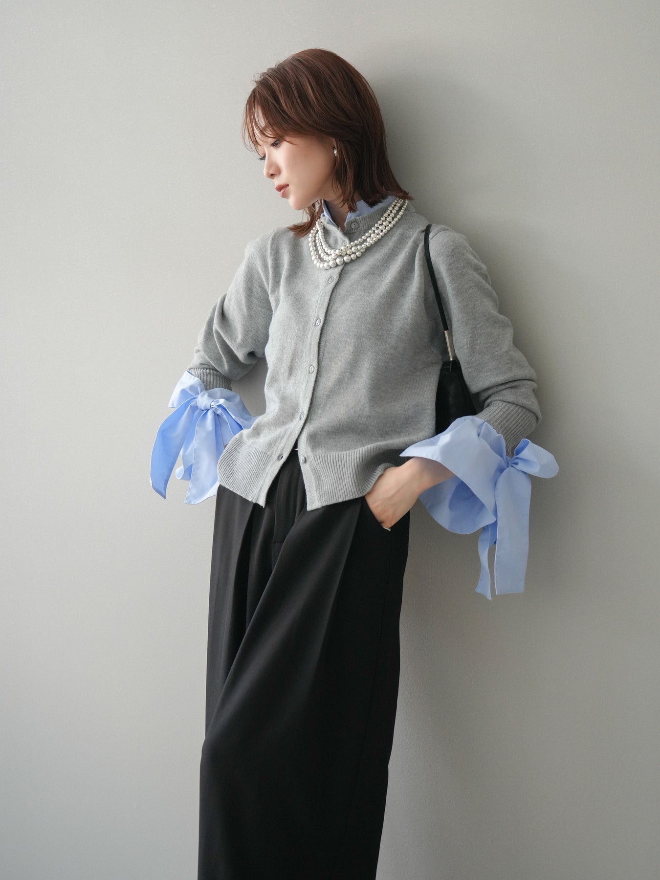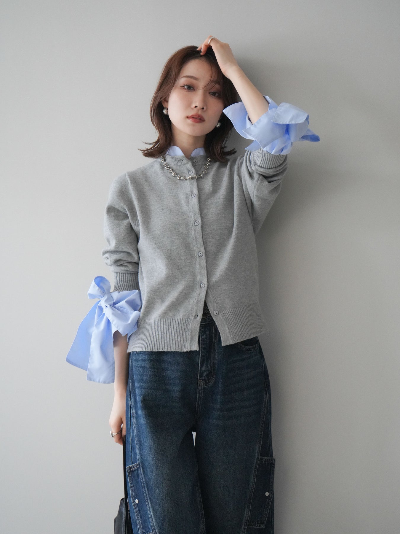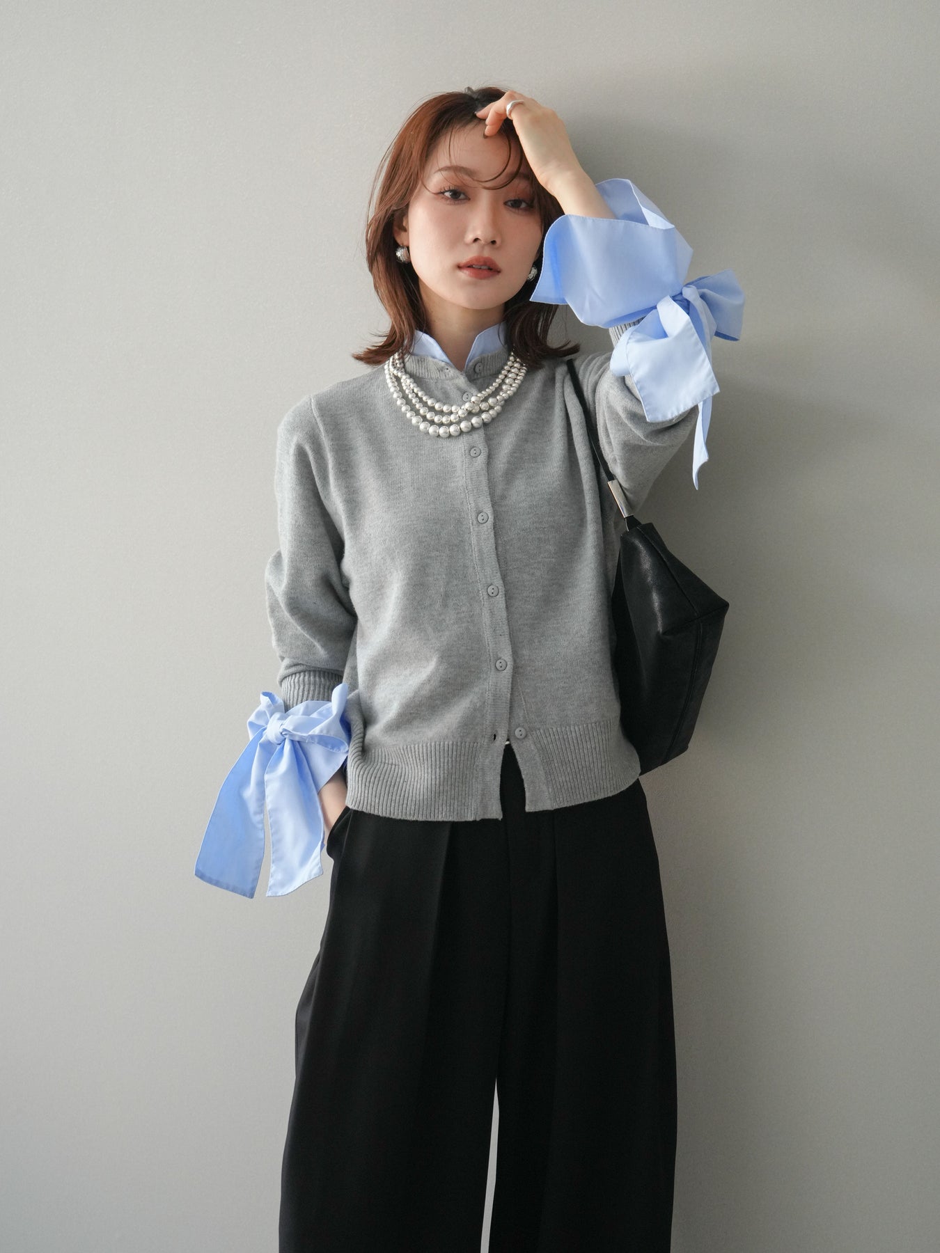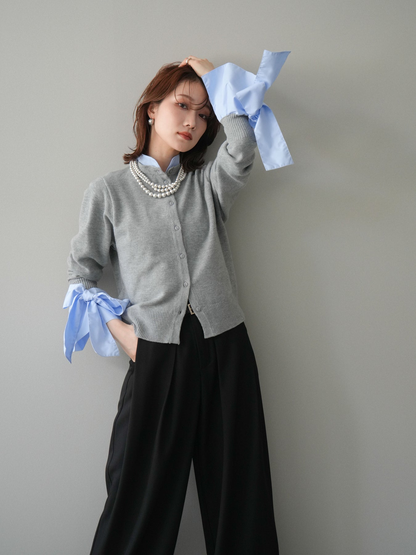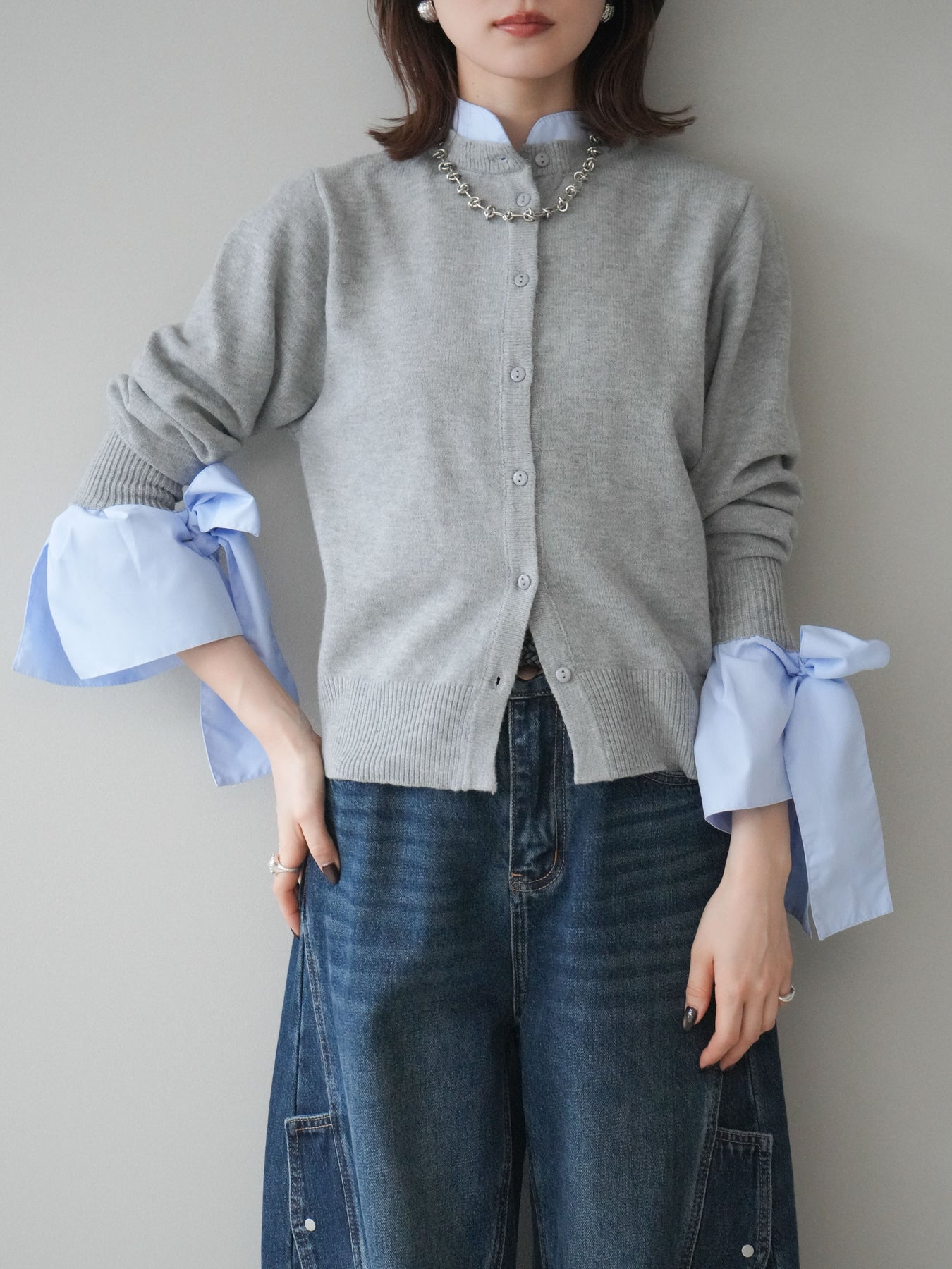 [予約]ウールライクリボンシャツカーディガン/gray