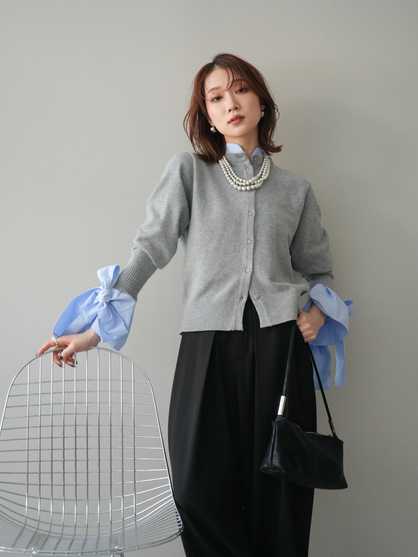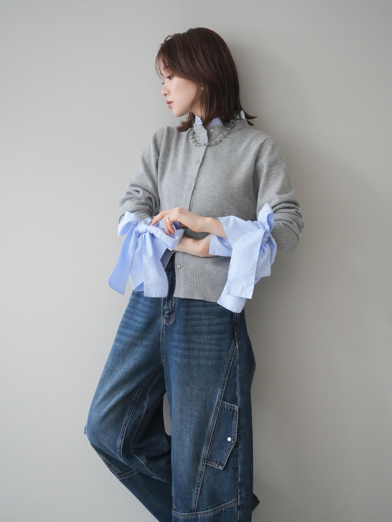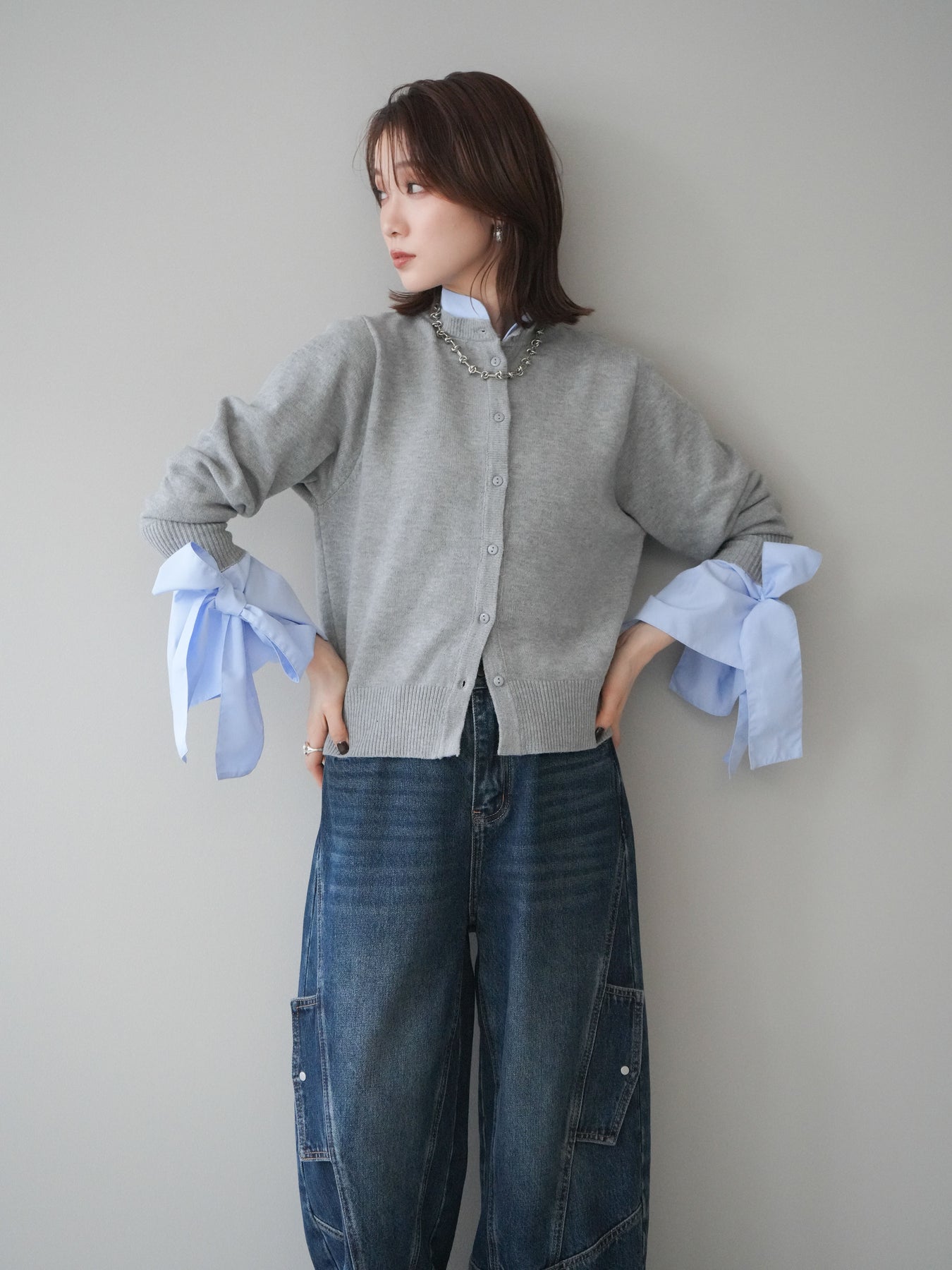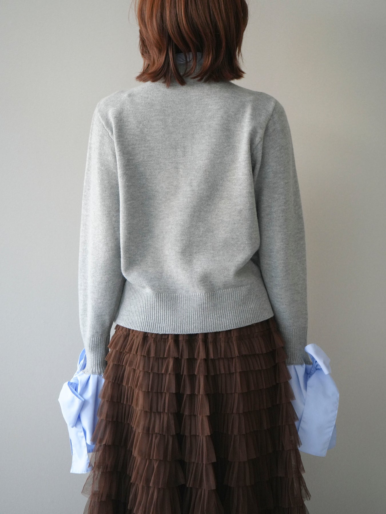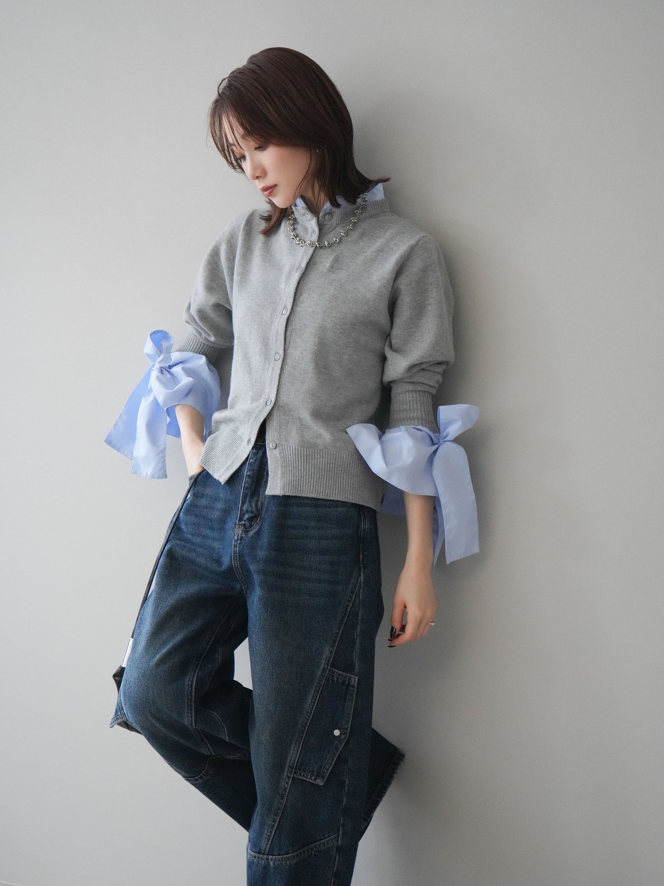 [予約]ウールライクリボンシャツカーディガン/gray
