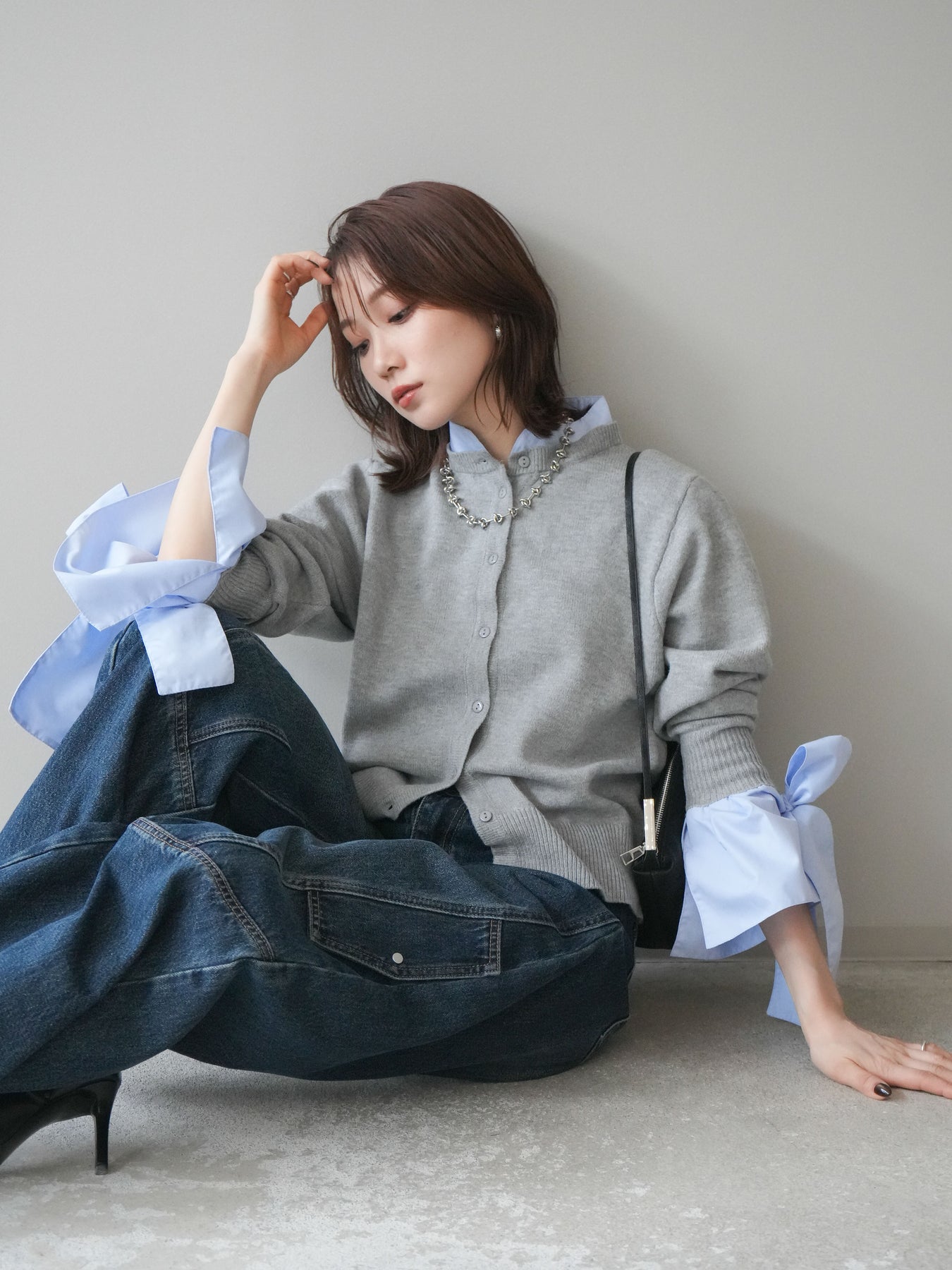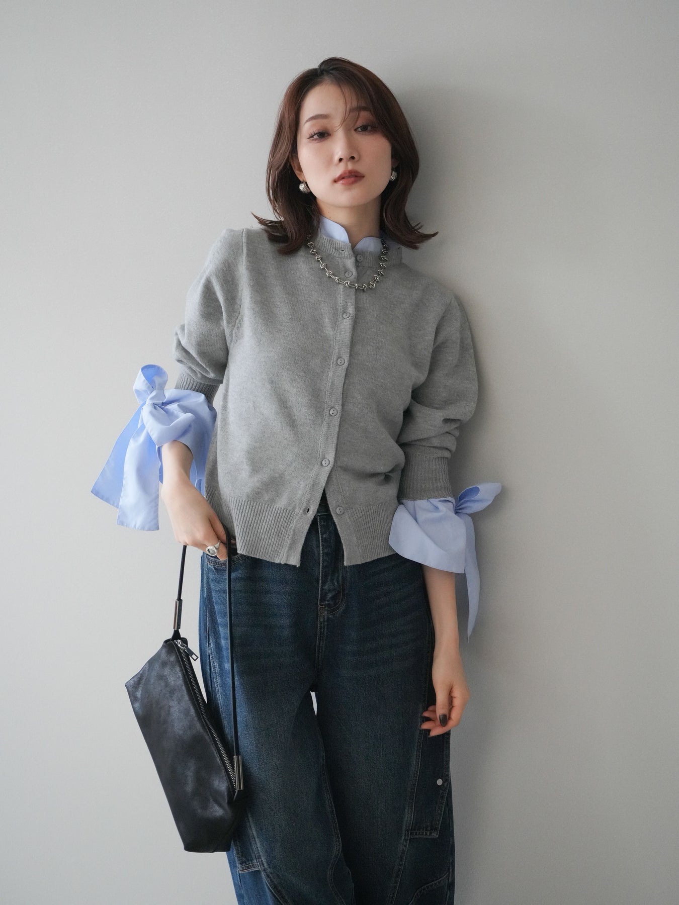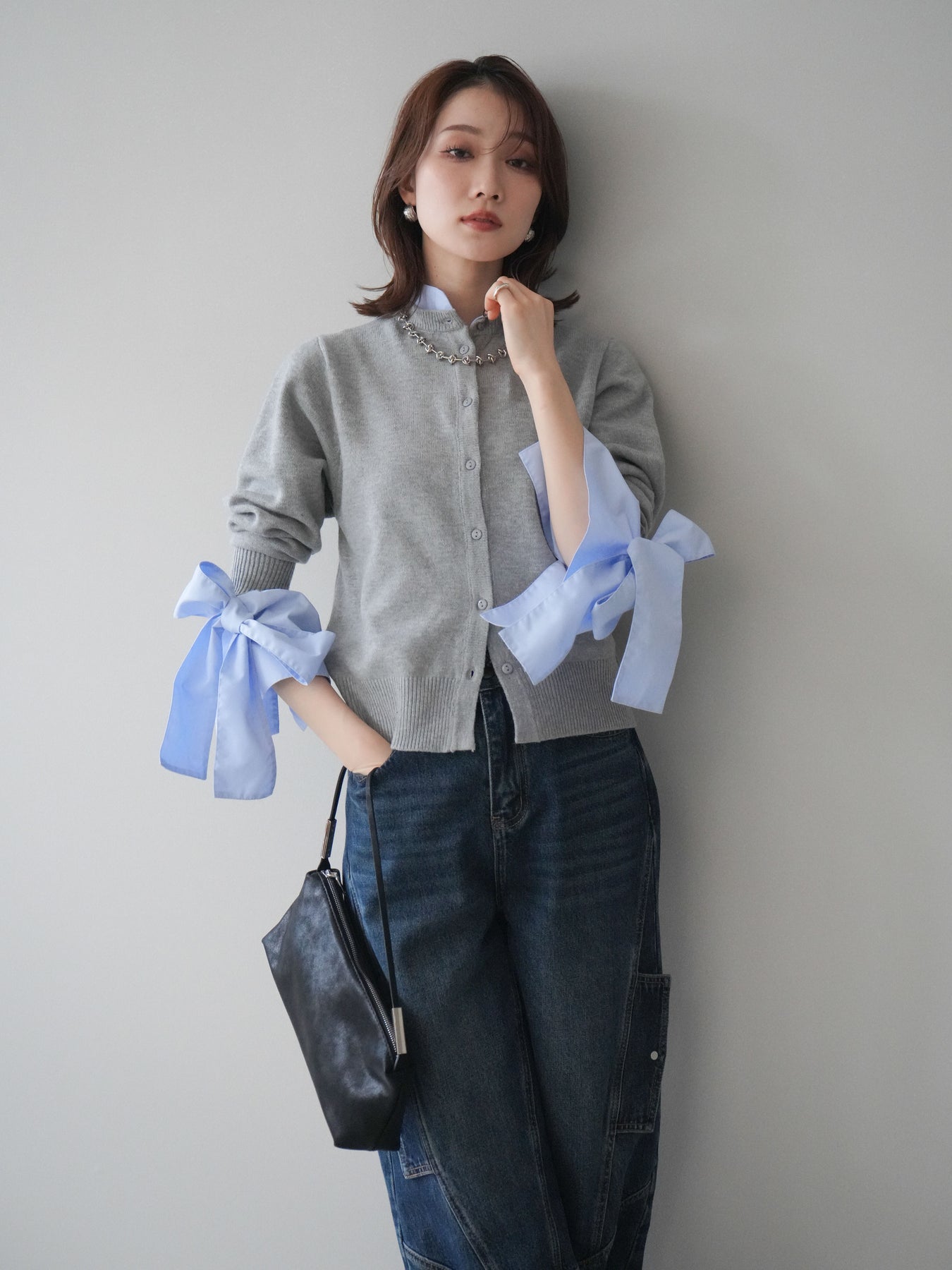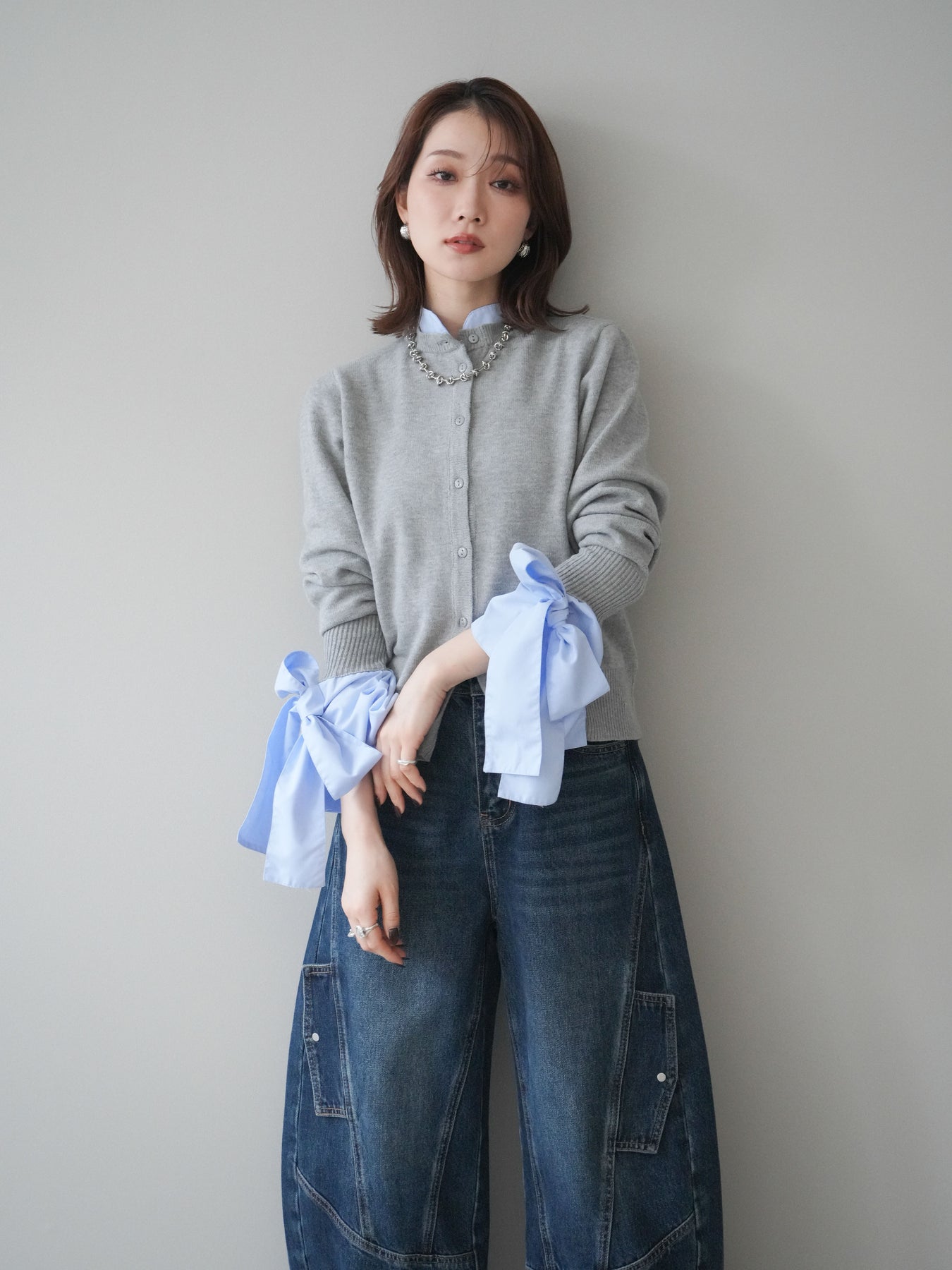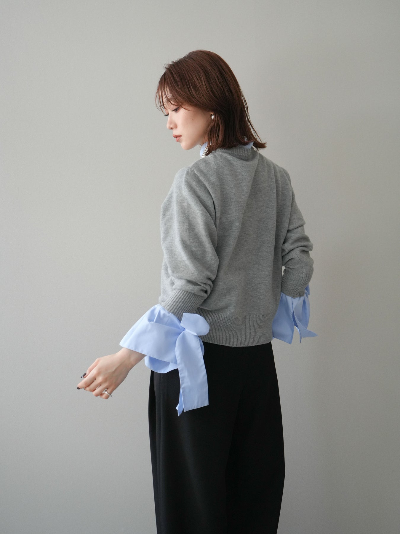[予約]ウールライクリボンシャツカーディガン/gray