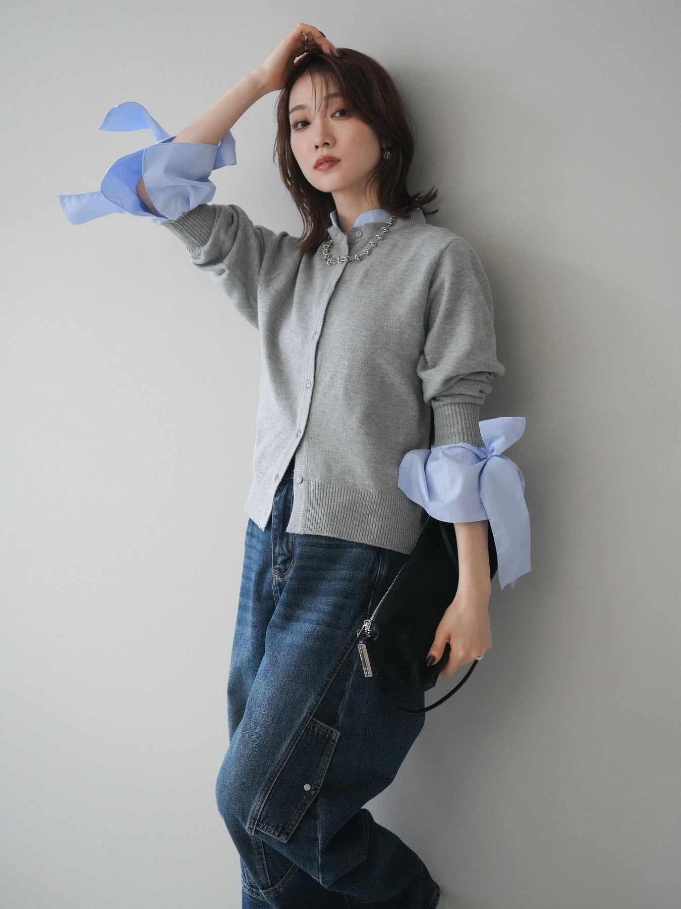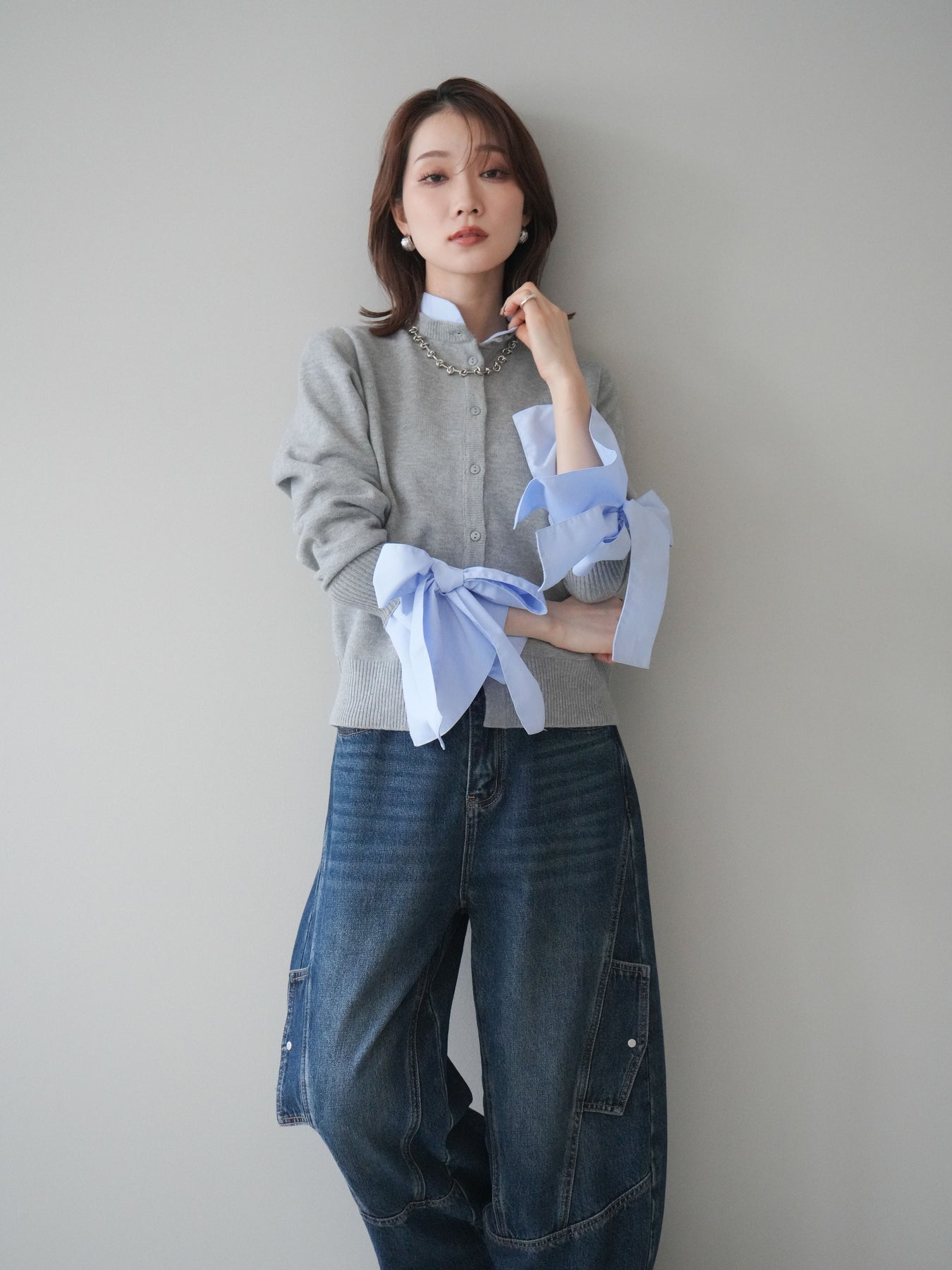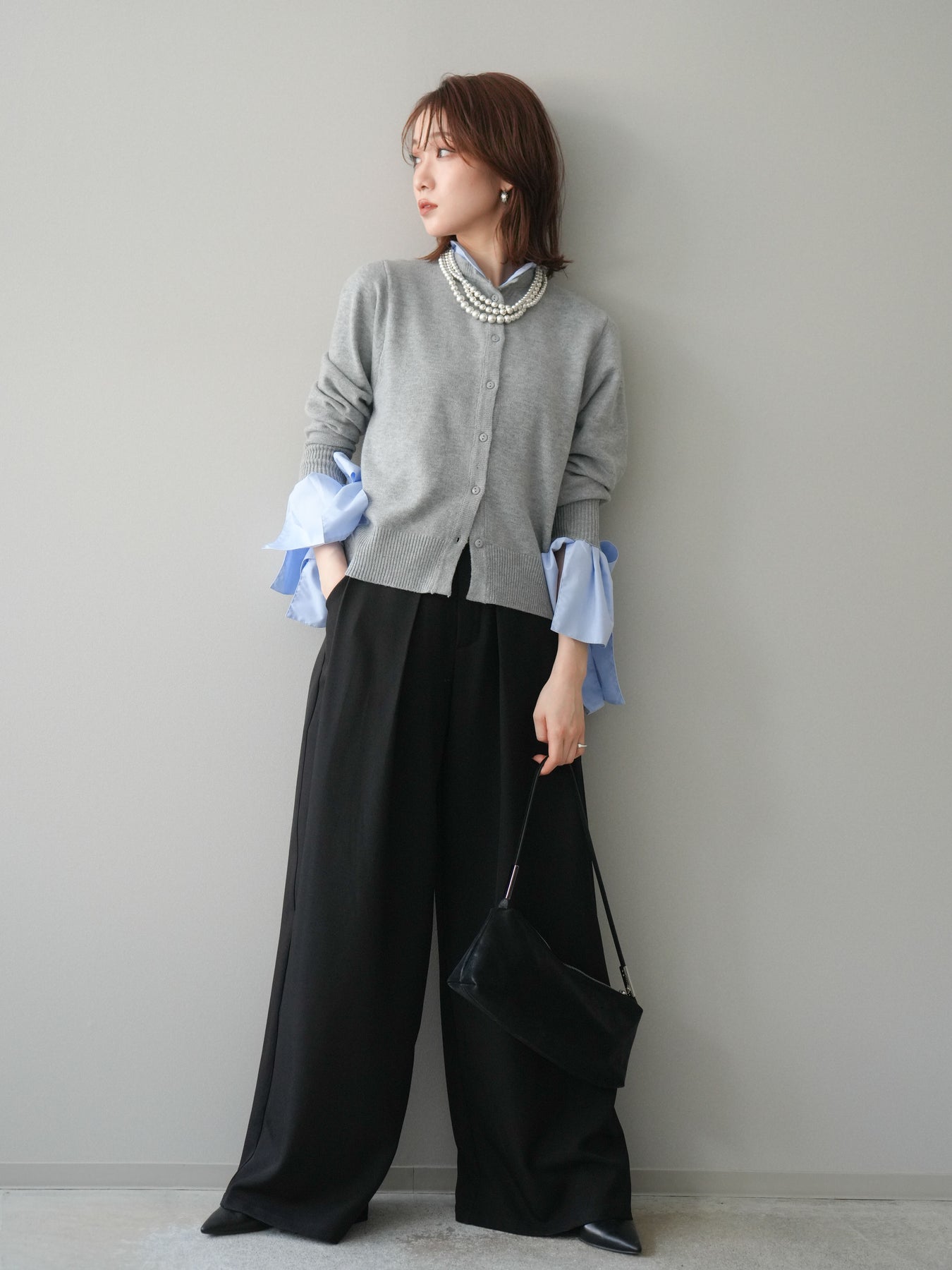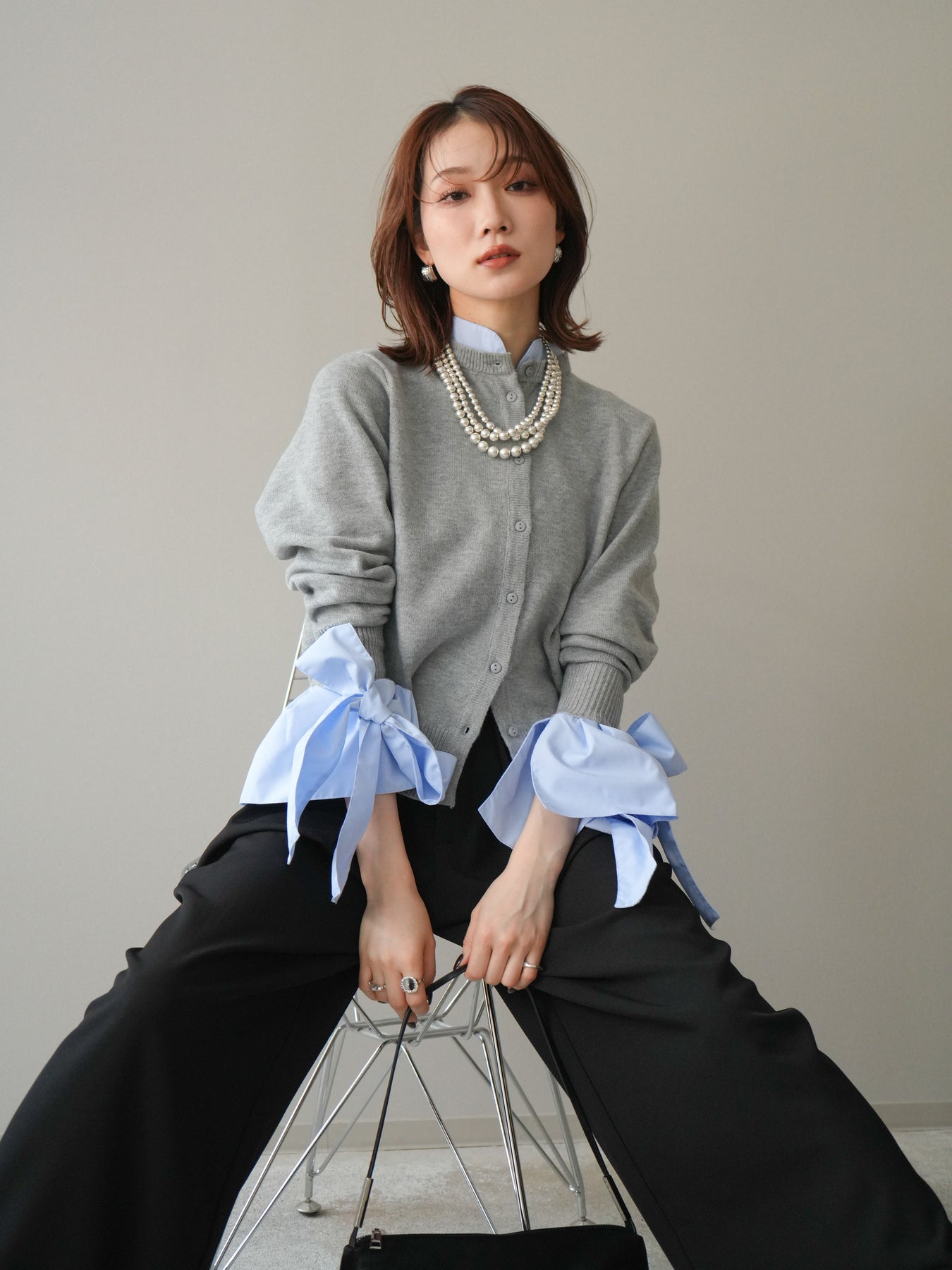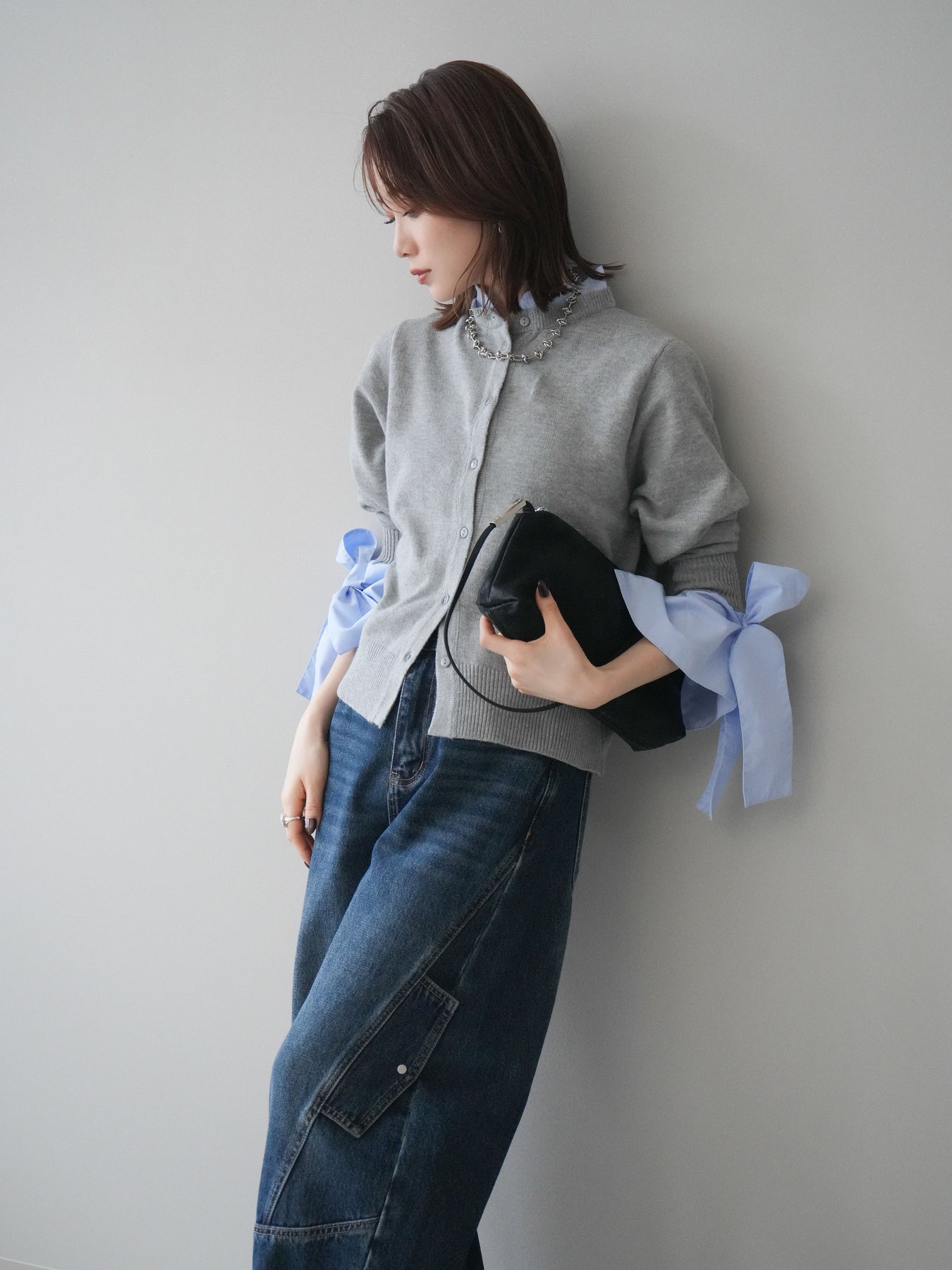 [予約]ウールライクリボンシャツカーディガン/gray