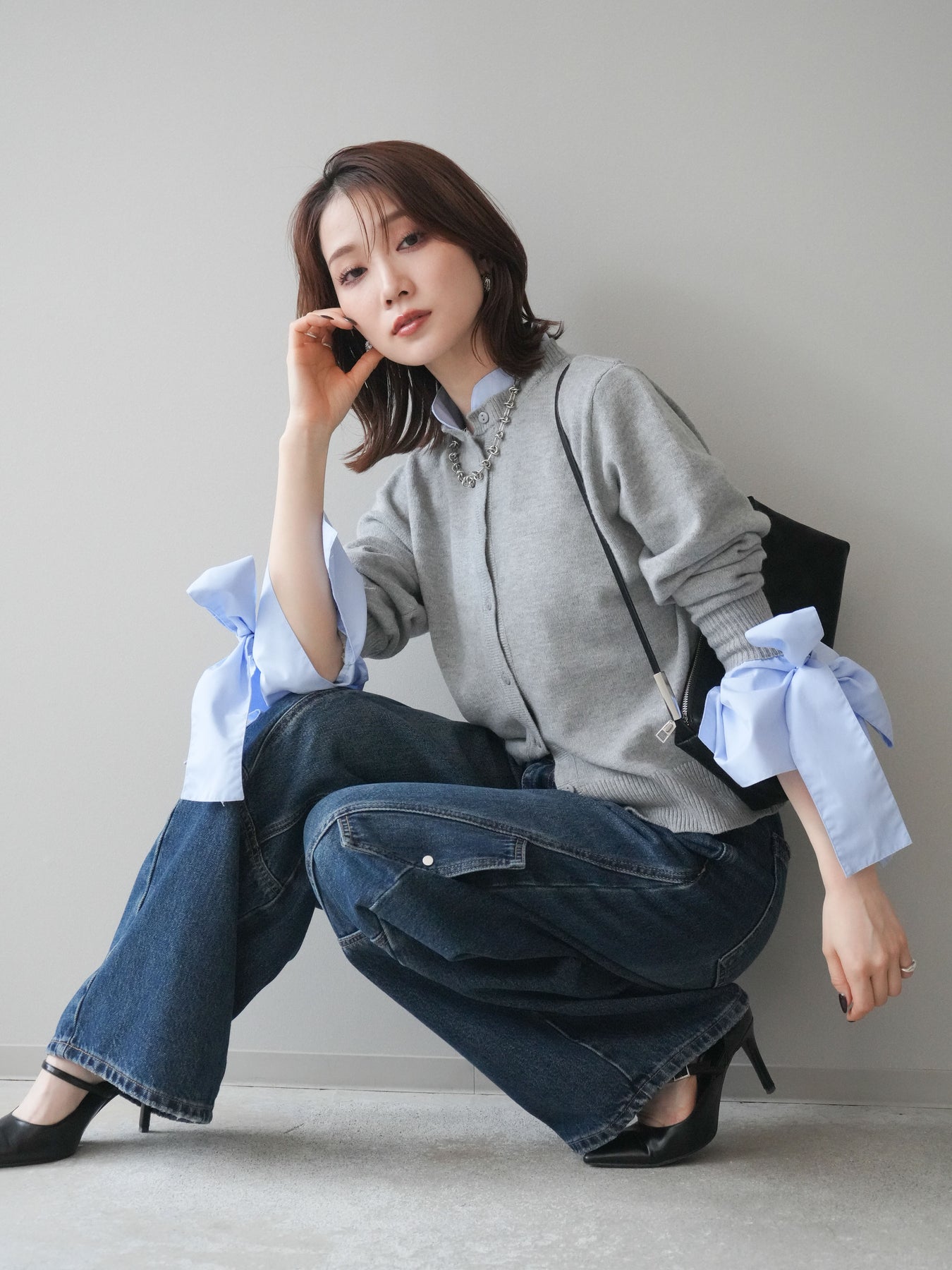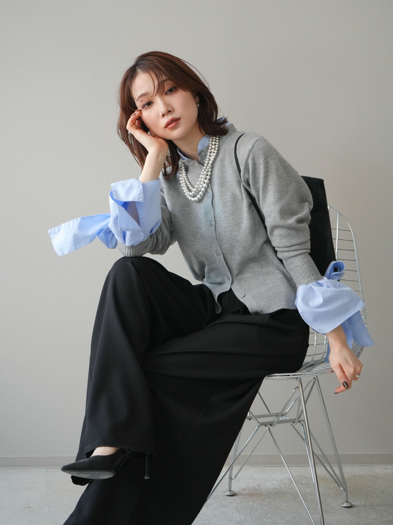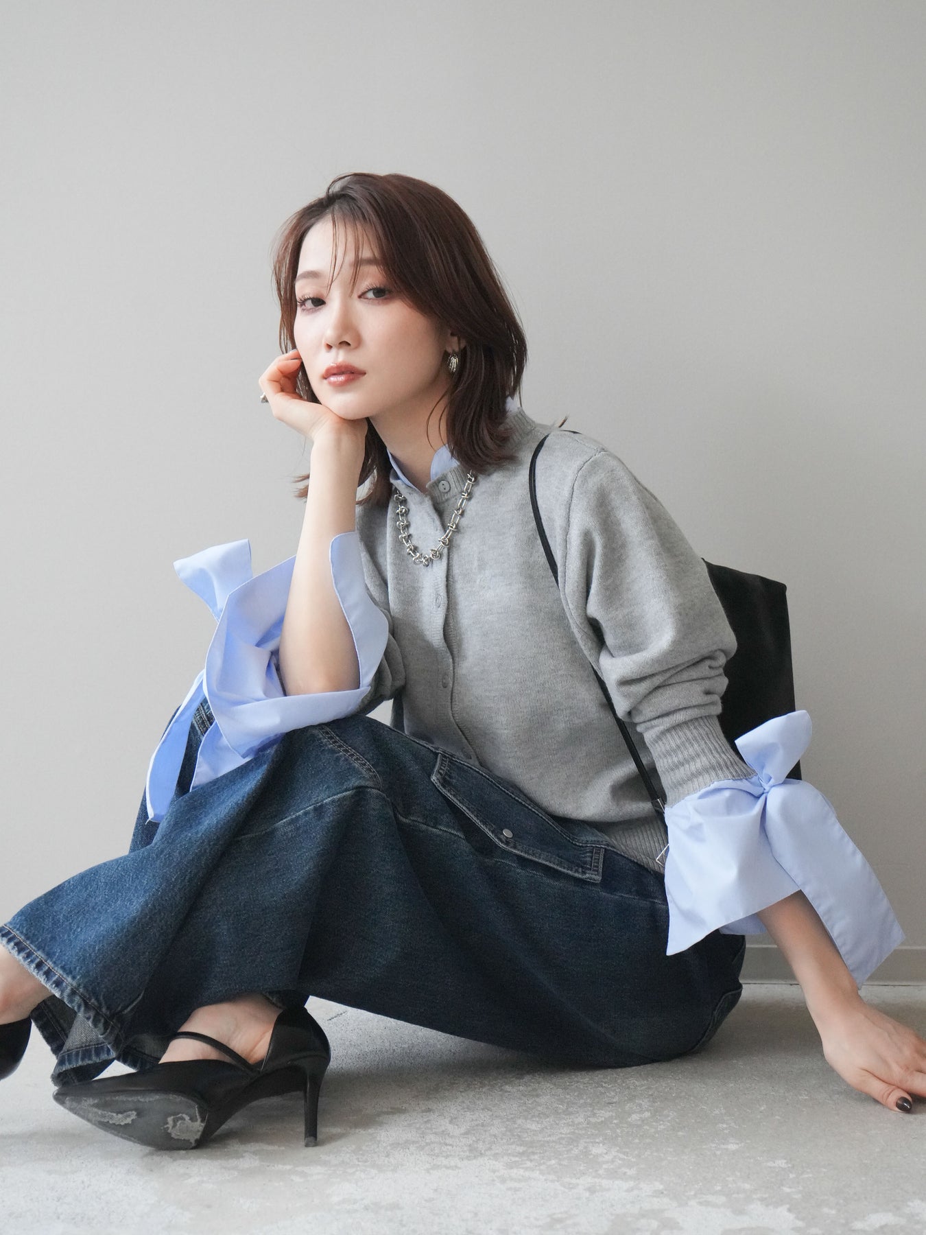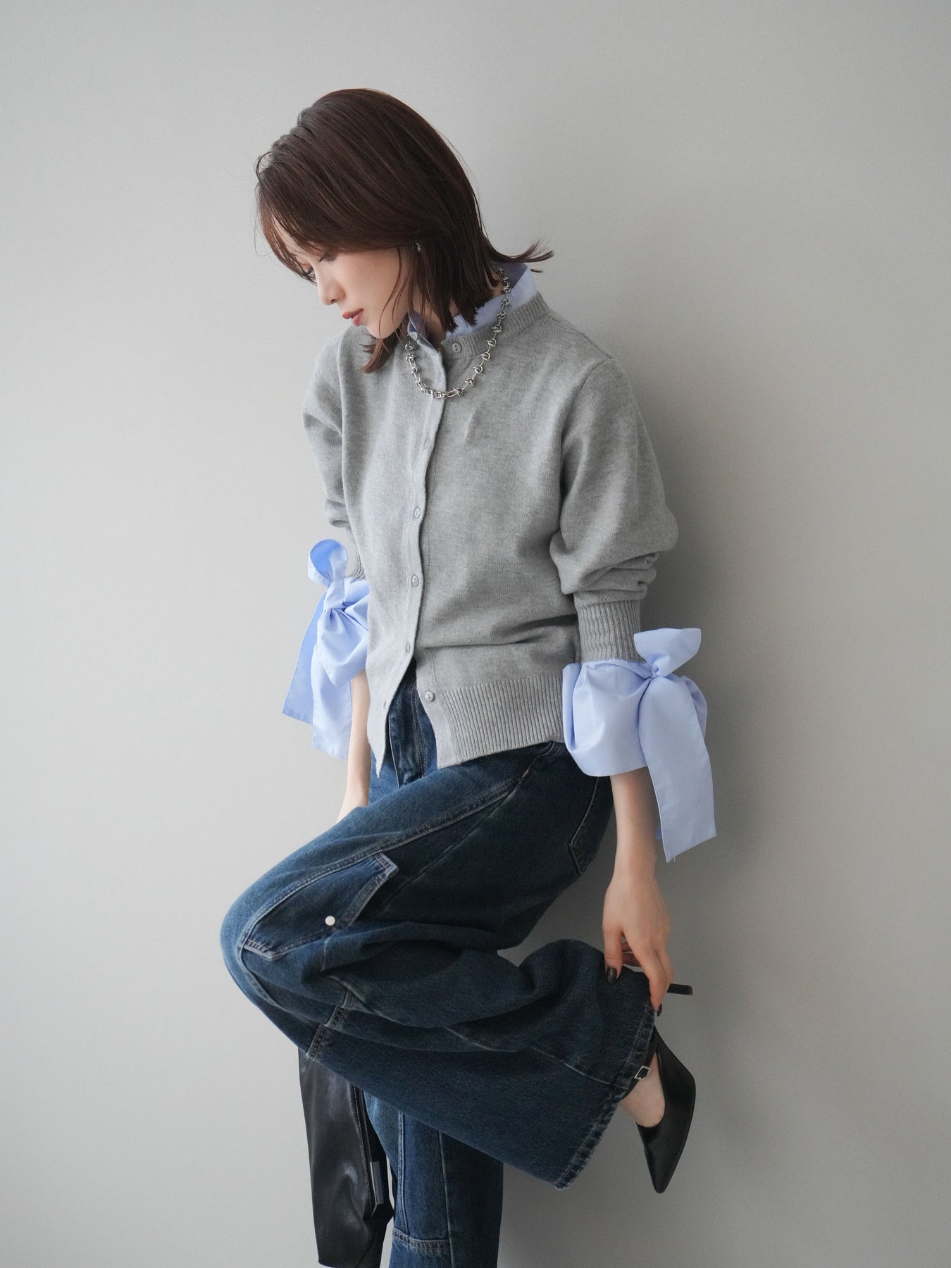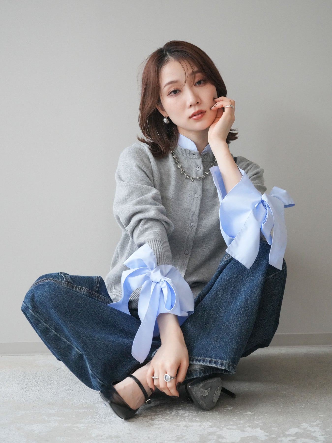 [予約]ウールライクリボンシャツカーディガン/gray