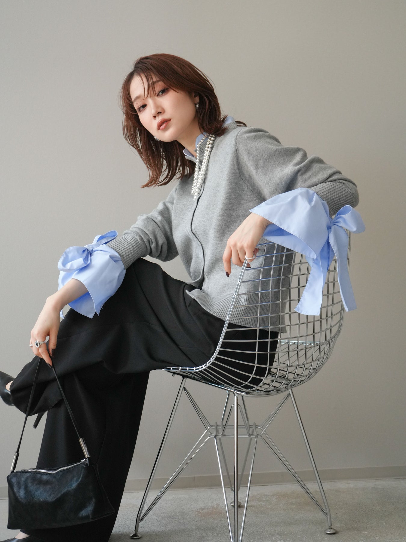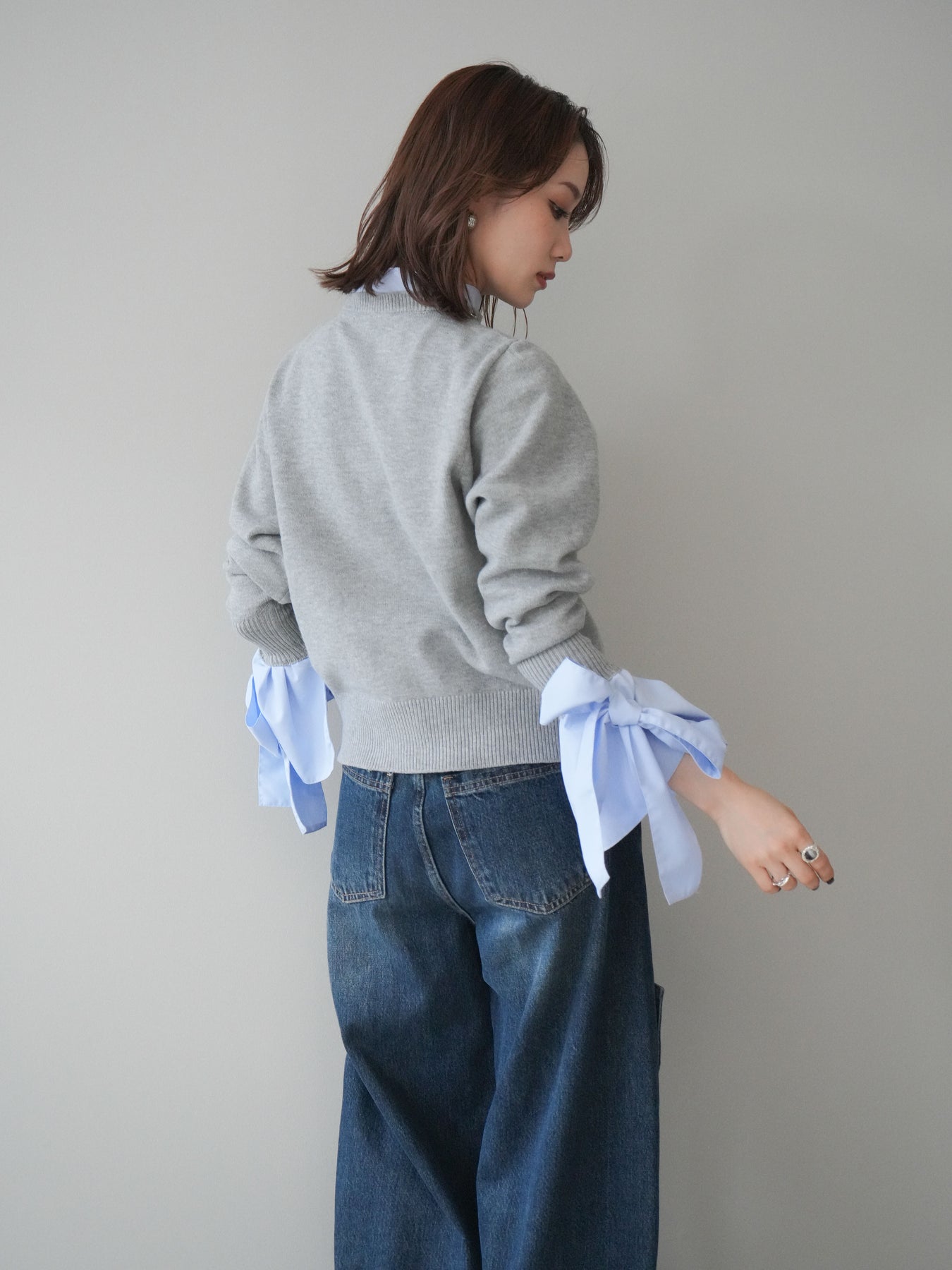 シャツとカーディガンをレイヤードしたようなデザインが魅力のアイテム。 袖口にあしらった大きめのリボンが女性らしいアクセントとなり、シンプルな中に華やかさをプラスします。 ウールライクな素材で柔らかく、暖かみのある着心地がシーズンムードを高めてくれる一枚。 前を閉じてトップスとしても、開けて羽織りとしても着回せる万能デザインです。 きちんと感のあるスタイリングにも、カジュアルなコーデにも馴染む、存在感のある主役級アイテムです。