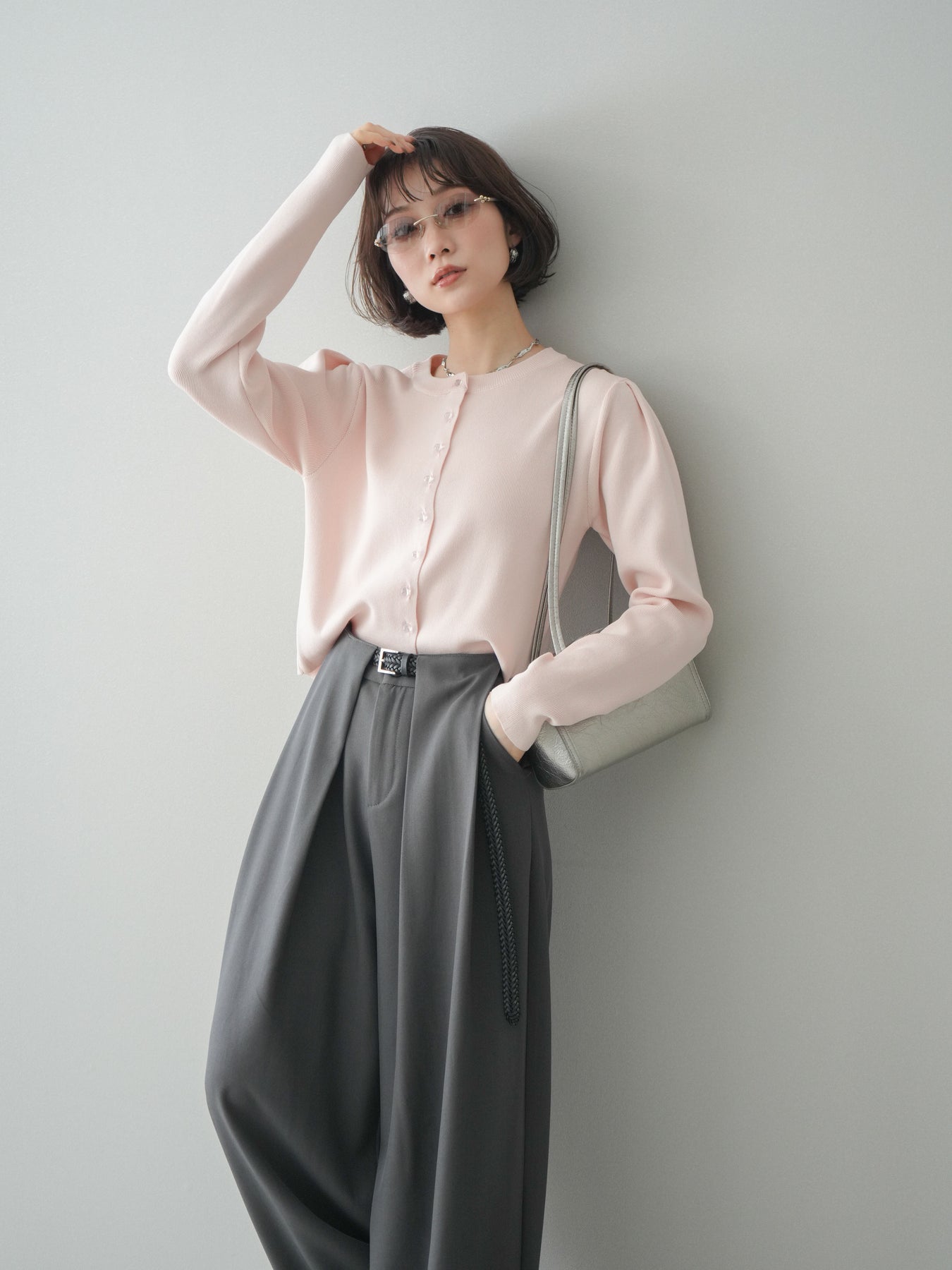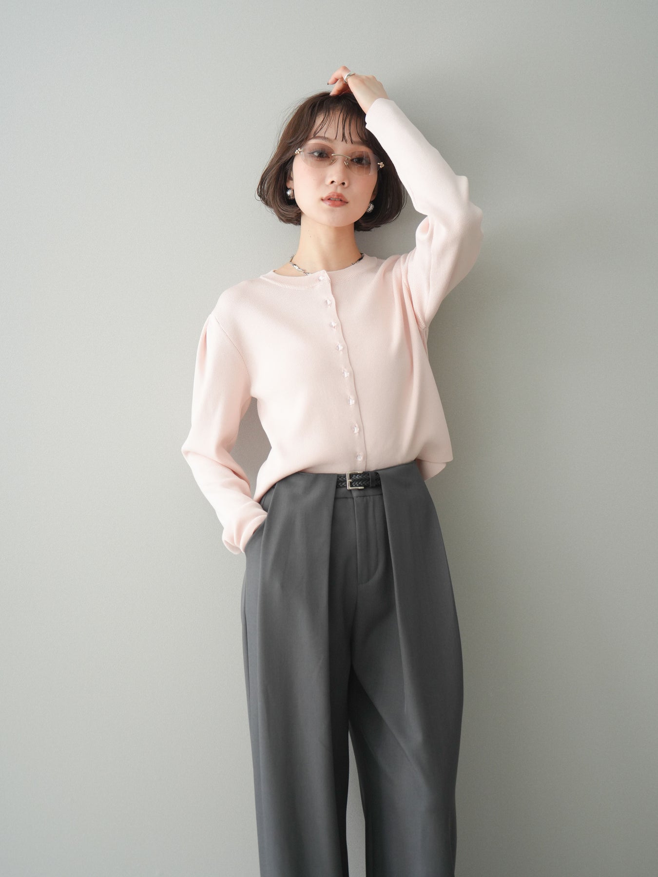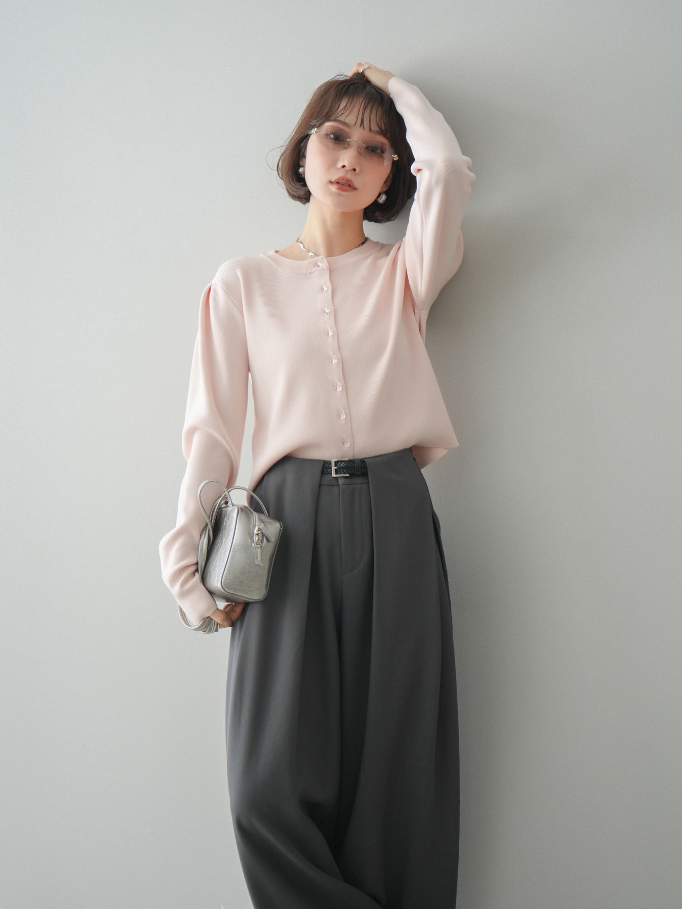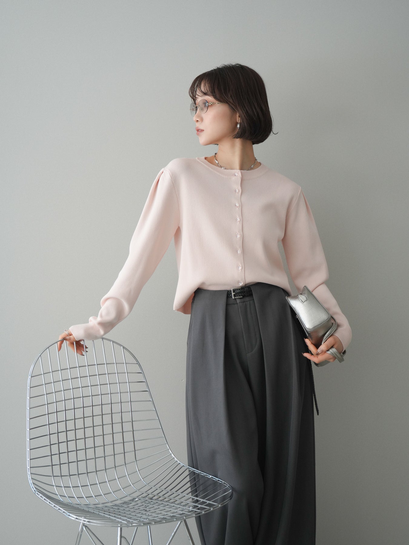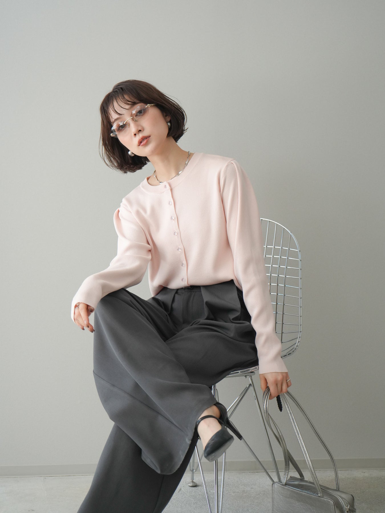 フロントに並ぶクリアボタンが、さりげない抜け感を演出するニットカーディガン。タックを施したデザインが立体感を生み、シンプルながらも表情のある一着に仕上がっています。程よくコンパクトなシルエットで、前を留めてトップスとしても、羽織りとしても着用しやすいのが魅力。きれいめにもカジュアルにも馴染み、ボトムスを選ばず幅広いスタイリングに活躍します。 ※ボトムス、キャミソール(インナー)以外の商品は一律でインナーは付属していません。
