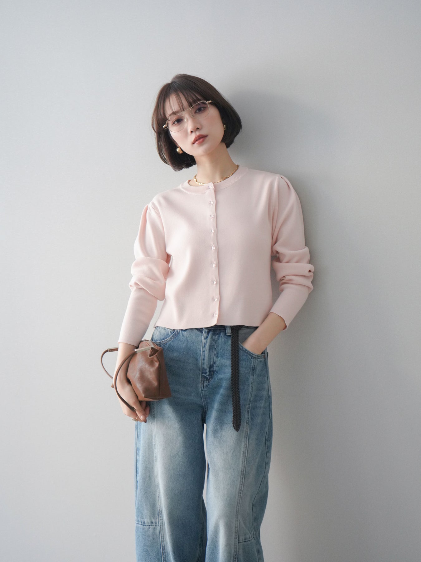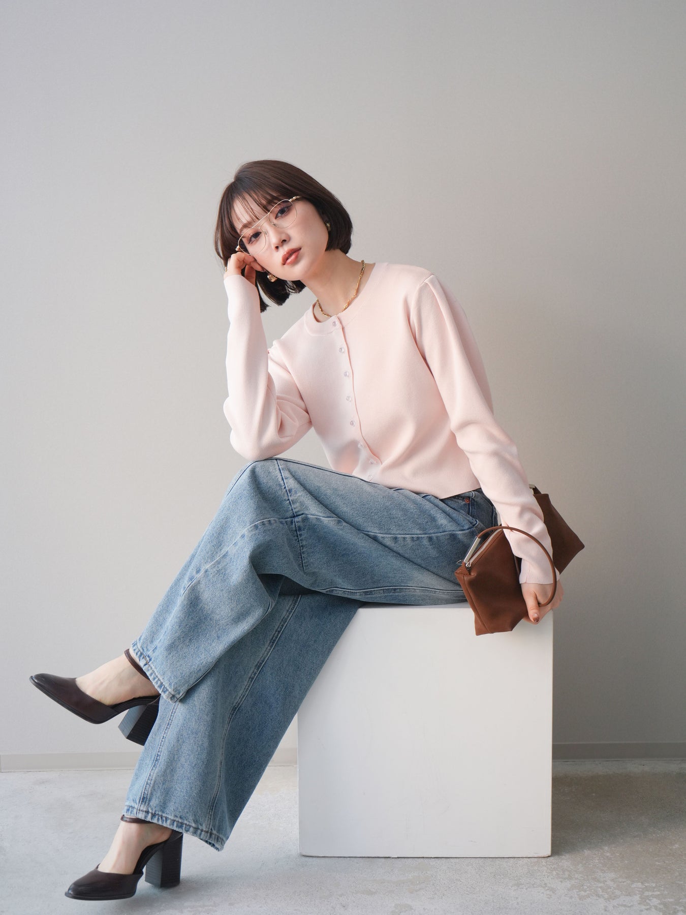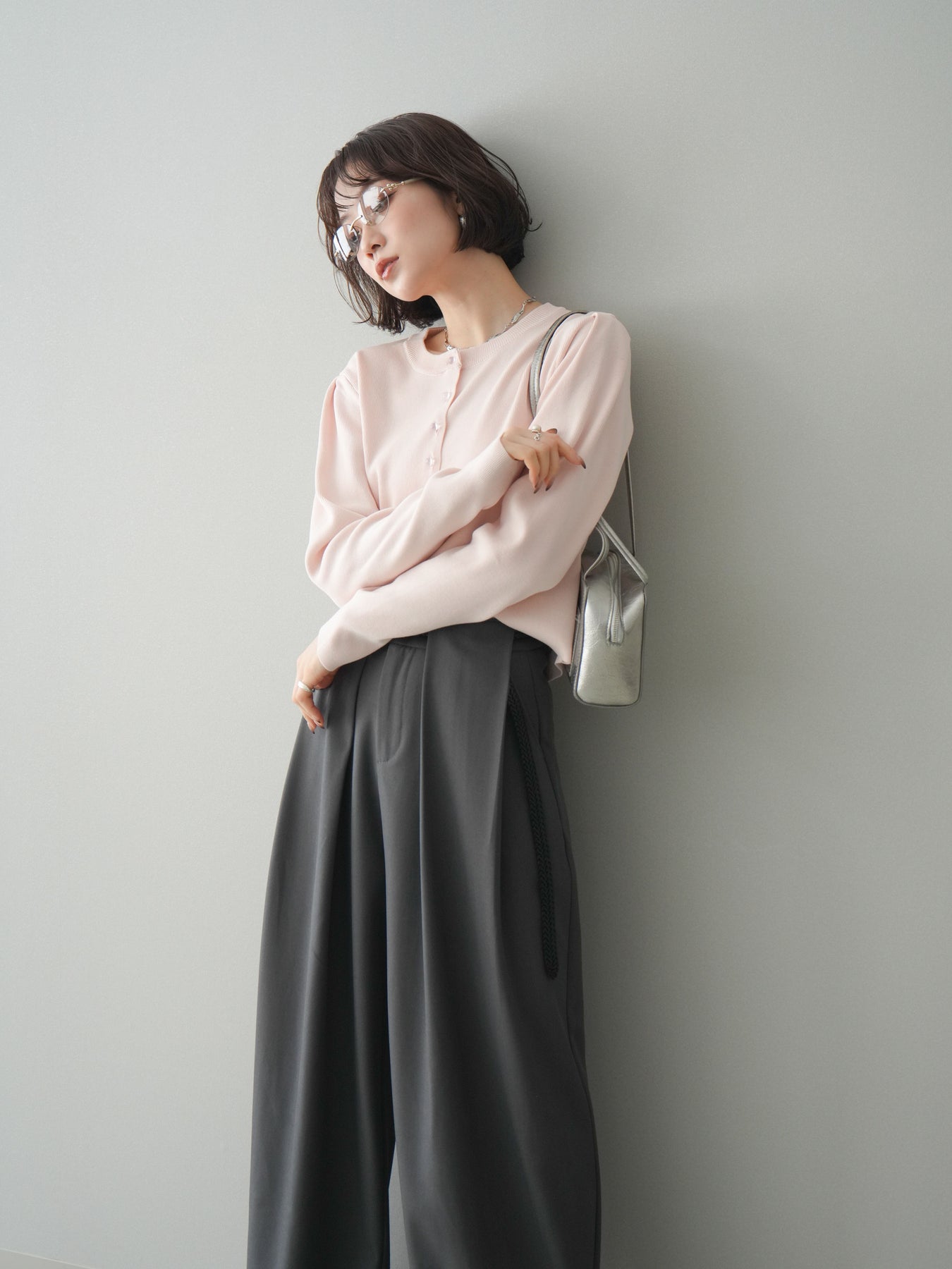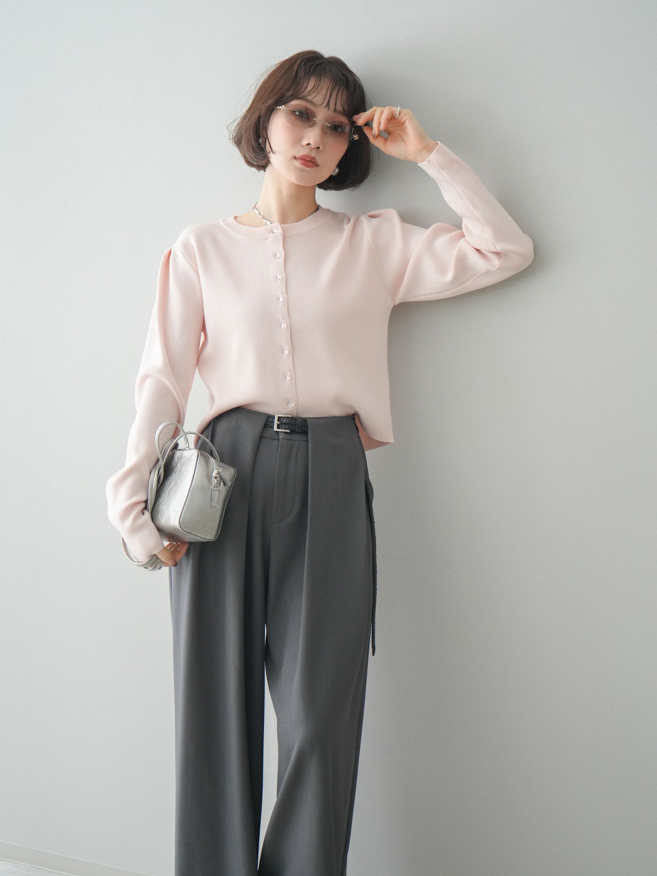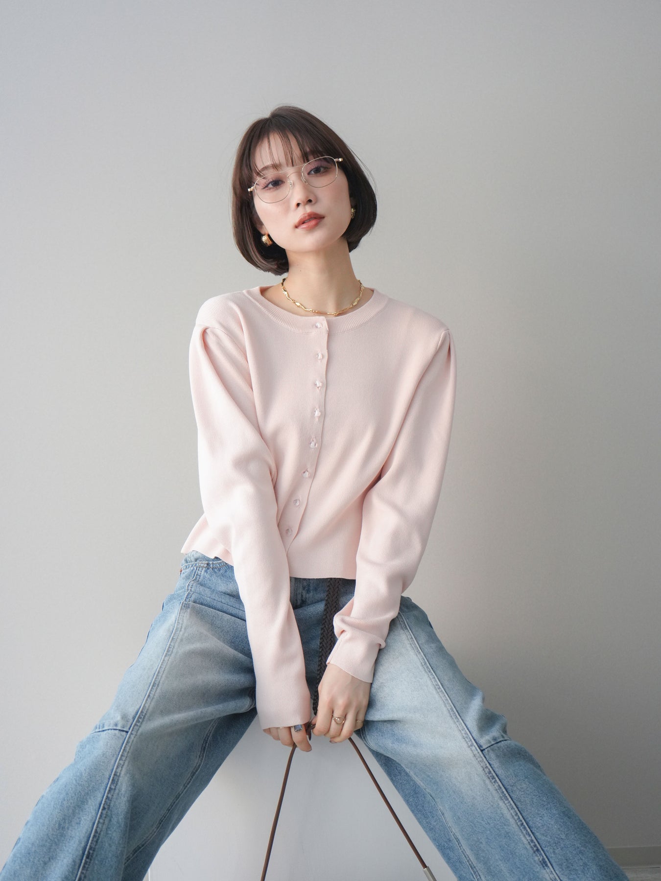 フロントに並ぶクリアボタンが、さりげない抜け感を演出するニットカーディガン。タックを施したデザインが立体感を生み、シンプルながらも表情のある一着に仕上がっています。程よくコンパクトなシルエットで、前を留めてトップスとしても、羽織りとしても着用しやすいのが魅力。きれいめにもカジュアルにも馴染み、ボトムスを選ばず幅広いスタイリングに活躍します。 ※ボトムス、キャミソール(インナー)以外の商品は一律でインナーは付属していません。