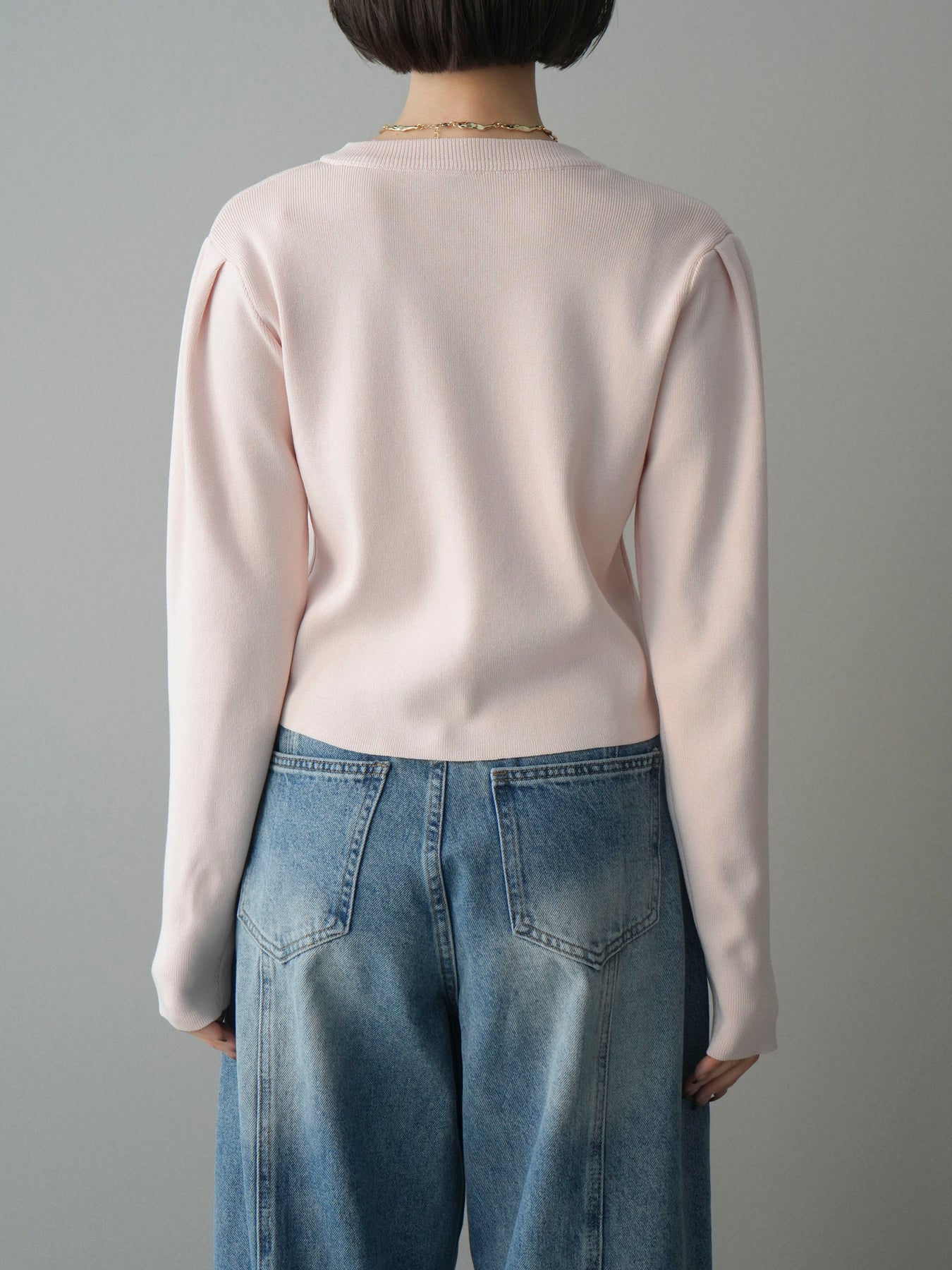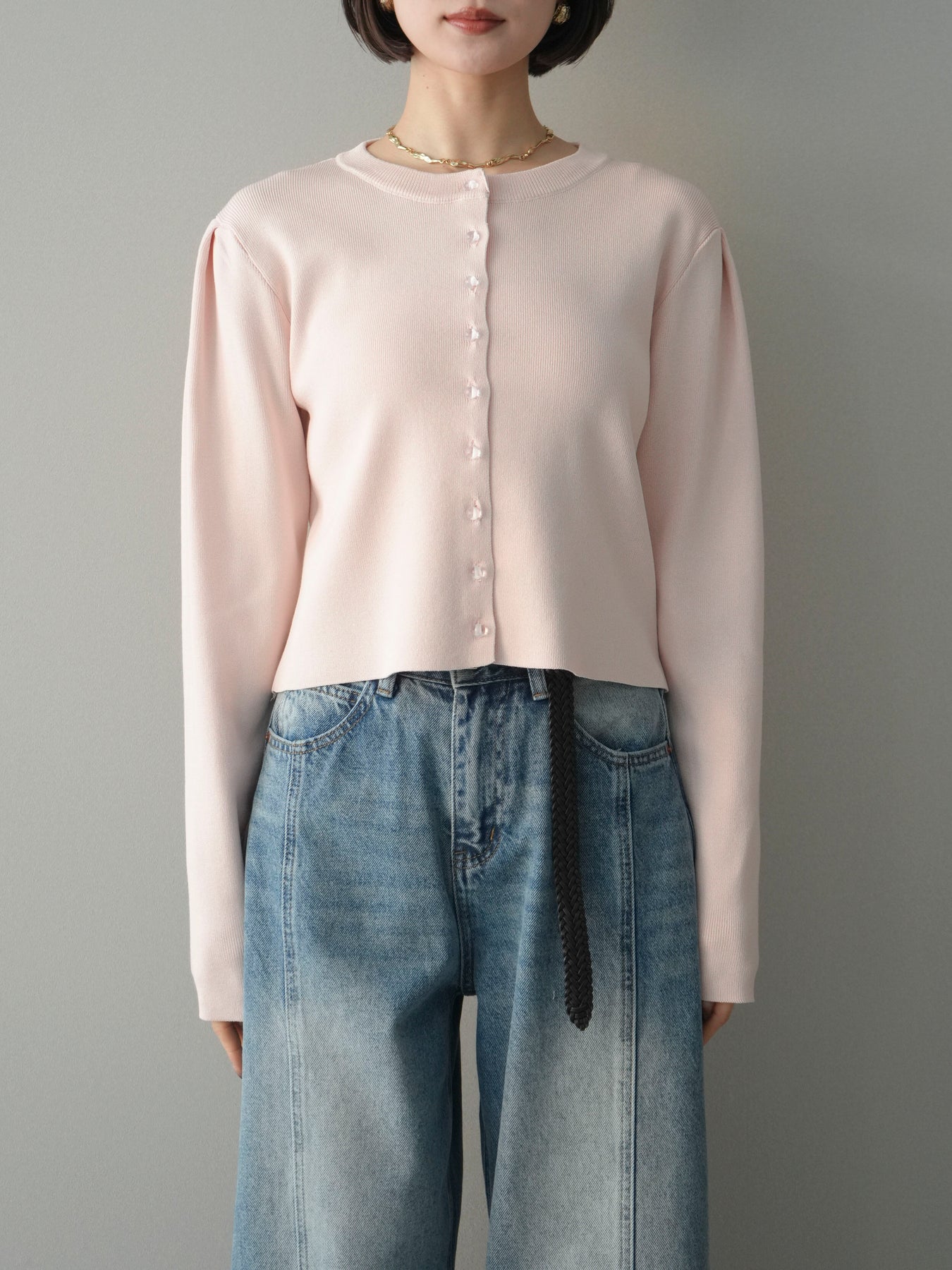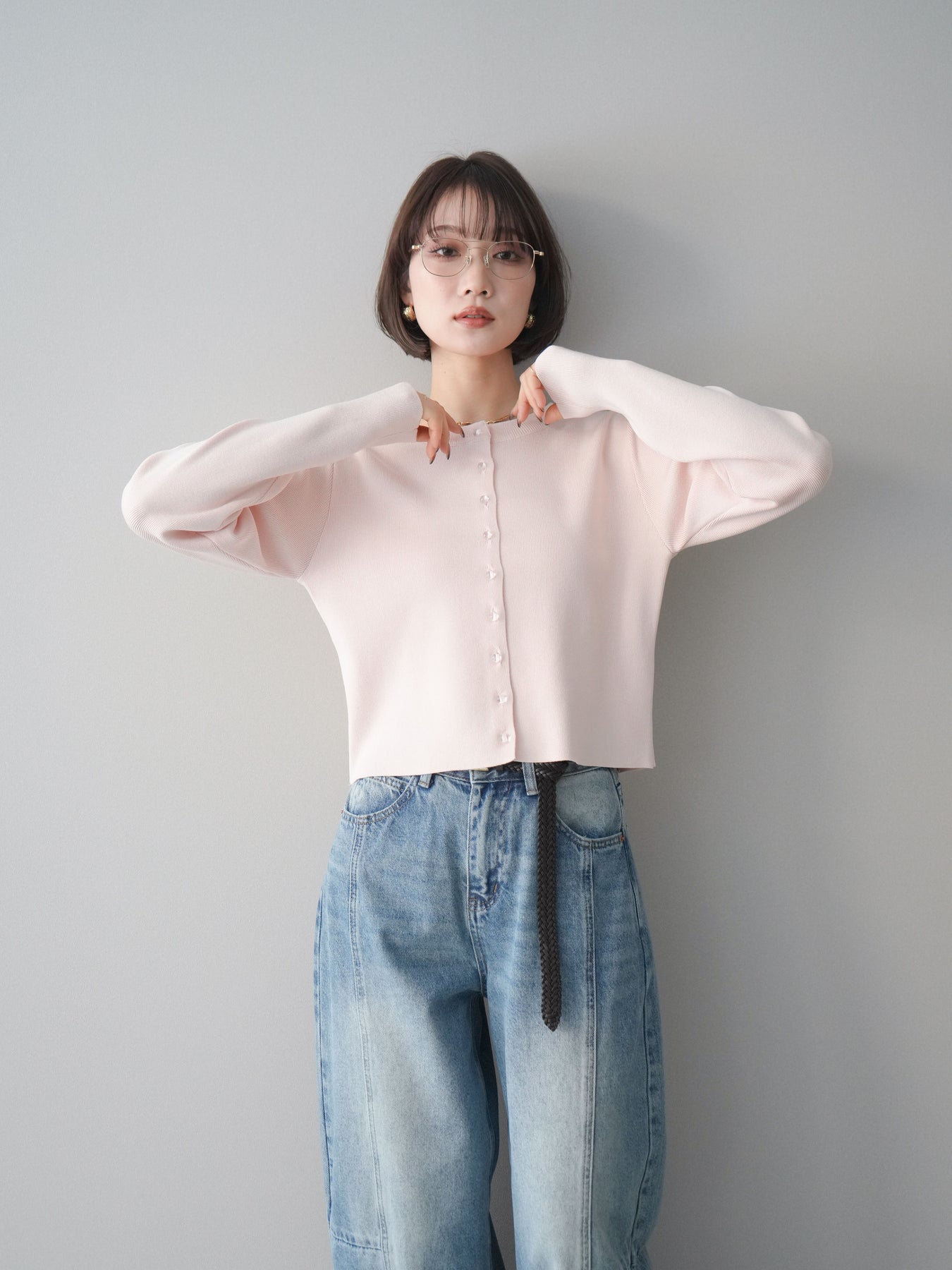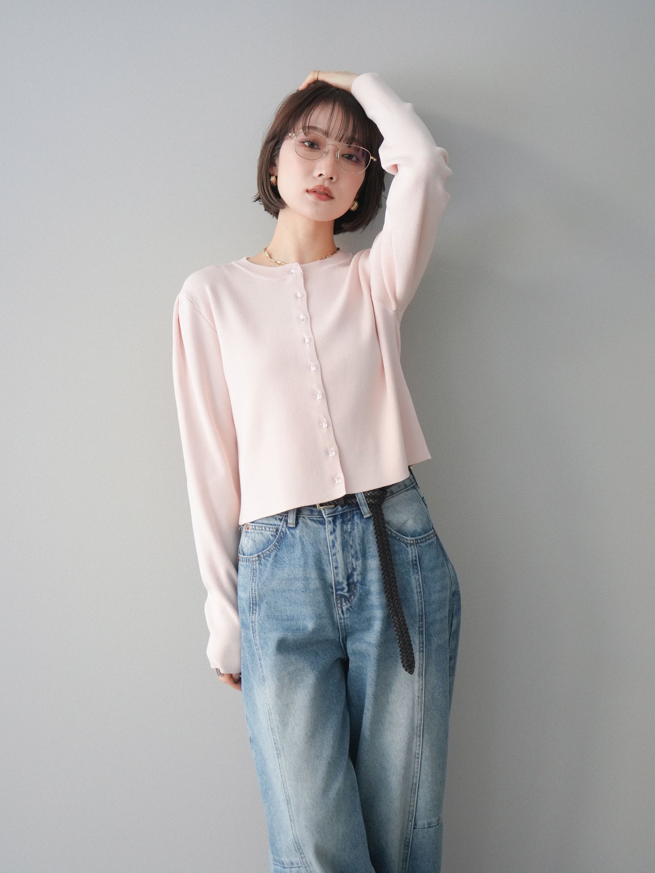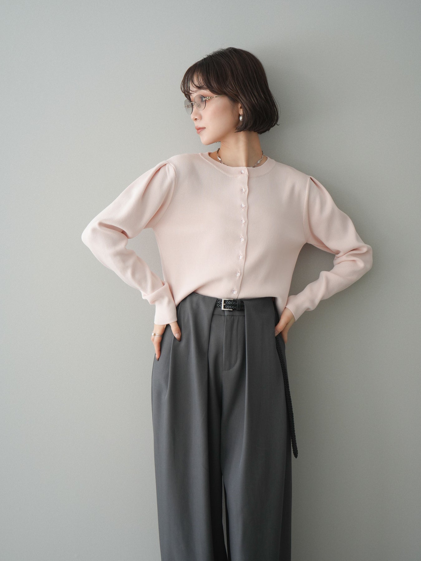 フロントに並ぶクリアボタンが、さりげない抜け感を演出するニットカーディガン。タックを施したデザインが立体感を生み、シンプルながらも表情のある一着に仕上がっています。程よくコンパクトなシルエットで、前を留めてトップスとしても、羽織りとしても着用しやすいのが魅力。きれいめにもカジュアルにも馴染み、ボトムスを選ばず幅広いスタイリングに活躍します。 ※ボトムス、キャミソール(インナー)以外の商品は一律でインナーは付属していません。