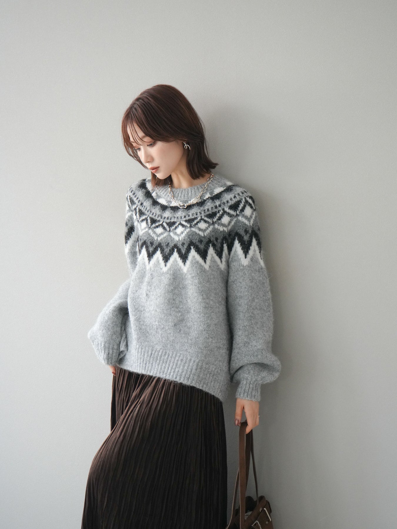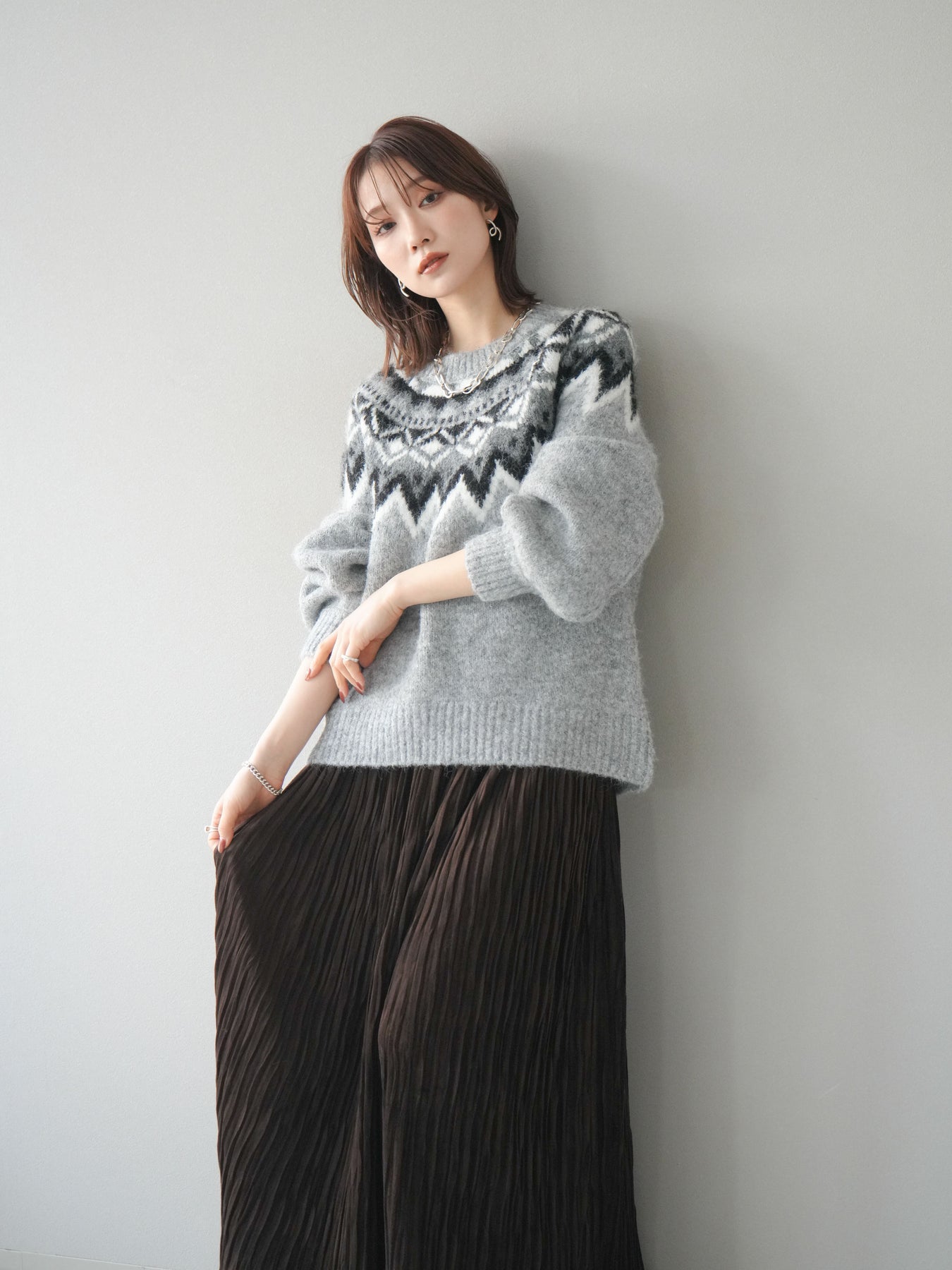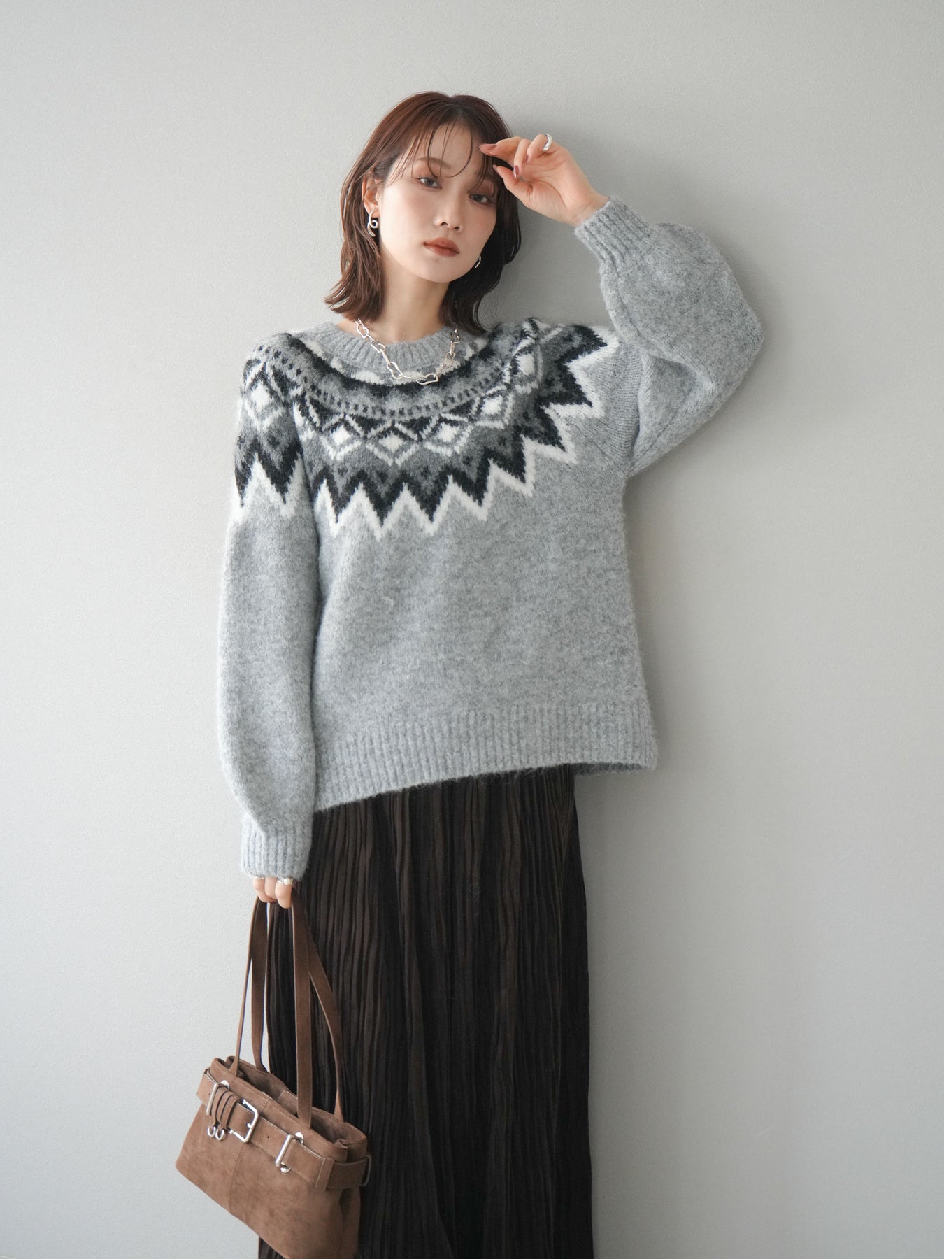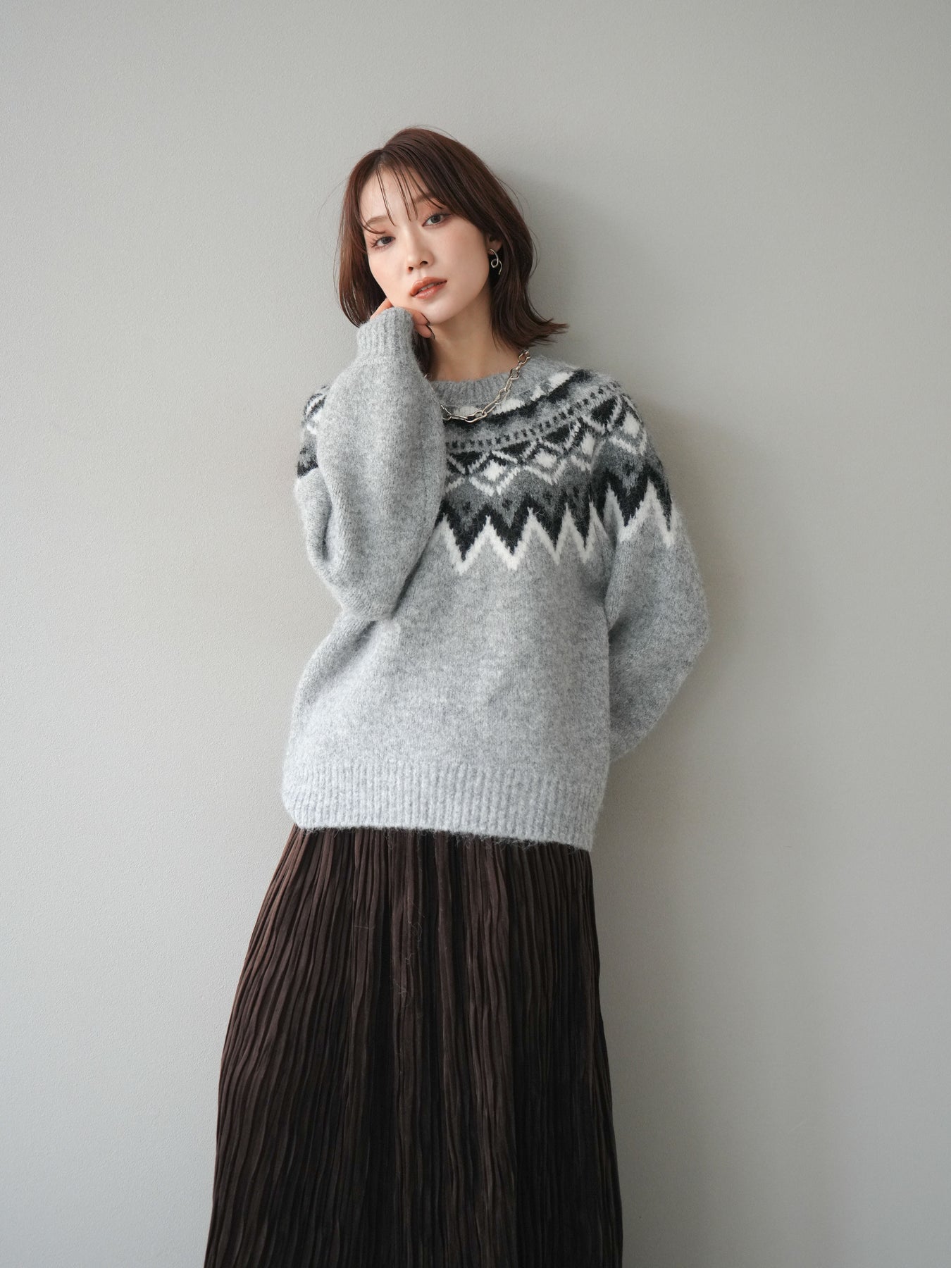 シーズンムードを高める求心柄デザインが目を惹くニットプルオーバー。 程よく肉厚で柔らかな風合いのニット素材を使用し、暖かさと着心地の良さを兼ね備えています。 首元をすっきりと見せるクルーネックと、ゆったりとしたオーバーシルエットが抜け感を演出。 1枚で存在感がありながらも、アウターのインにも映えるバランスの取れたデザインです。 デニムやスカートを合わせて、カジュアルにもフェミニンにも着こなせる万能アイテムです。 ※ボトムス、キャミソール(インナー)以外の商品は一律でインナーは付属していません。