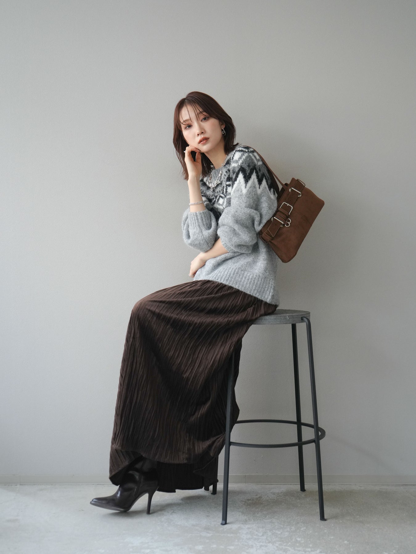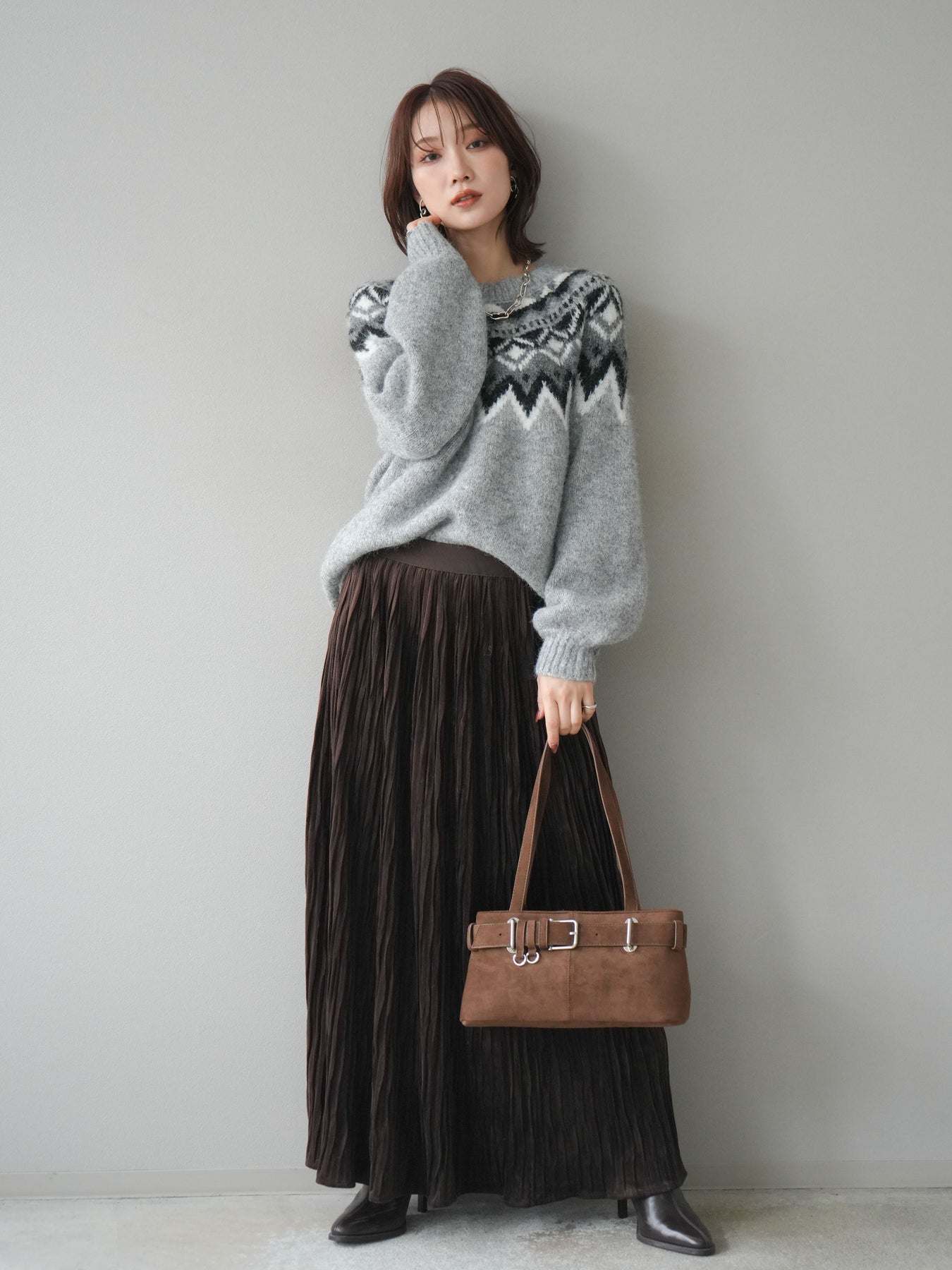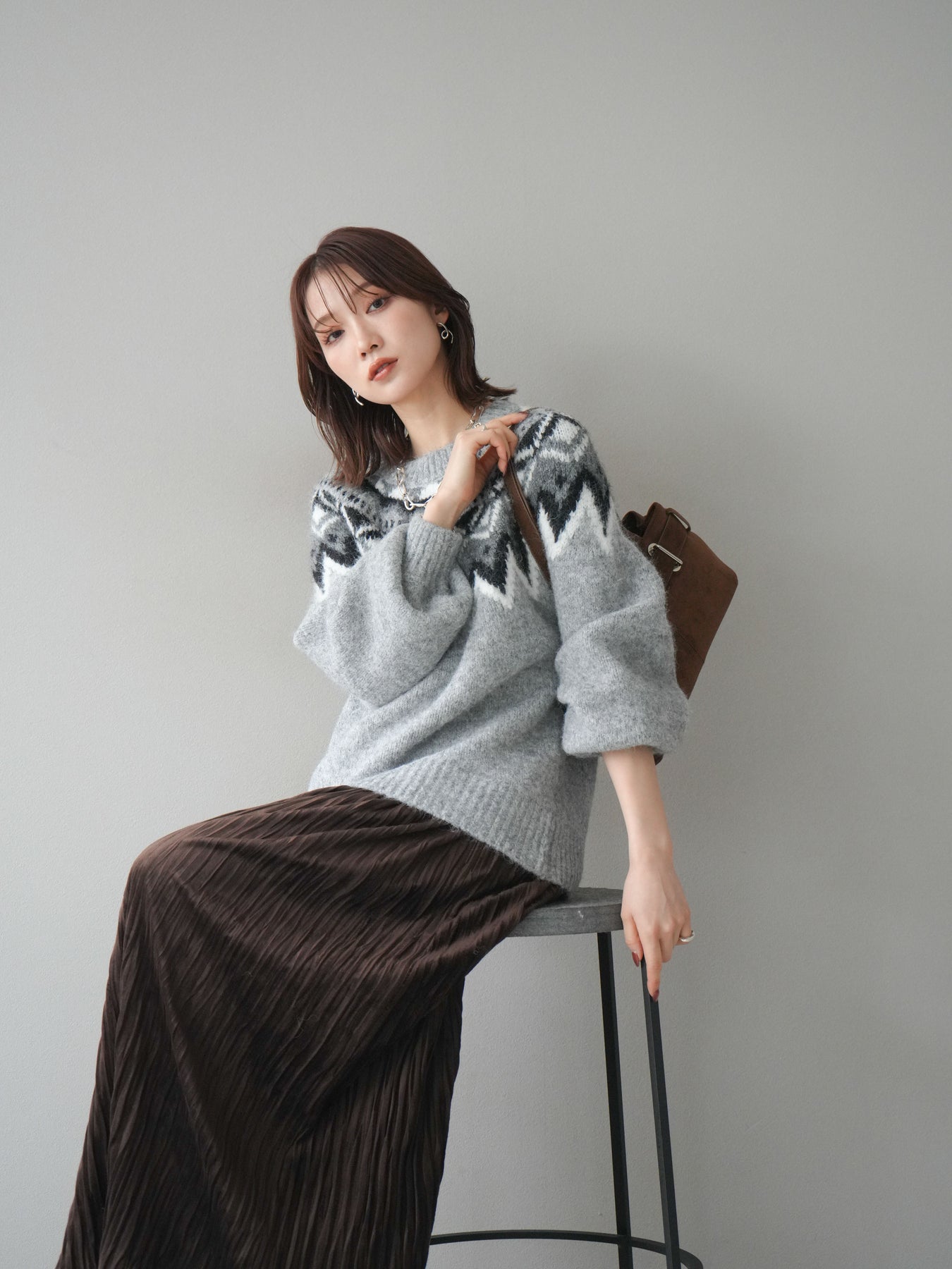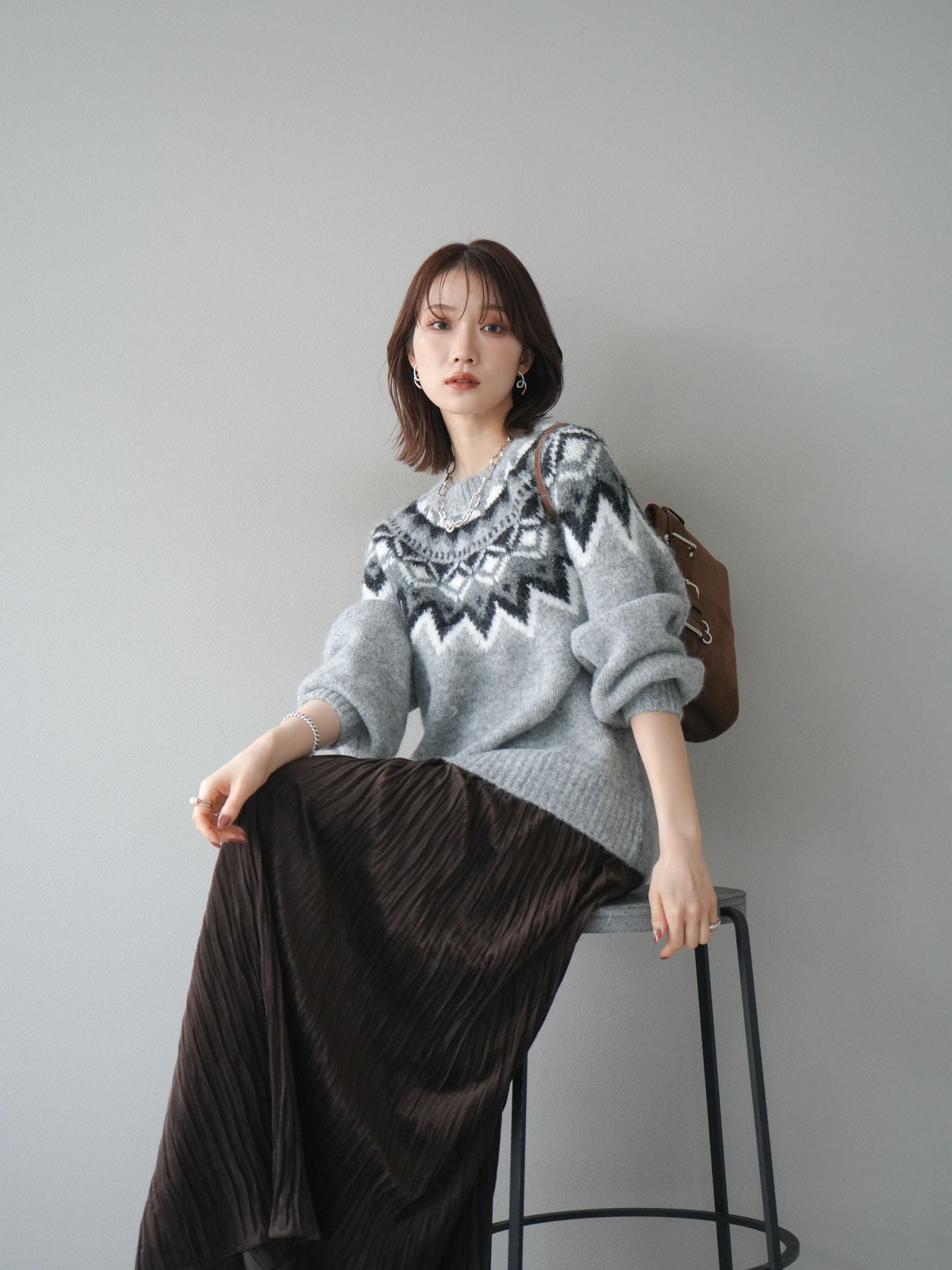 シーズンムードを高める求心柄デザインが目を惹くニットプルオーバー。 程よく肉厚で柔らかな風合いのニット素材を使用し、暖かさと着心地の良さを兼ね備えています。 首元をすっきりと見せるクルーネックと、ゆったりとしたオーバーシルエットが抜け感を演出。 1枚で存在感がありながらも、アウターのインにも映えるバランスの取れたデザインです。 デニムやスカートを合わせて、カジュアルにもフェミニンにも着こなせる万能アイテムです。 ※ボトムス、キャミソール(インナー)以外の商品は一律でインナーは付属していません。