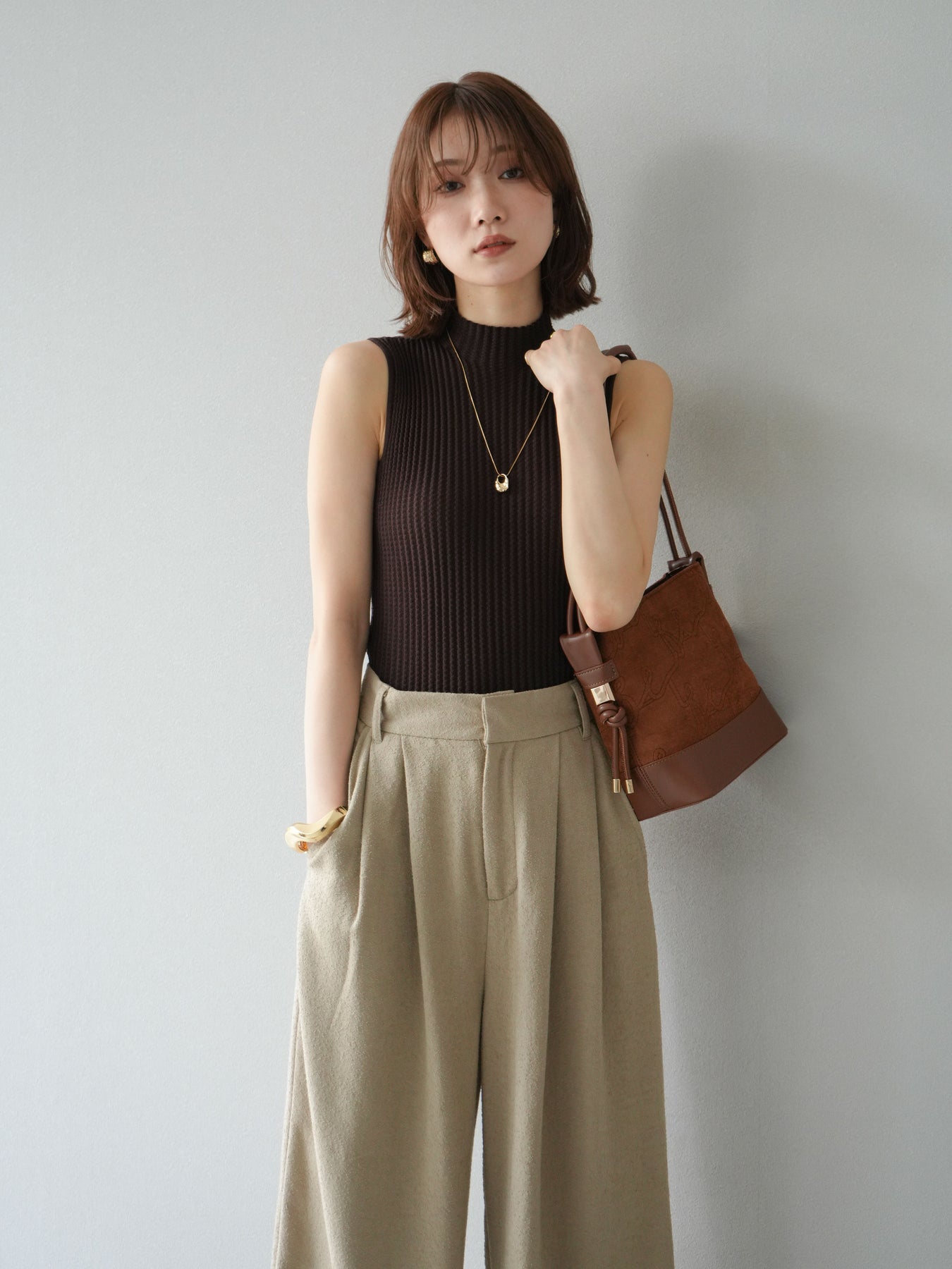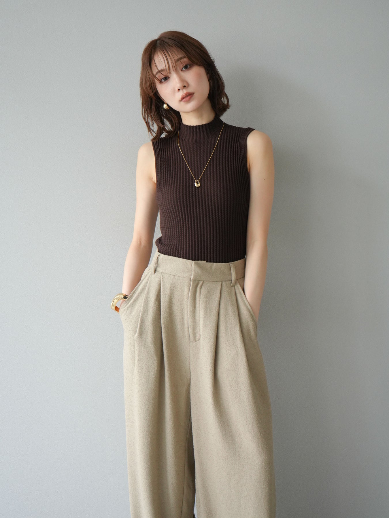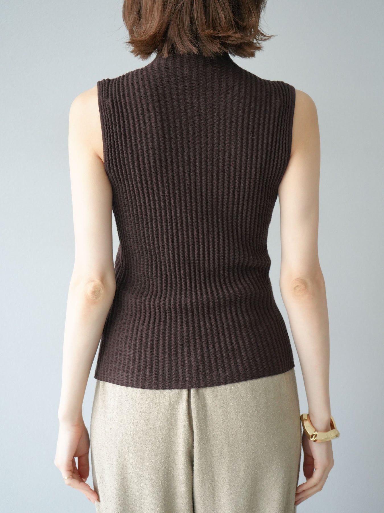 [予約]ボトルネックワッフル編みノースリーブニットトップスに関連する商品を探す↓