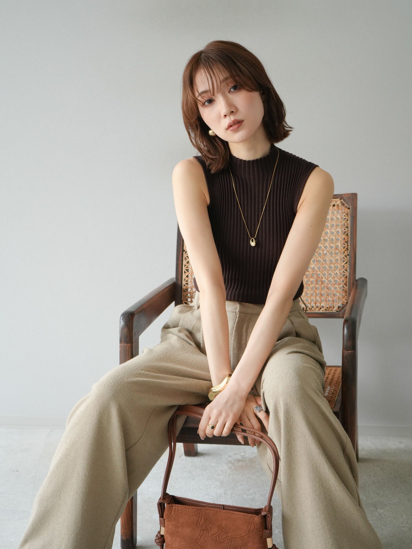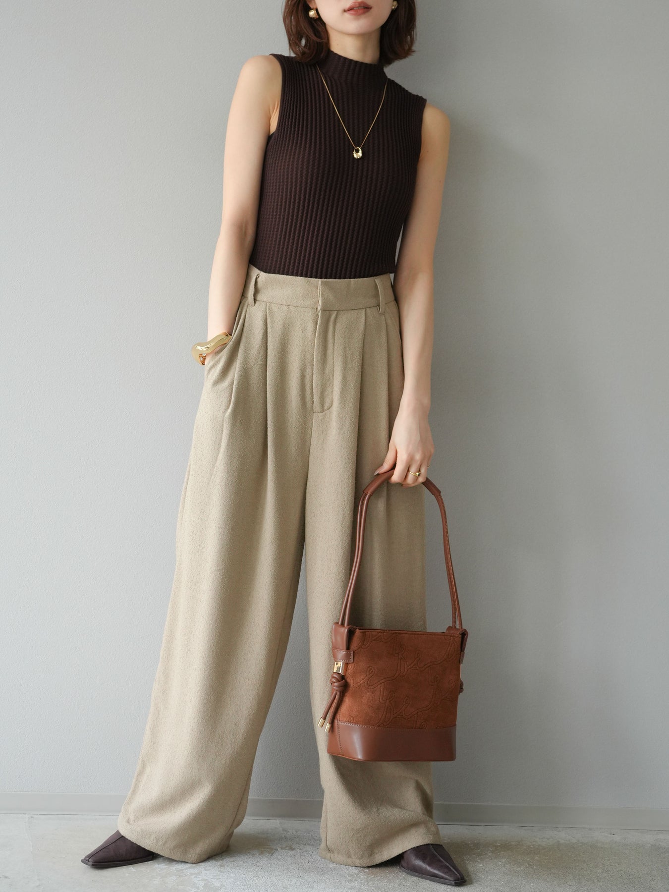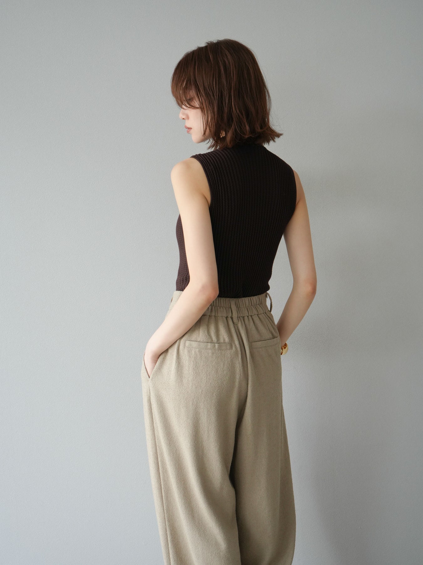 [予約]ボトルネックワッフル編みノースリーブニットトップスに関連する商品を探す↓