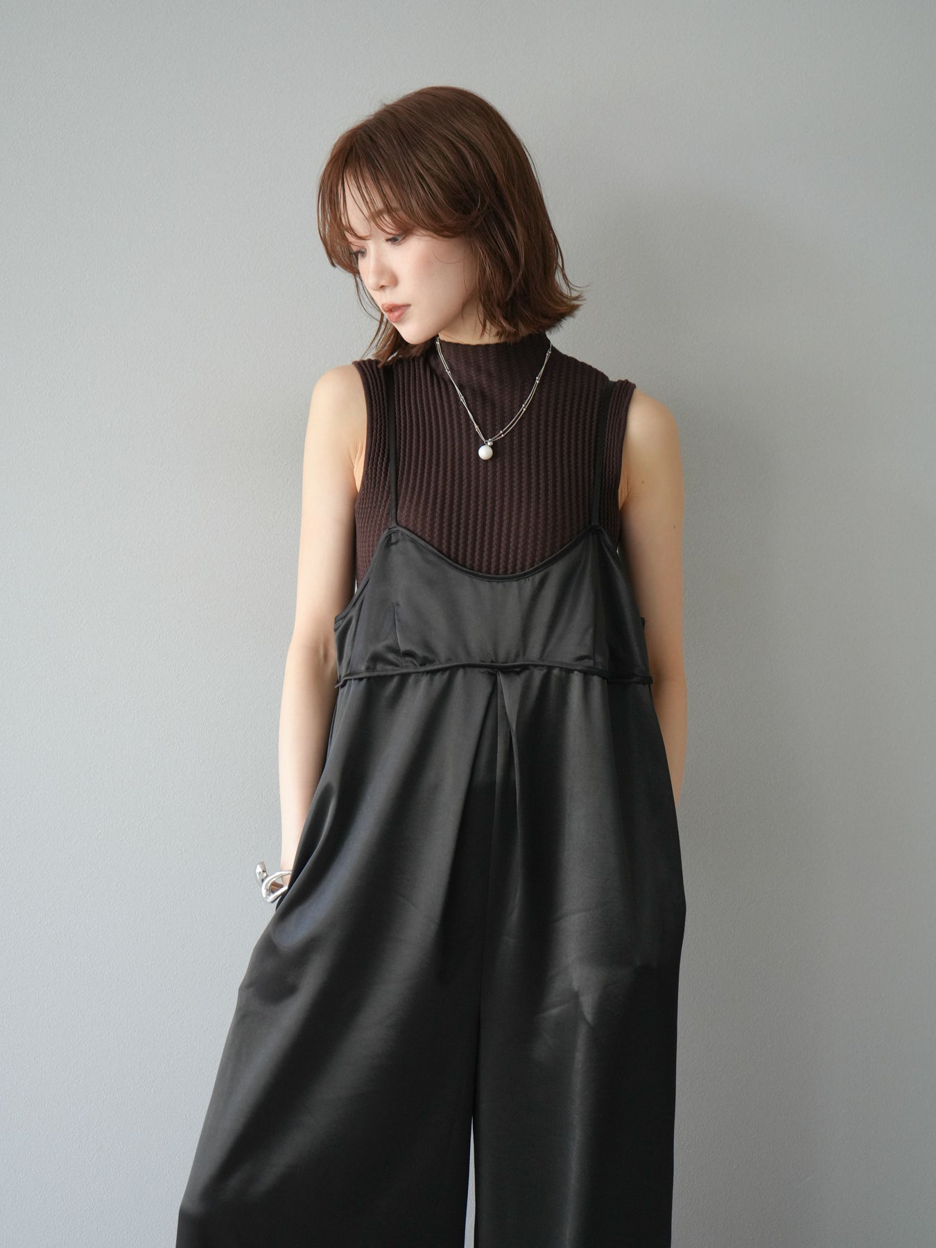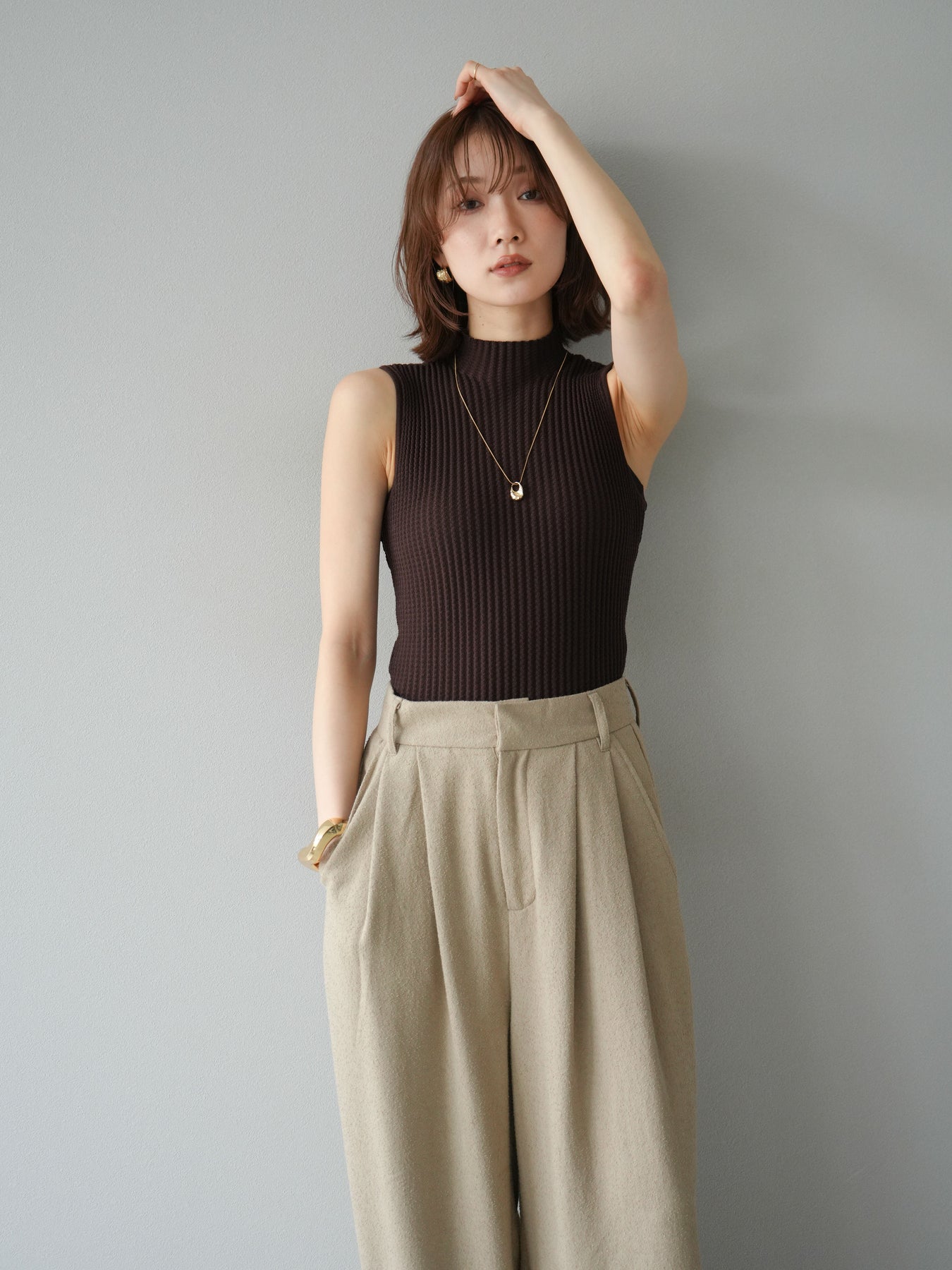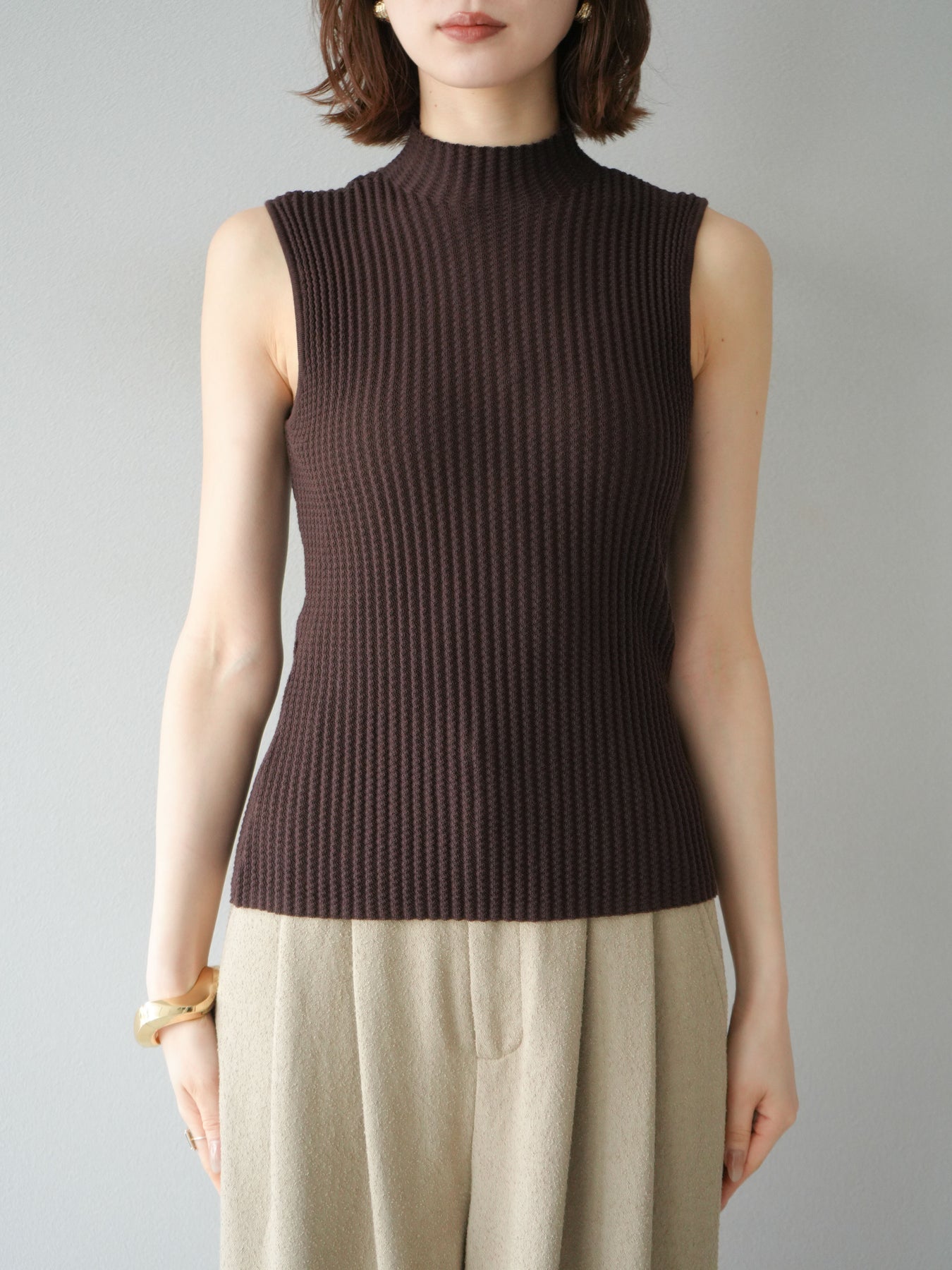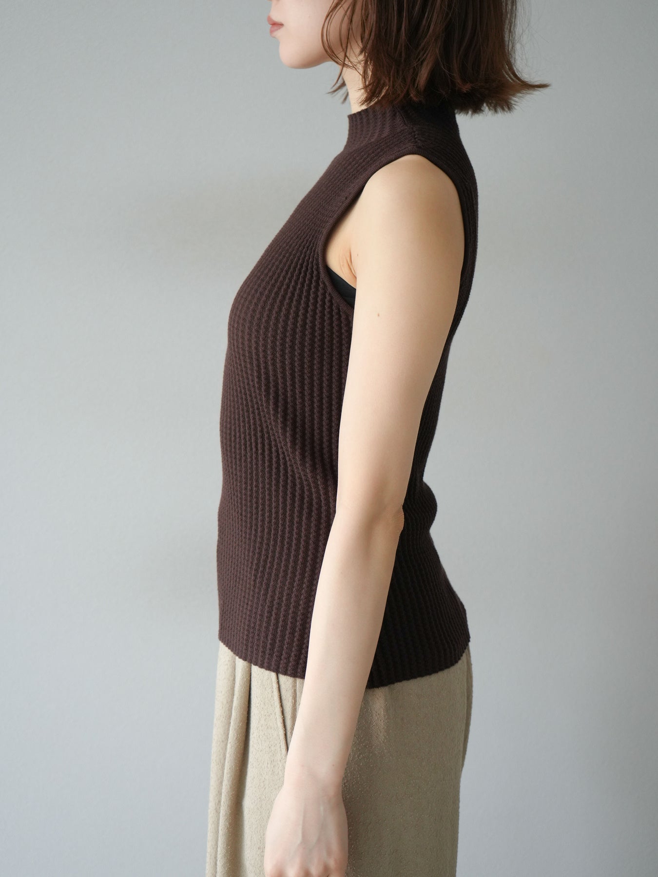 立体感のあるワッフル編みが特徴的なノースリーブニットトップス。程よく厚みのある生地感でシルエットをきれいに保ちつつ、伸縮性があり快適な着心地を叶えます。首元はボトルネック仕様で上品な印象をプラスし、1枚での着用はもちろん、ジャケットやカーディガンのインナーとしても重宝。コンパクトな丈感でボトムスを選ばず、パンツにもスカートにも合わせやすい万能なデザインです。シンプルながらも素材感で差をつけられる、デイリーに活躍するアイテムです。 ※ボトムス、キャミソール(インナー)以外の商品は一律でインナーは付属していません。