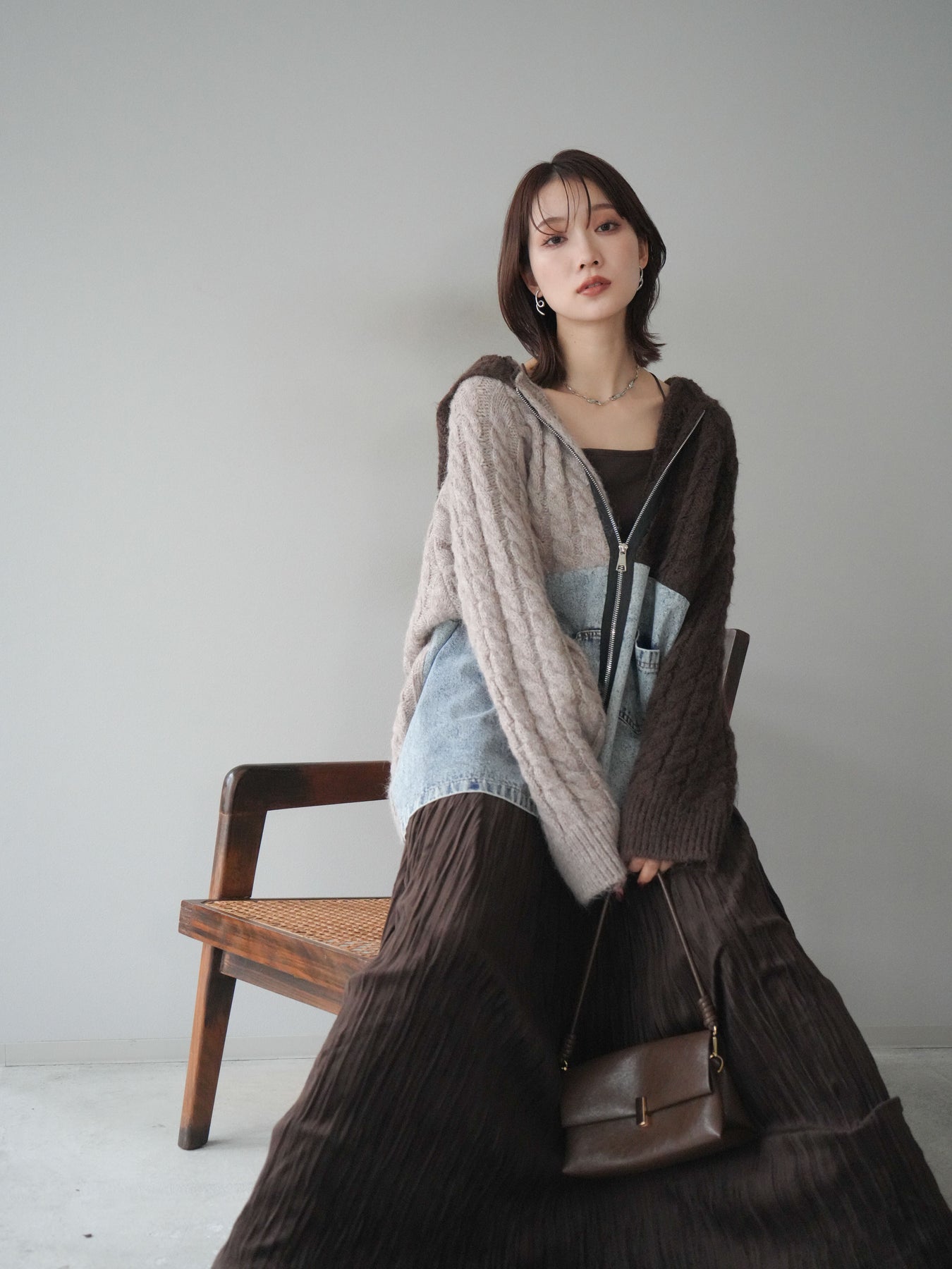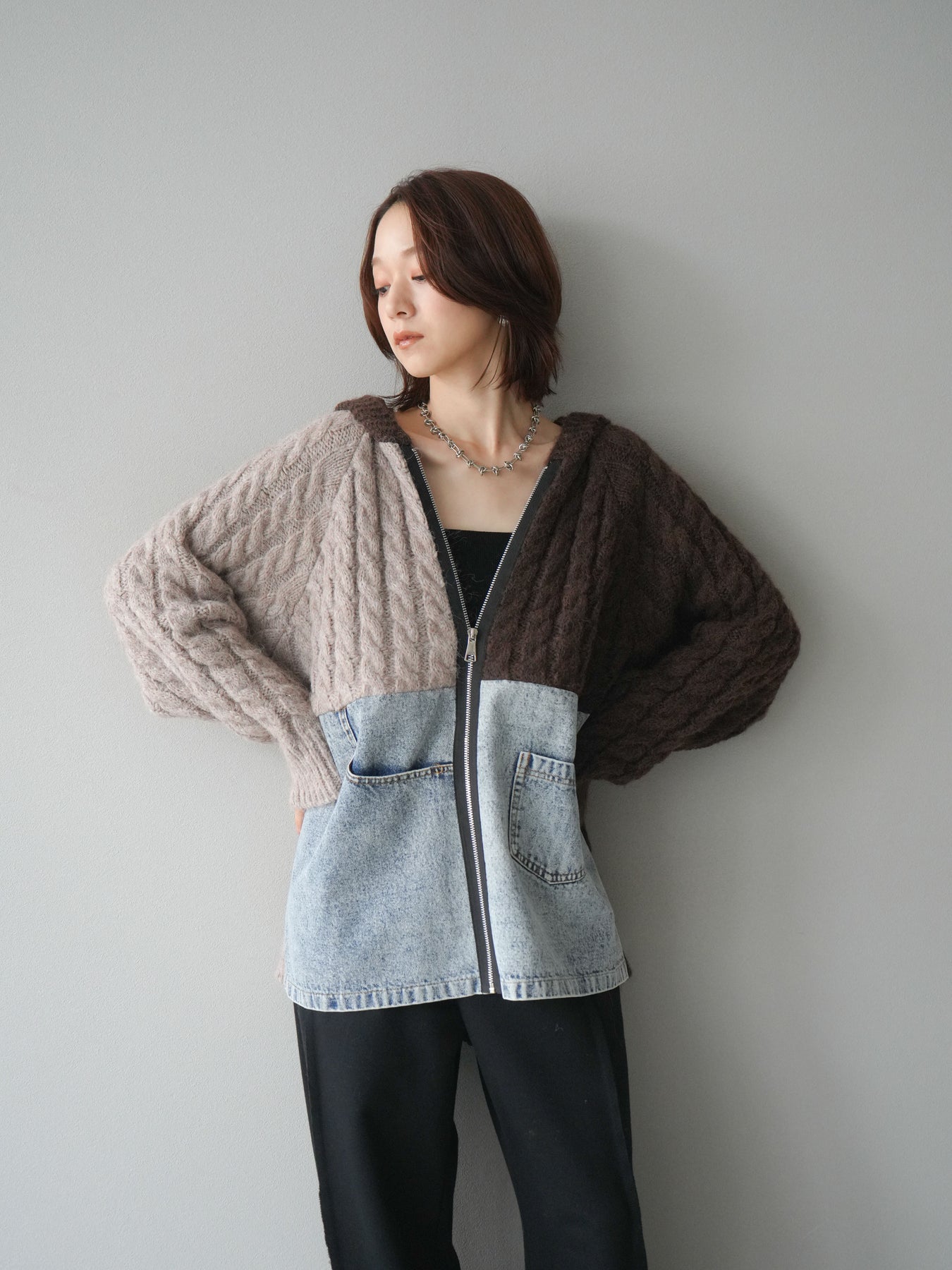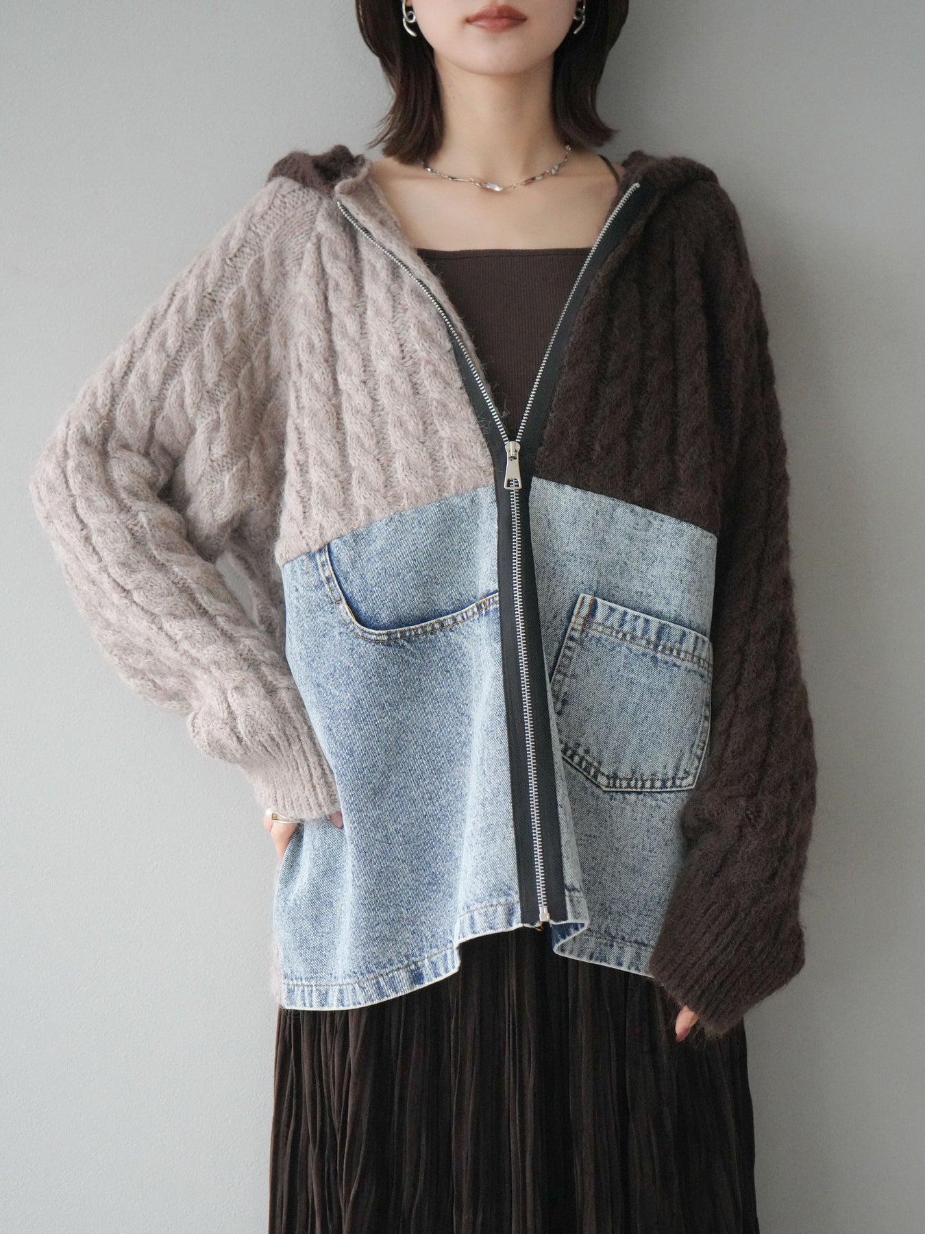 [予約]デニム×バイカラーニットZIPフーディ/brown