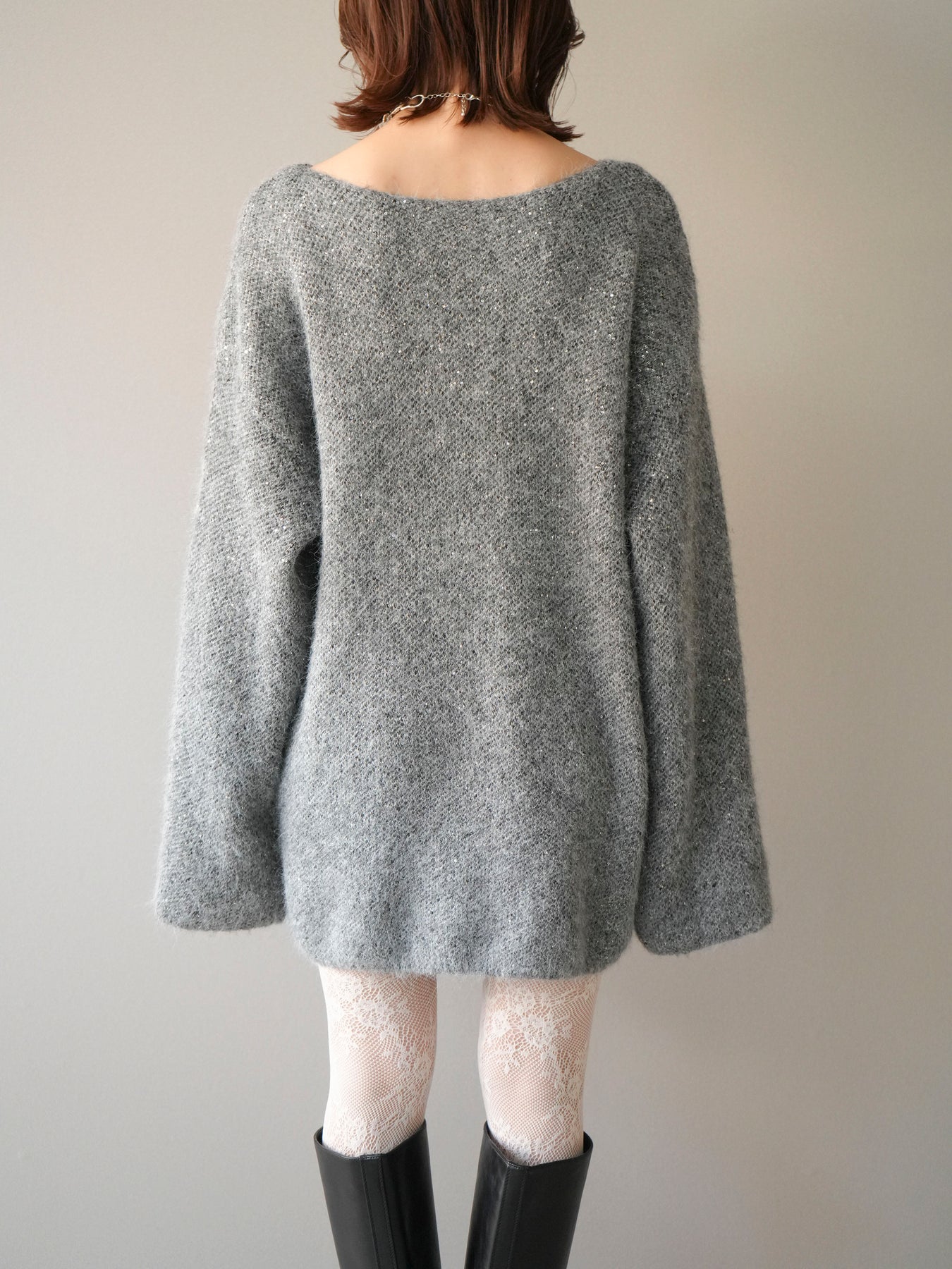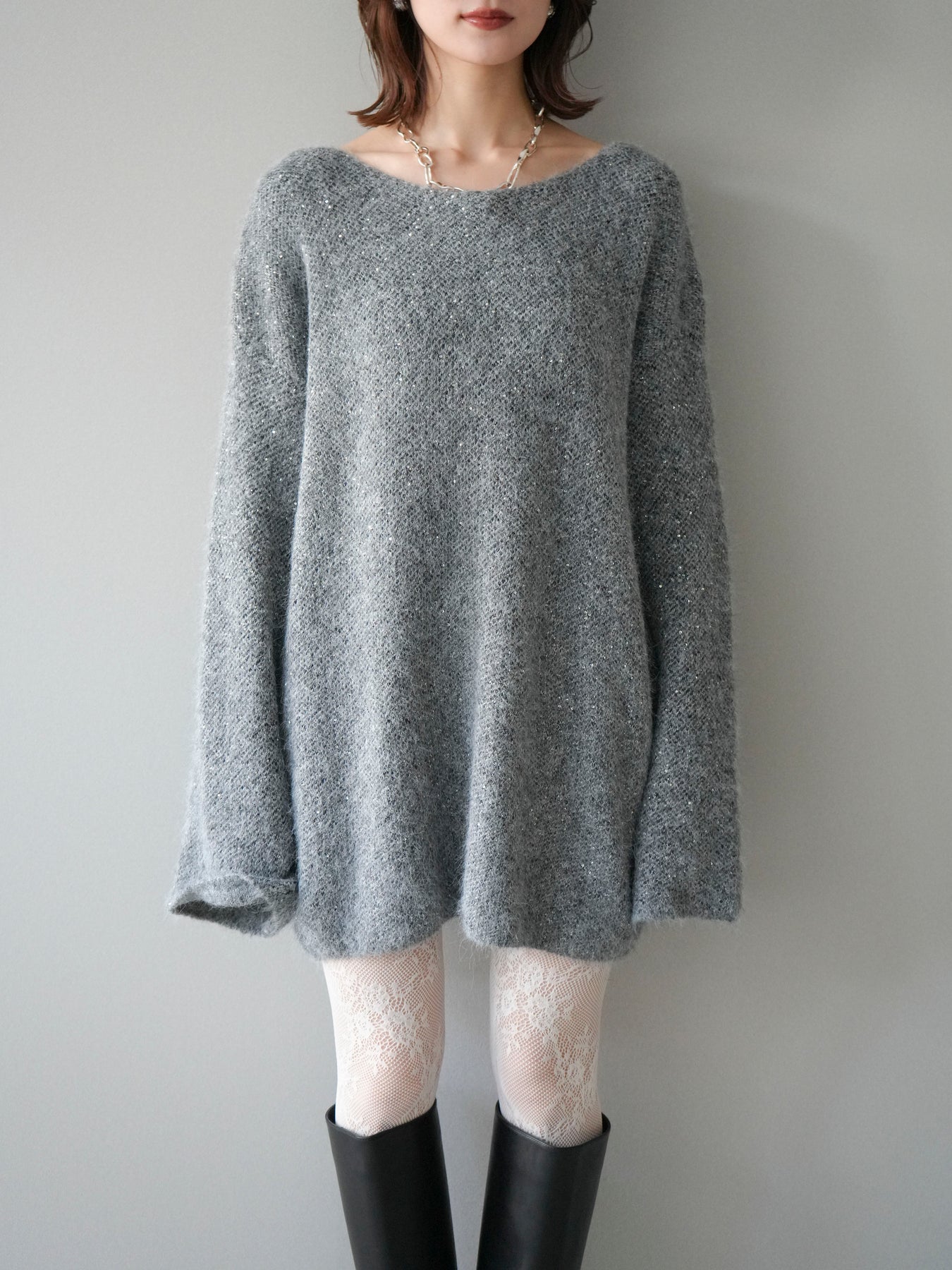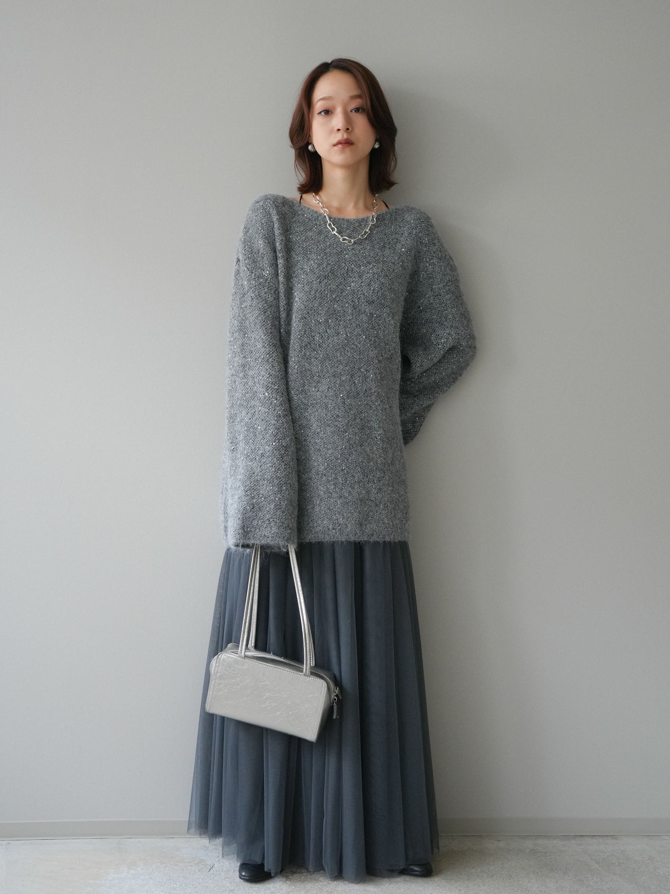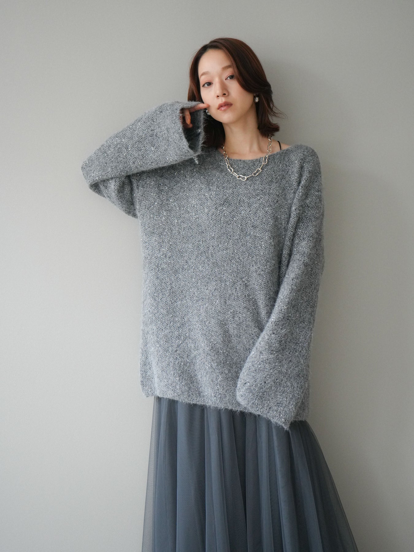 ふんわりとしたミニシャギー素材にスパンコールを散りばめた、華やかなニットチュニック。 角度によってきらめく繊細な輝きが、女性らしいムードを引き立てます。 ゆとりのあるシルエットとやわらかな風合いで、リラックス感のある着心地に。 デニムやスカートと合わせるだけで、上品さと抜け感を兼ね備えたスタイリングが完成します。 シーズンの主役になる、ラグジュアリーな印象のニットトップスです。