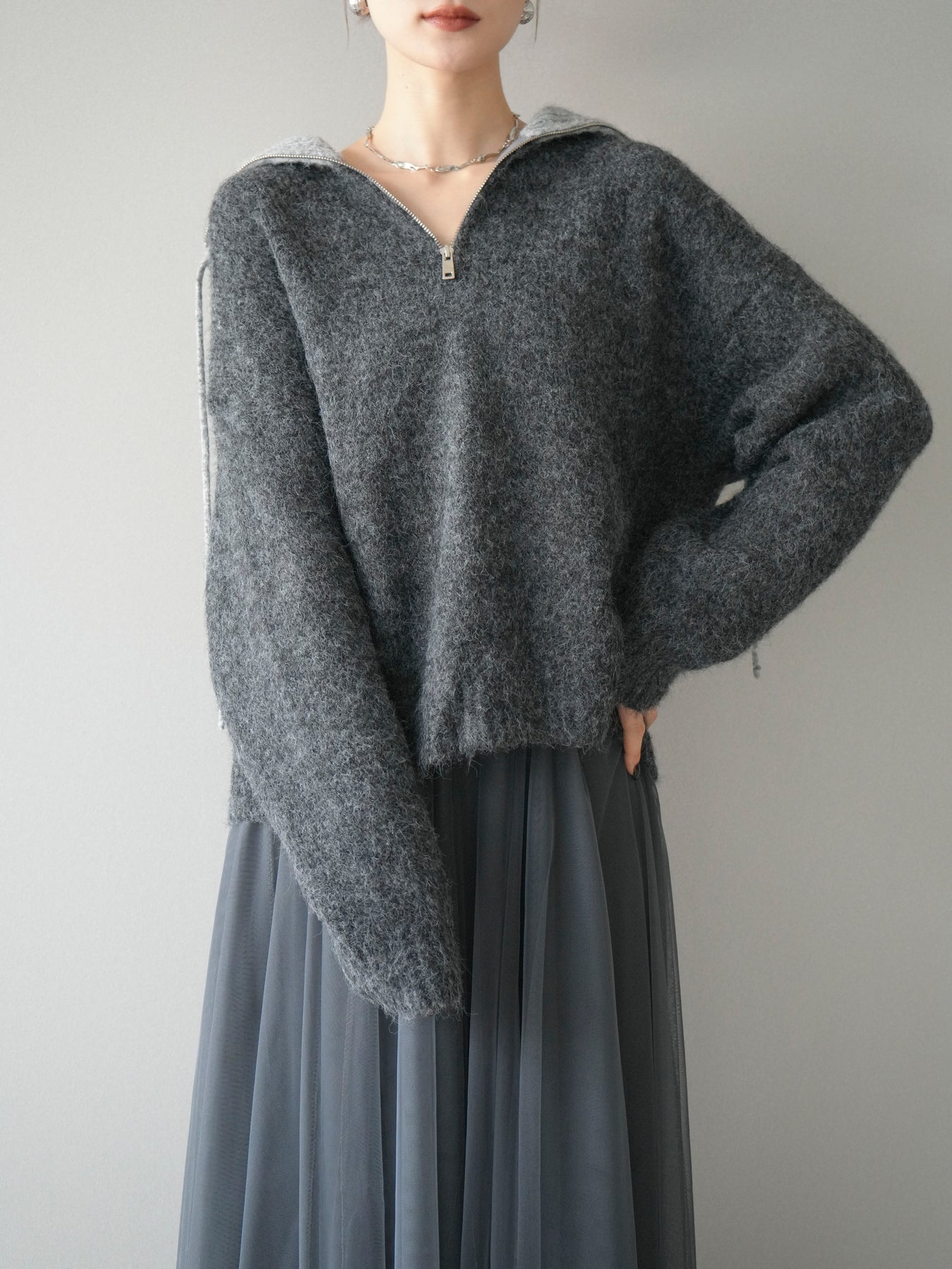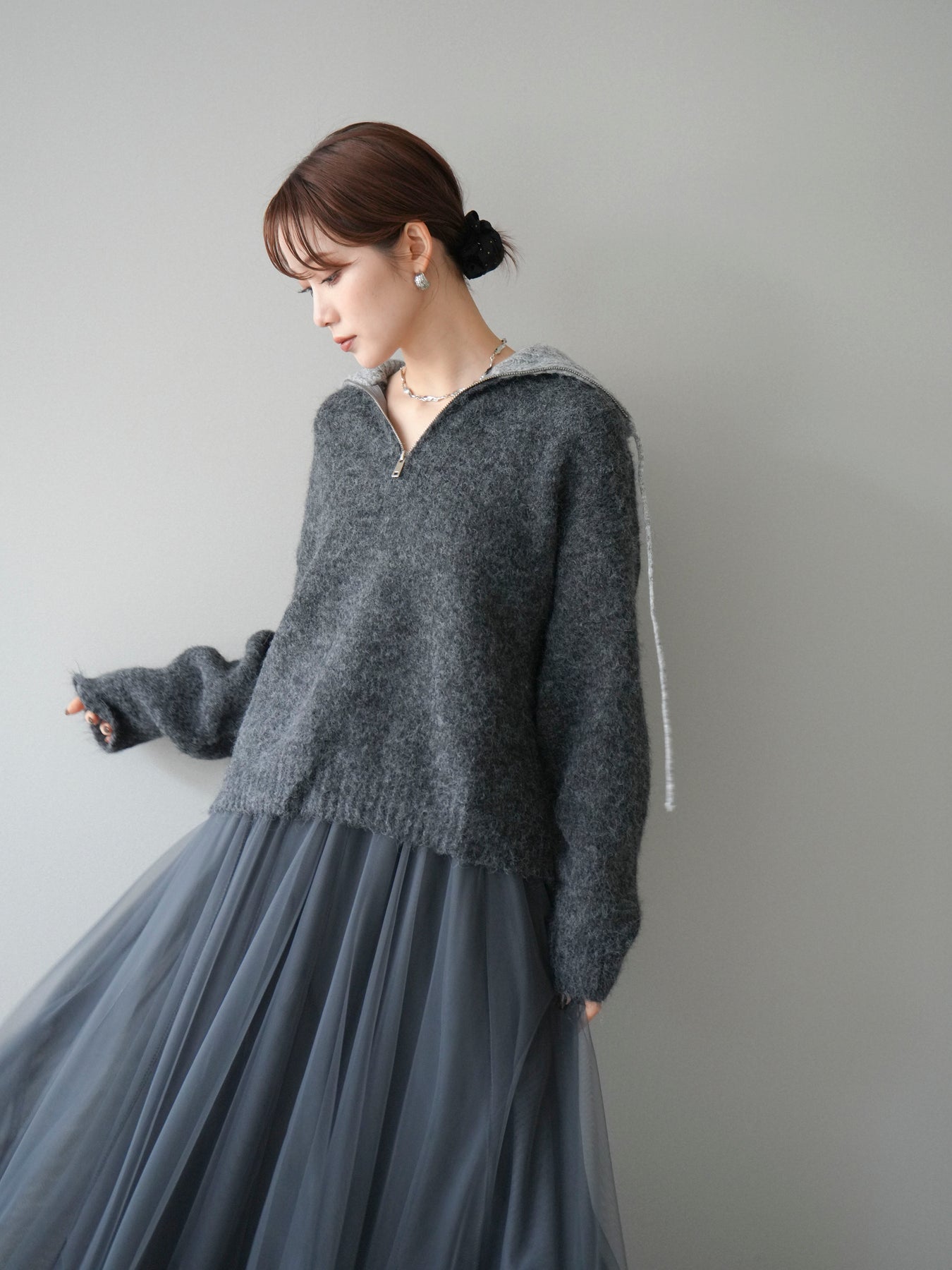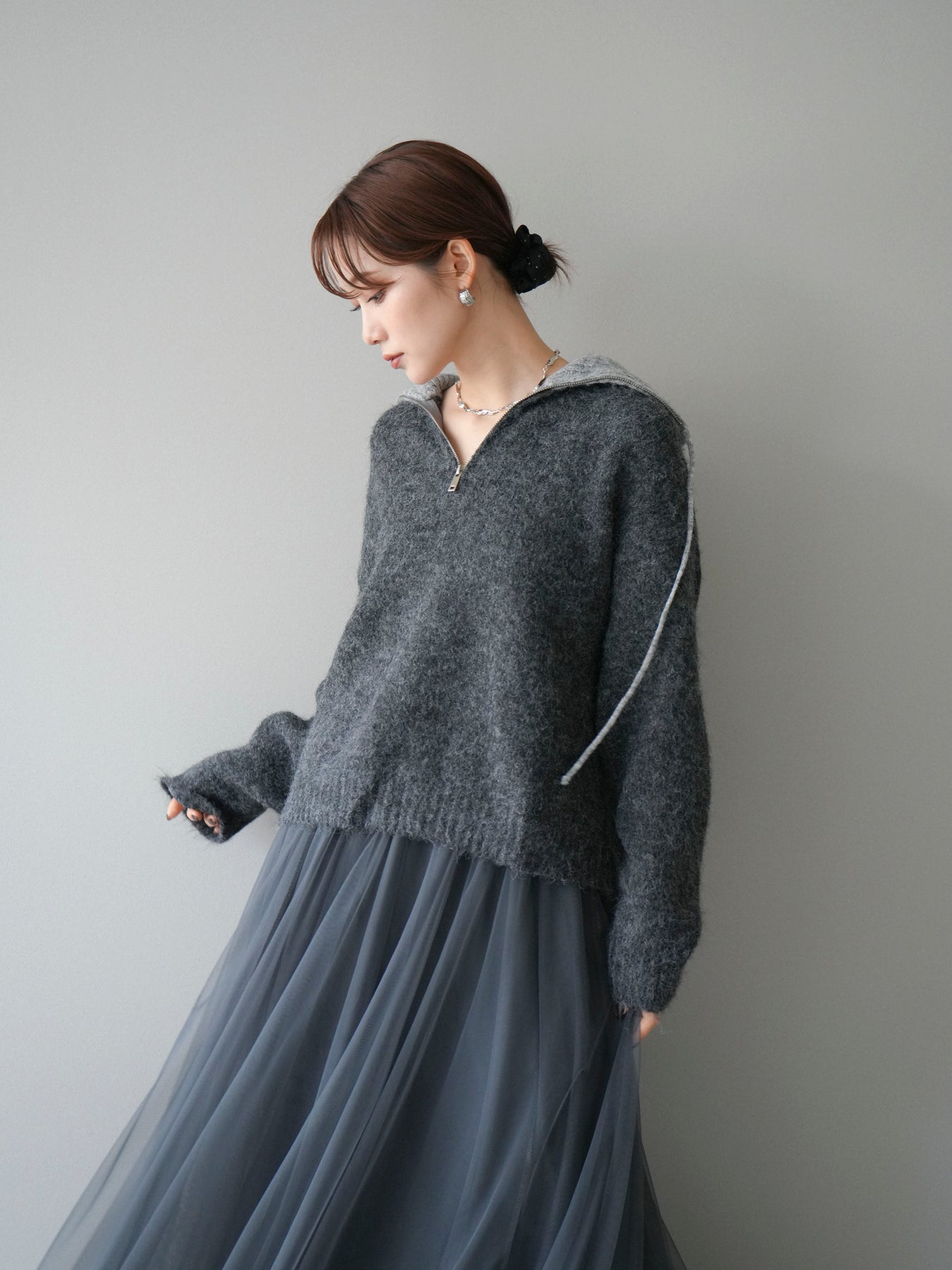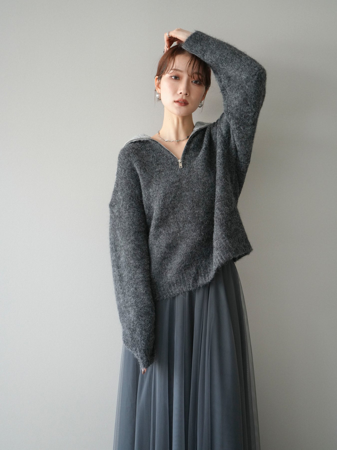 ふんわりとした風合いのニットに、バイカラーの襟元デザインが映えるジッププルオーバー。 ジップの開け閉めで首元の印象を変えられ、抜け感のある着こなしも楽しめます。 柔らかく肌触りの良い素材で、軽やかな着心地ながら暖かさも兼ね備えた一枚。 カジュアルにもきれいめにもマッチし、デニムやスカートなど幅広いアイテムと相性抜群です。 程よいボリュームシルエットがシーズンムードを高める、主役級のニットプルオーバーです。 ※ボトムス、キャミソール(インナー)以外の商品は一律でインナーは付属していません。