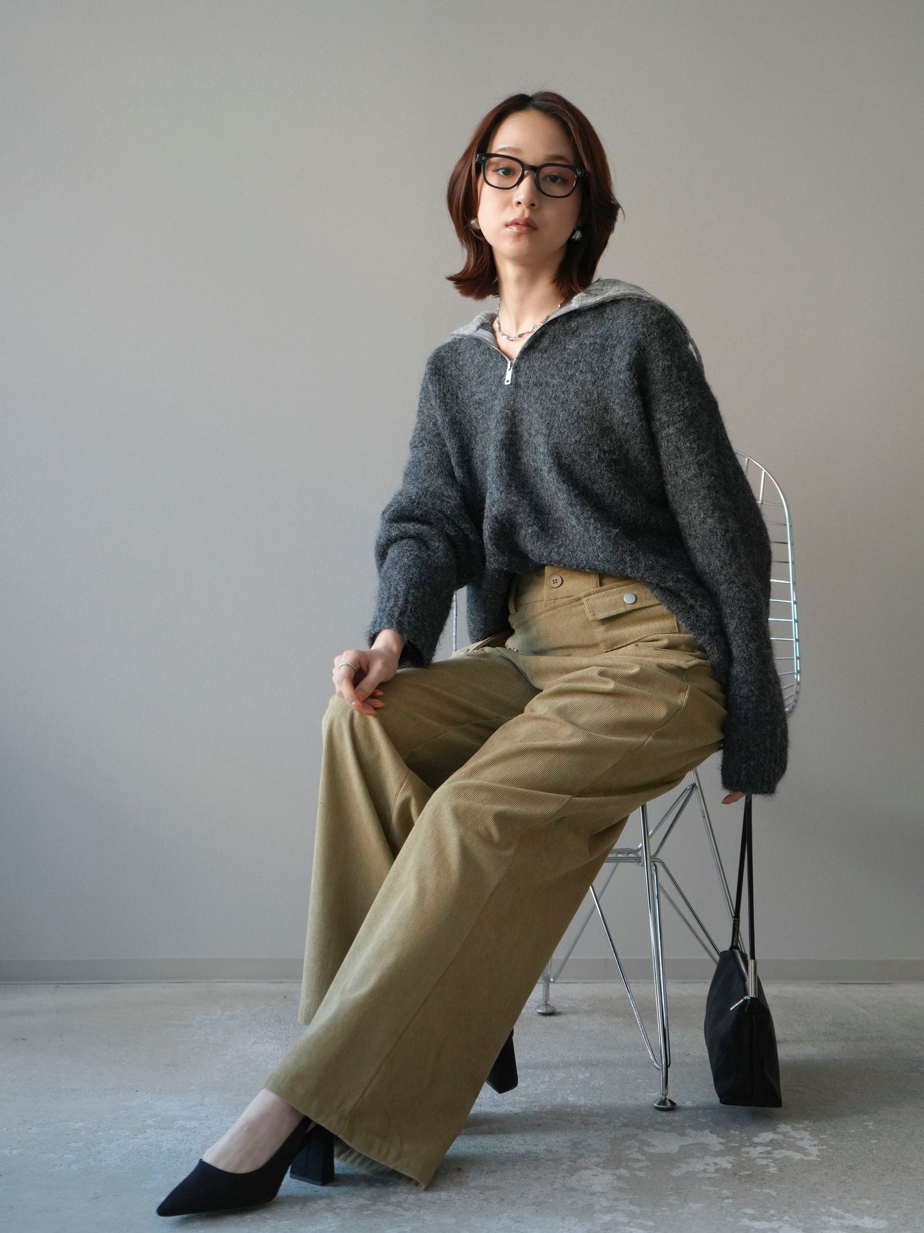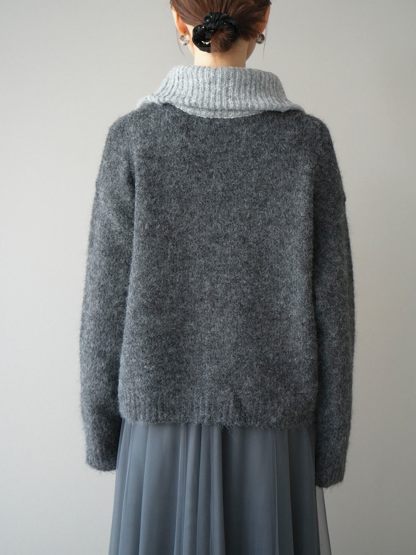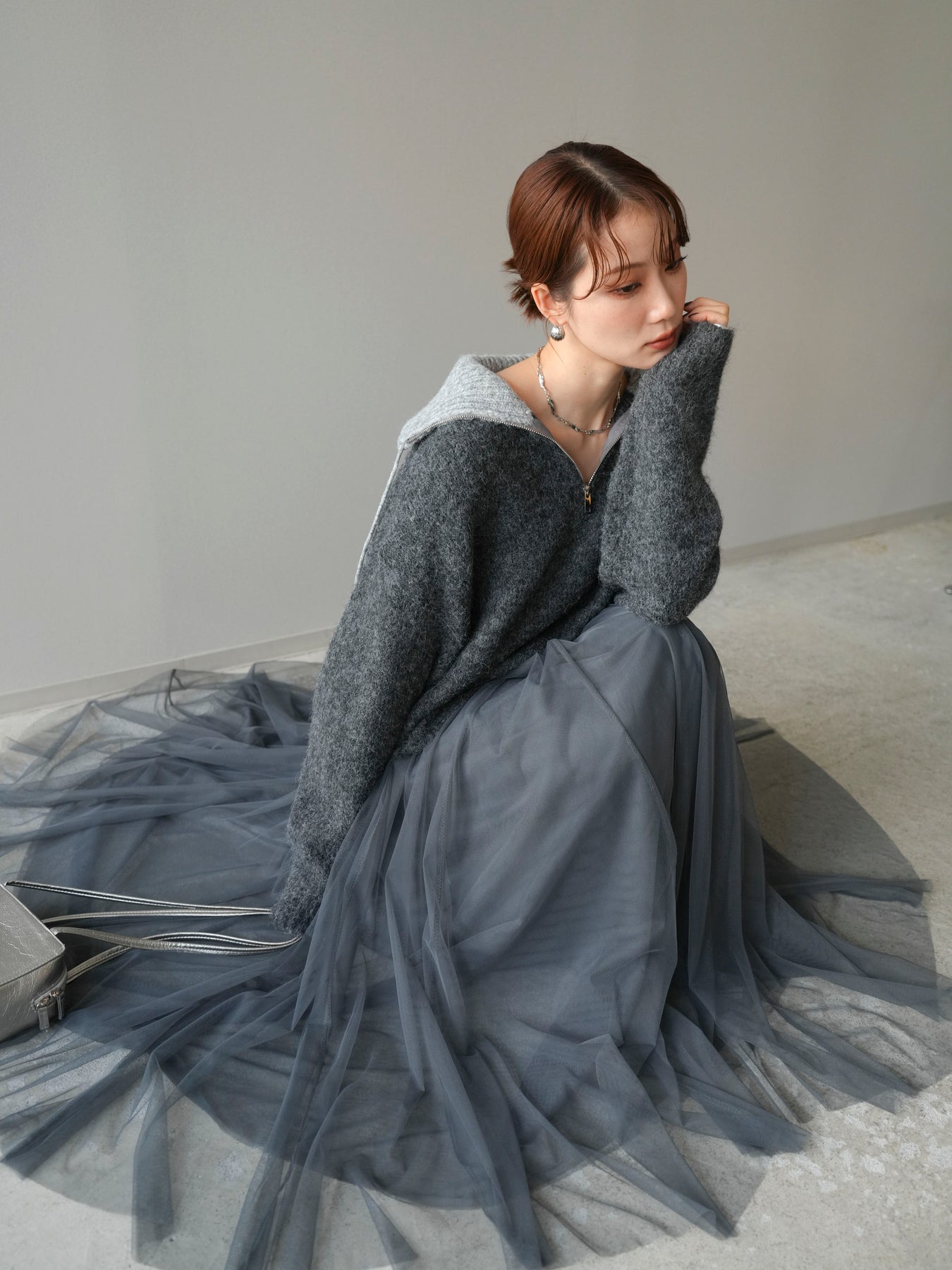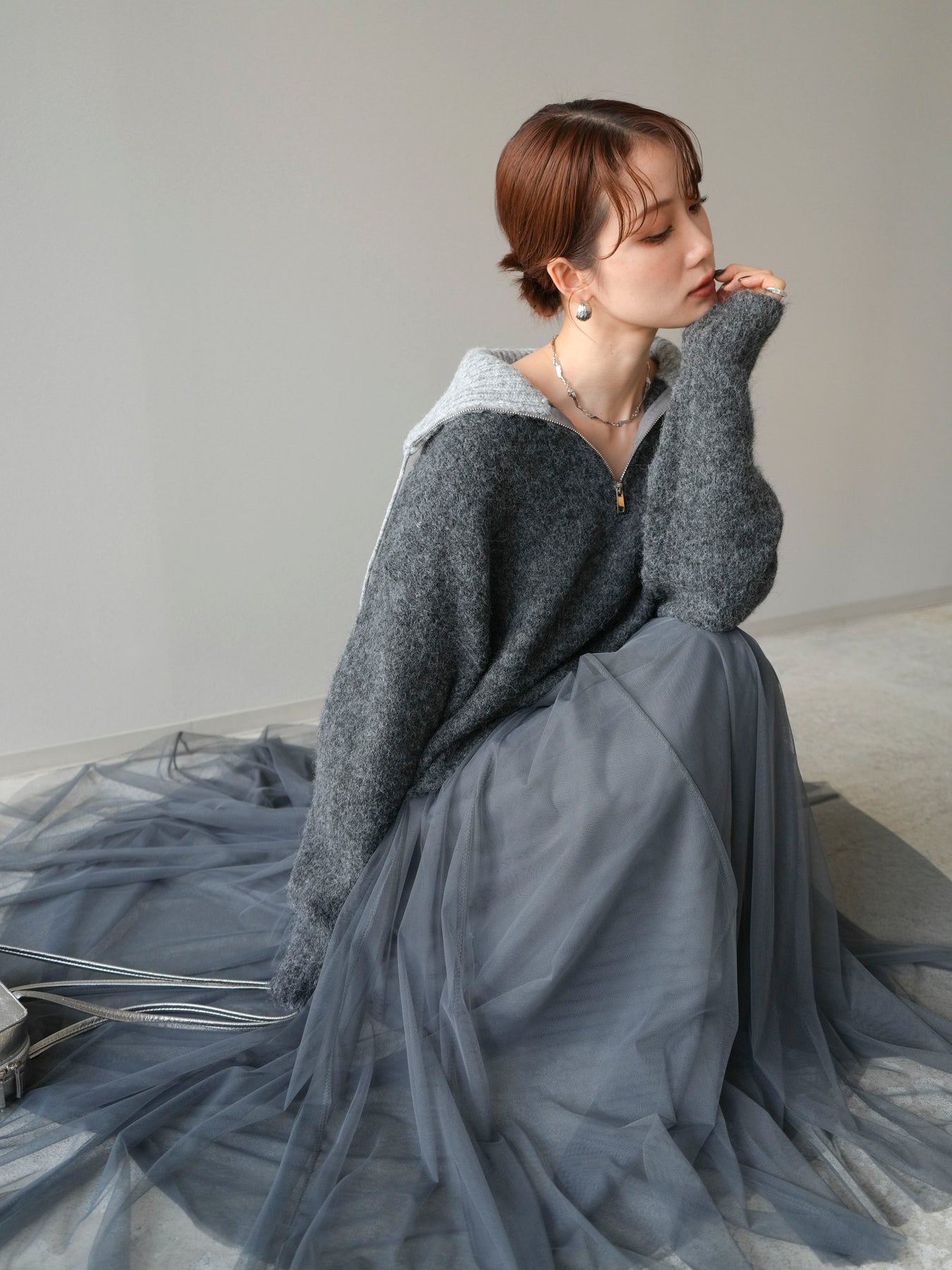 ふんわりとした風合いのニットに、バイカラーの襟元デザインが映えるジッププルオーバー。 ジップの開け閉めで首元の印象を変えられ、抜け感のある着こなしも楽しめます。 柔らかく肌触りの良い素材で、軽やかな着心地ながら暖かさも兼ね備えた一枚。 カジュアルにもきれいめにもマッチし、デニムやスカートなど幅広いアイテムと相性抜群です。 程よいボリュームシルエットがシーズンムードを高める、主役級のニットプルオーバーです。 ※ボトムス、キャミソール(インナー)以外の商品は一律でインナーは付属していません。