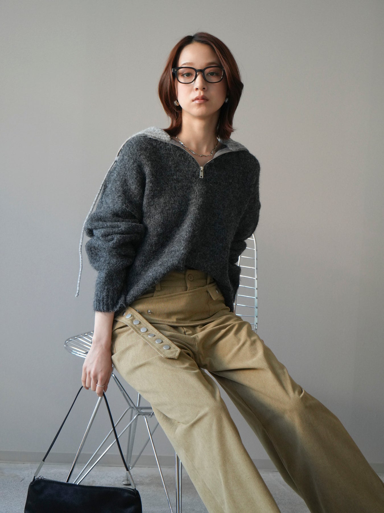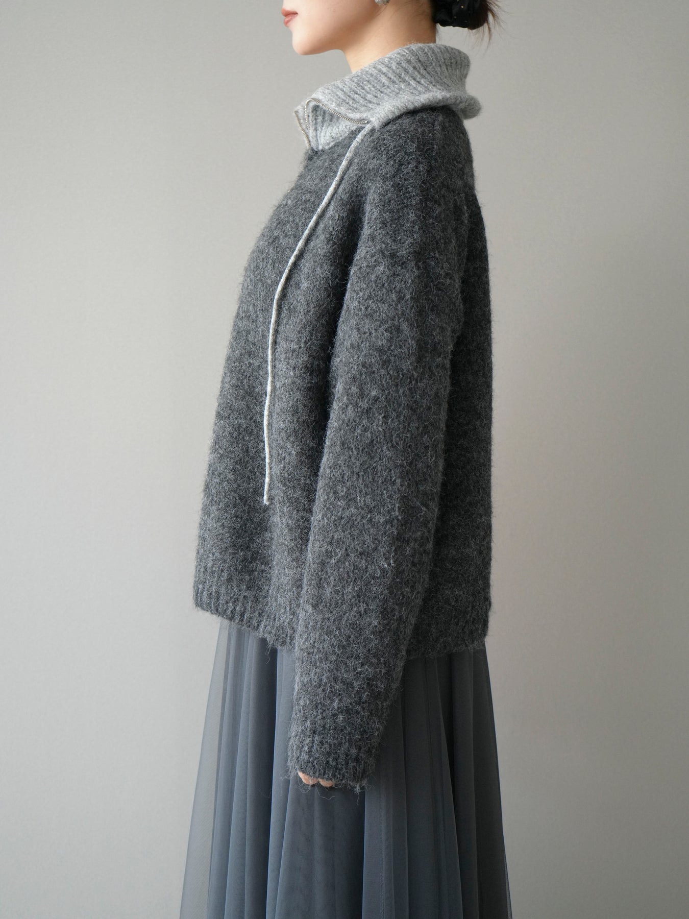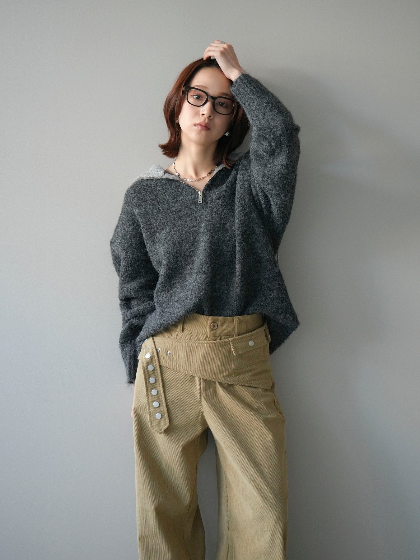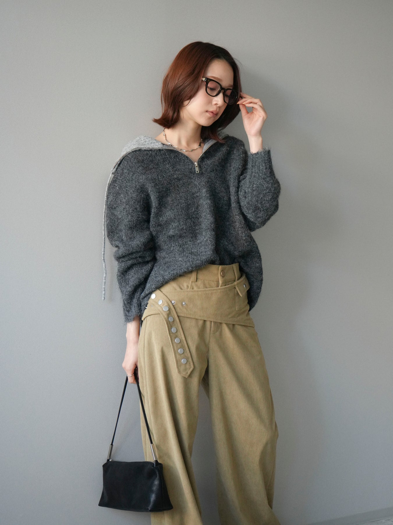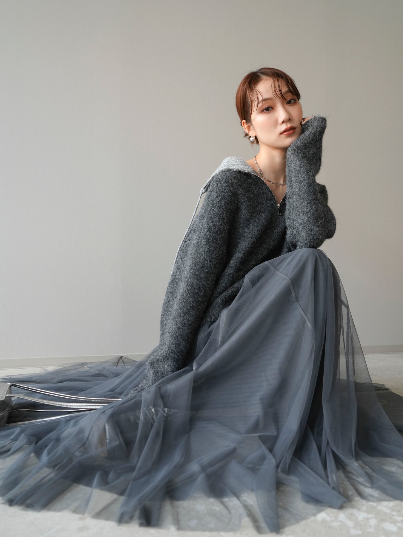 ふんわりとした風合いのニットに、バイカラーの襟元デザインが映えるジッププルオーバー。 ジップの開け閉めで首元の印象を変えられ、抜け感のある着こなしも楽しめます。 柔らかく肌触りの良い素材で、軽やかな着心地ながら暖かさも兼ね備えた一枚。 カジュアルにもきれいめにもマッチし、デニムやスカートなど幅広いアイテムと相性抜群です。 程よいボリュームシルエットがシーズンムードを高める、主役級のニットプルオーバーです。 ※ボトムス、キャミソール(インナー)以外の商品は一律でインナーは付属していません。