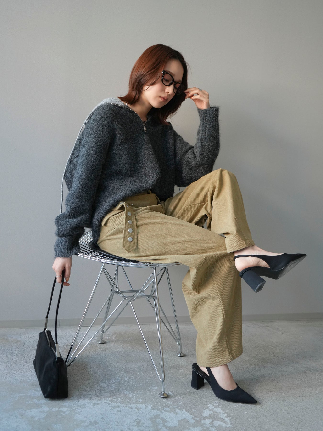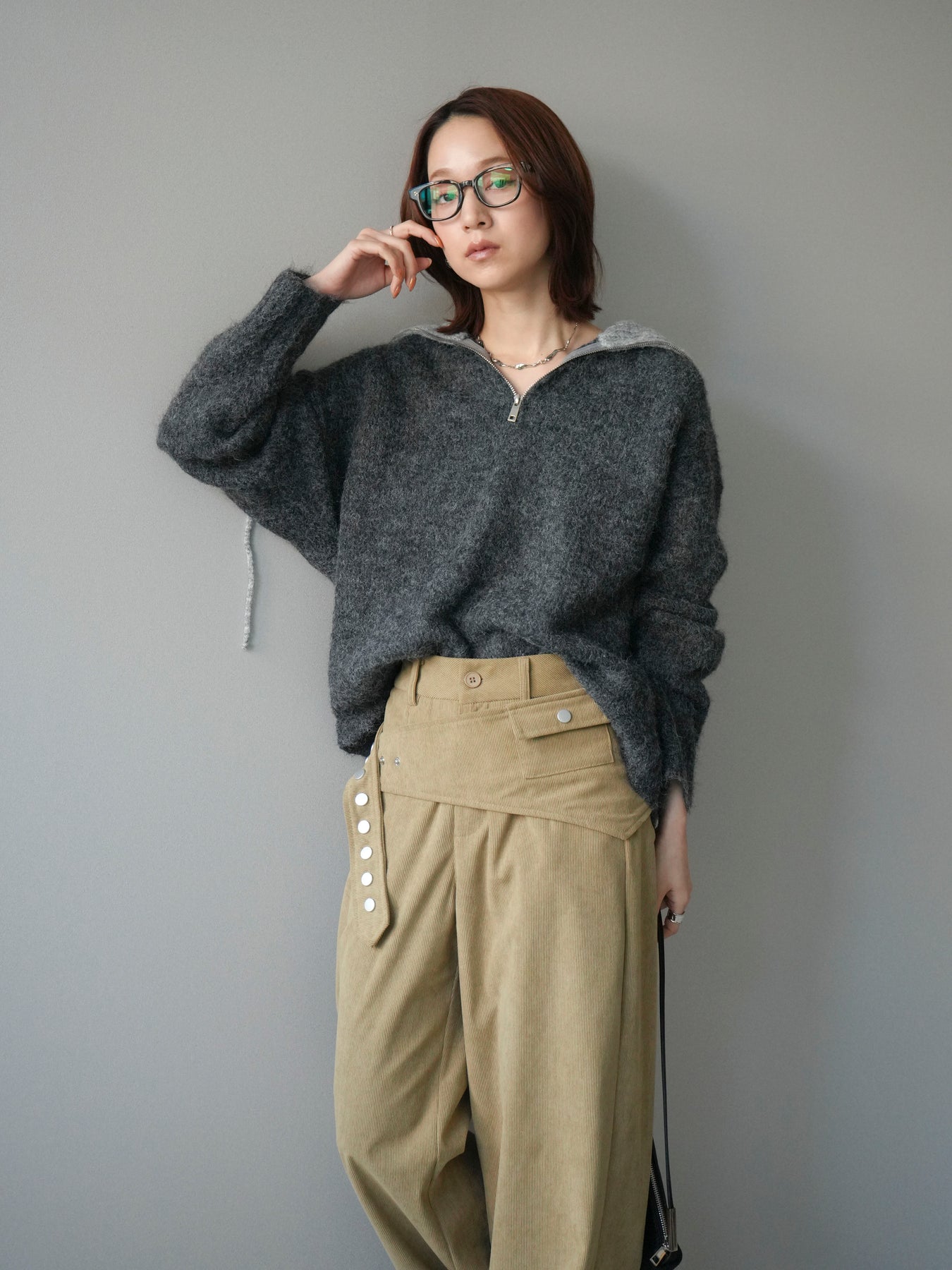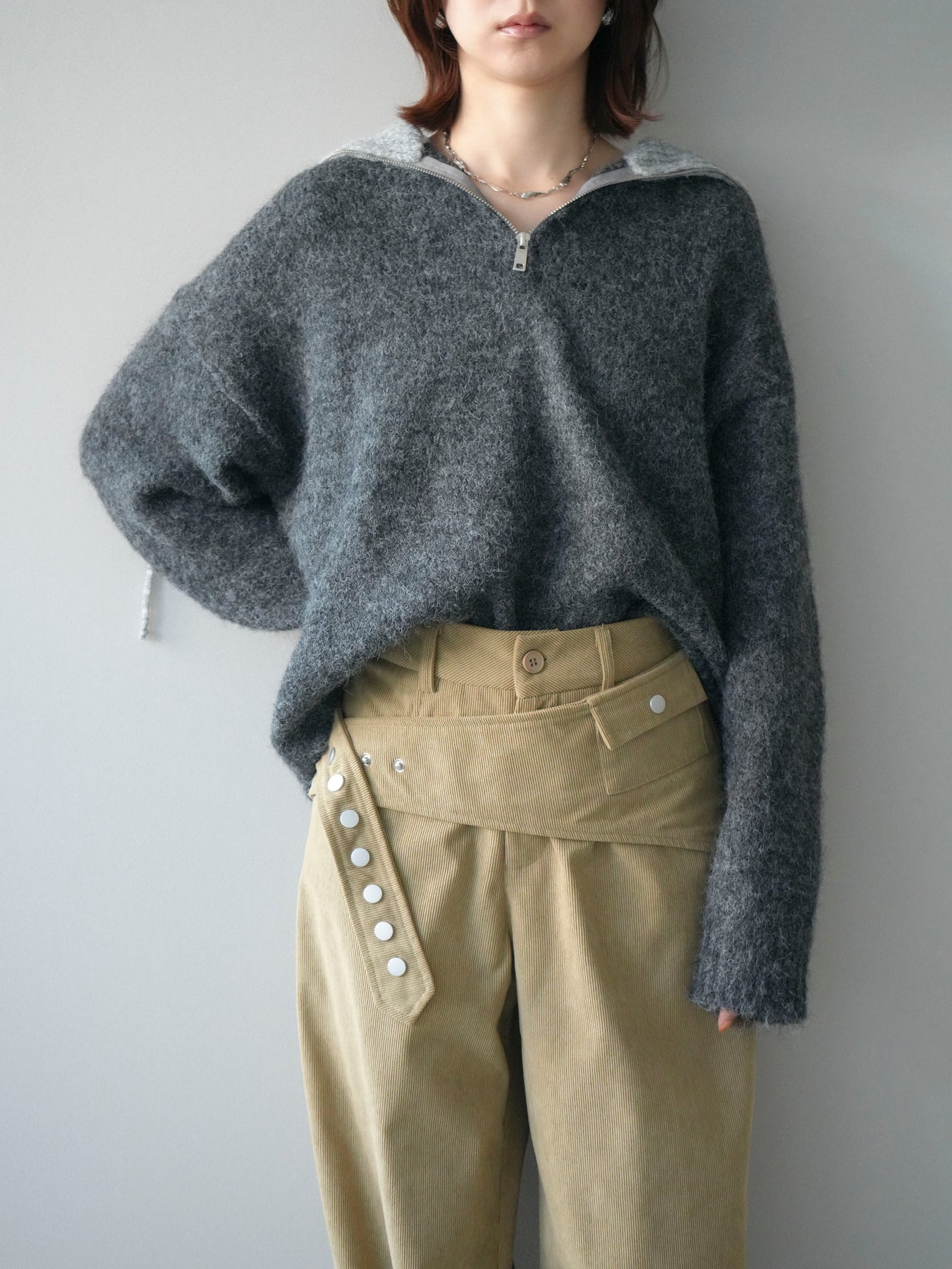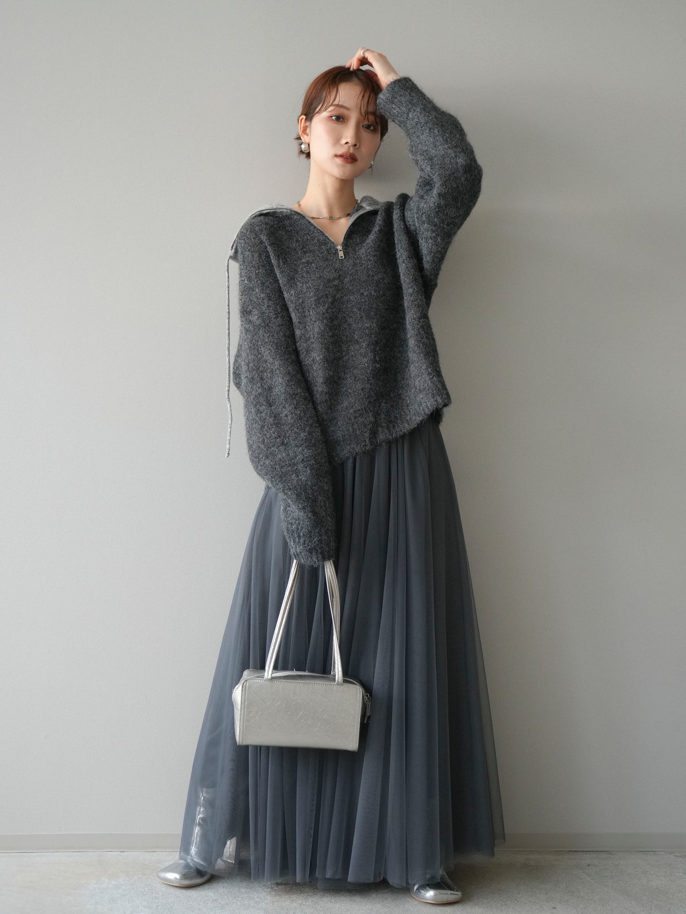 ふんわりとした風合いのニットに、バイカラーの襟元デザインが映えるジッププルオーバー。 ジップの開け閉めで首元の印象を変えられ、抜け感のある着こなしも楽しめます。 柔らかく肌触りの良い素材で、軽やかな着心地ながら暖かさも兼ね備えた一枚。 カジュアルにもきれいめにもマッチし、デニムやスカートなど幅広いアイテムと相性抜群です。 程よいボリュームシルエットがシーズンムードを高める、主役級のニットプルオーバーです。 ※ボトムス、キャミソール(インナー)以外の商品は一律でインナーは付属していません。